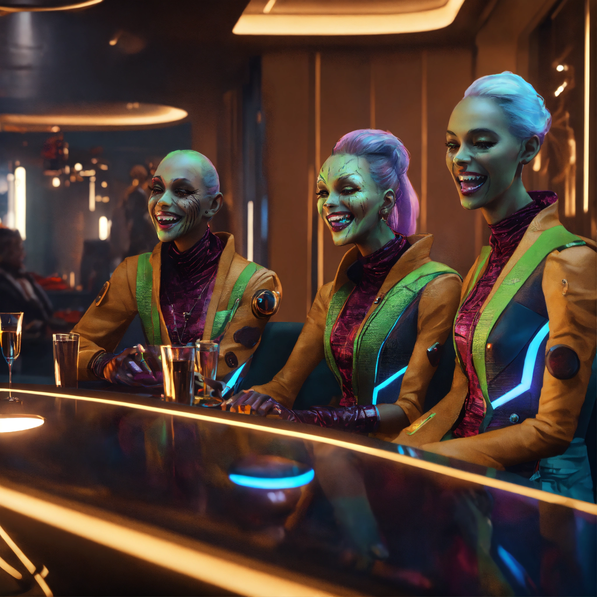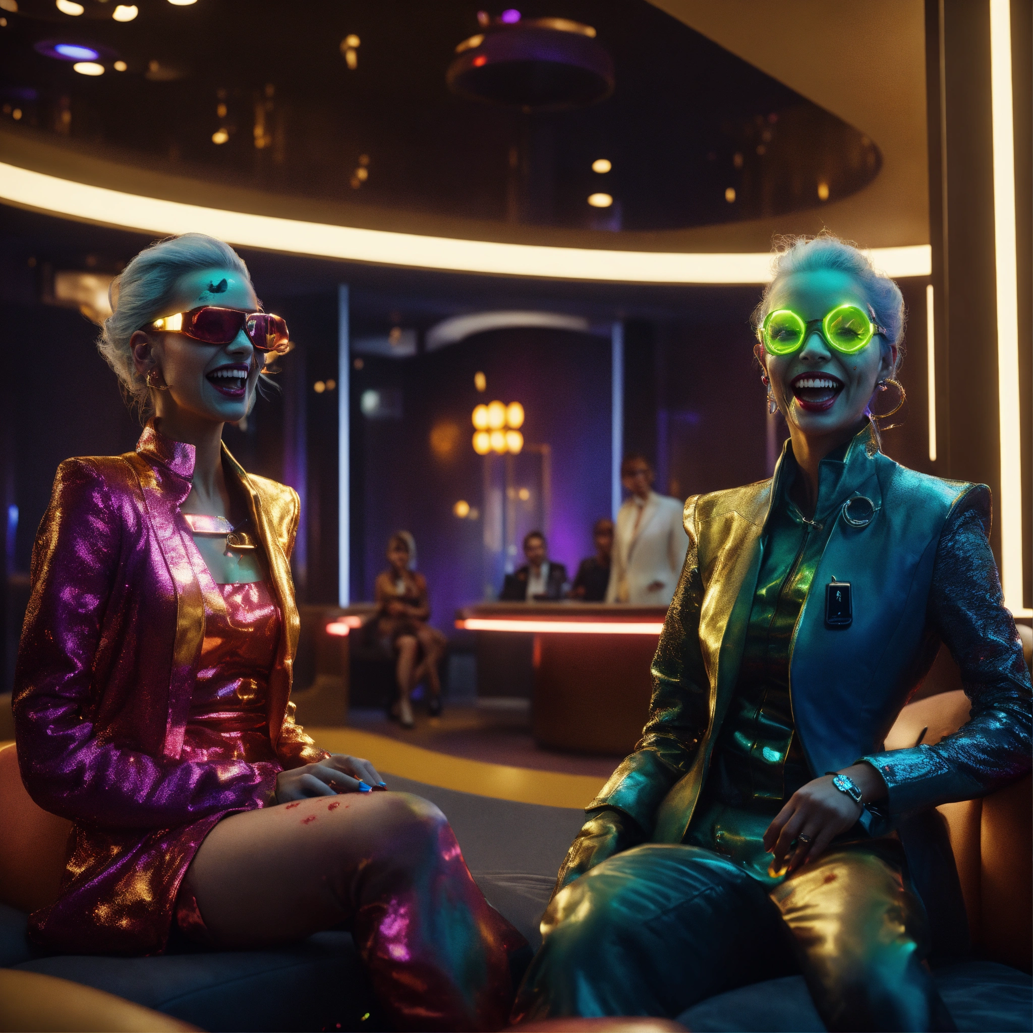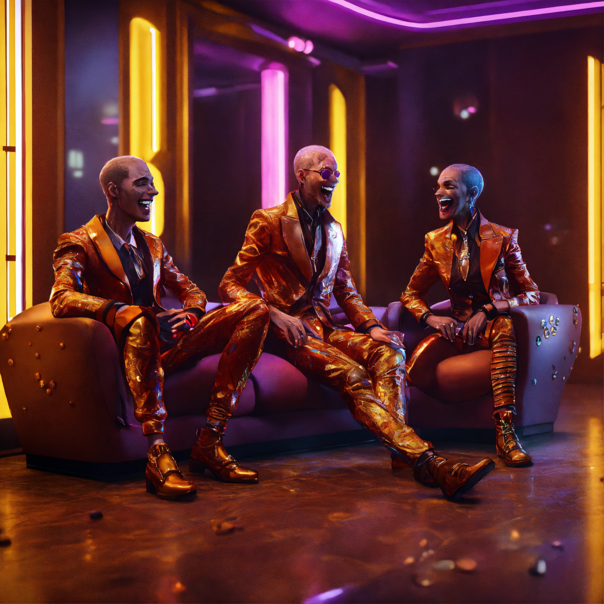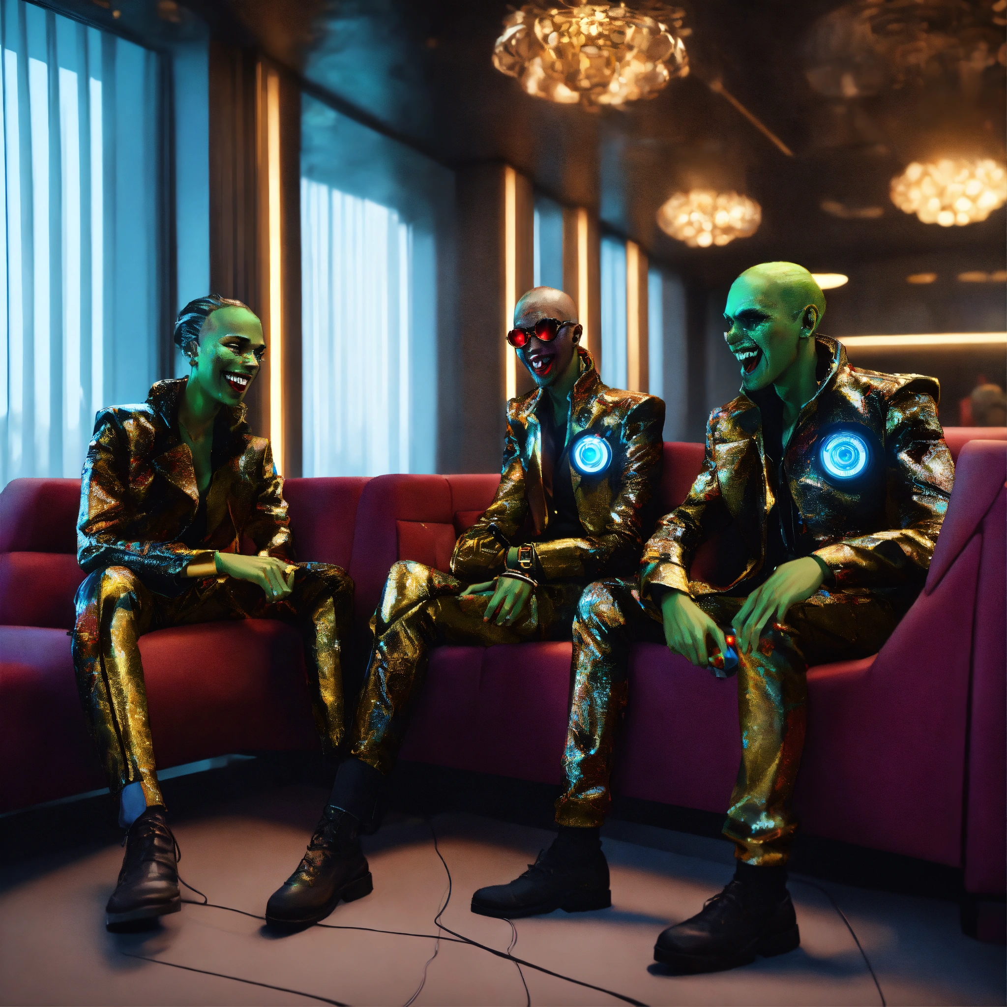 Close up of 3 hypnotized zombies wearing stylish futuristic clothes that are laughing and havinga good time relaxing in a luxurious space port hotel lounge reception area, realistic, futuristic, sci-fi, 8k, unreal engine, pixar, disney, zaha hadid