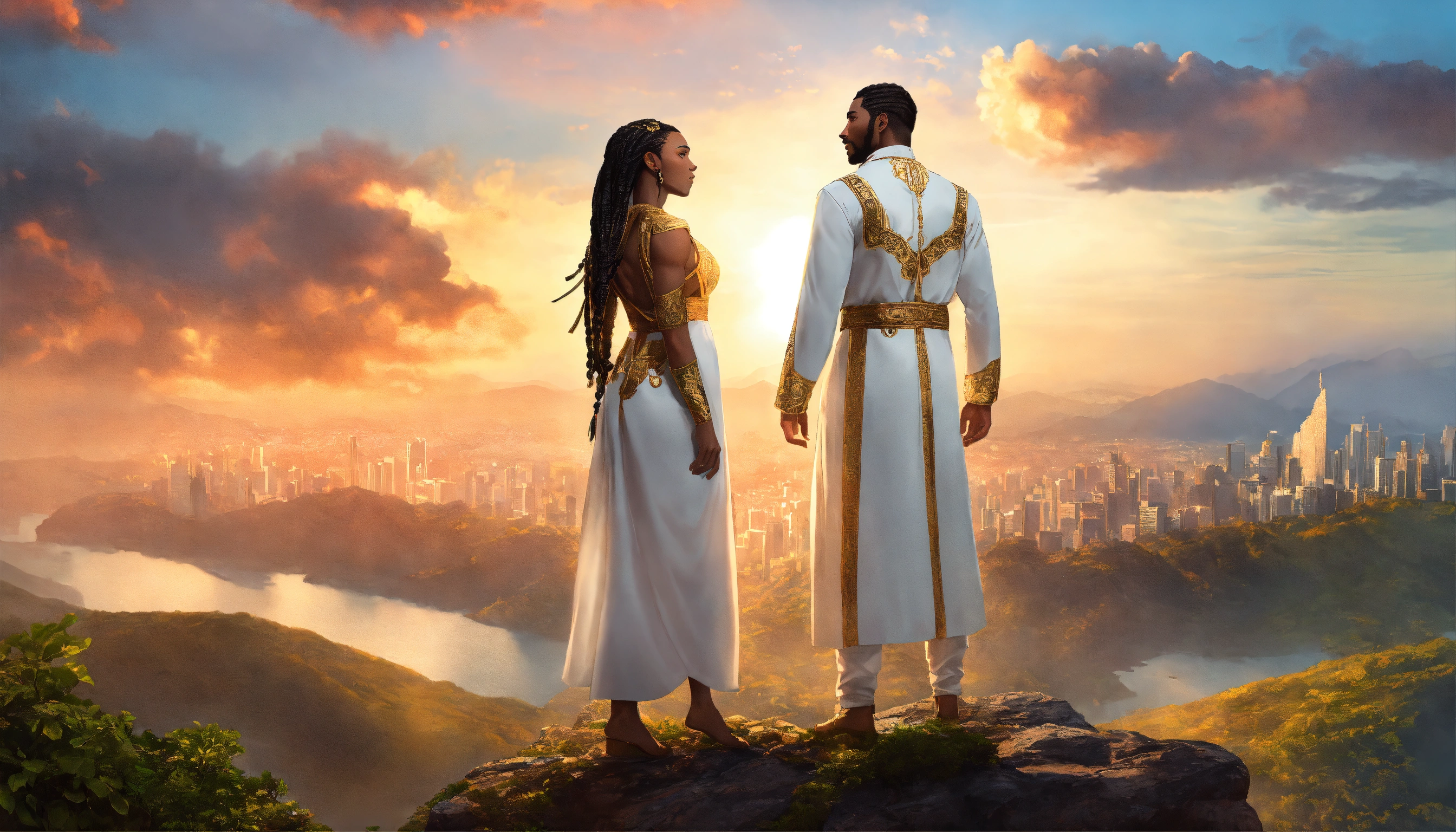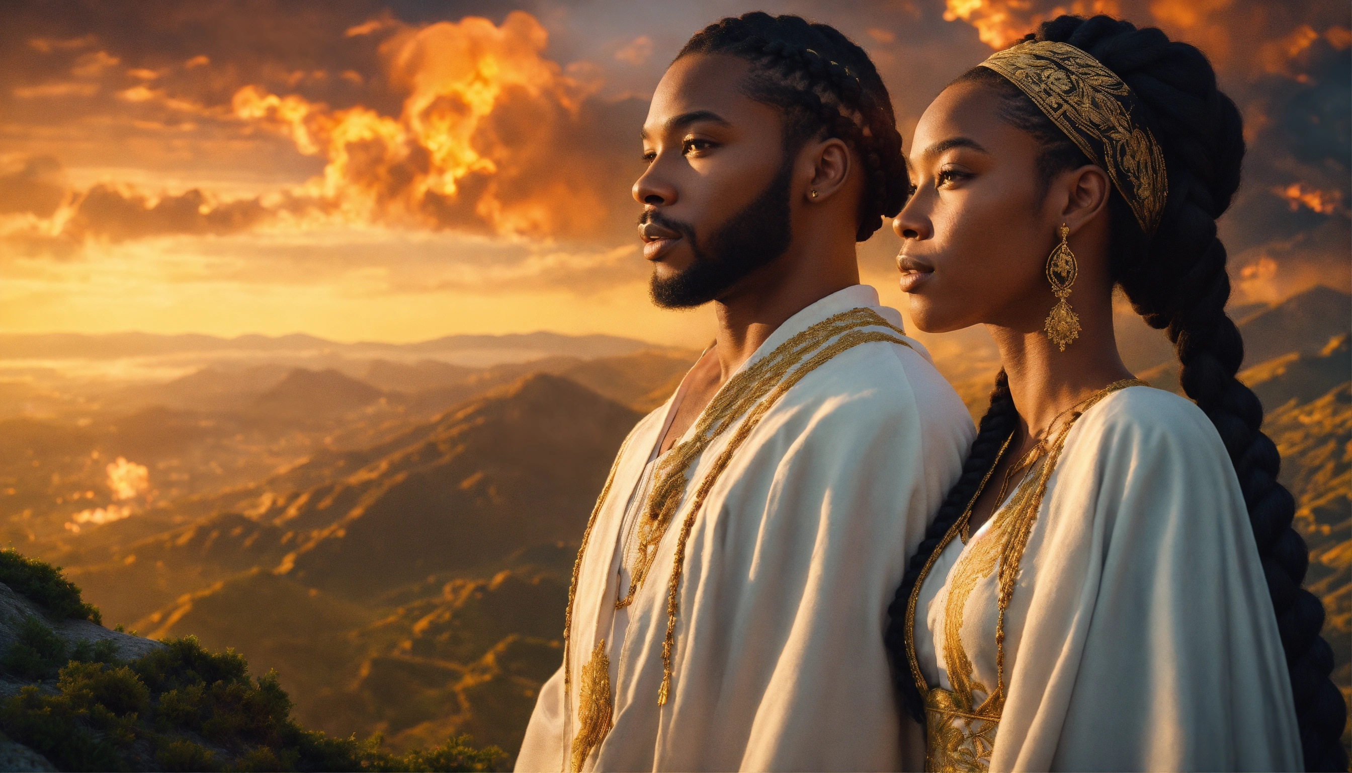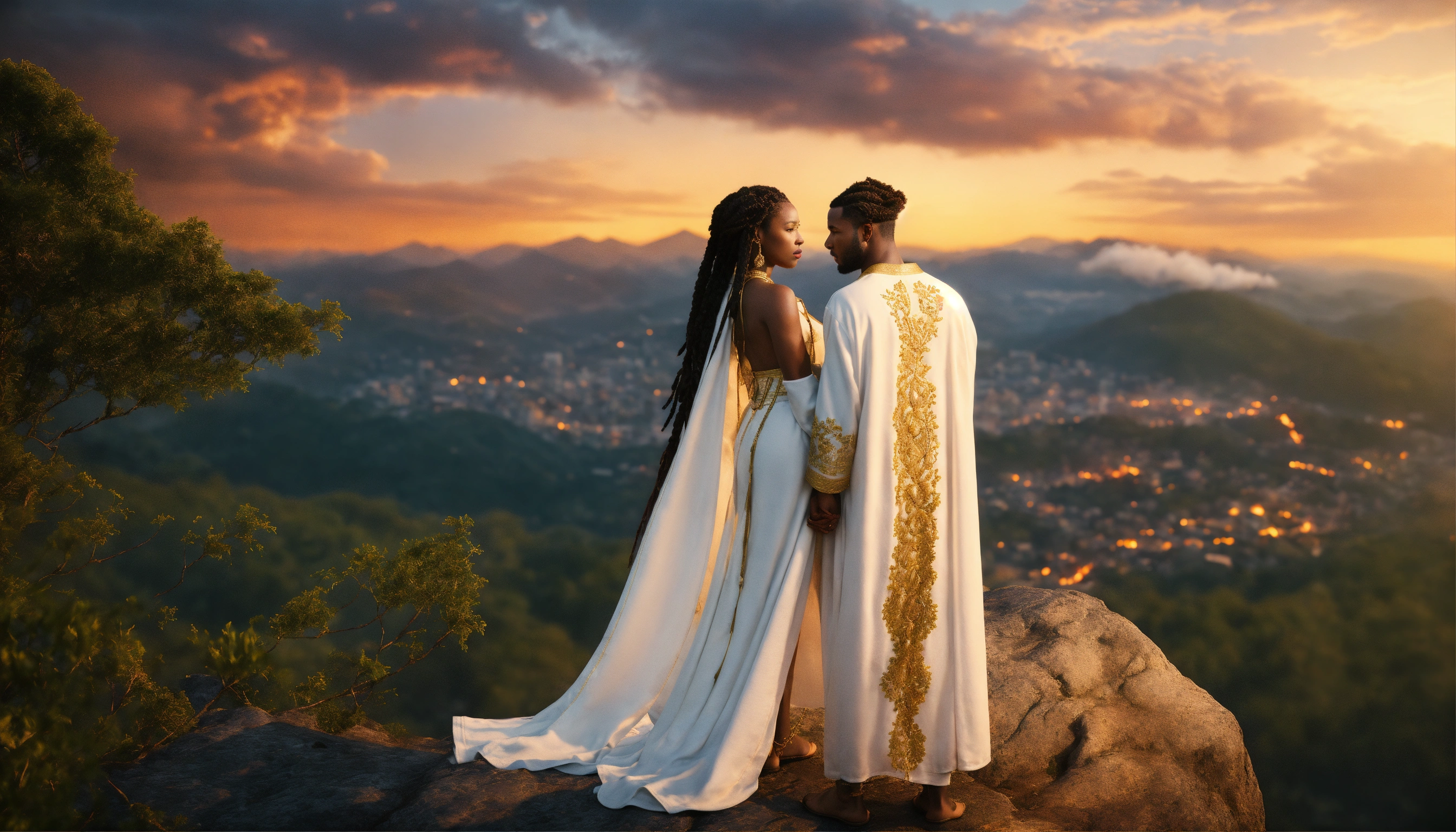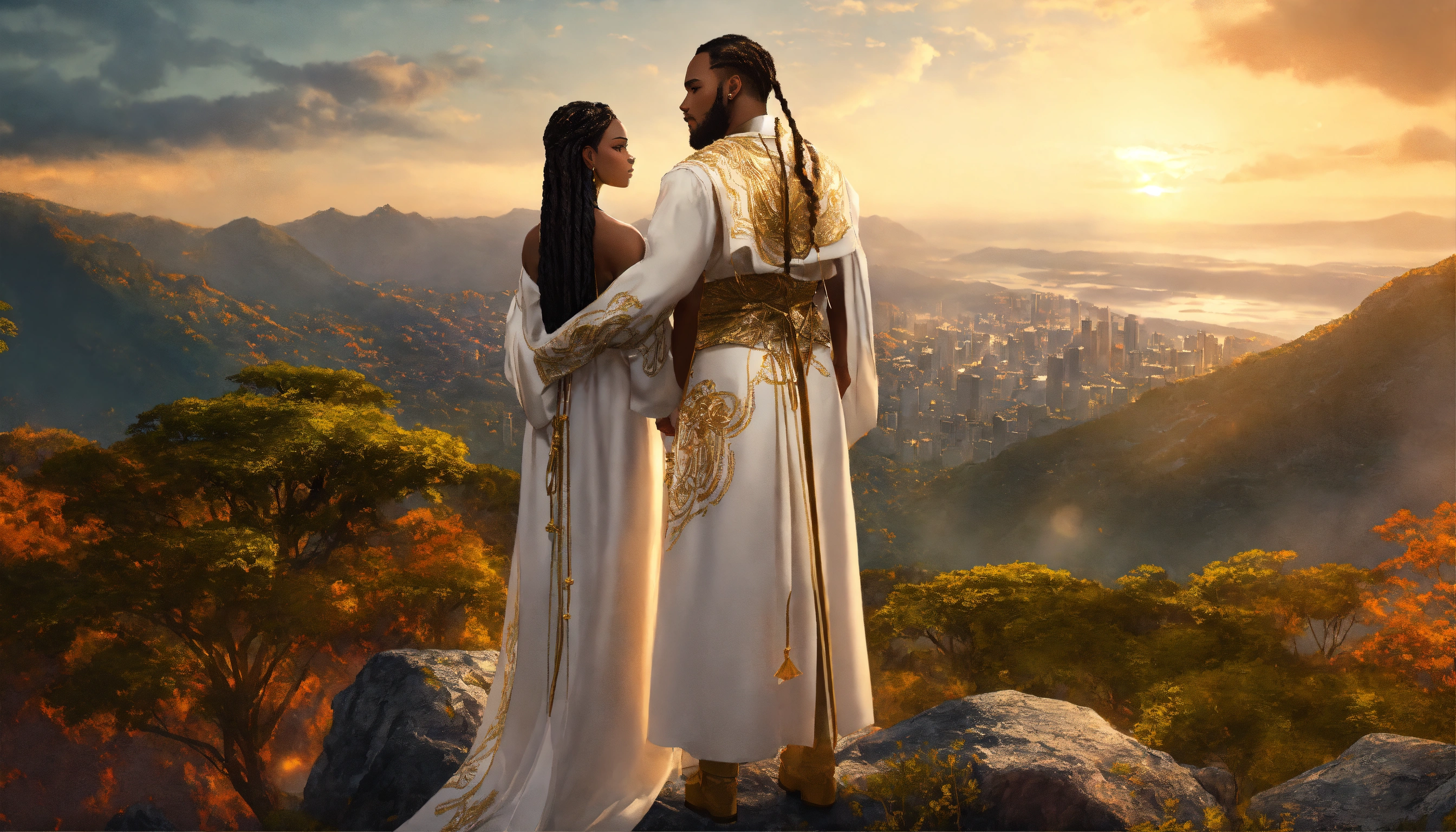 Illustrate a view of a handsome black man and a pretty black woman with long braids, they wear long glorious white robes with gold embroidery, they stand on top of a beautiful high mountain cliff where there is greenery and safety, far down below is a world full of cities on fire, photorealistic 8k