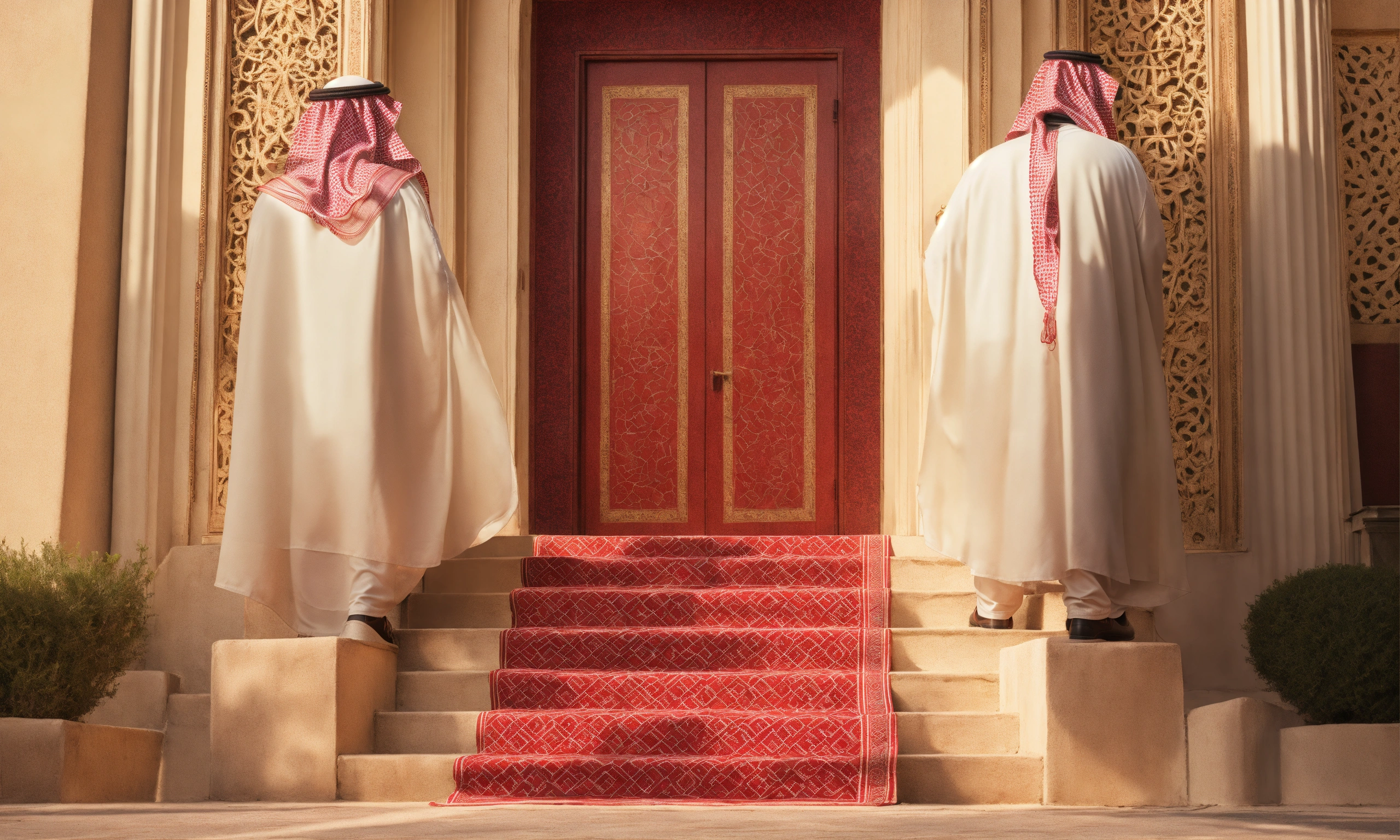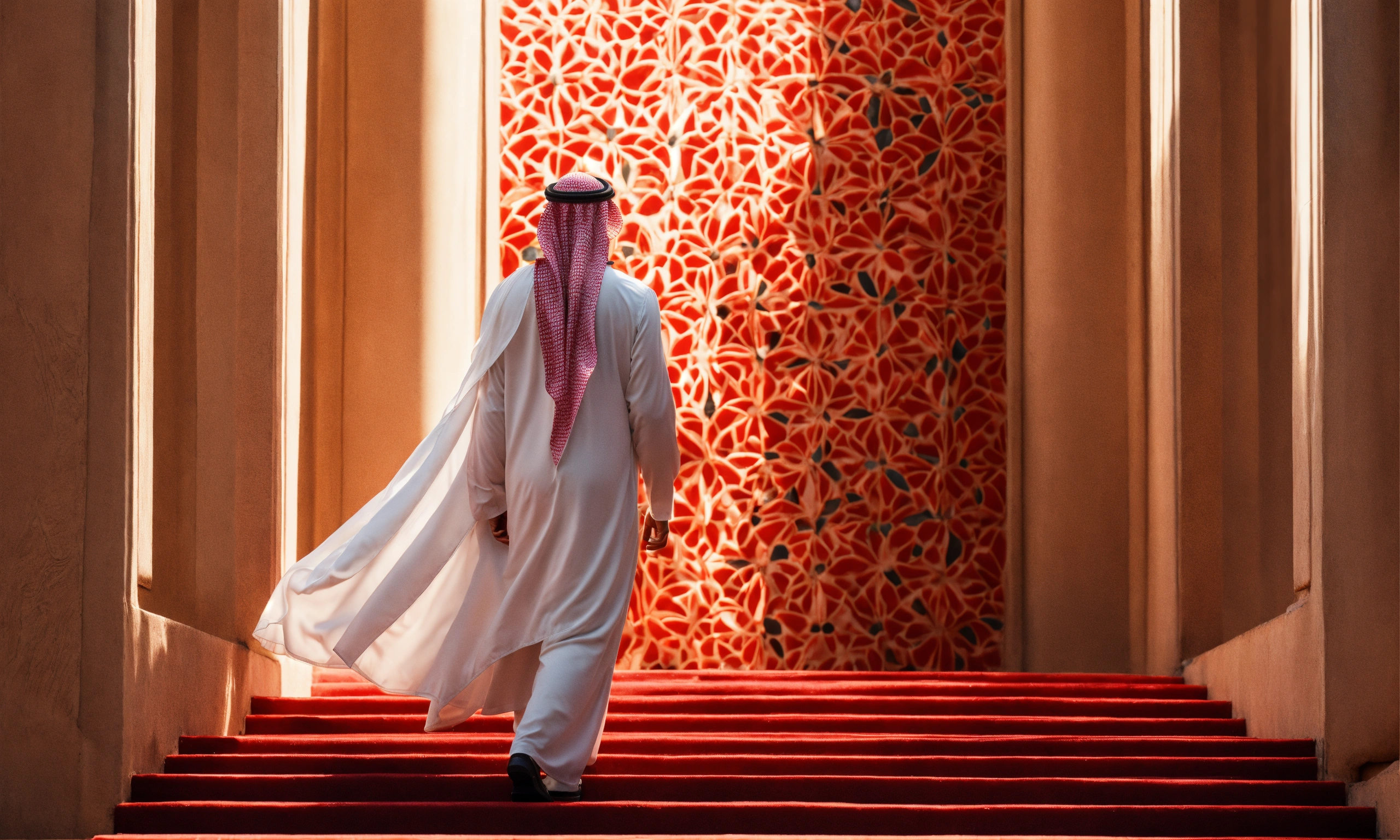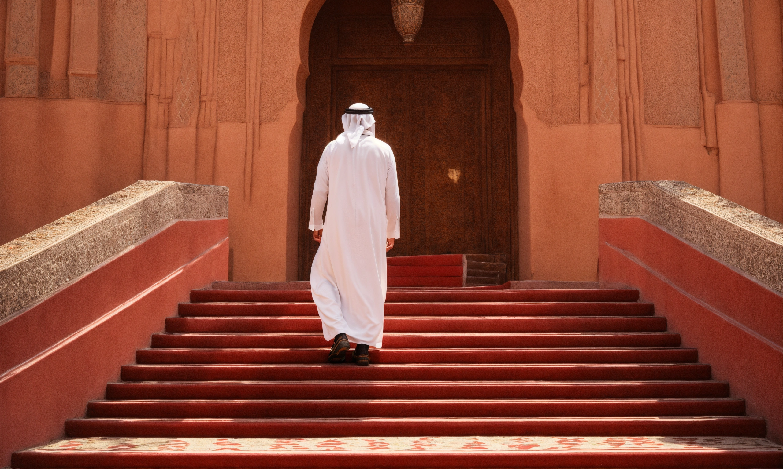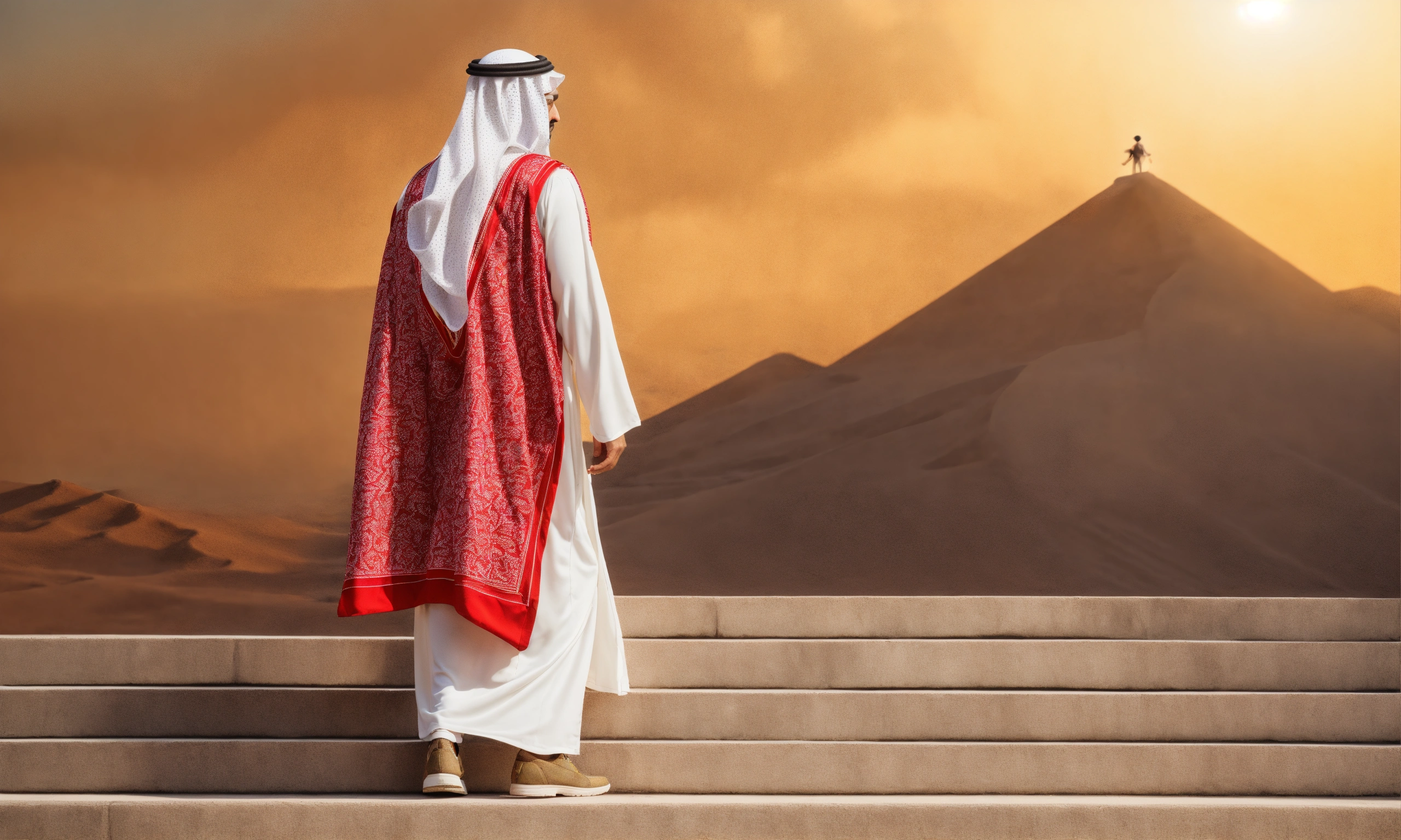 Saudi man climbing up steps, looking right, side-way, white costume, saudi head cover, red pattern, natural light, warm, photo-realistic, 8k, high definition