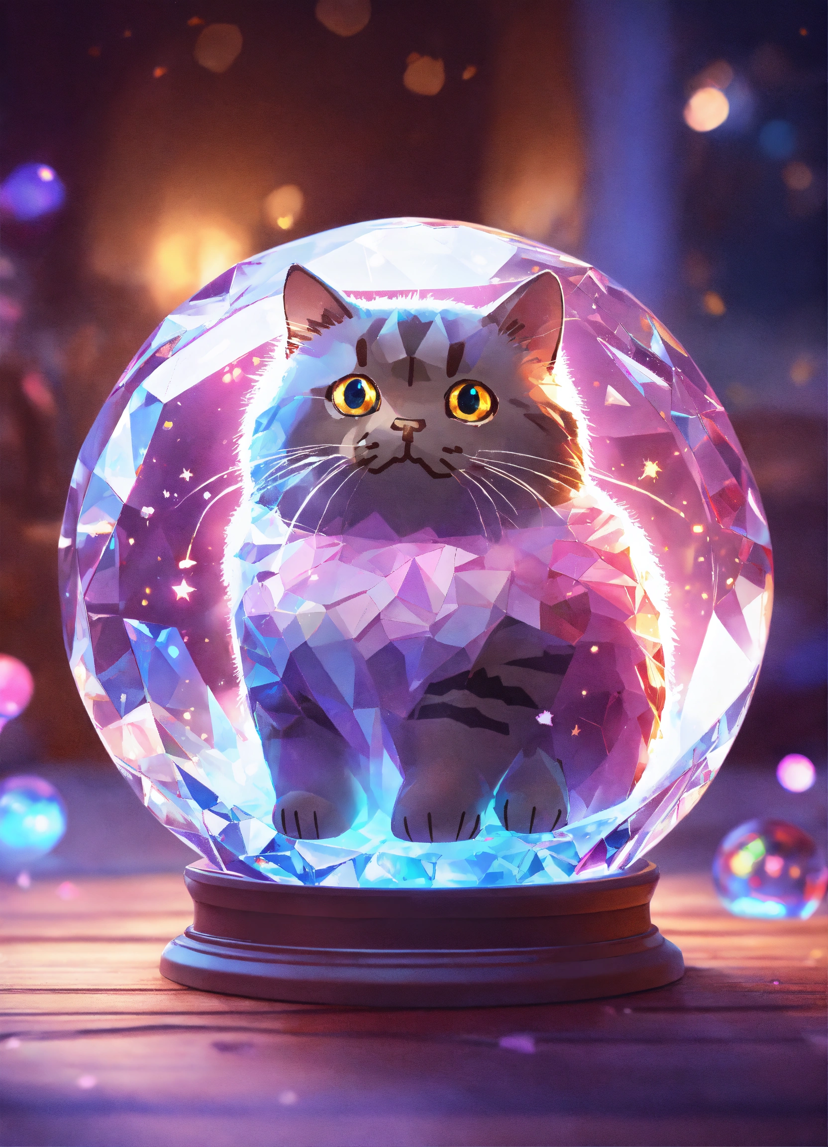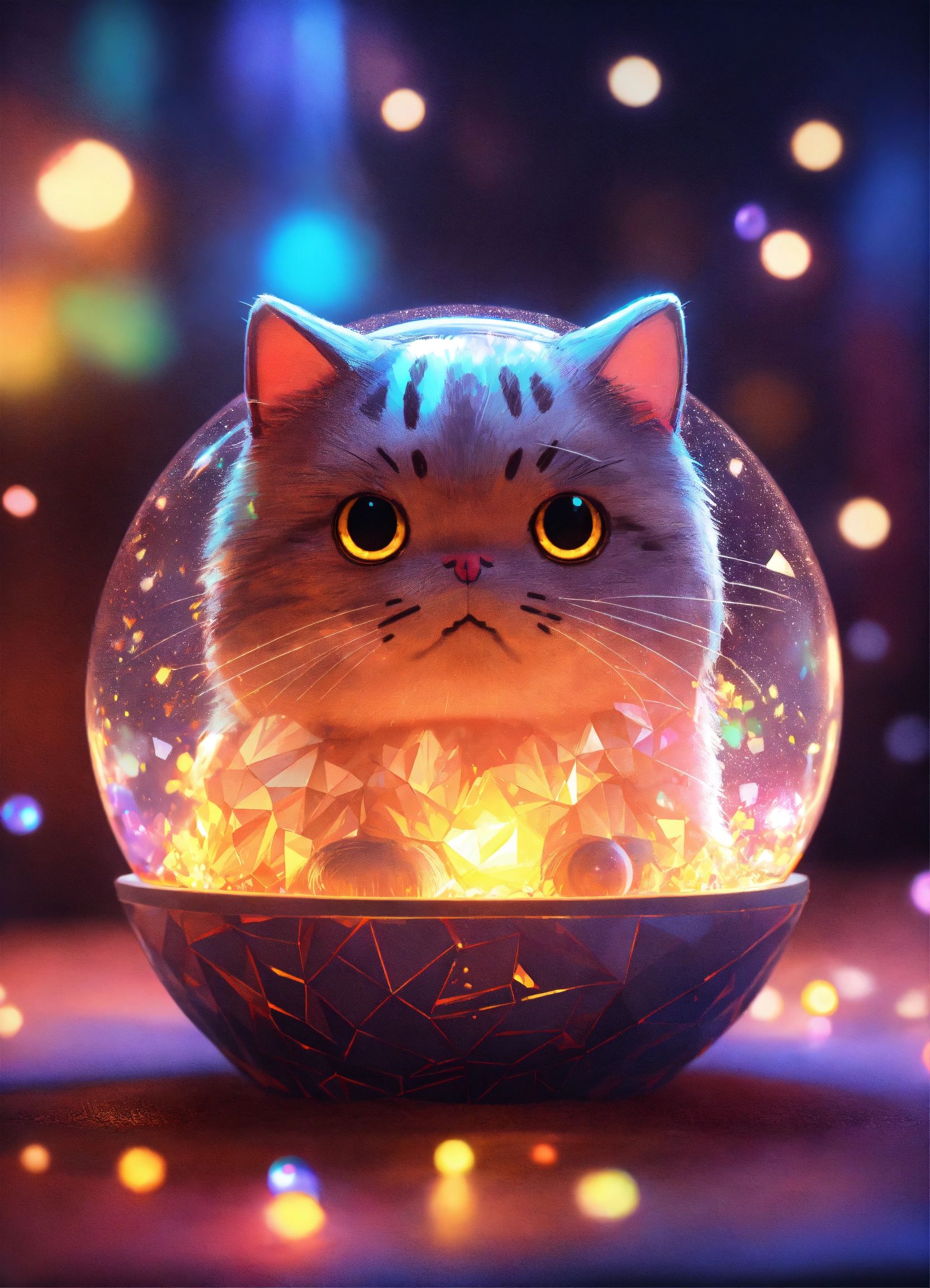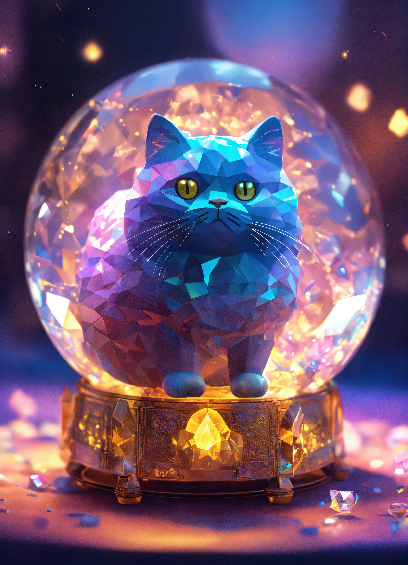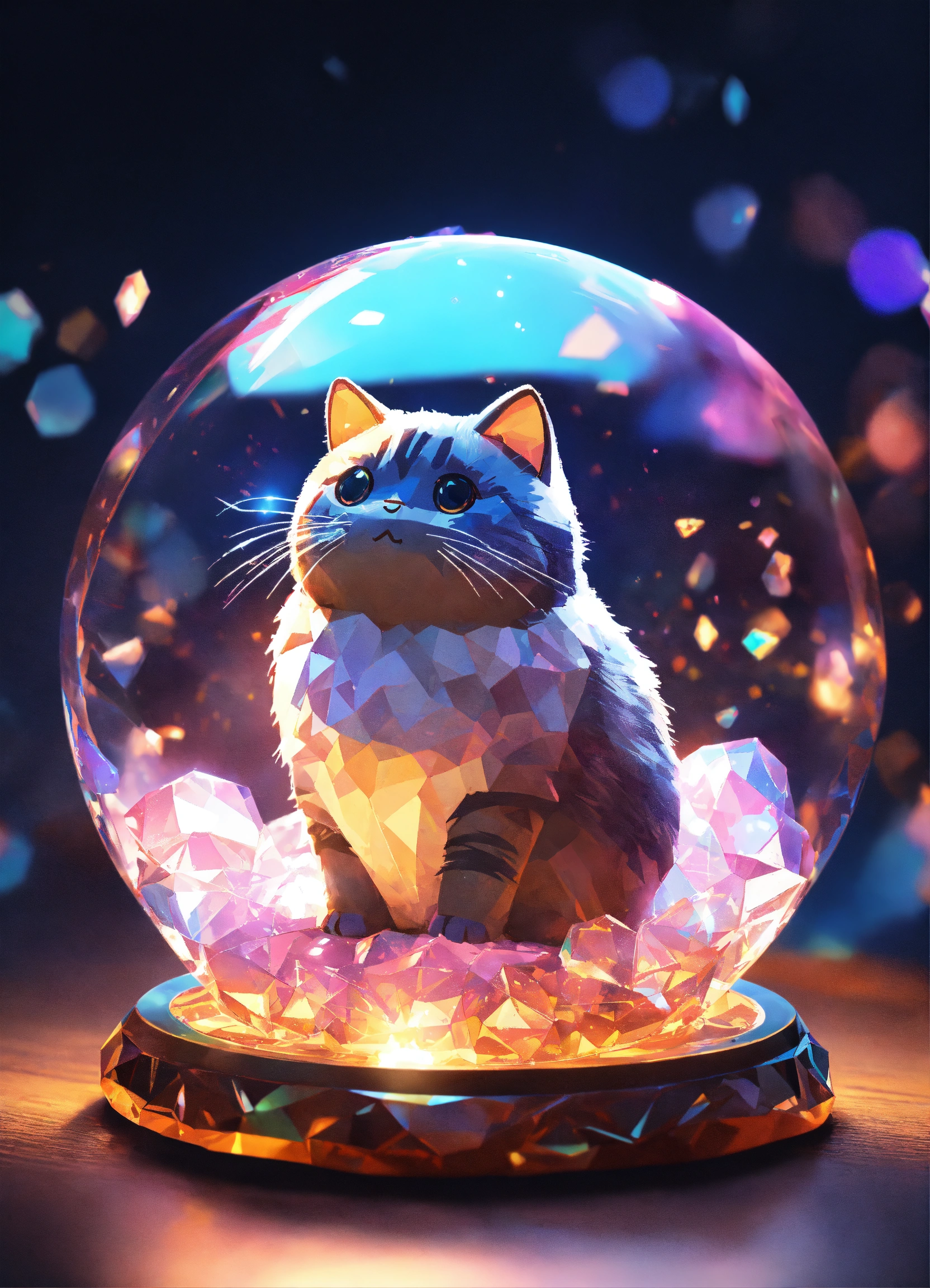 A pusheen the cat made of crystal ball with low poly eye's surrounded by glowing aura, flamming sparkles highly detailed intricated concept art trending artstation 8k