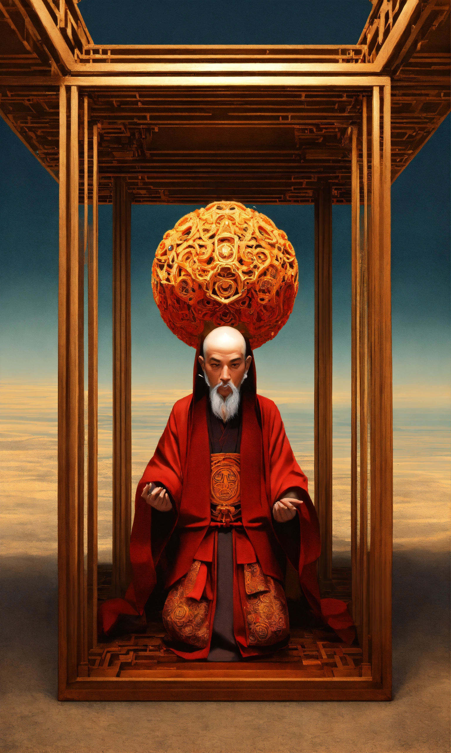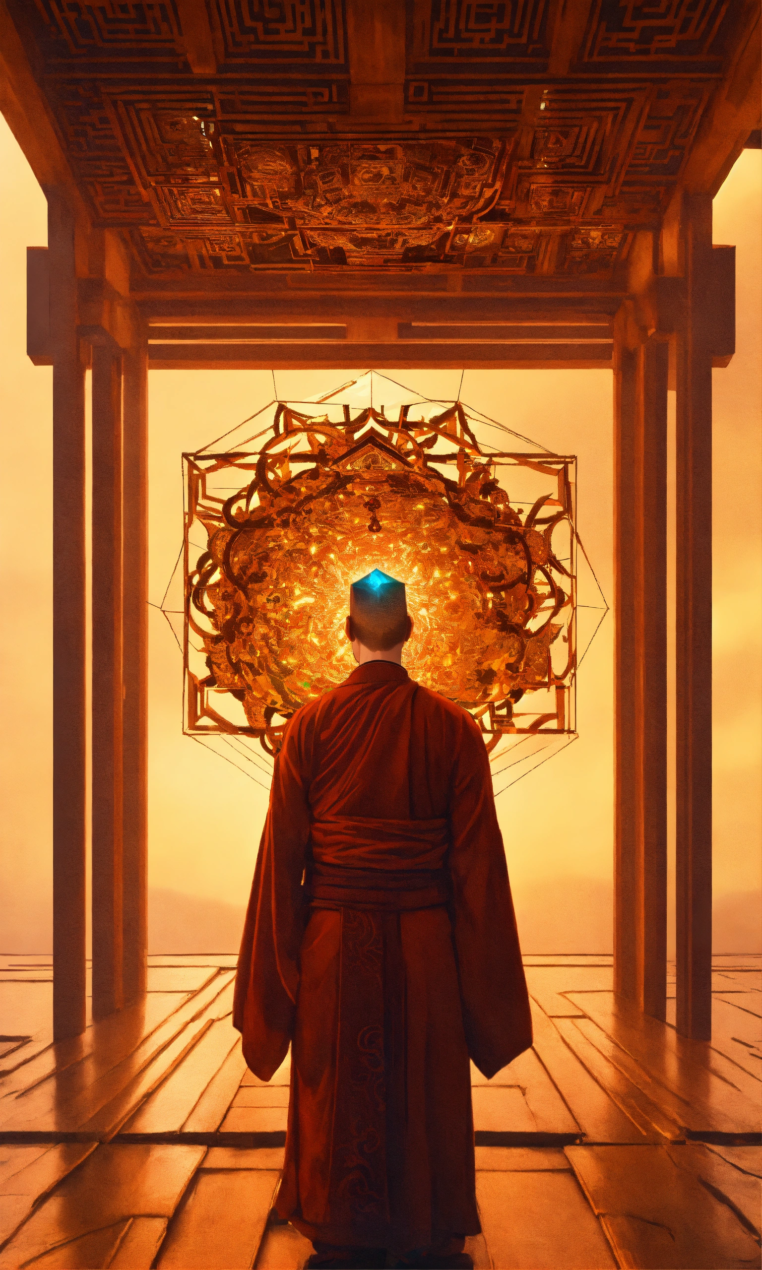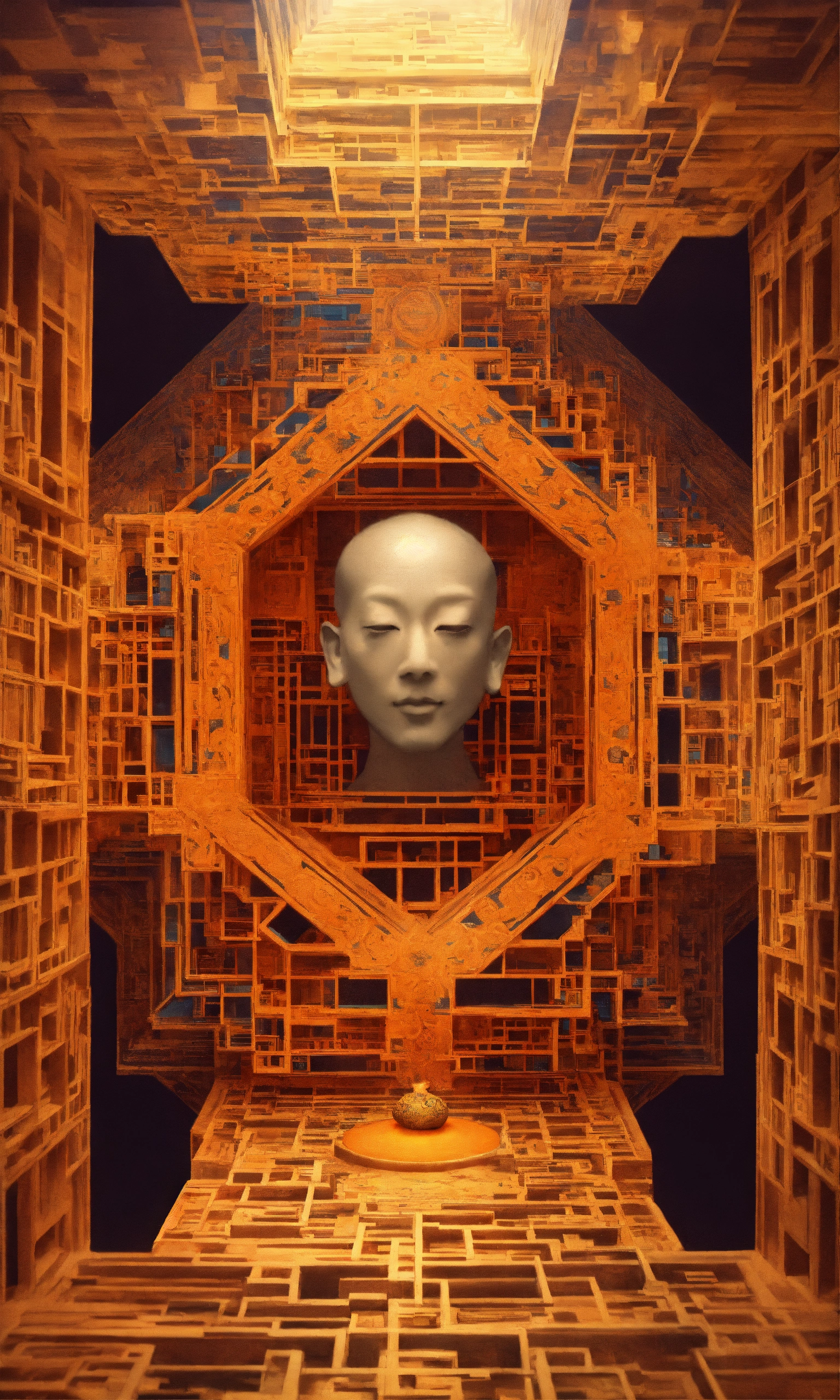 Taoist monk octopus tesseract body fractal three point perspective hypercube mirror zen face