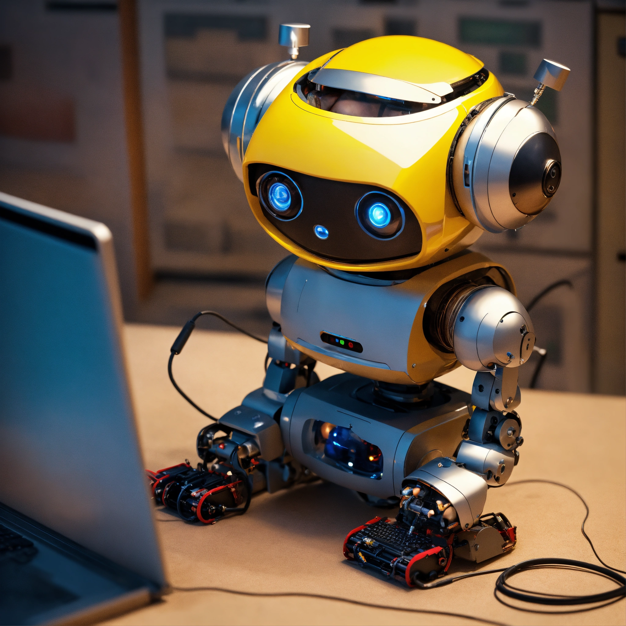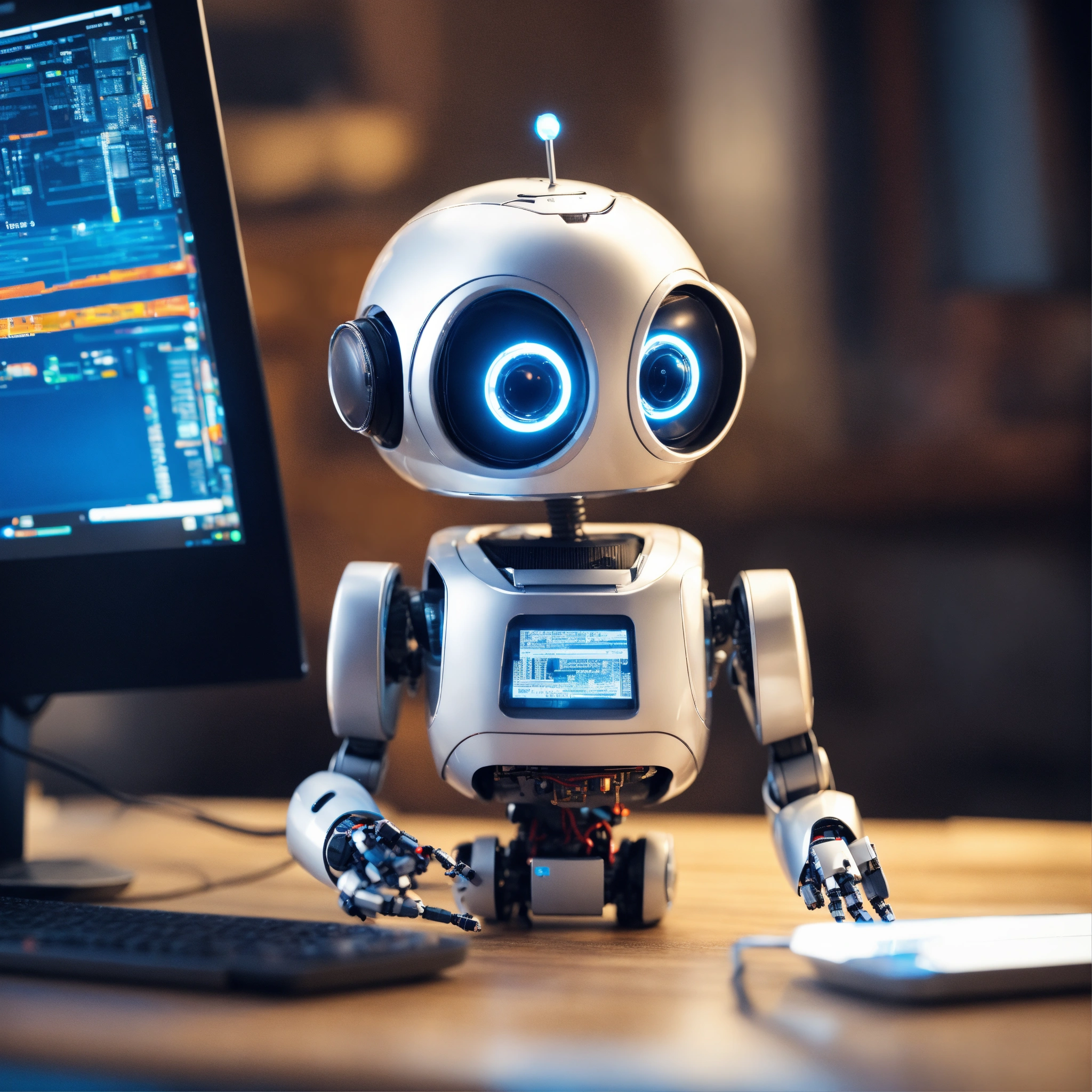 A cute robot using a computer