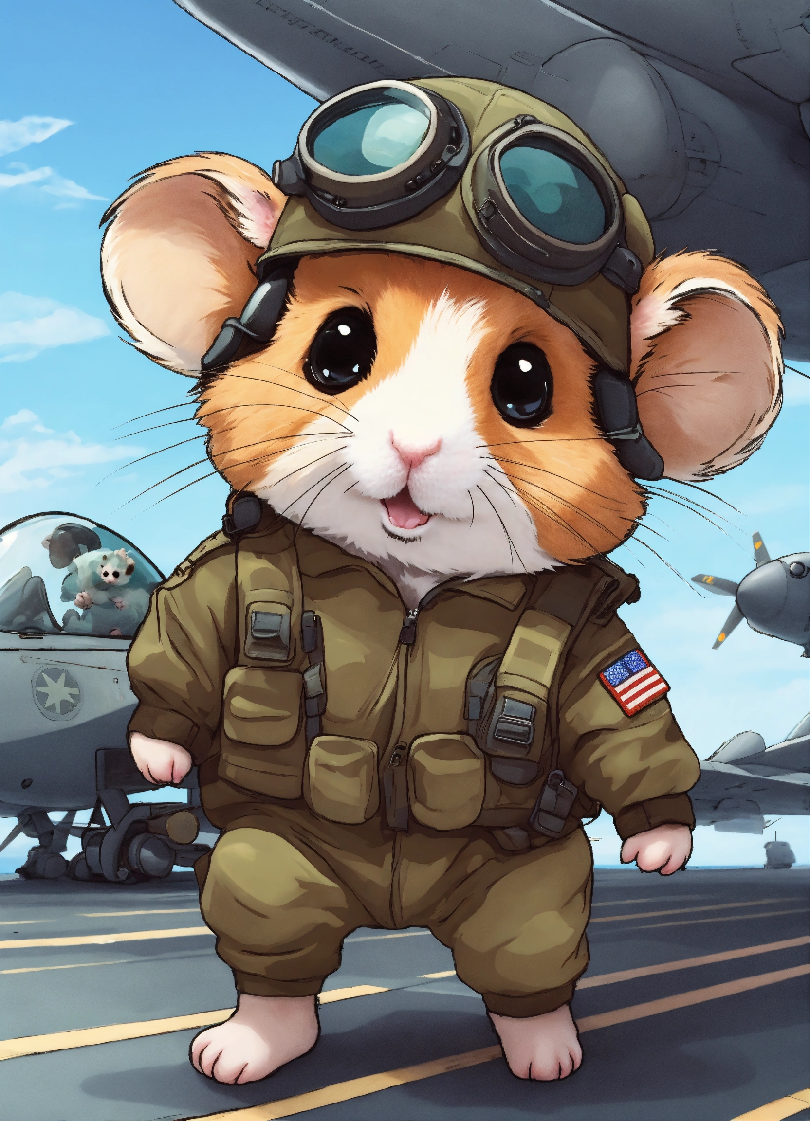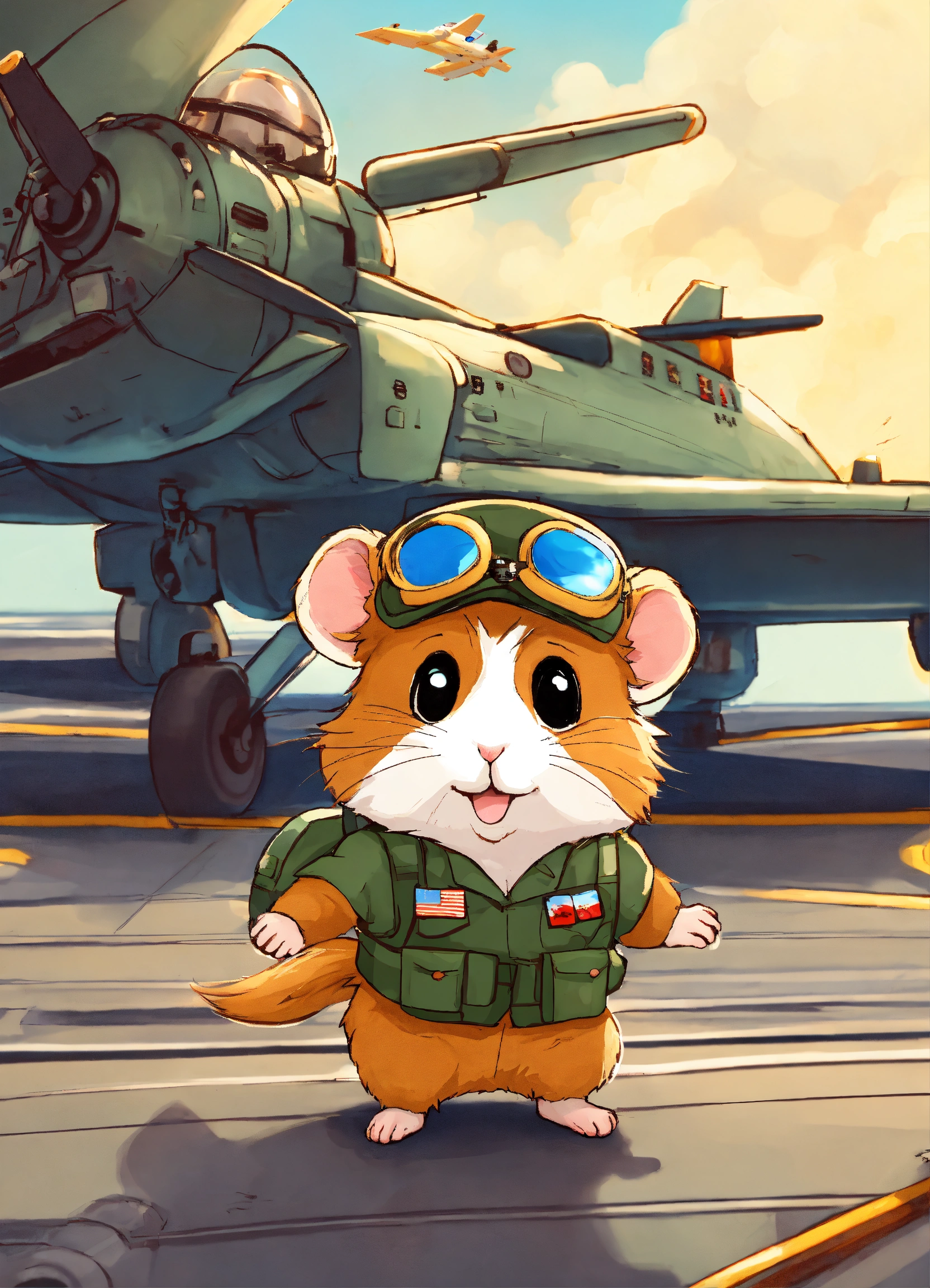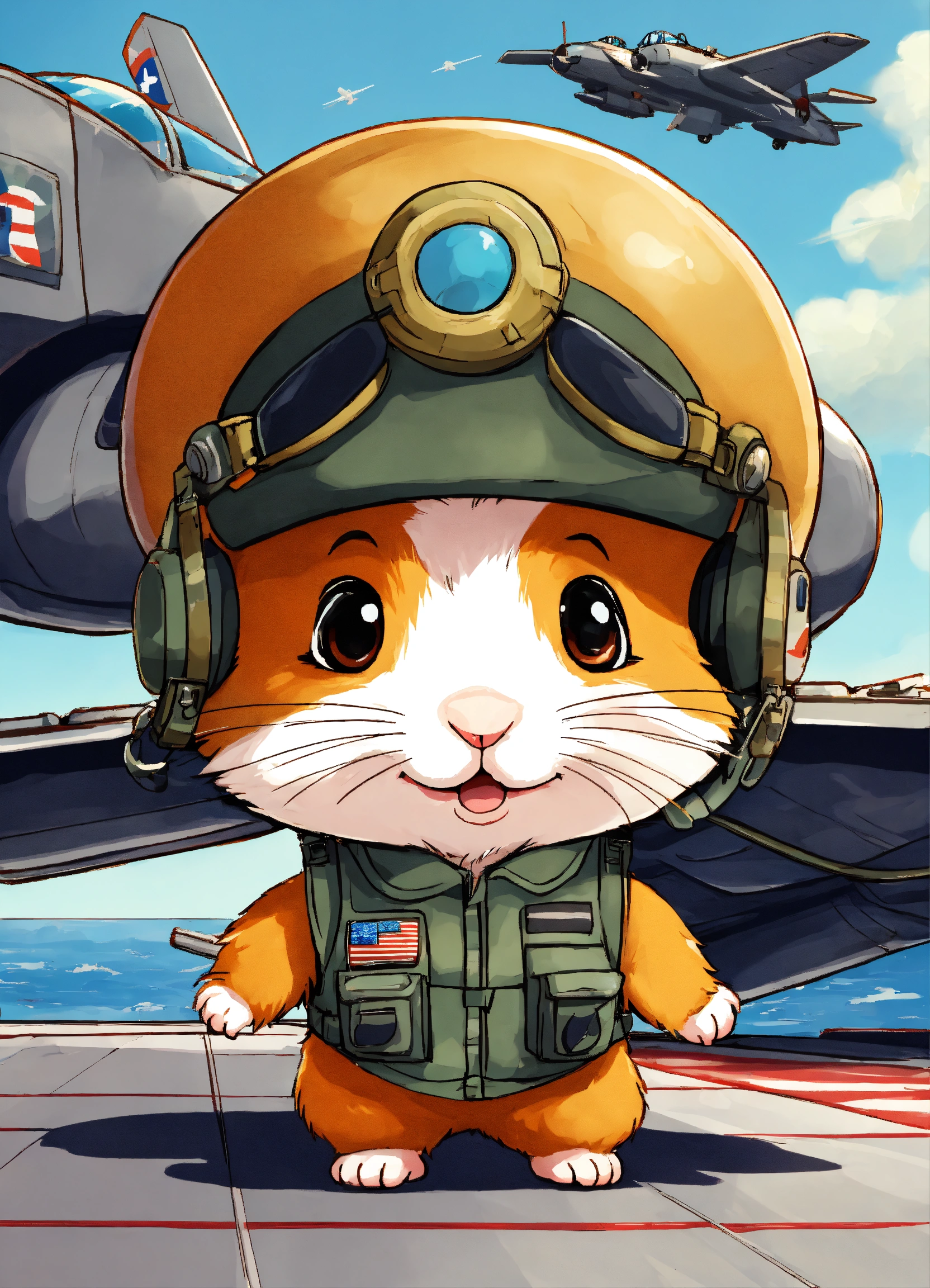 Cute boy a cute fluffy hamster pilot walking on a military aircraft carrier