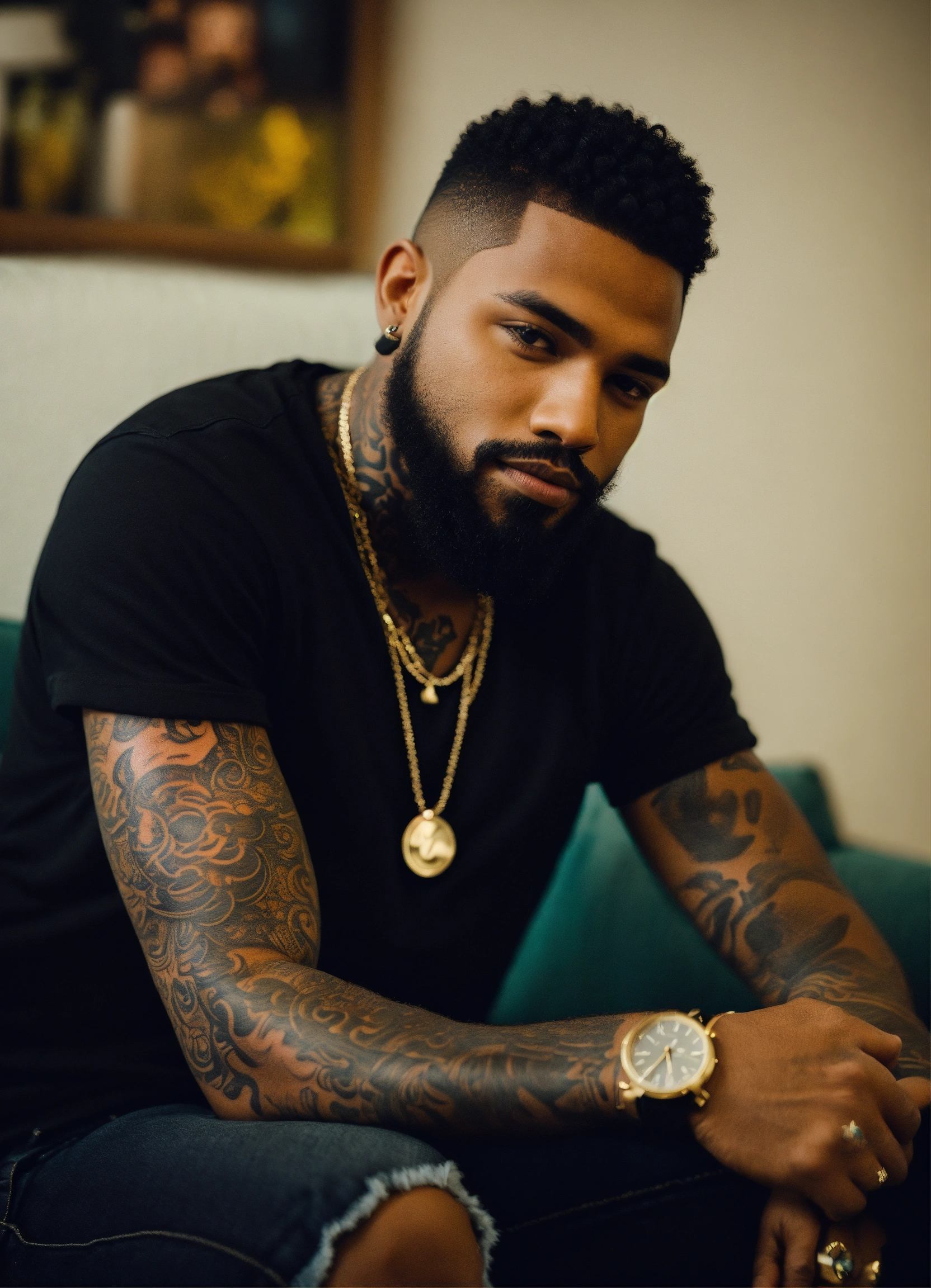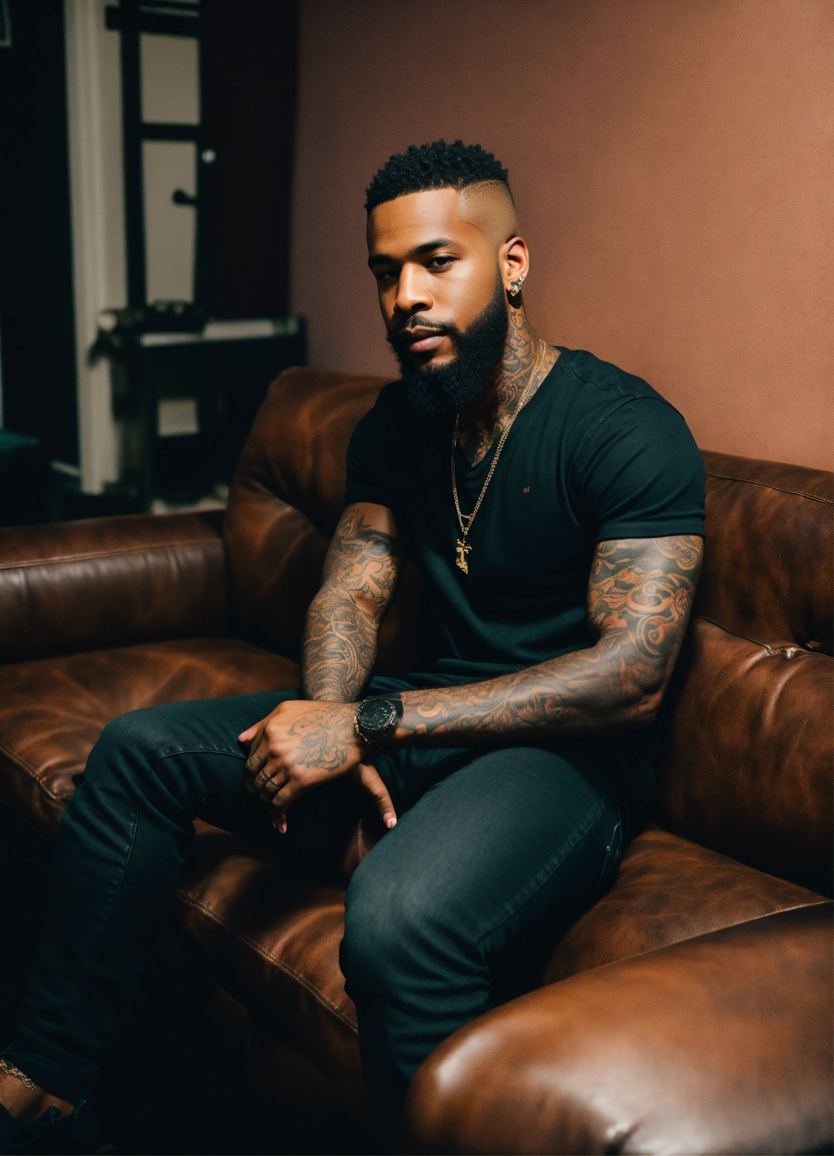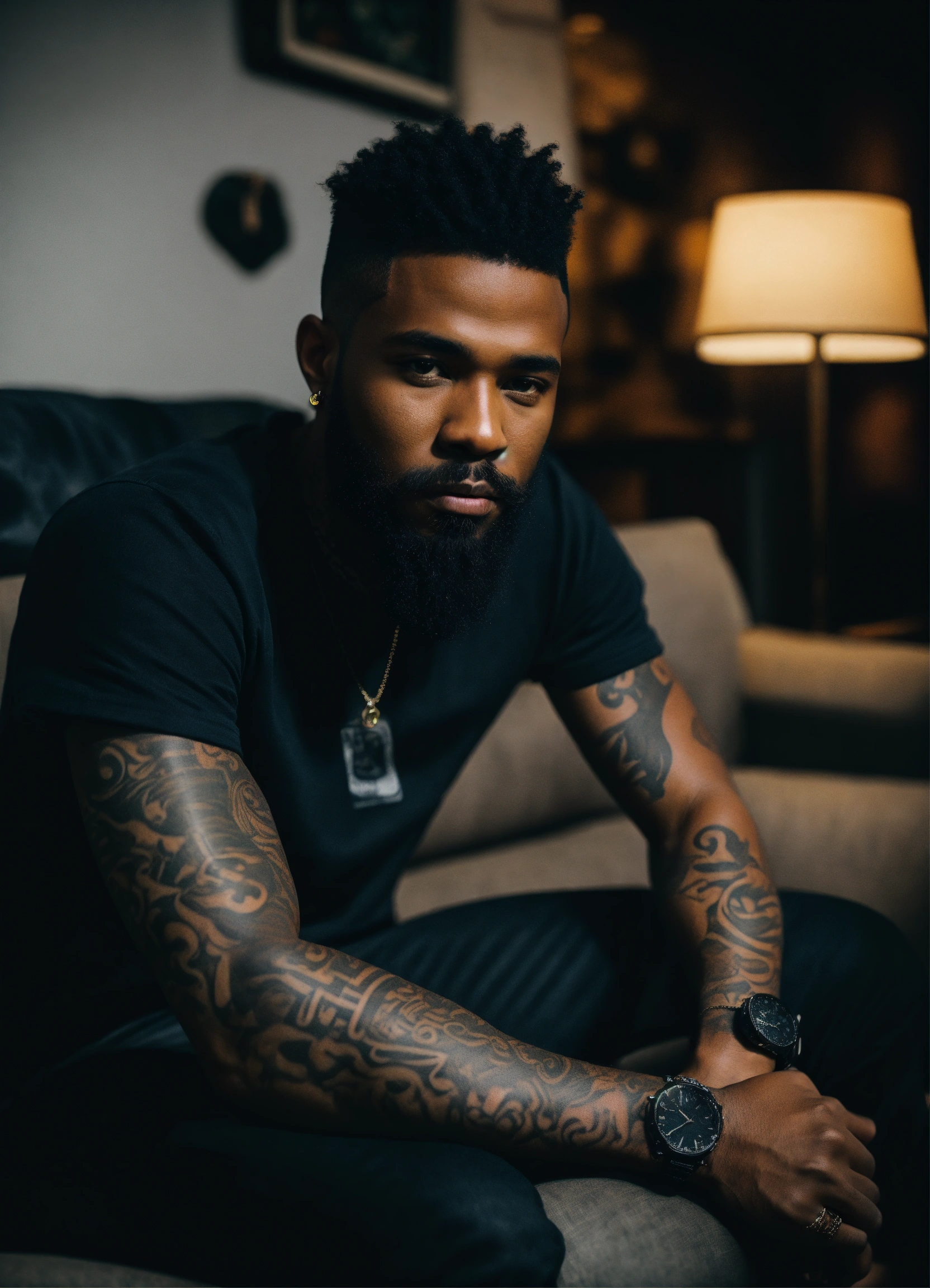 Black dominican male, beard, low hair cut, black jeans, black tee, tattoos, sitting on a sofa, dark room
