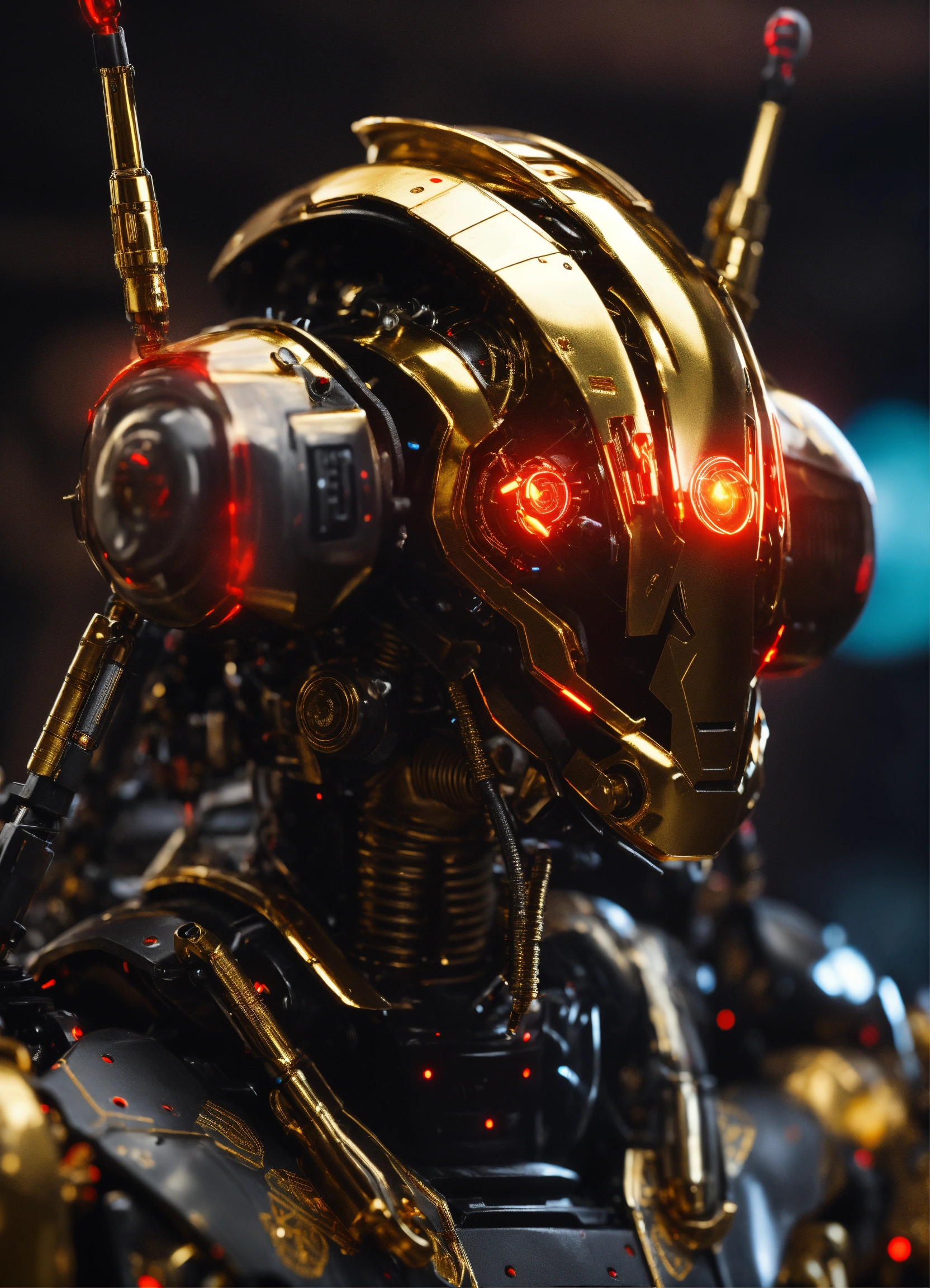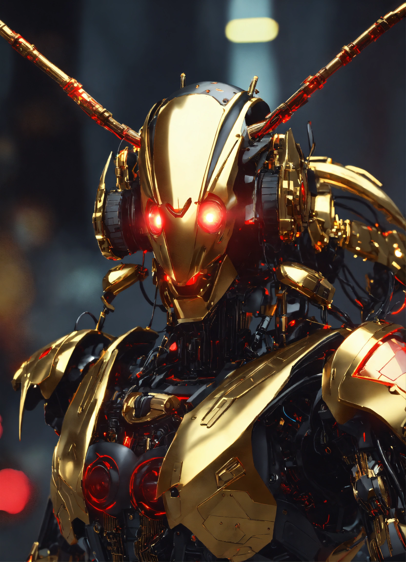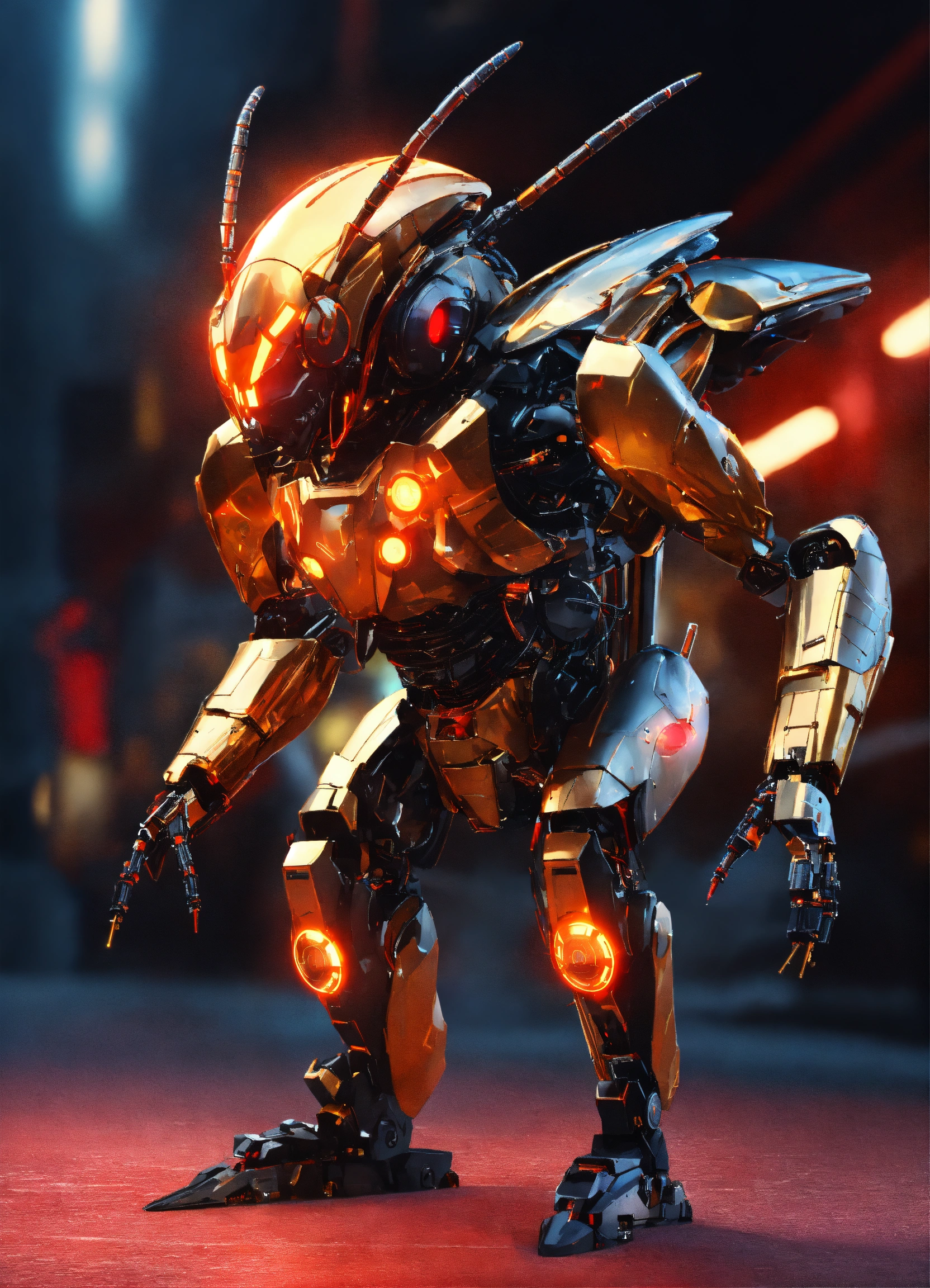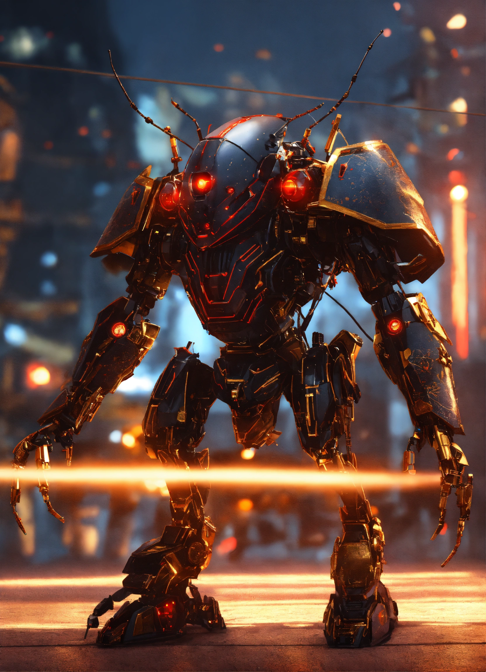Zoom out of black cockroach faced humanoid robot with red glowing eyes, detailed gold circuitry on it's armor. standing and shooting electricity from his powerful antenna attacking, realistic, 8k