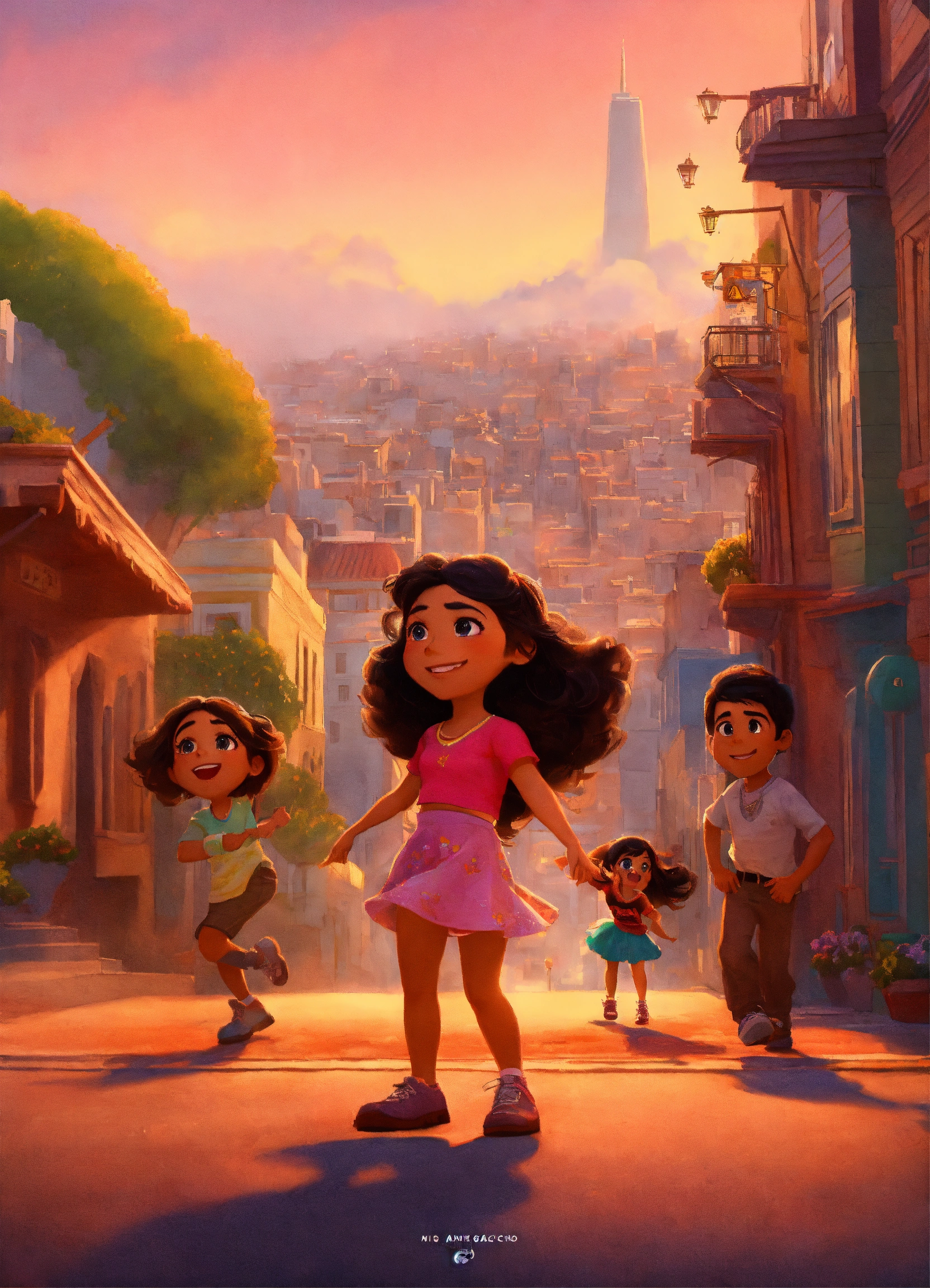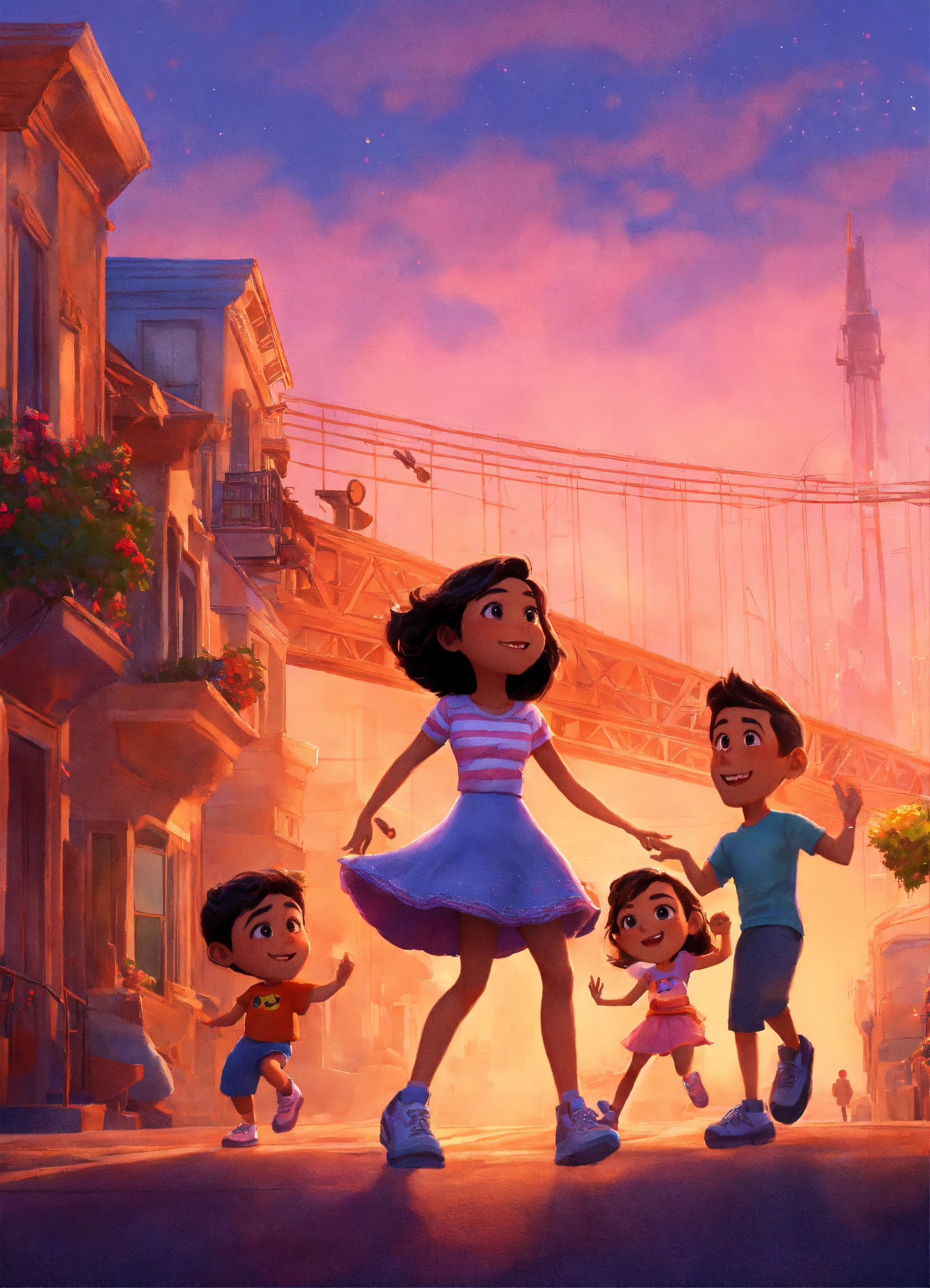 Pixar animation of hispanic 9 year old mia dancing with her family under the foggy san francisco sky, pixar style cartoon