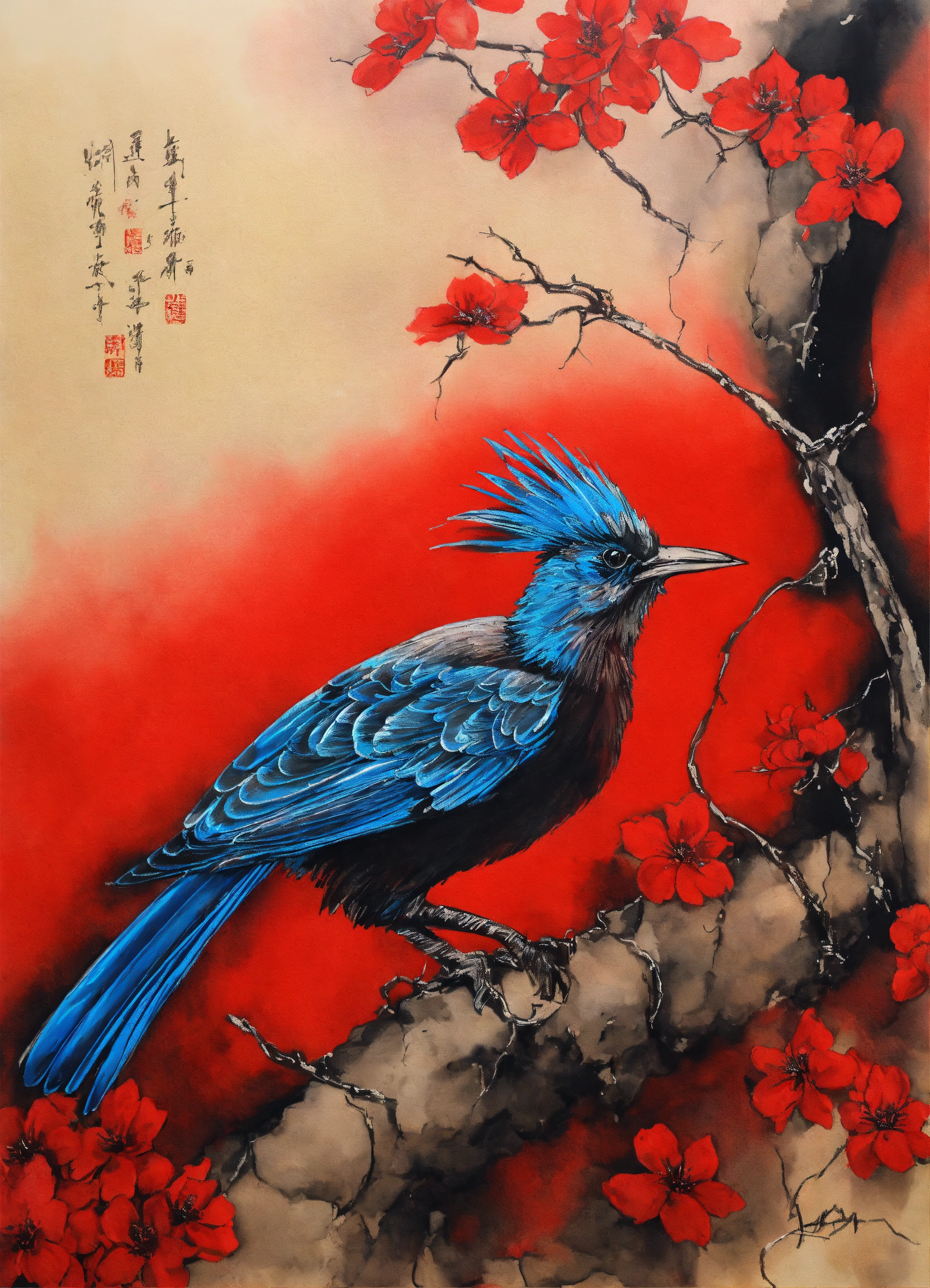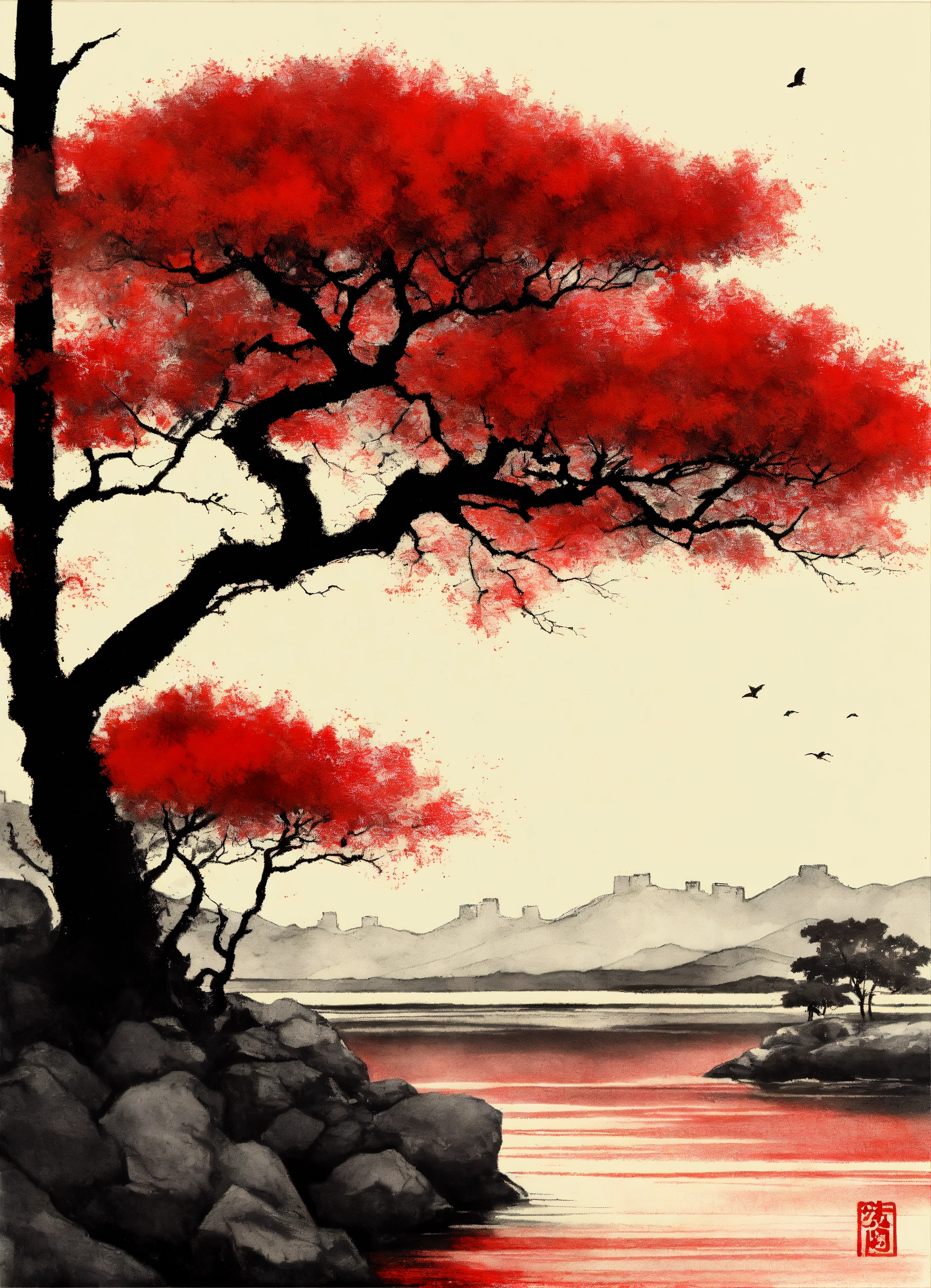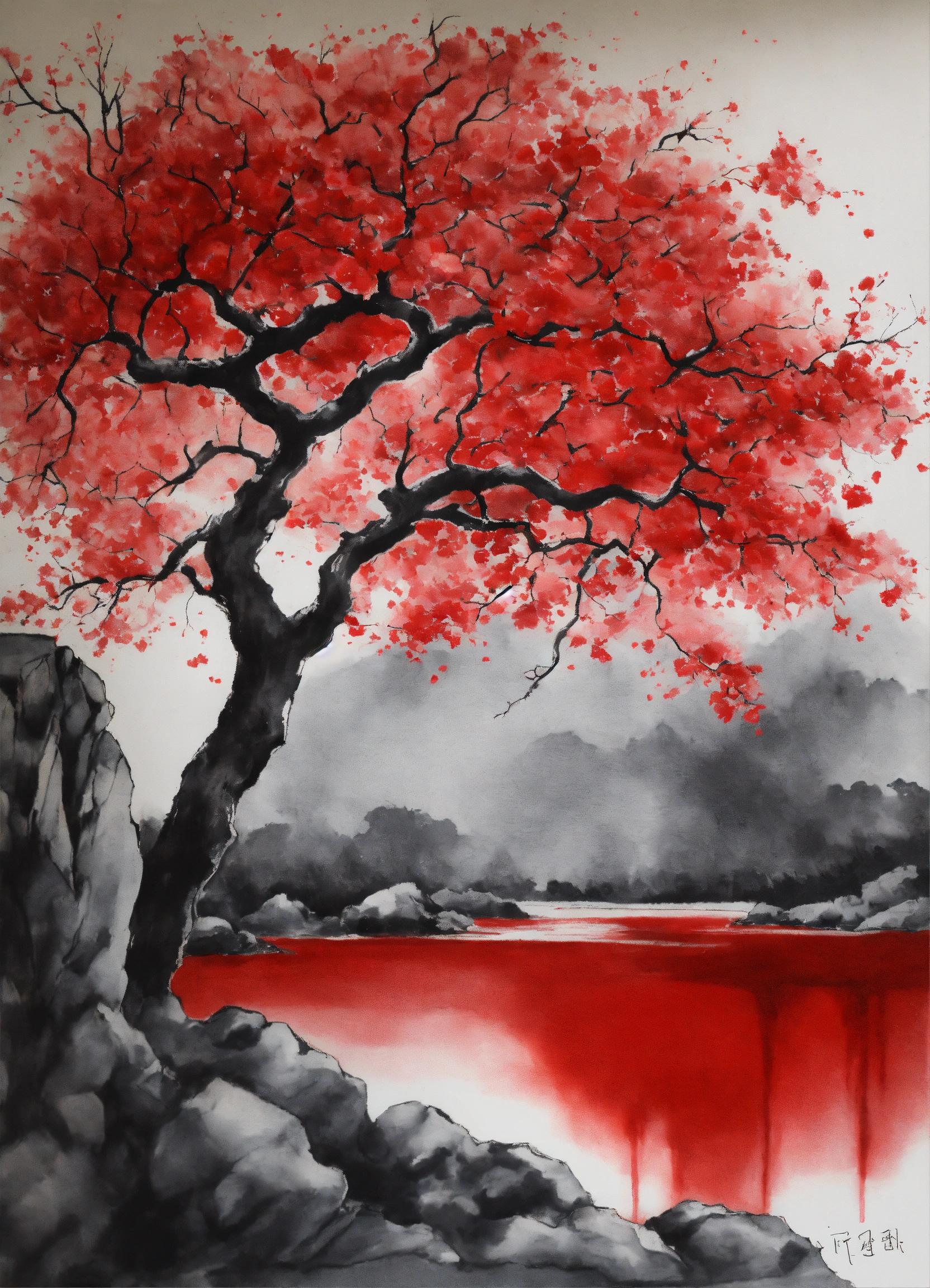 Tinta negra y roja, trebol de 4 hojas, en estilo chino, arte en tinta de mschiffer, boceto caprichoso y aproximado, (boceto1.3)