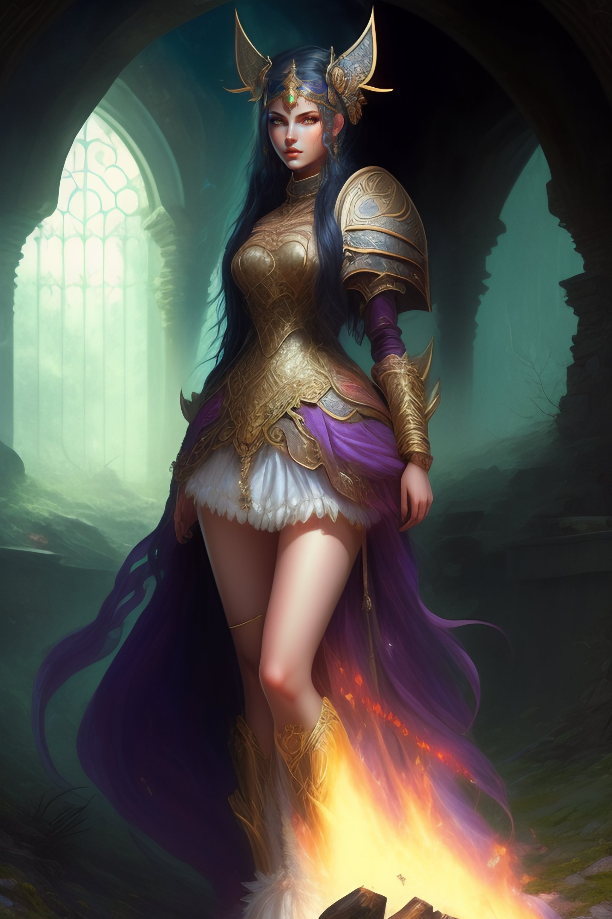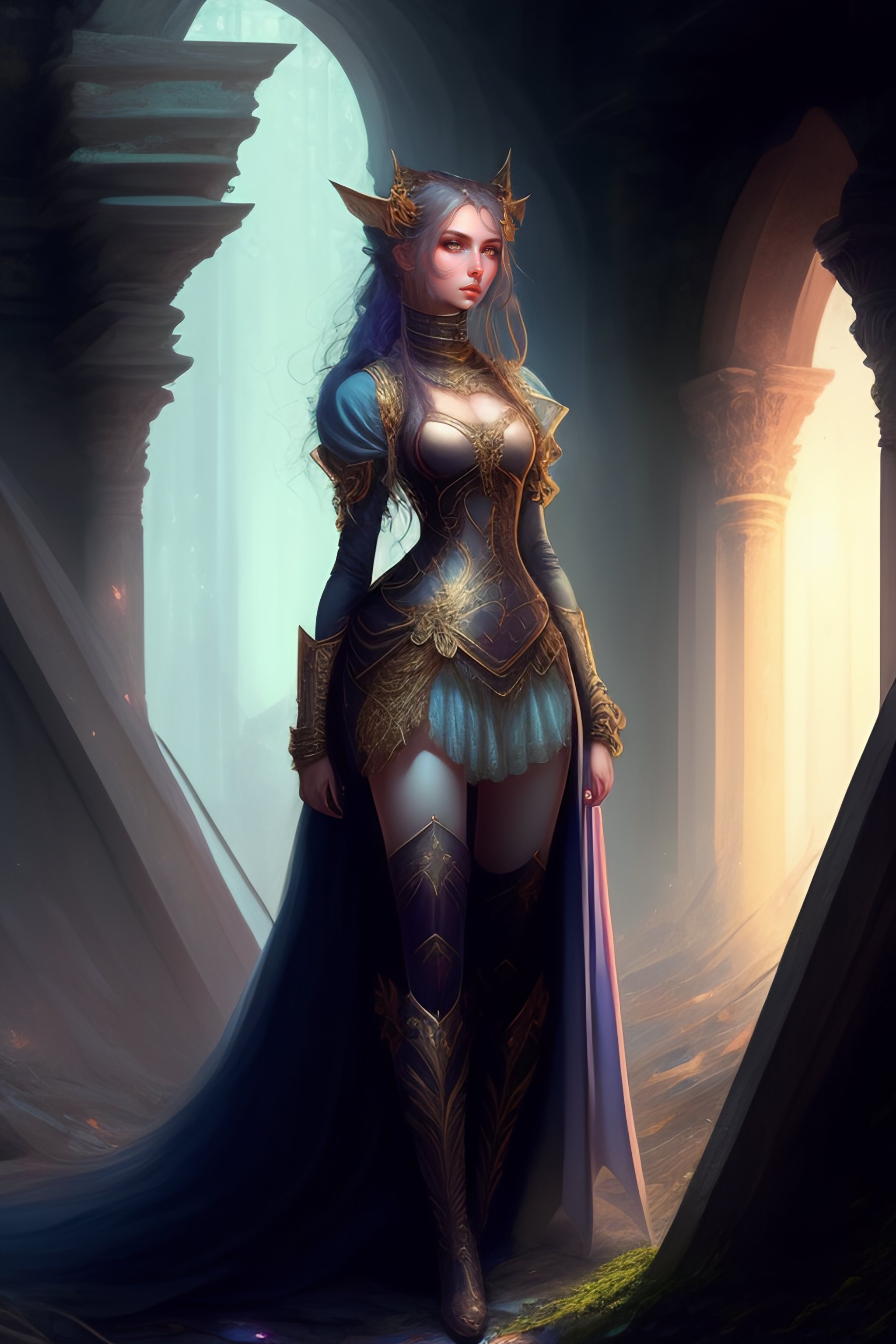 Hungarian slavic mughal anime cyber magical girl by gustave dore, full - body scifi character in abandoned workshop ruins environment