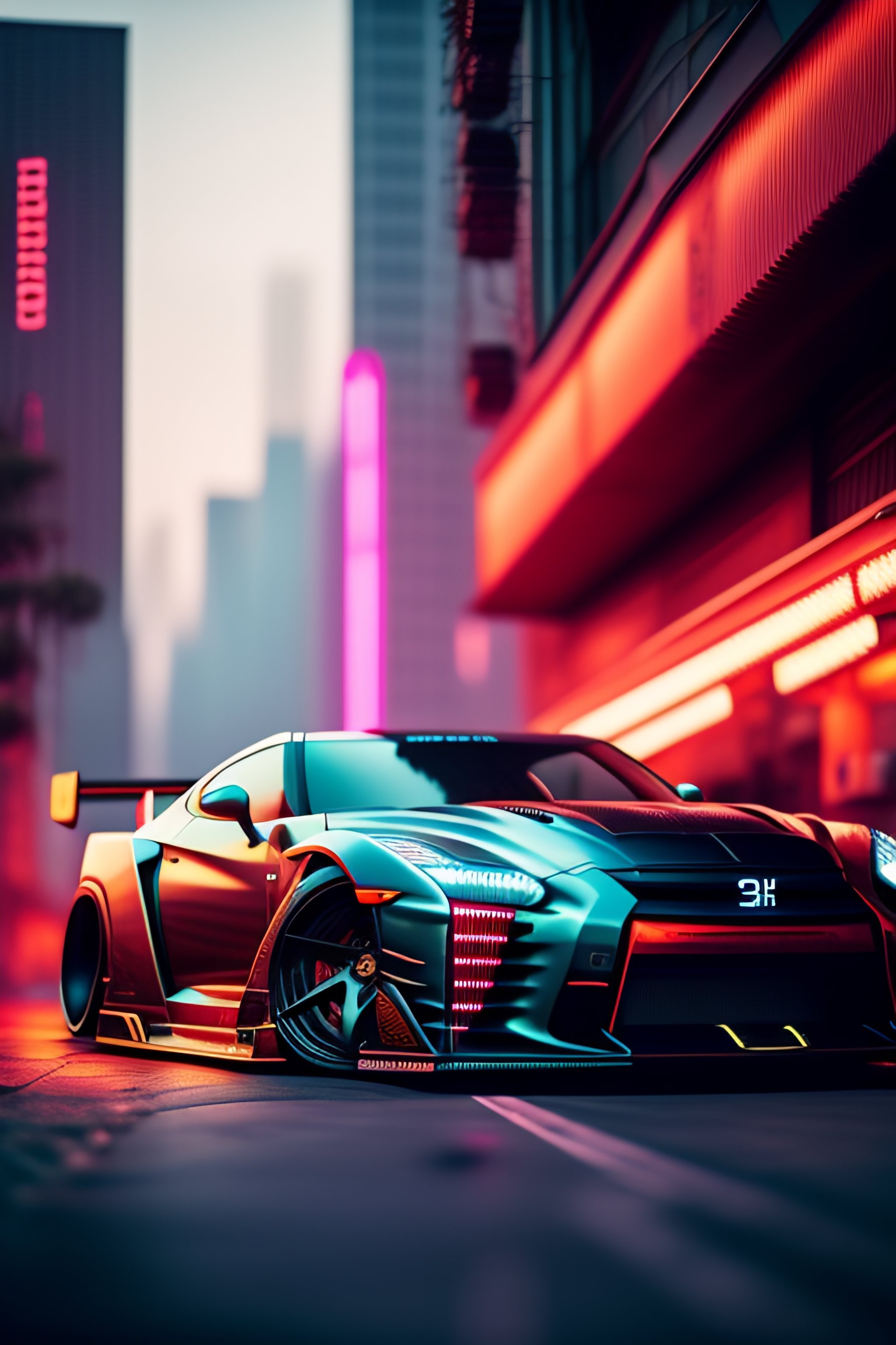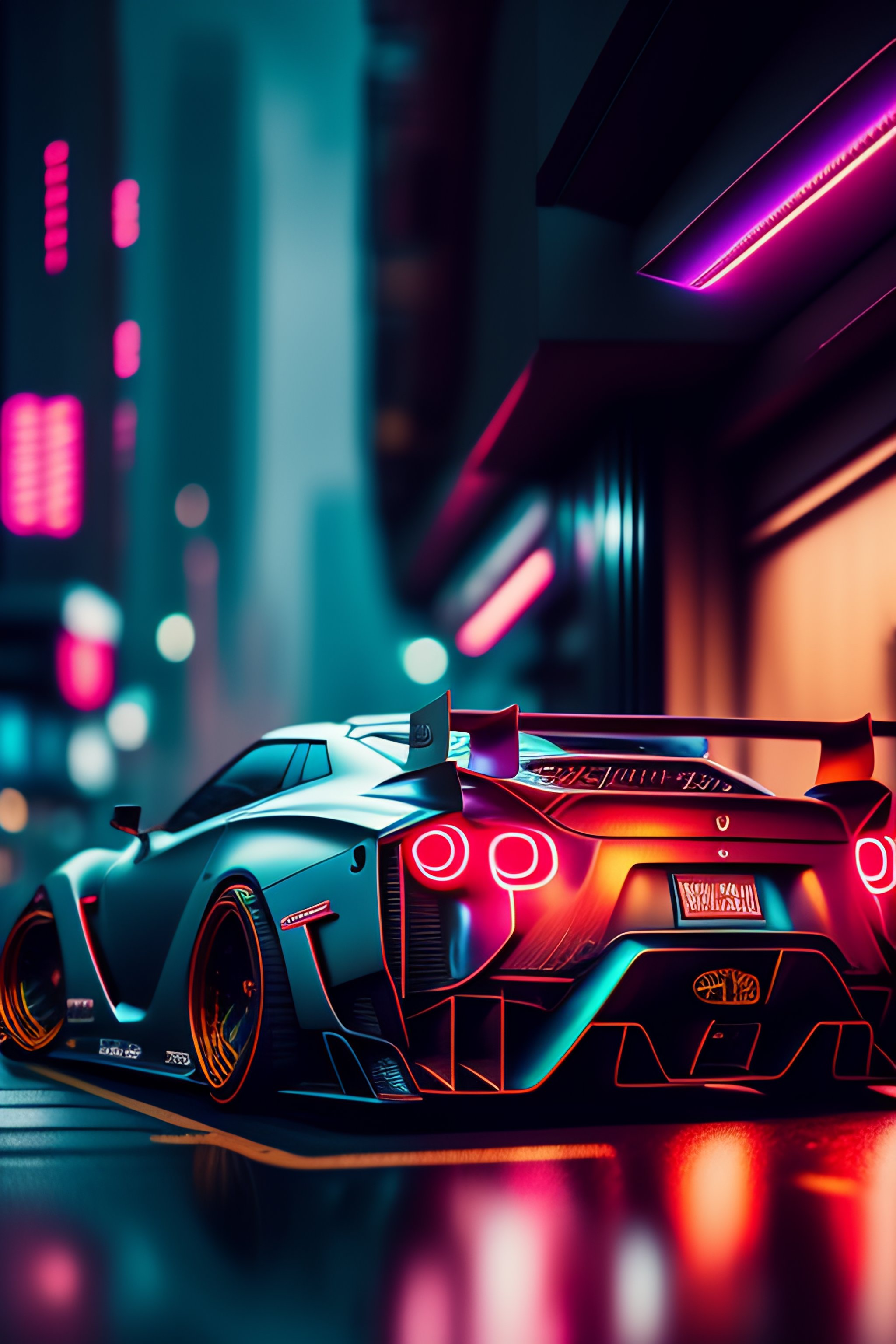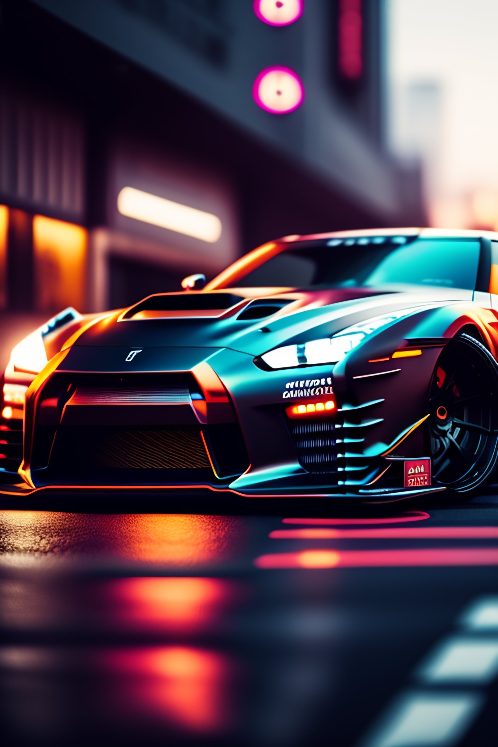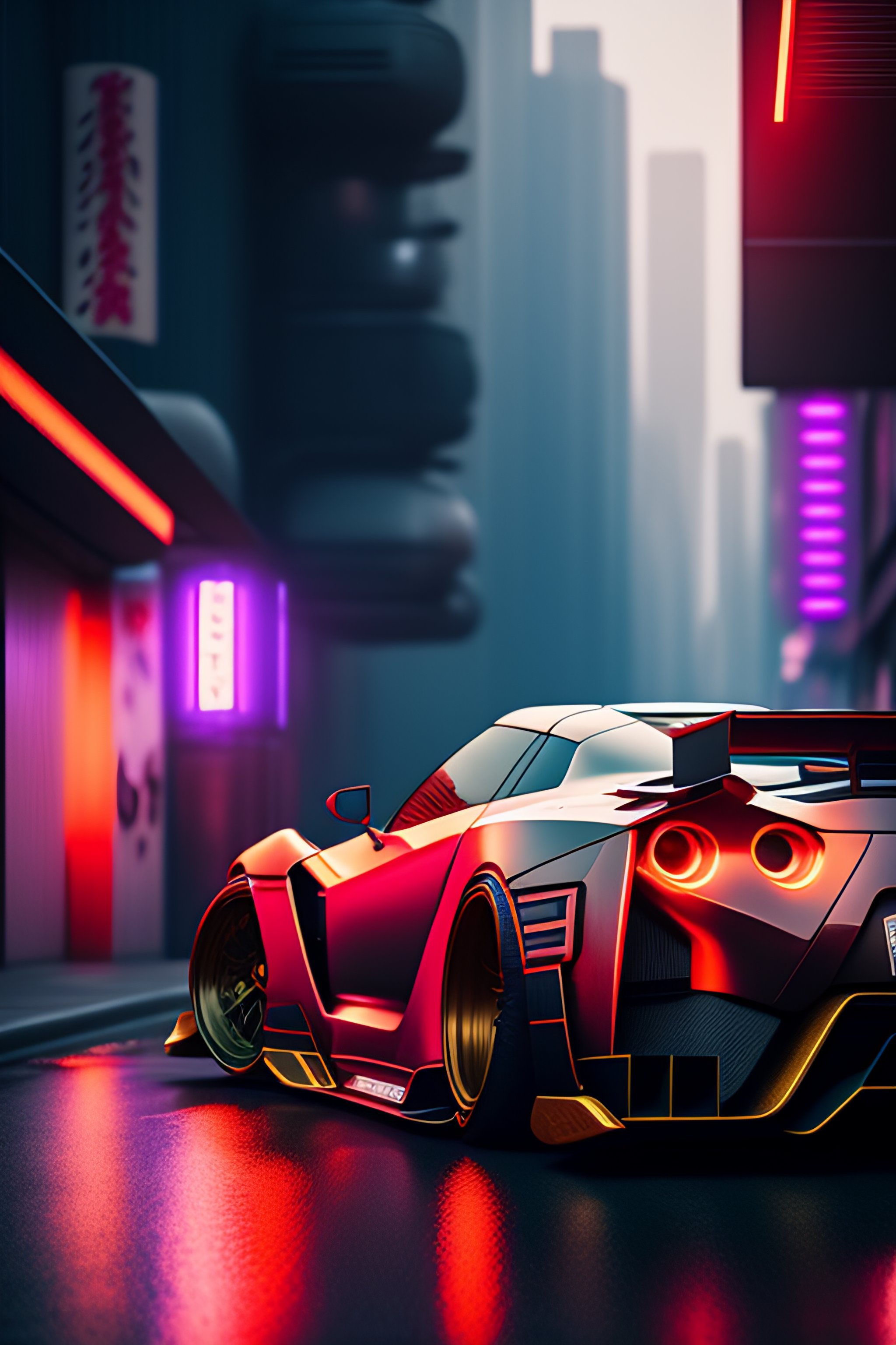 Japanese otomotif magazine hedline of cyberpunk carnissan gtr on the background of drak dirty style cyberpunk city in the syle by nicholas hiattcinematic, cinematic lighting, raytracing, 8 k, octane render, volumetric, vivid, beautiful, hyperrealism