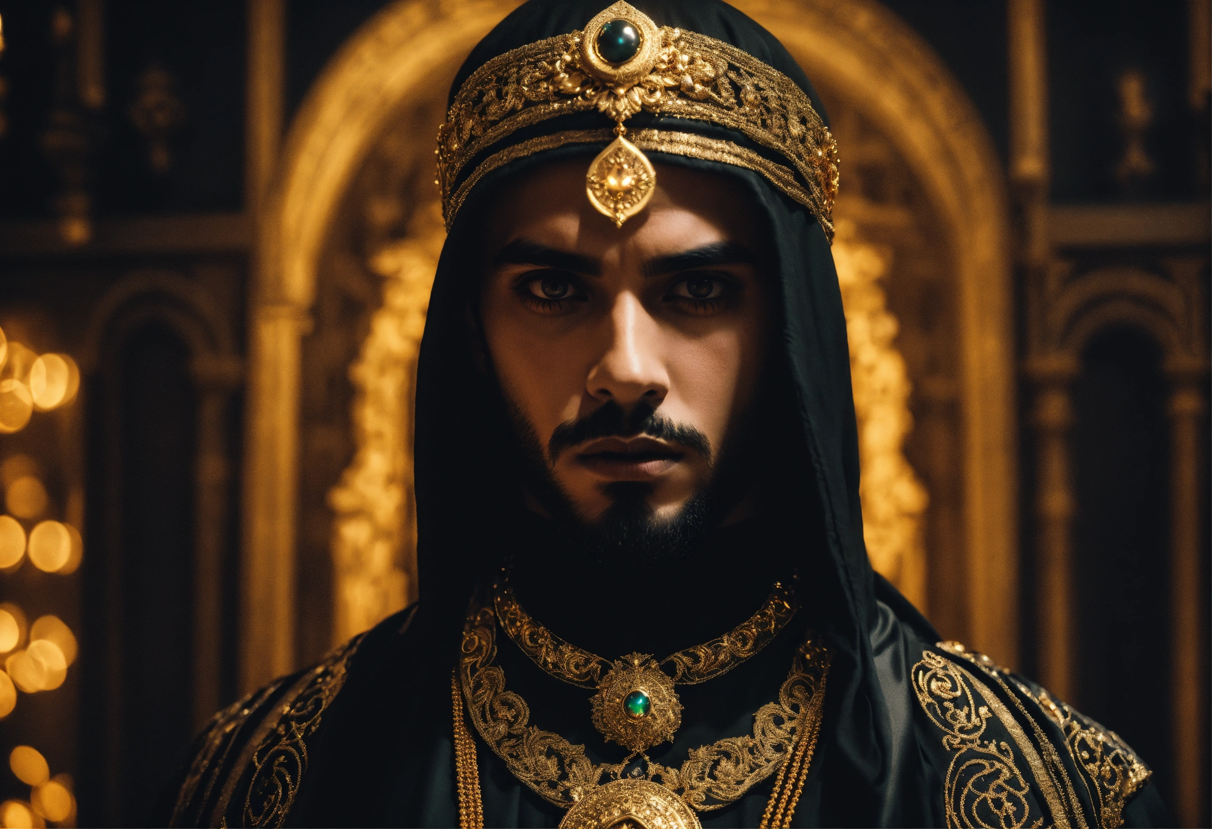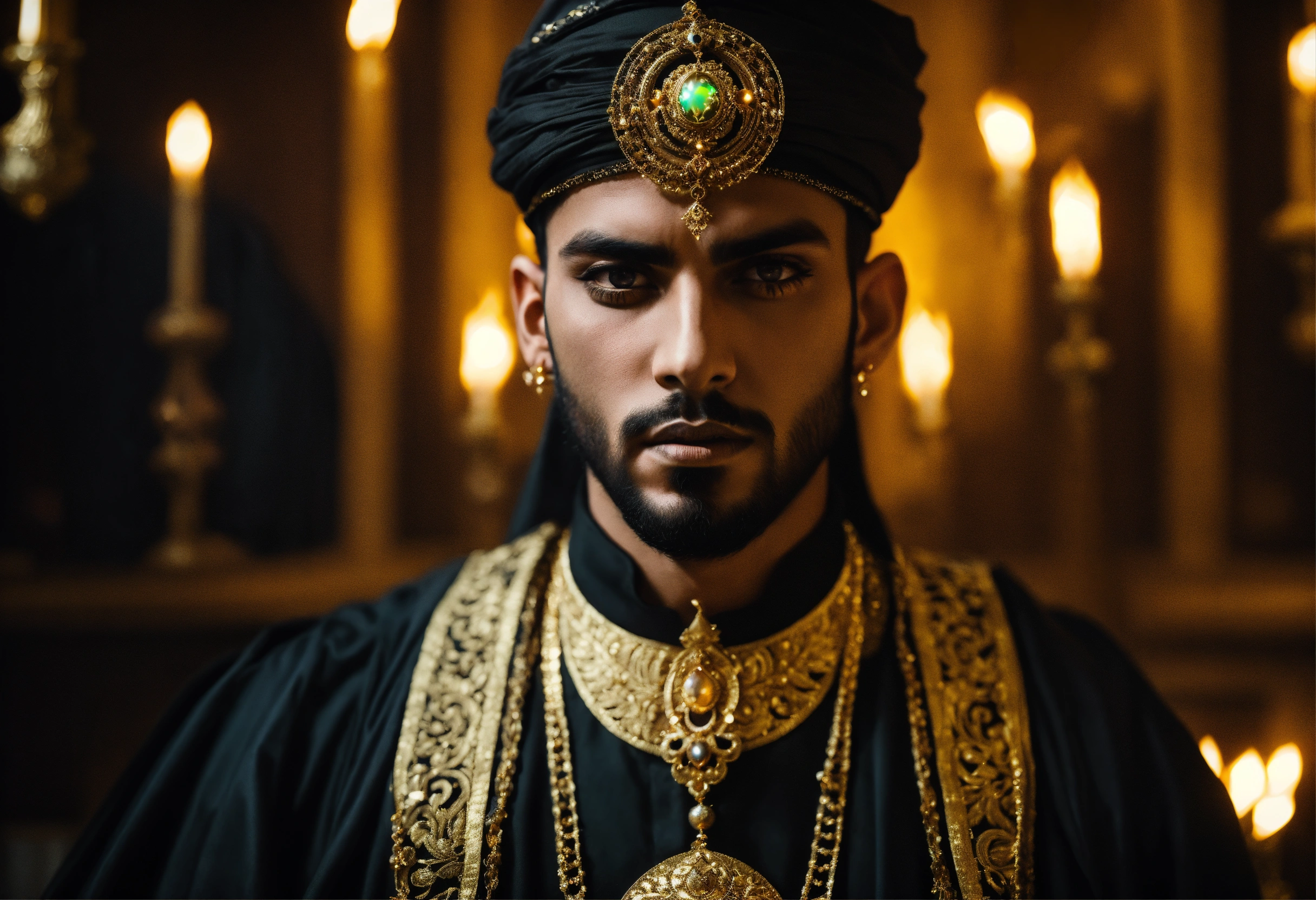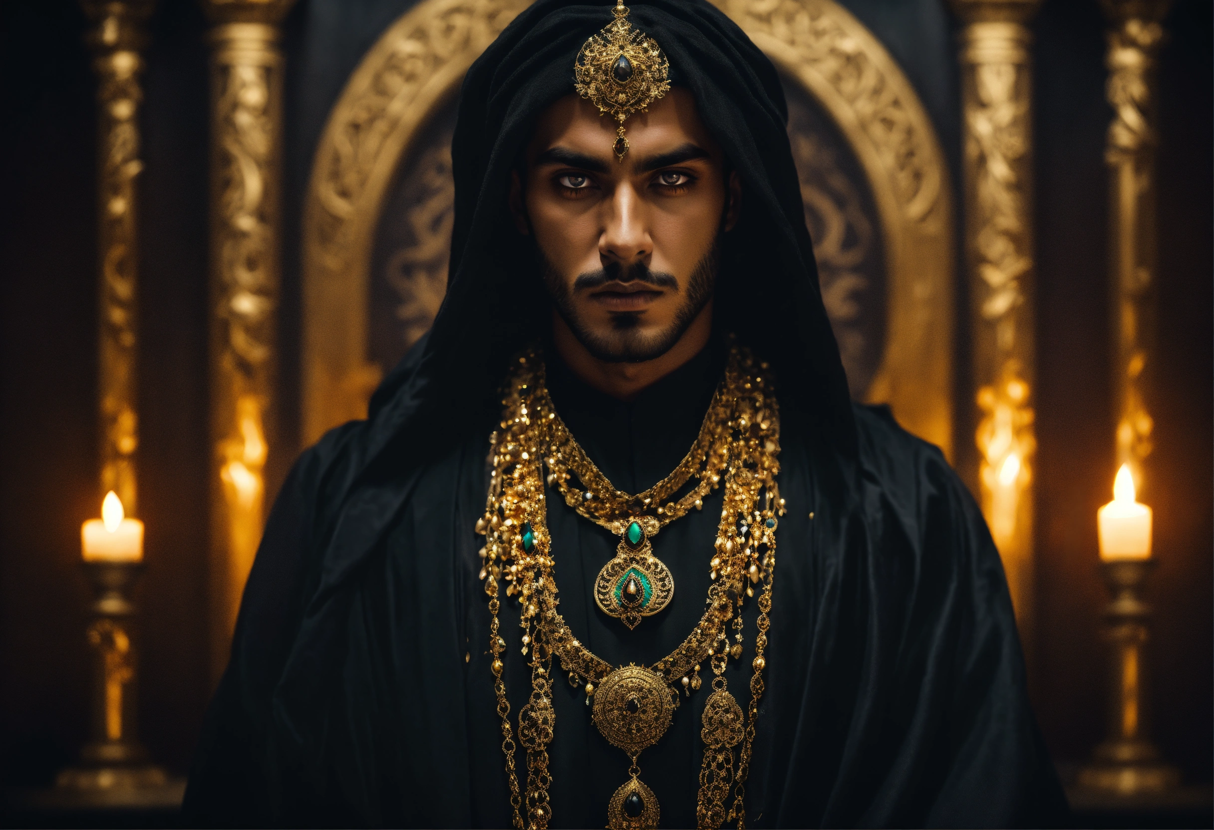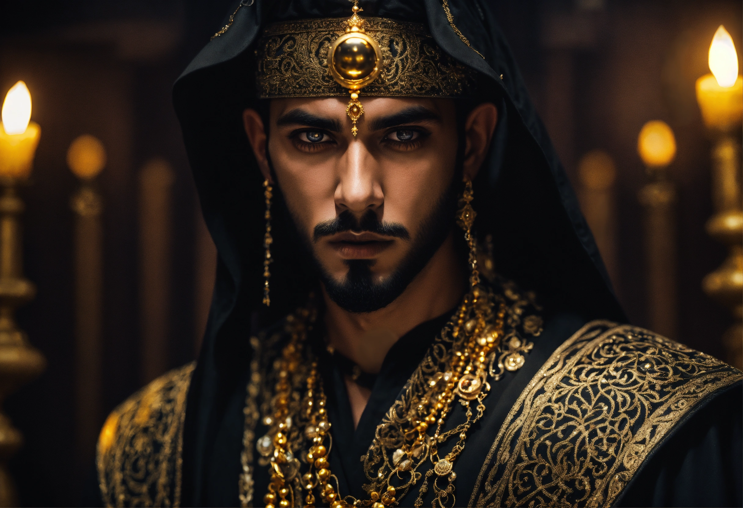 Dark, mysterious and dramatic headshot of a young handsome arabic evil sorcerer with glowing hypnotising eyes wearing black elaborate robes and ornate gold jewellery in a sinister occult temple