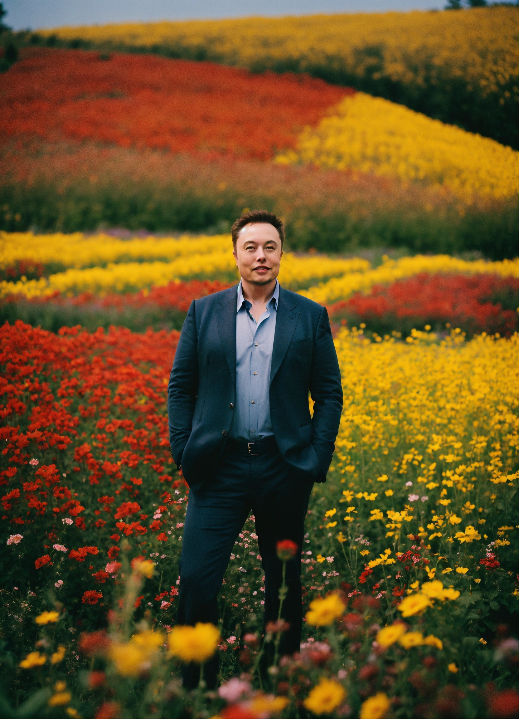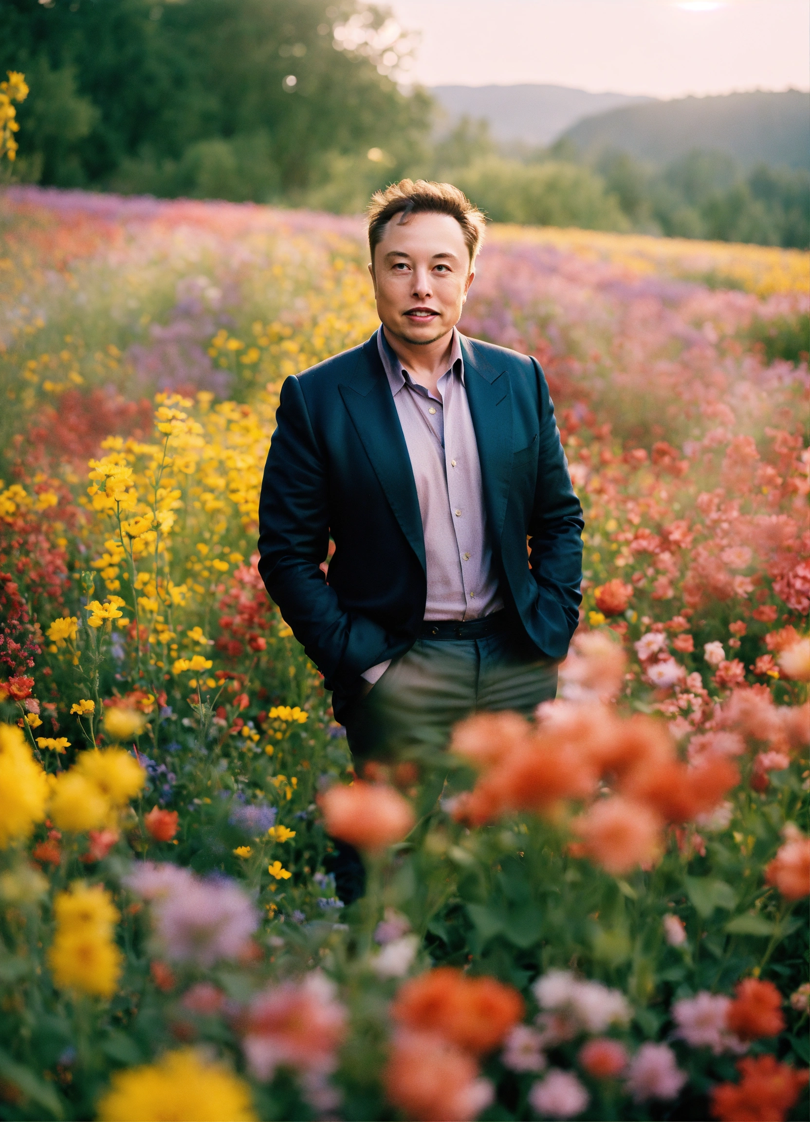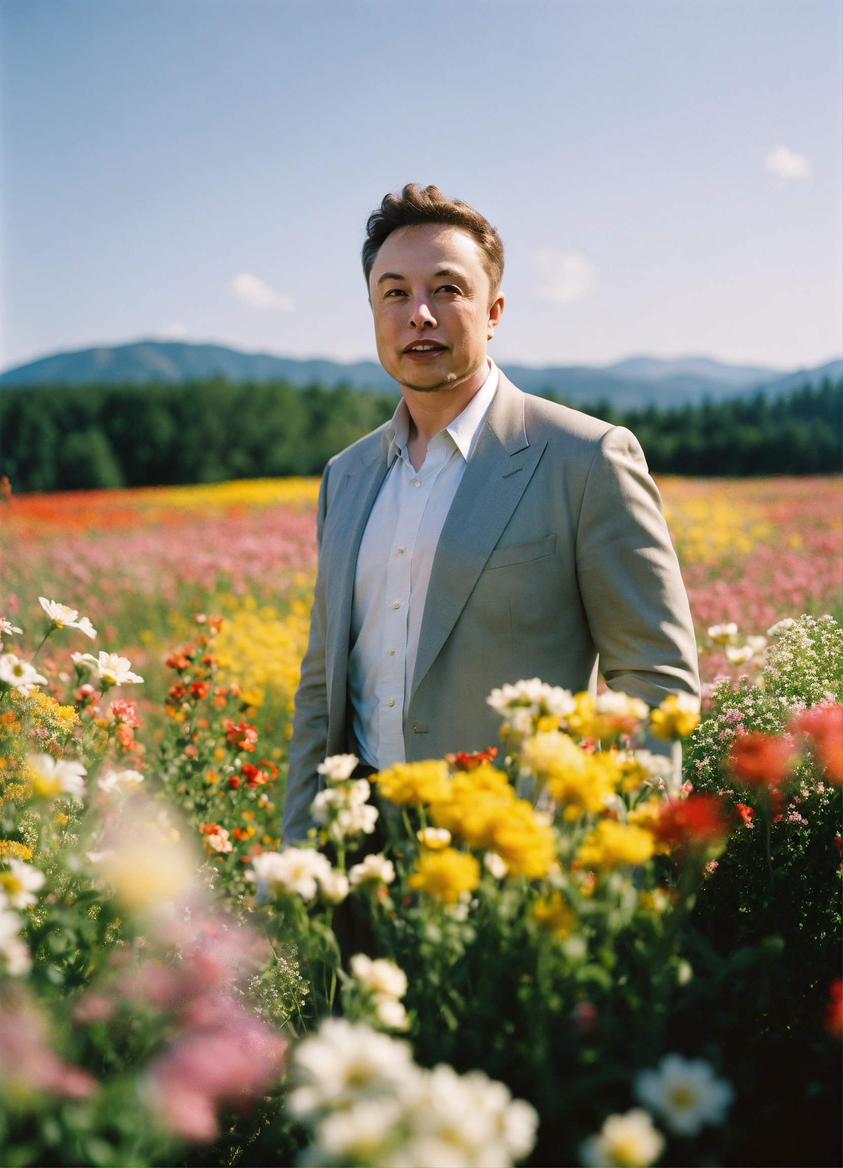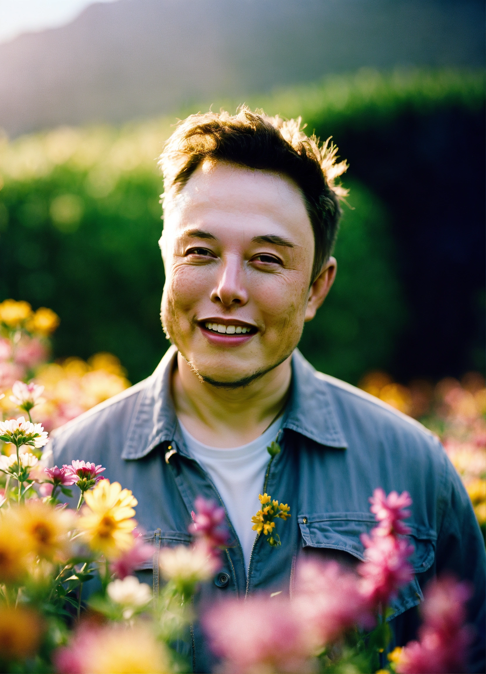 Happy elon musk standing in a beautiful field of flowers, colorful, perfect lighting, leica summicron 35mm f2.0, kodak portra 400, film grain