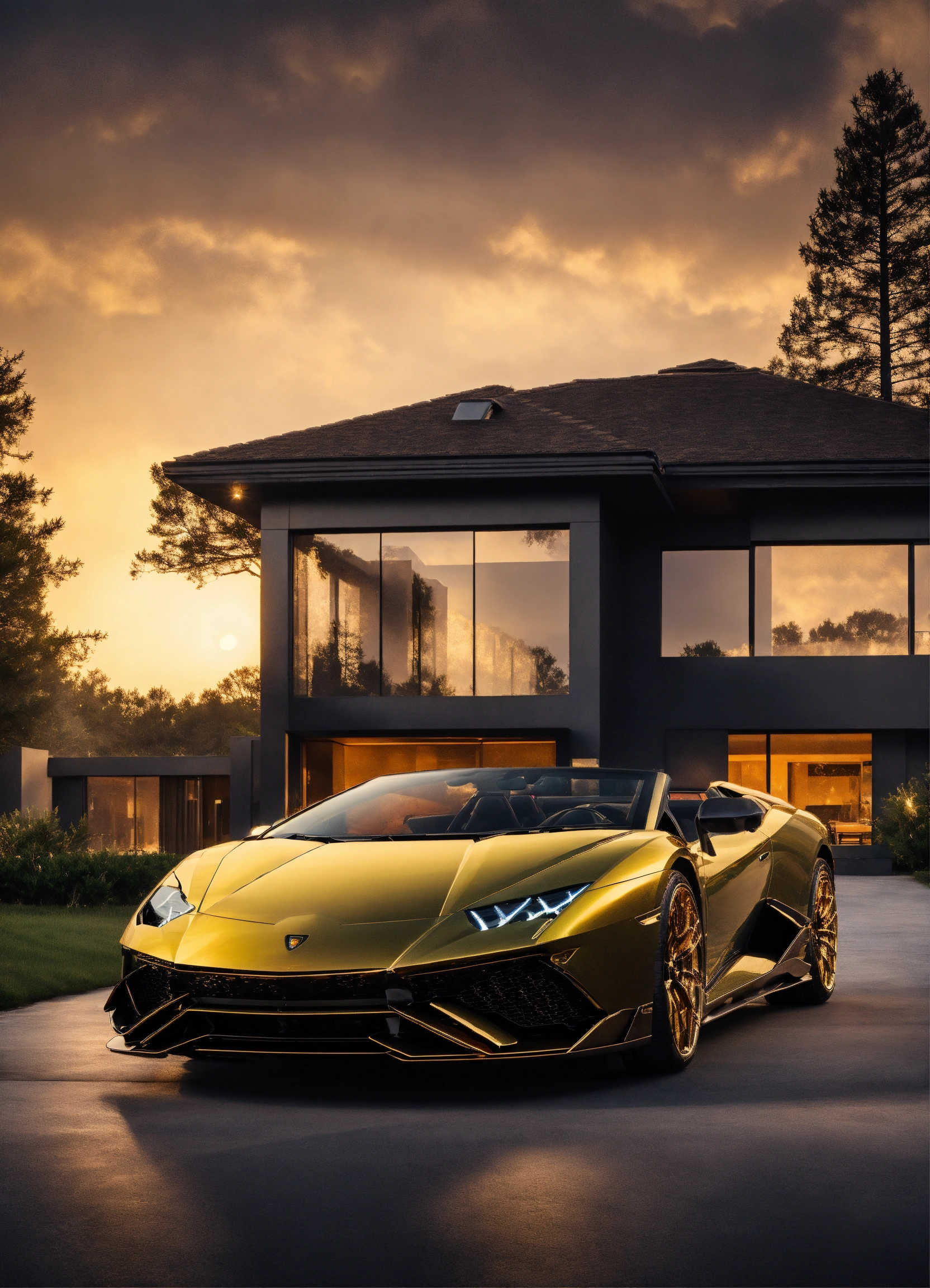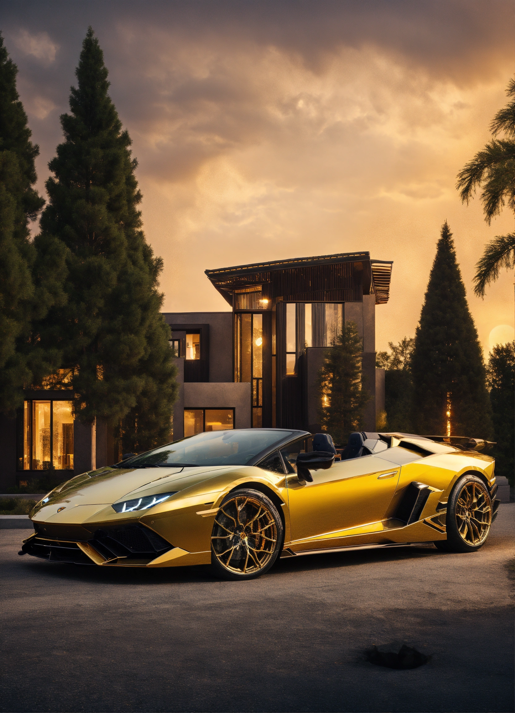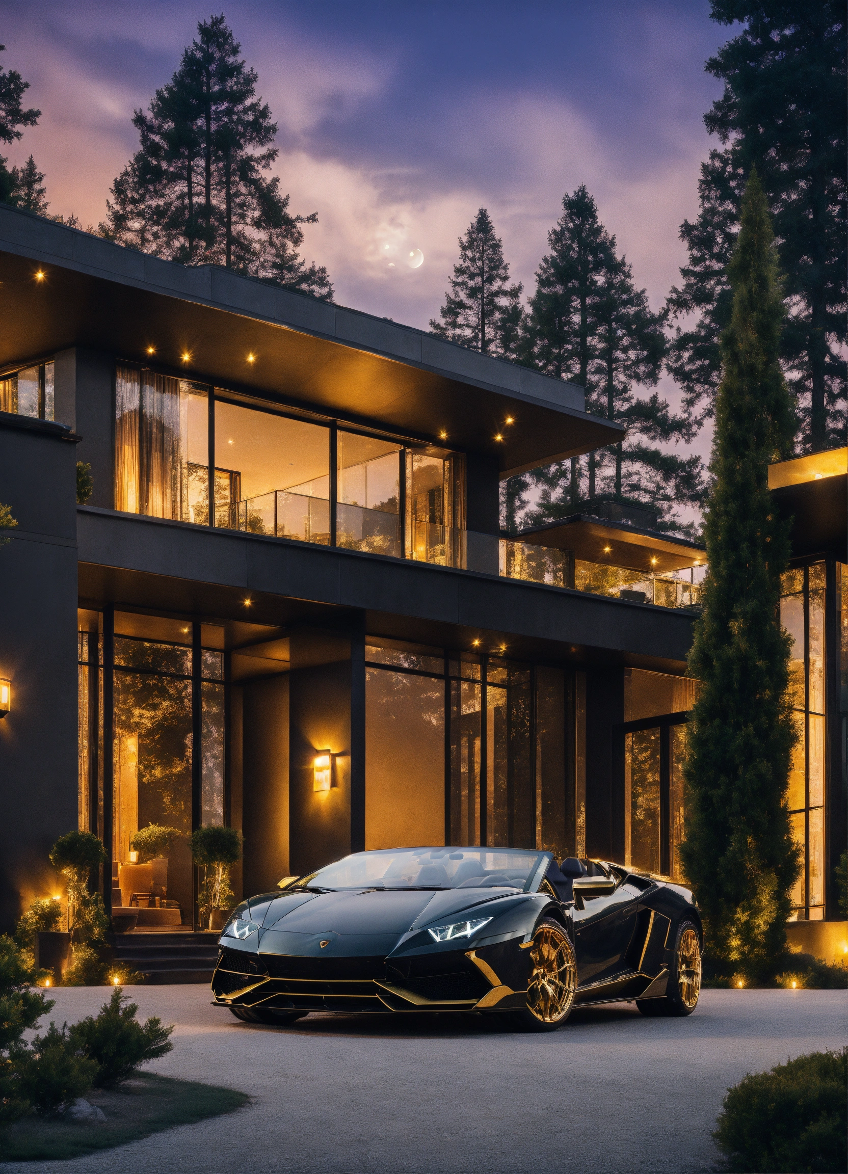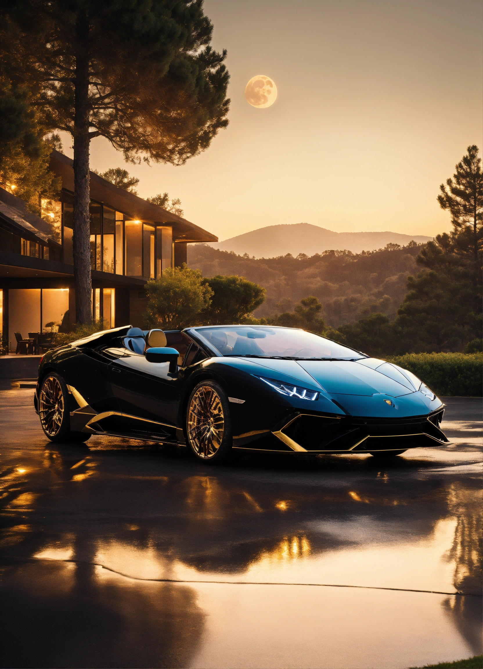 2023 lamborghini hurricane convertible black and gold trim with modern contemporary mansion with pine trees landscape and golden moonlight background