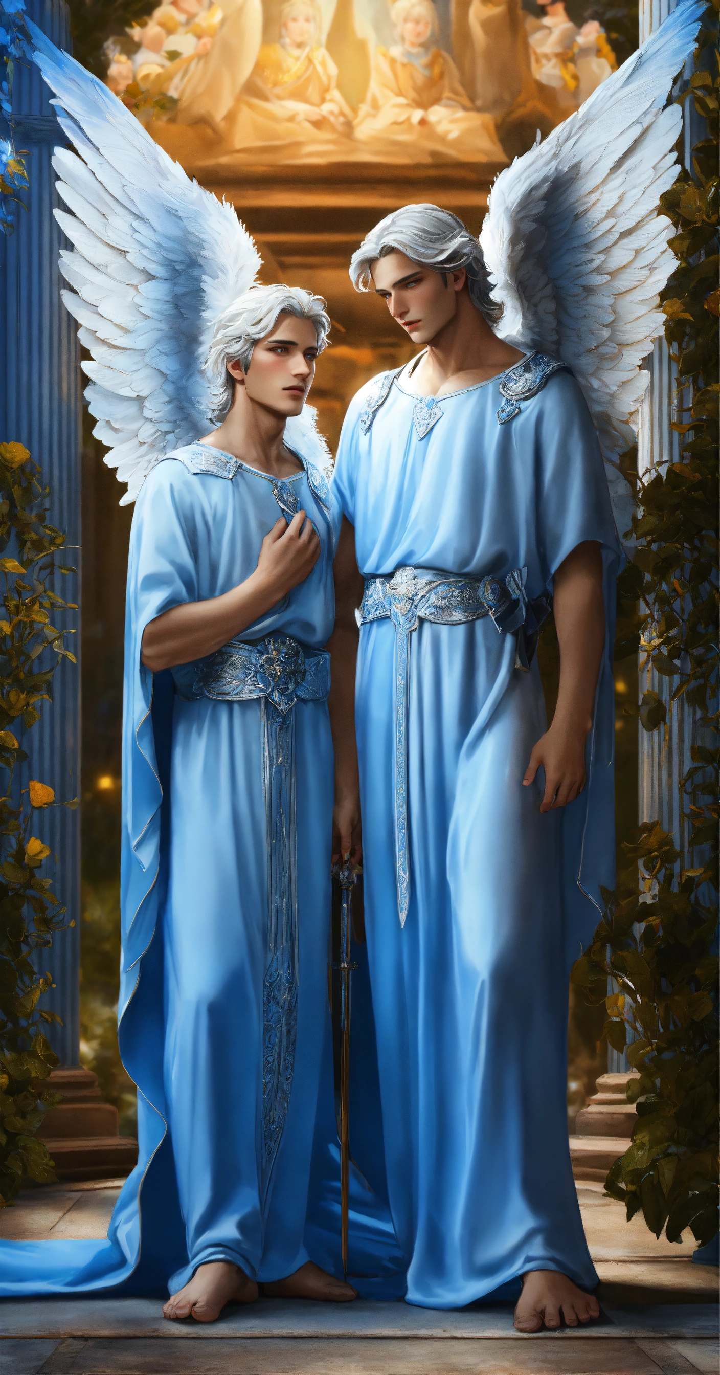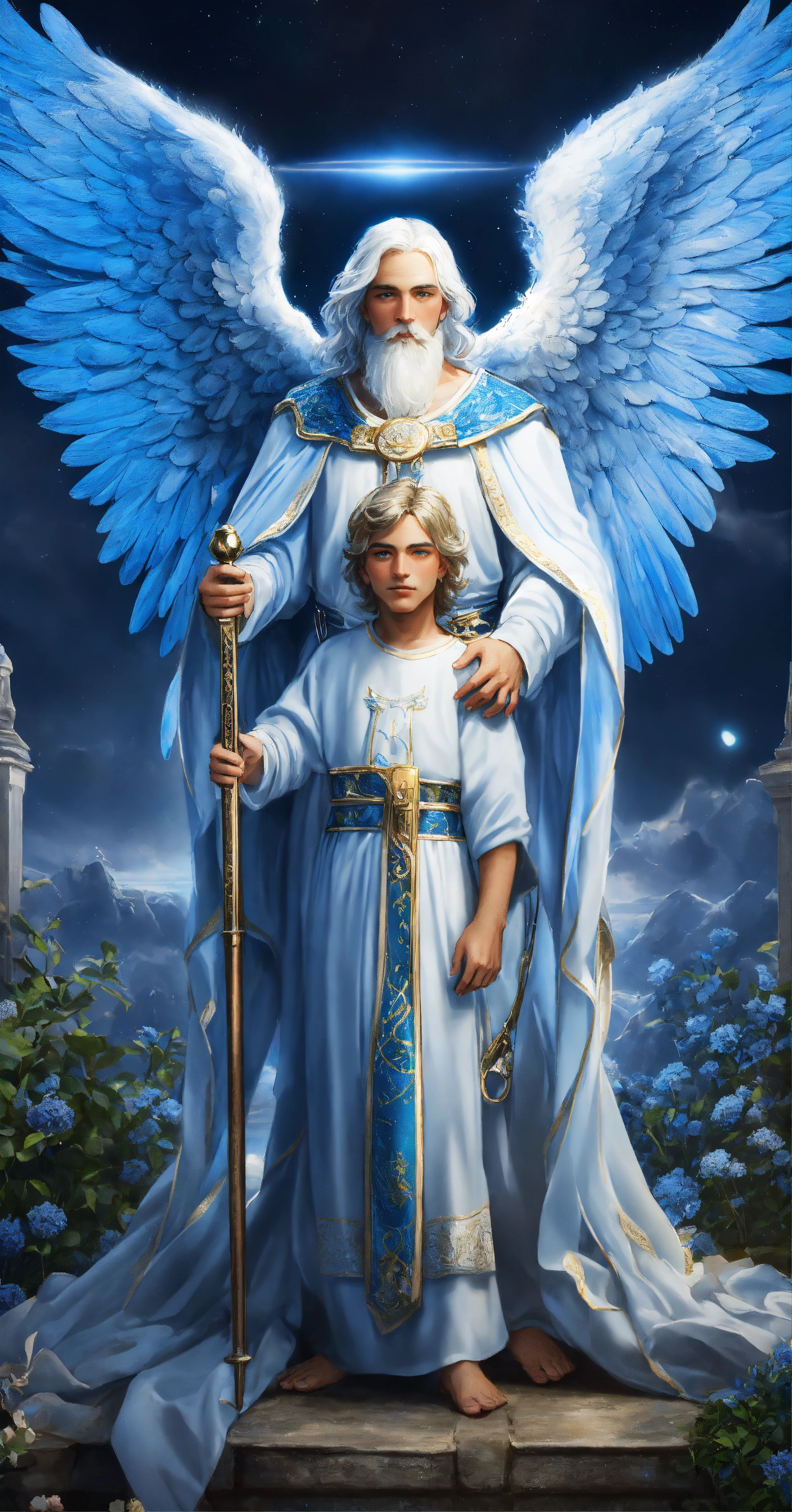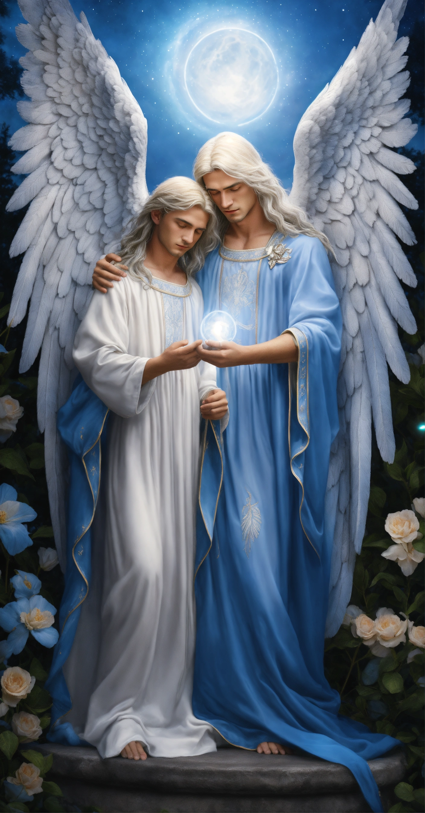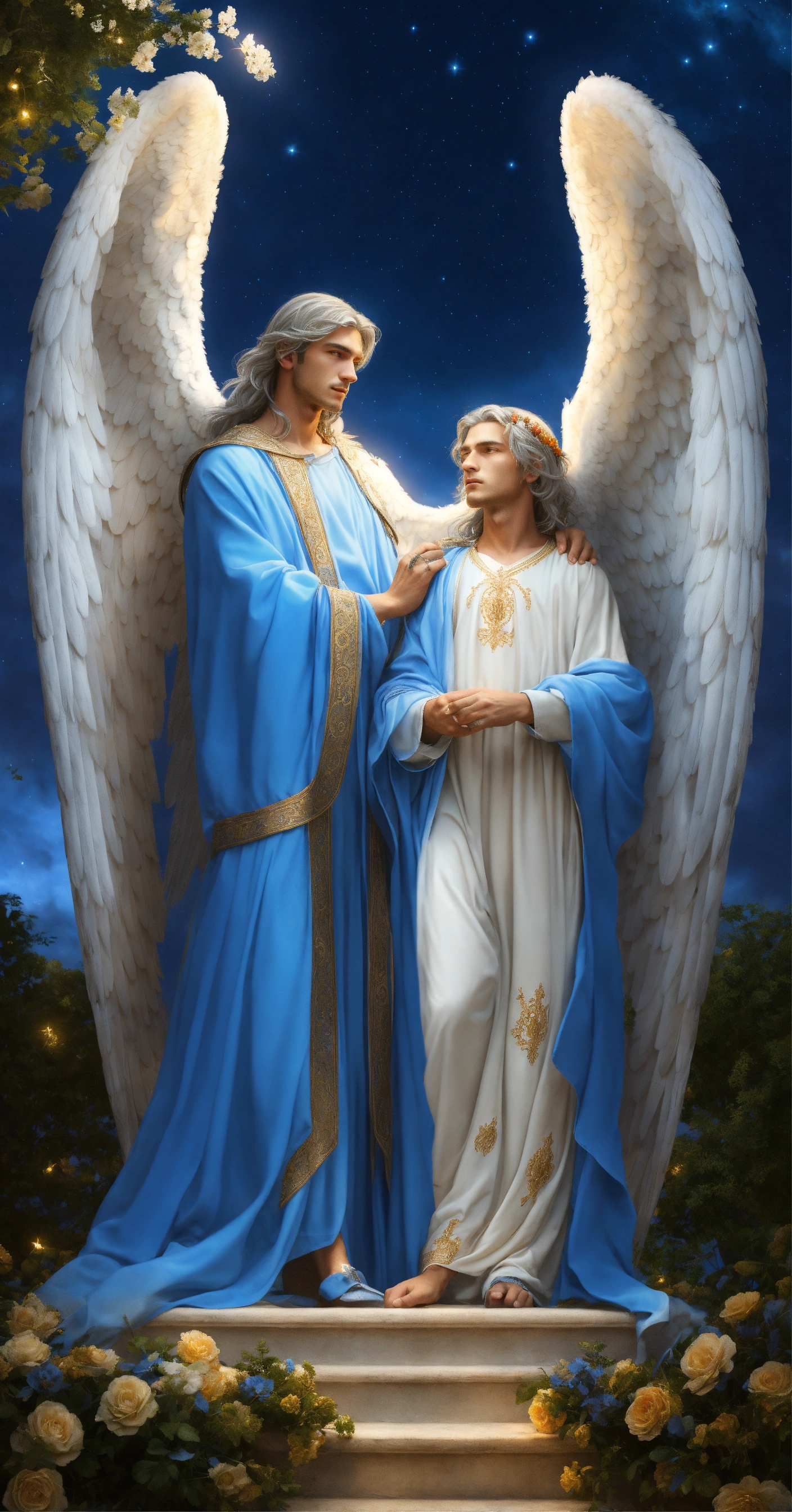 2 male guardian angels with detailed and luminous blue angel wings. 1 30-year-old male angel protecting a 9-year-old male angel child. the 2 male angels have large, uniform luminous blue wings. their faces beautiful and detailed. very clear eyes that open with a deep and penetrating look. detailed and manly white hair. white tunic-type dresses with many blue and silver details. they are in a beautiful, detailed garden with a night sky. hyper-detailed, hyper-realistic illustration. realism. masterpiece. digital art, hd, high quality. high definition, high definition. 8k.
