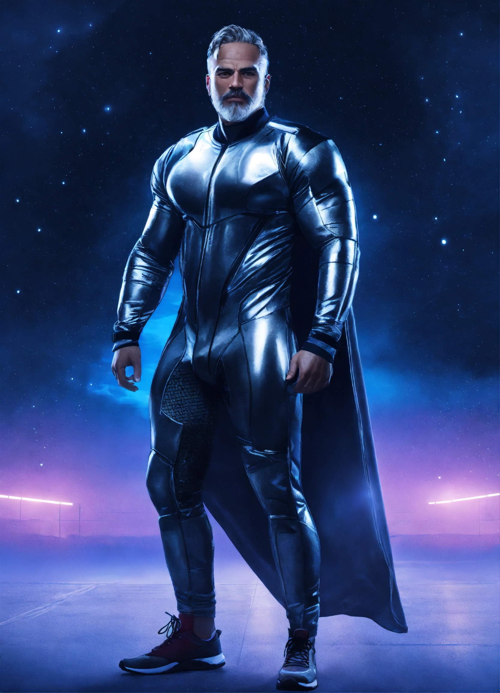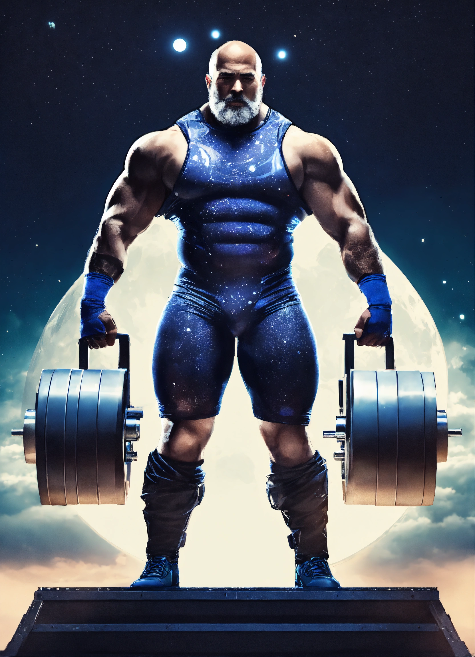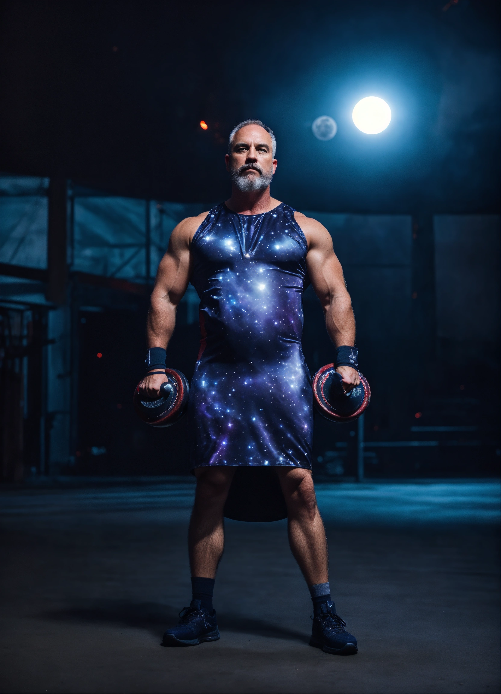 Middle age man, moonlight on the background, fullbody oversize futuristic cosmic dress, athletic shape, powerlifter