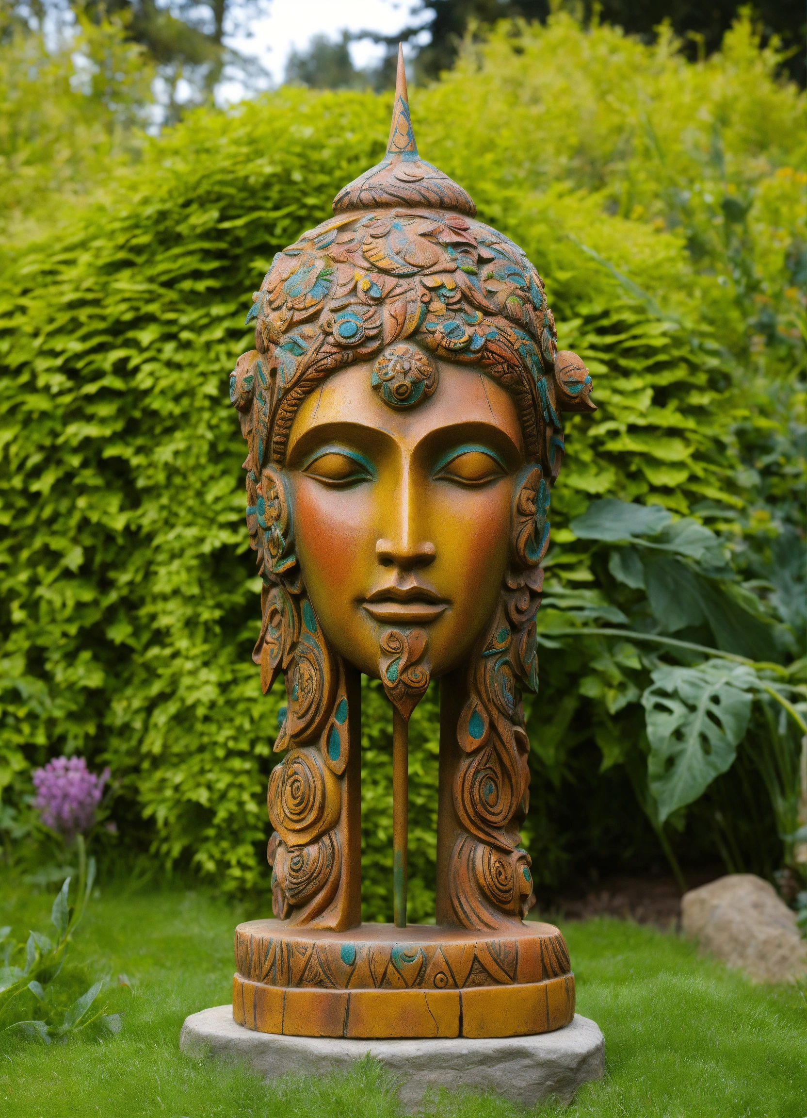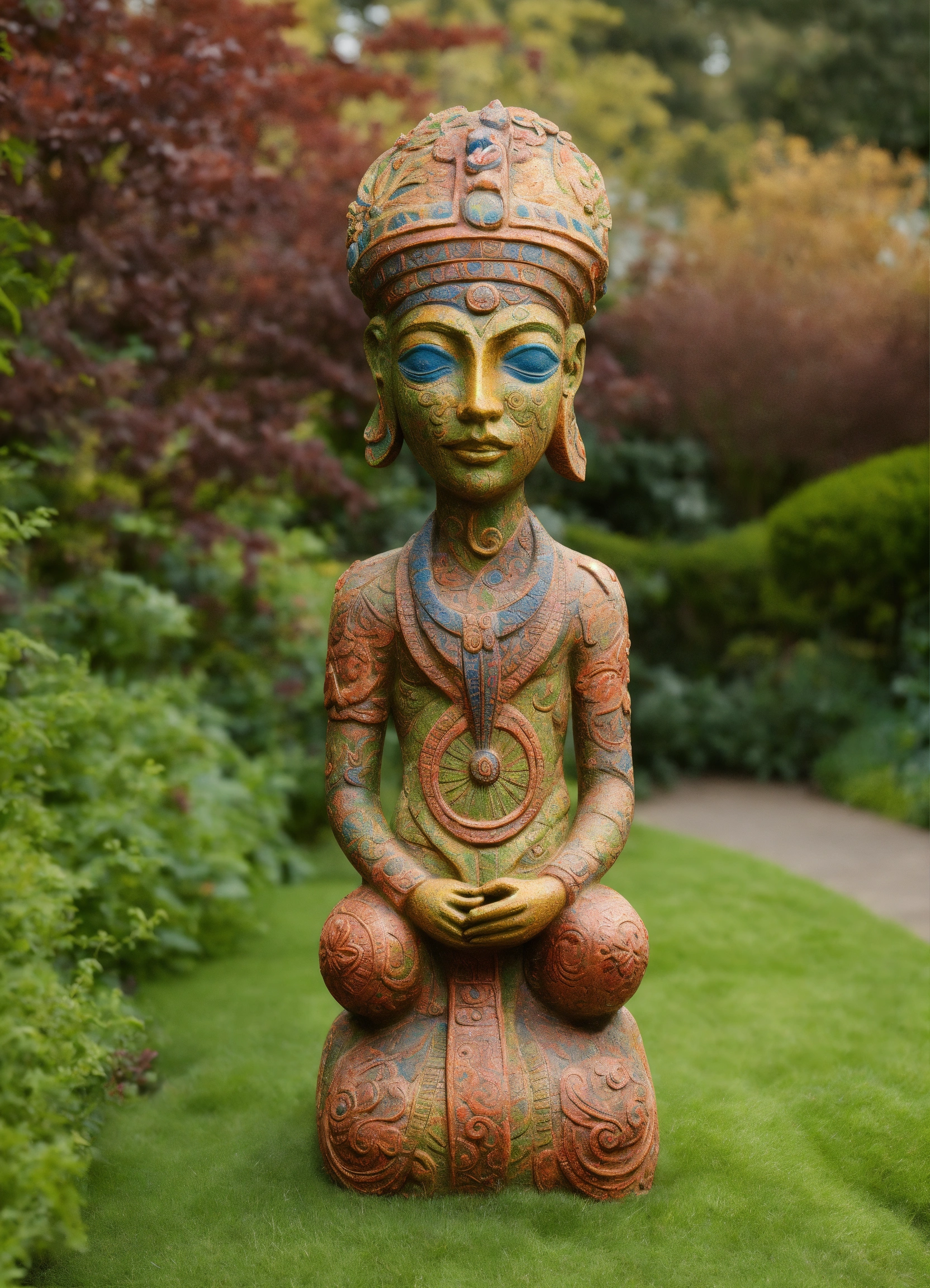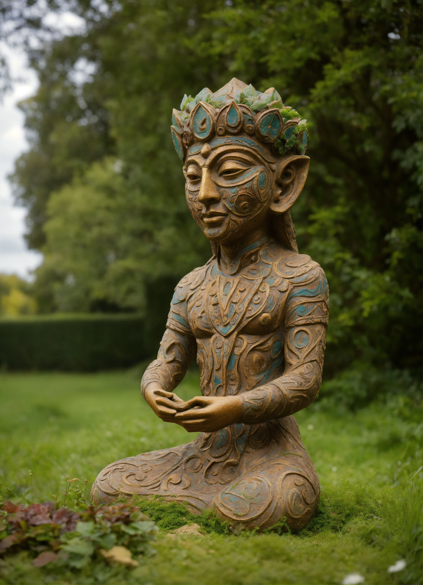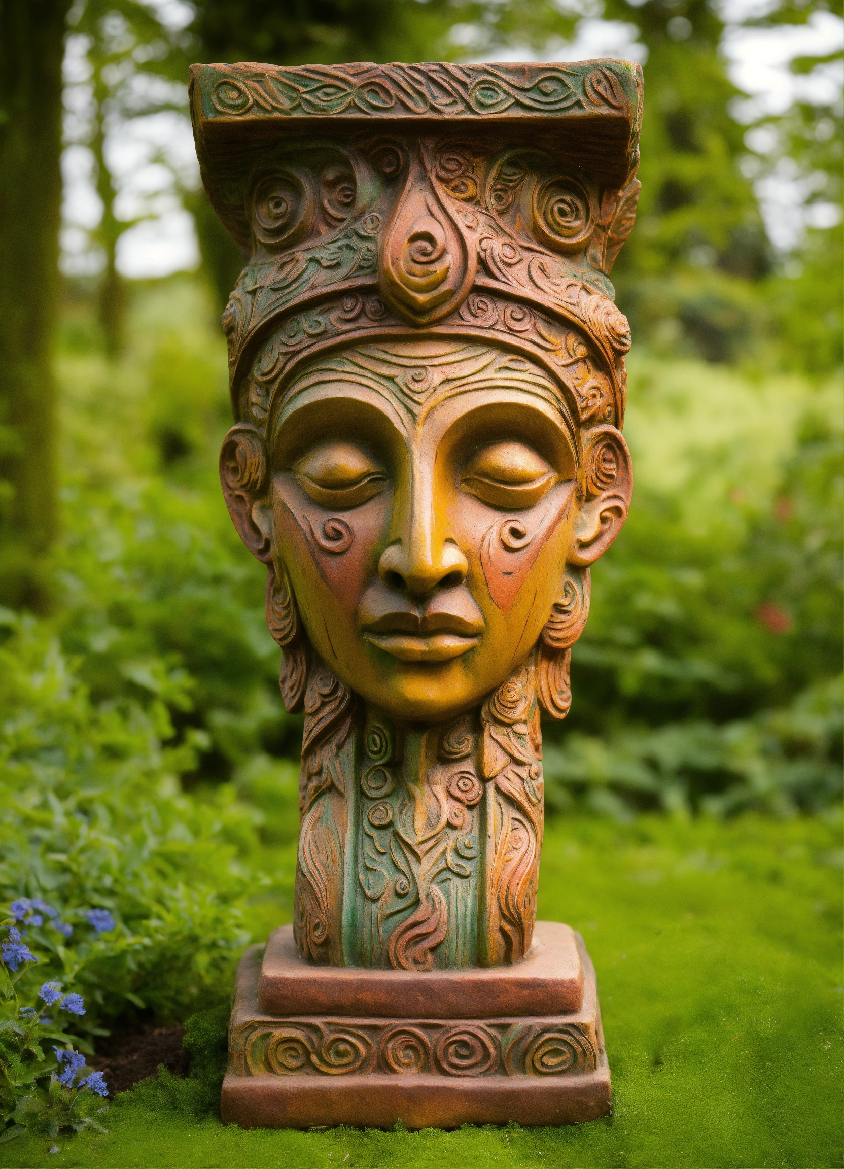 Ancient woodland deity sculpted garden ornament in the style of alex grey