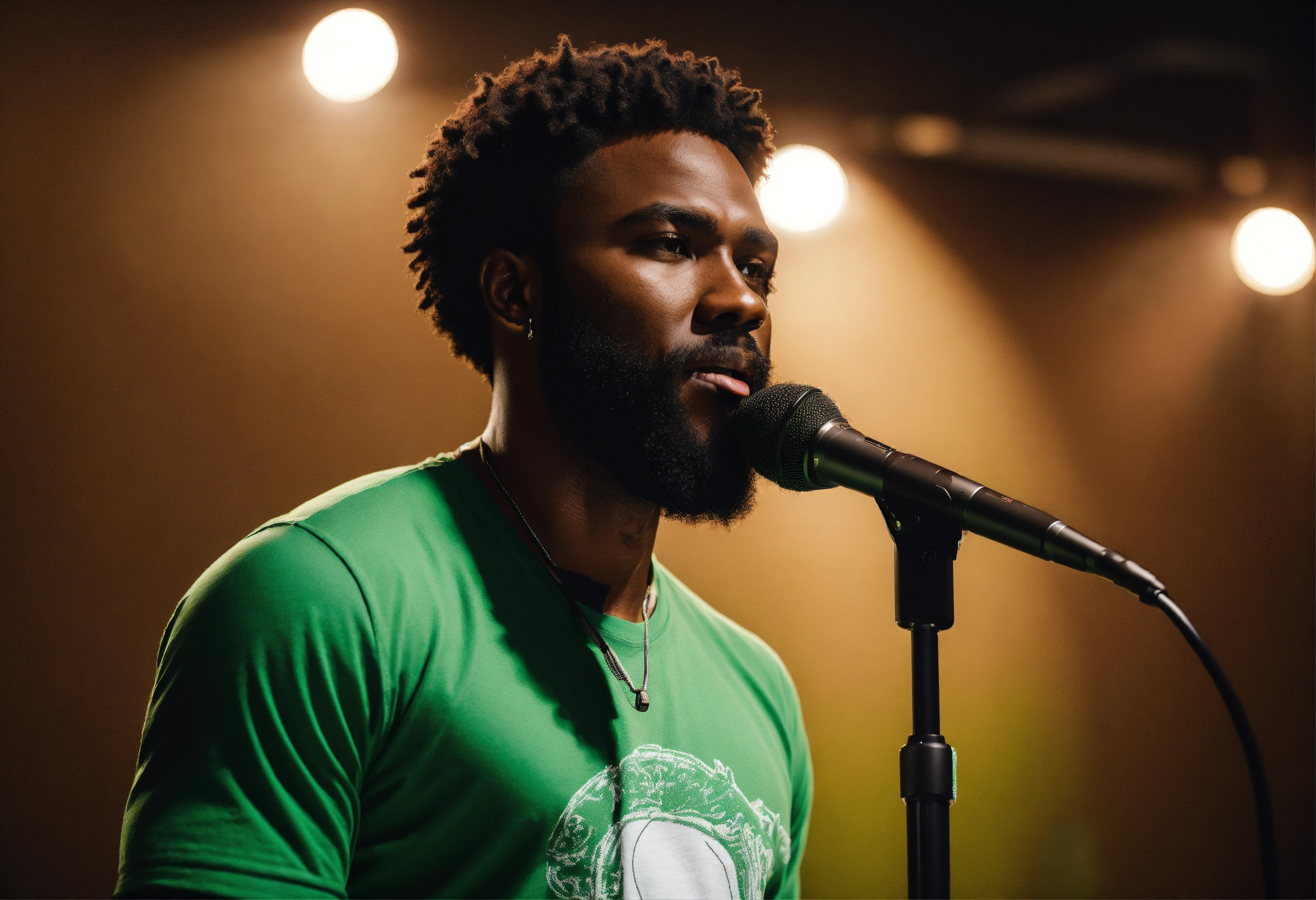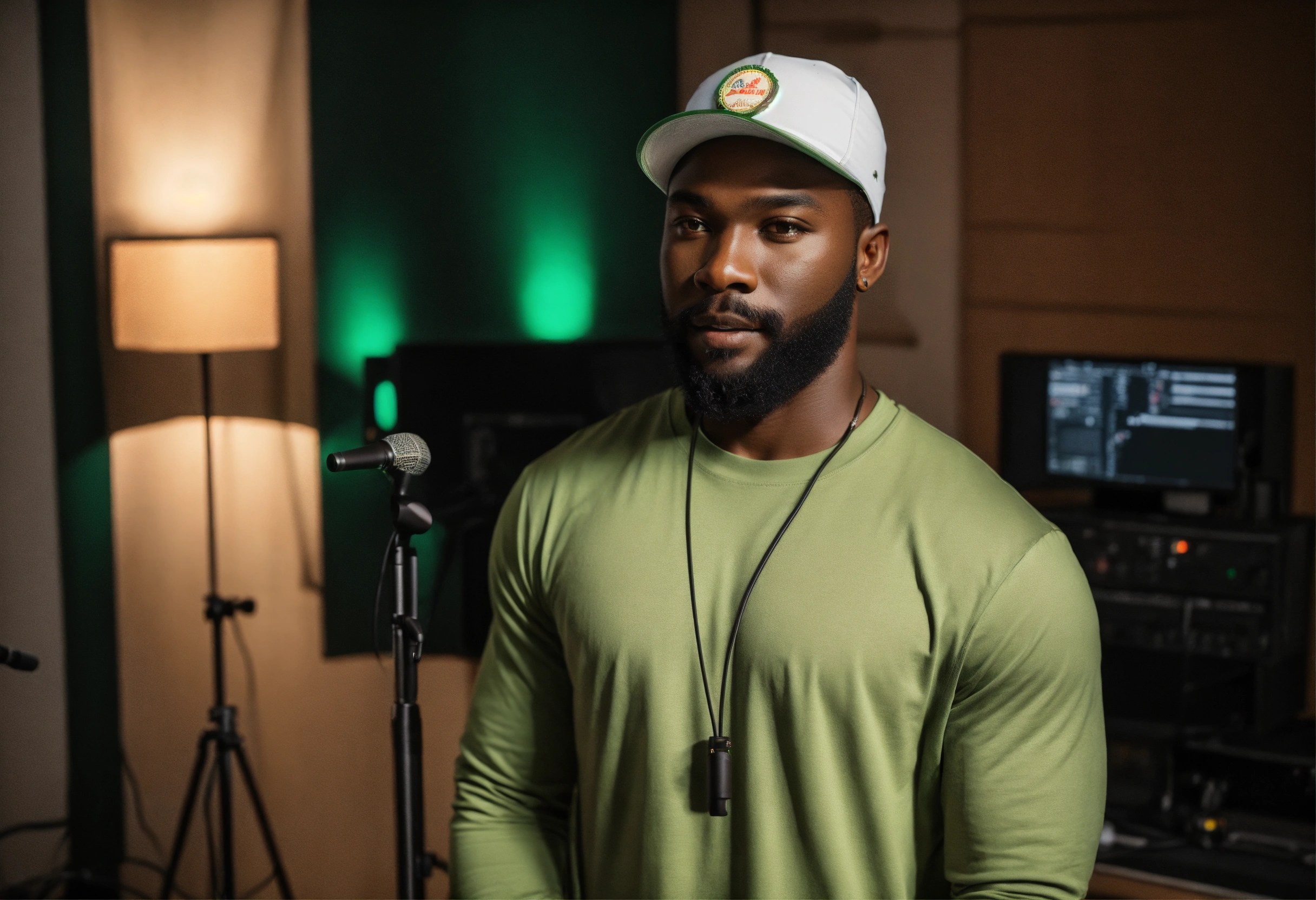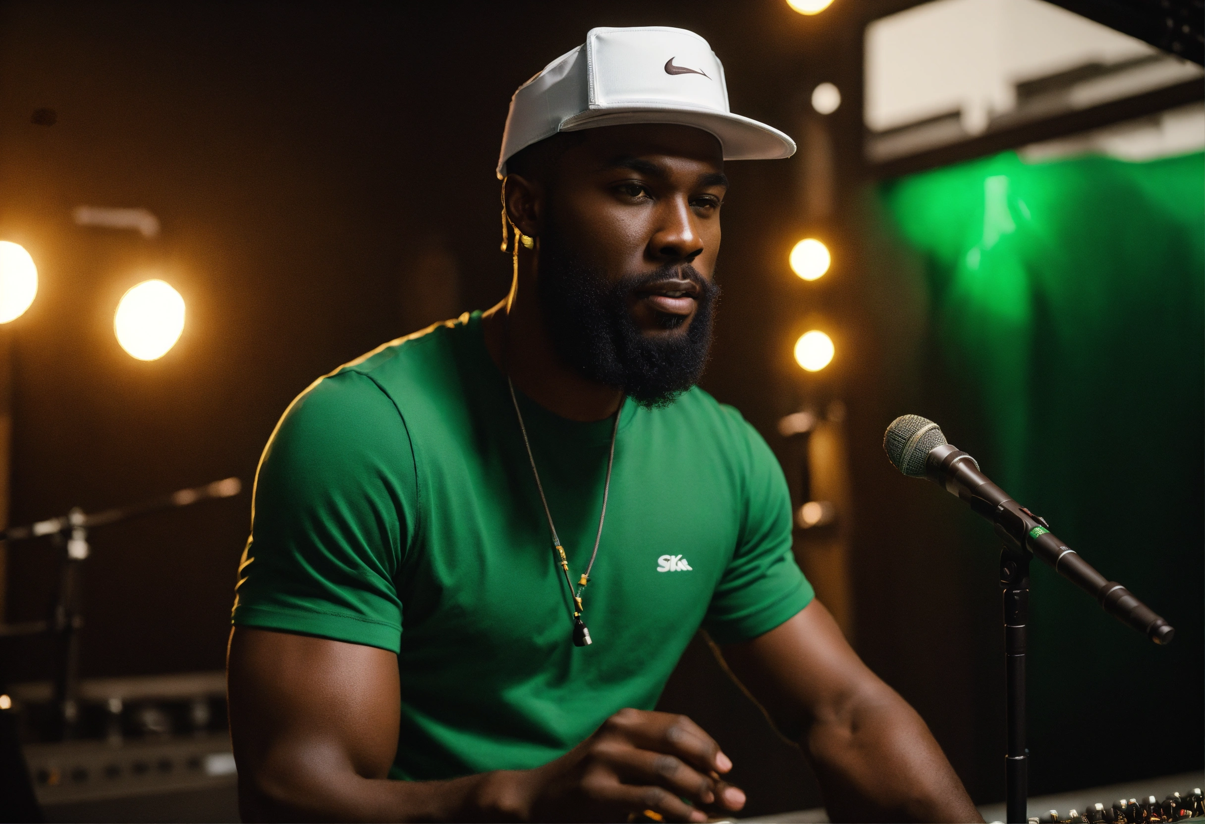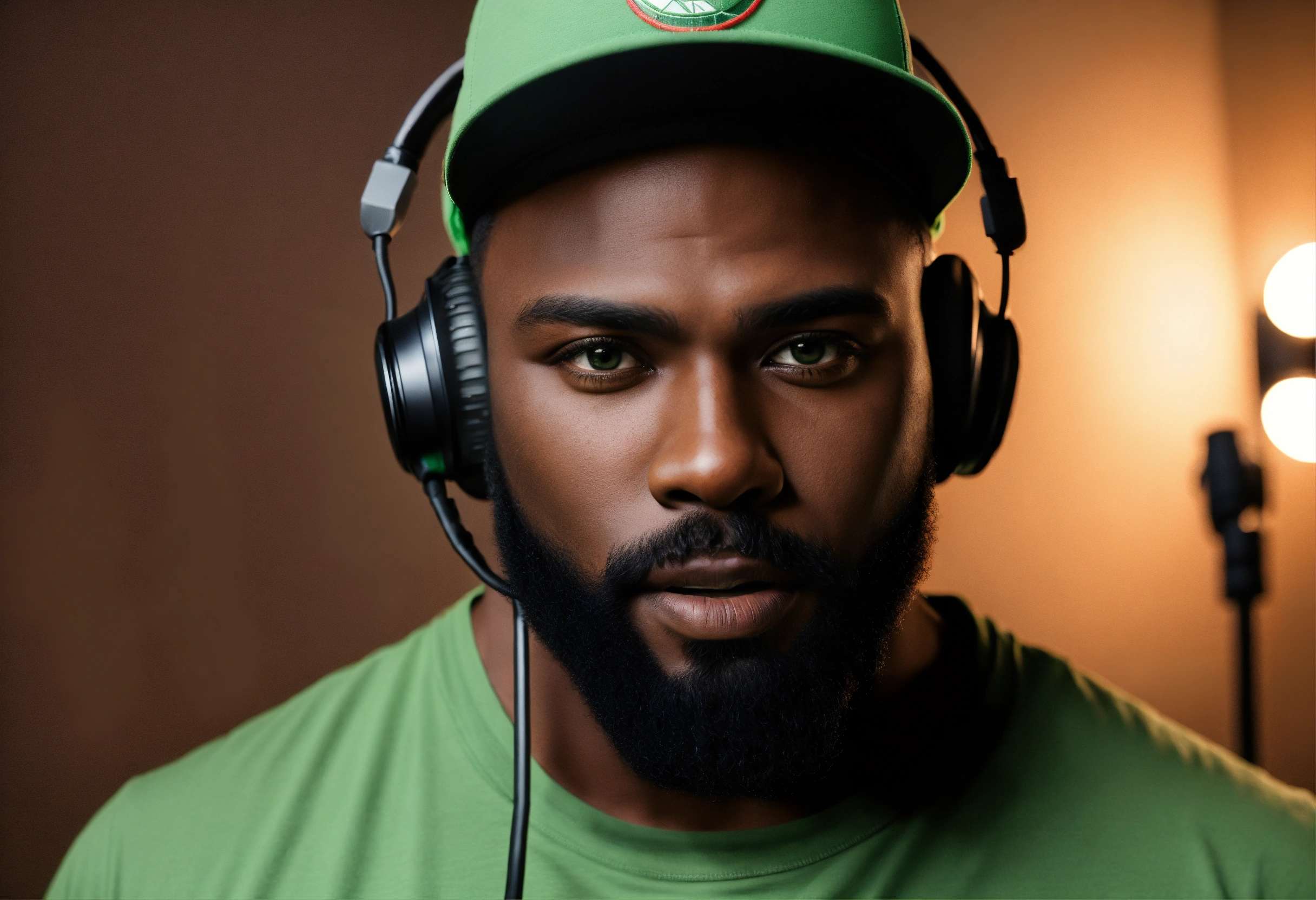 Real photo of a chocolate dark skin tone handsome black man with beard, talking into a mic with a short mic stand, in a very large fancy studio, wearing long sleeve green t shirt and white atlanta sun visor, black jeans, very realistic, ultimate detail, 8k, face front looking straight into the camera