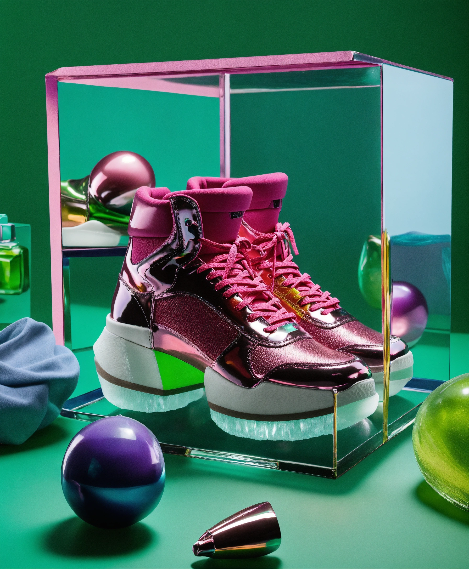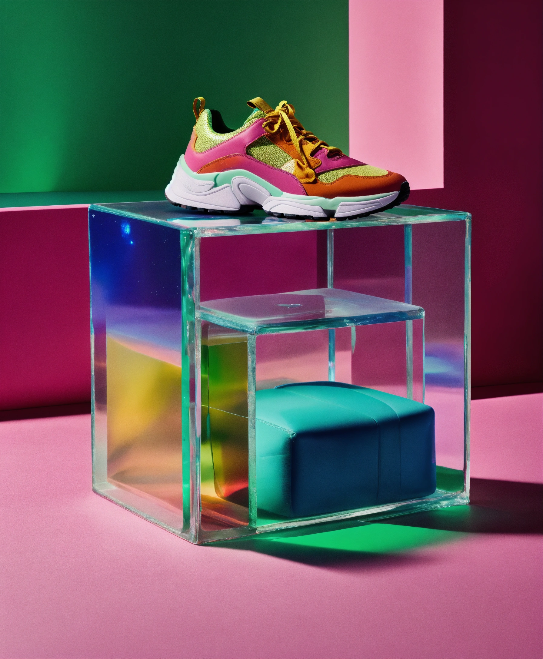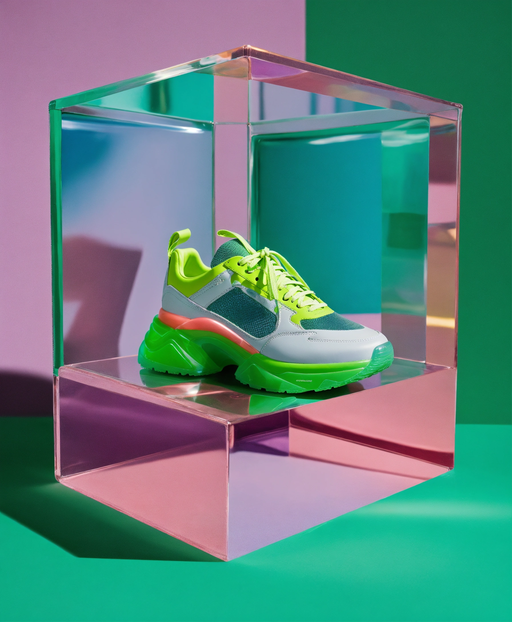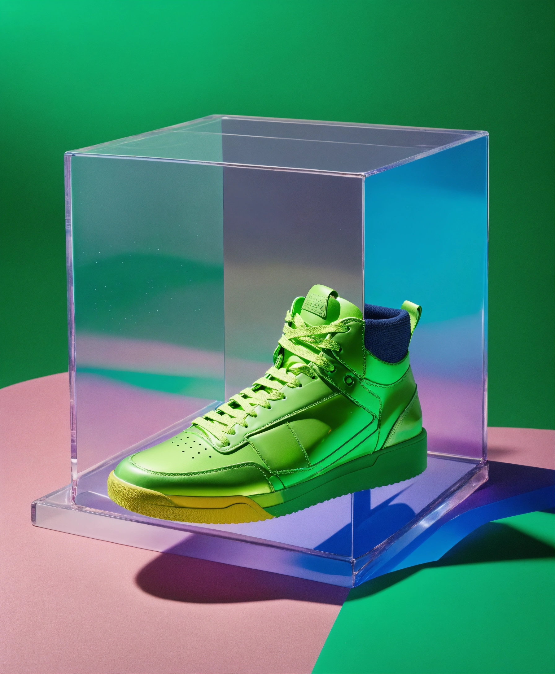 Clear iridescent cube full of colorful recognizable objects such as balenciaga sneakers, makeup. studio photography, e-comm, some green accent color, 4k, solid color background! table top photography! realistic!