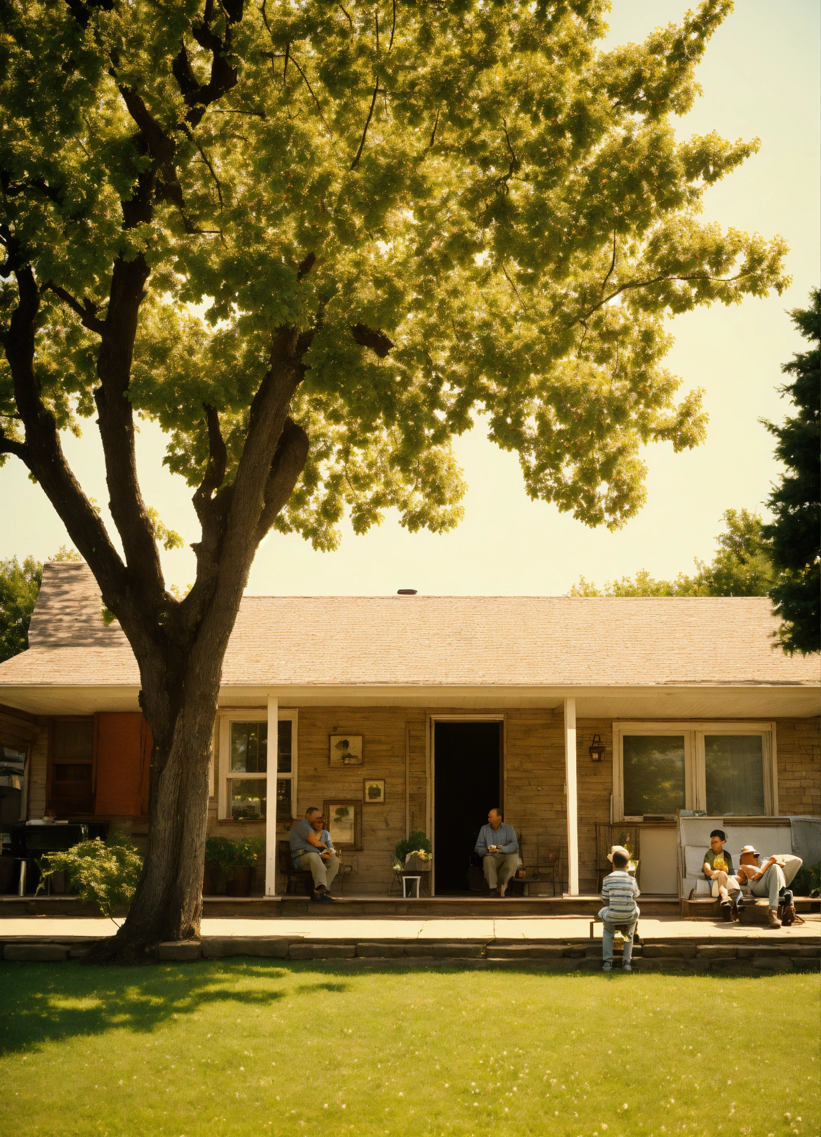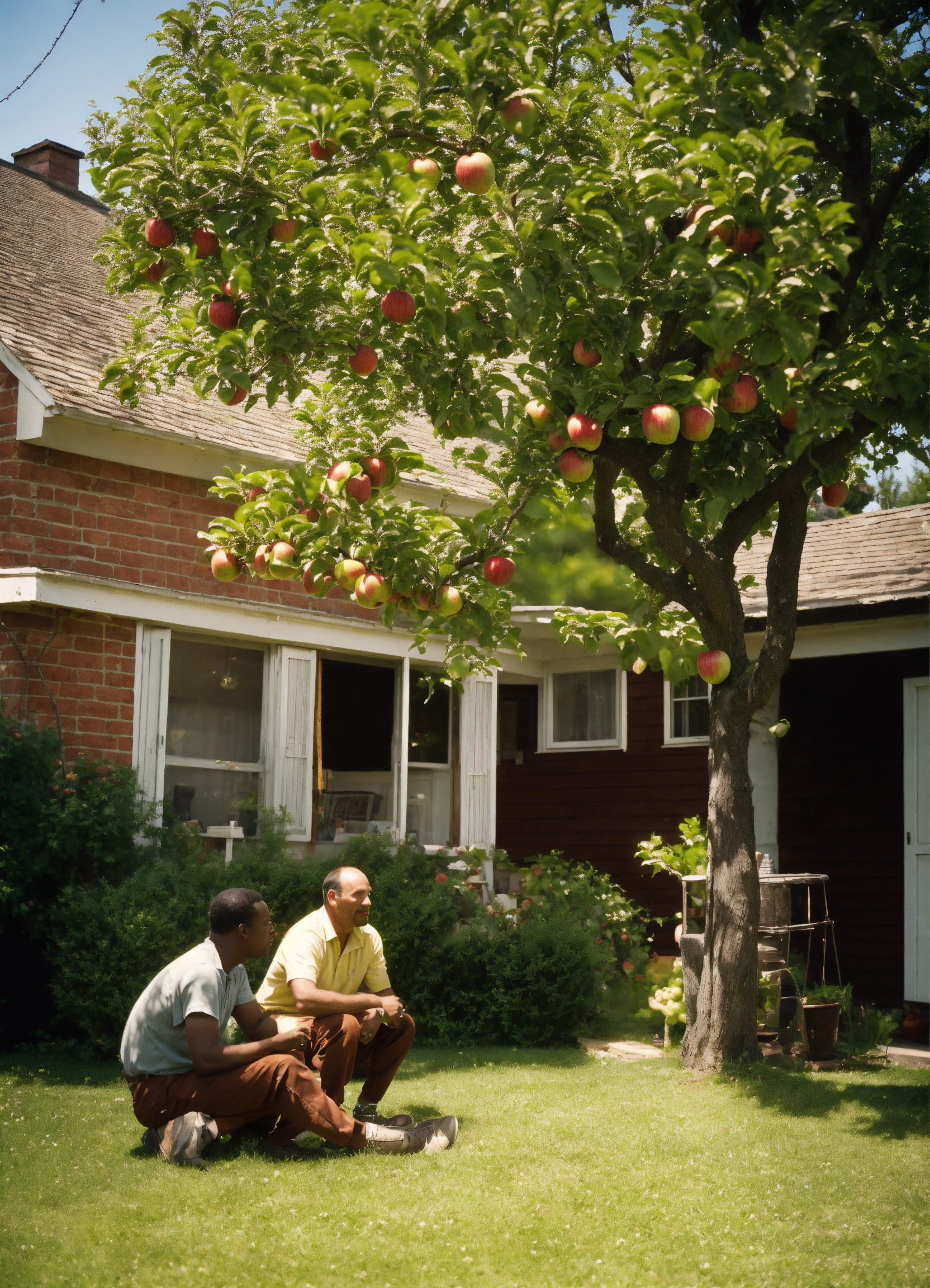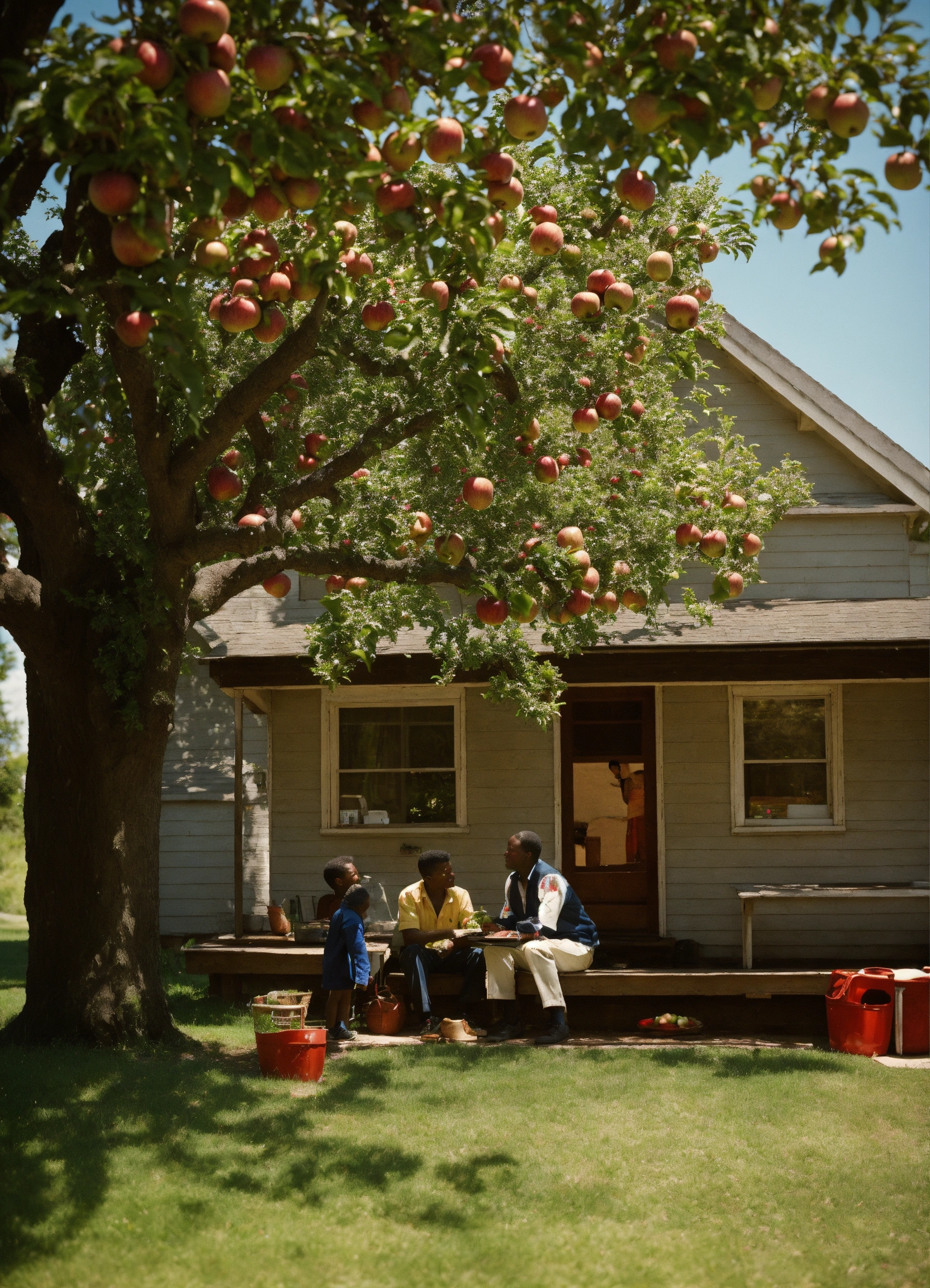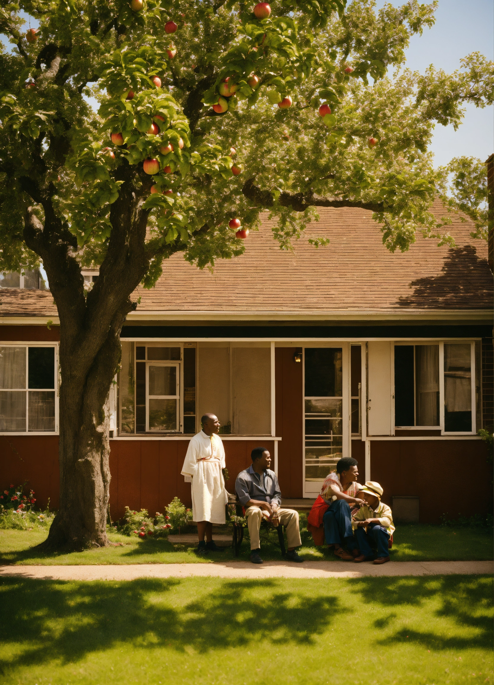Setting 1960s backyard and porch of an urban home. in the foreground a black, 55-year-old woman is seated on the porch, she is holding a five-year-old boy. in the background a 25-year-old man on the lawn, under the apple tree. a balding, 55-year-old man under an apple tree men are having a conversation by themselves. a well-grown apple tree, possibly discussing it.