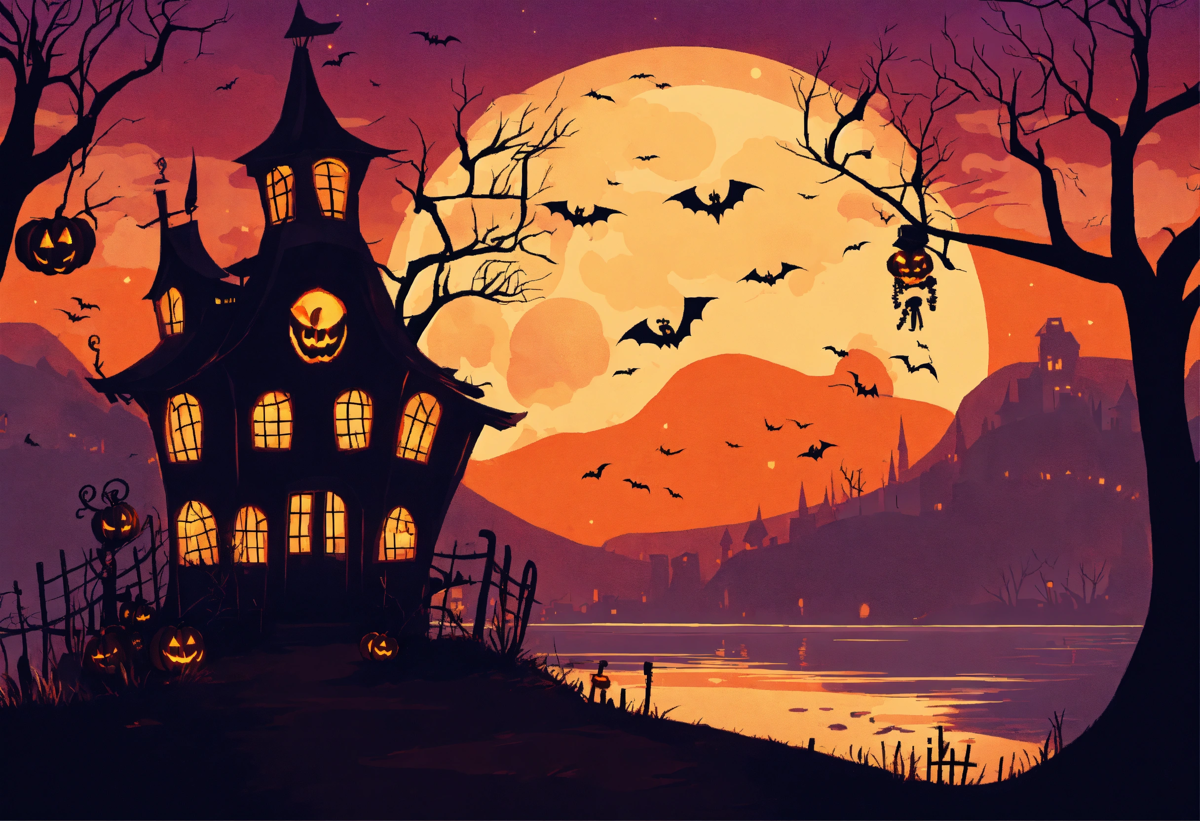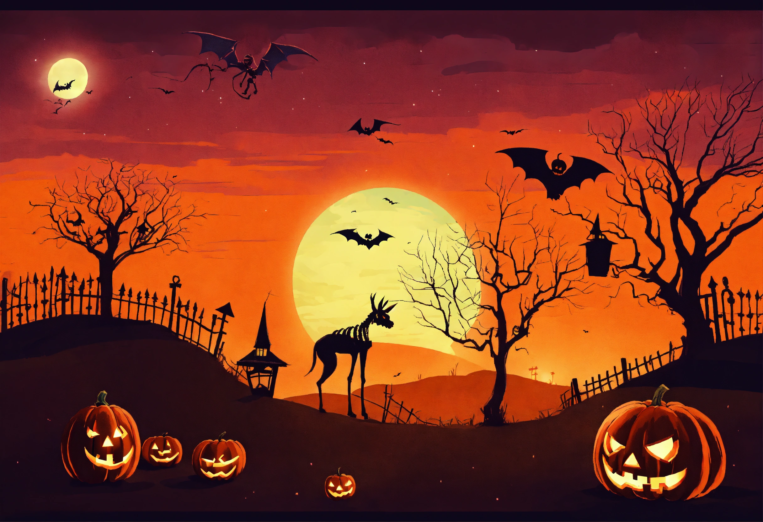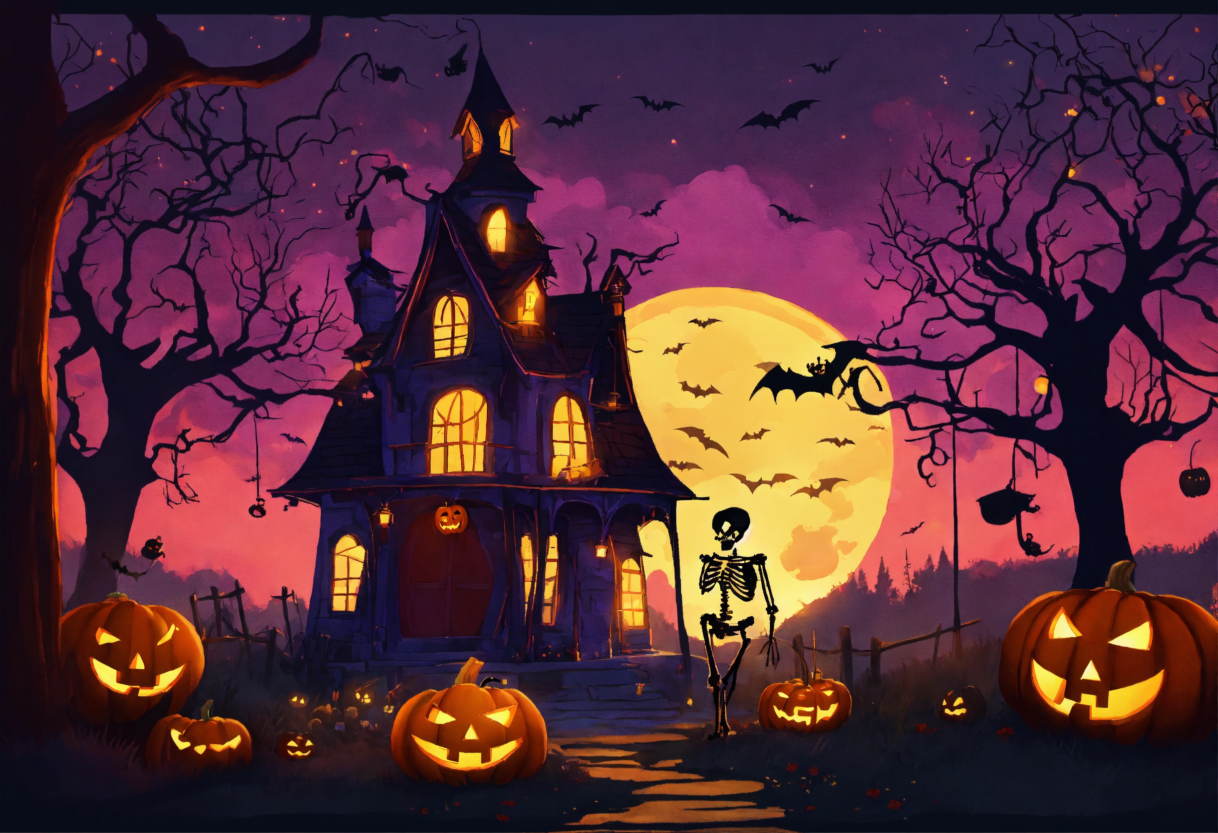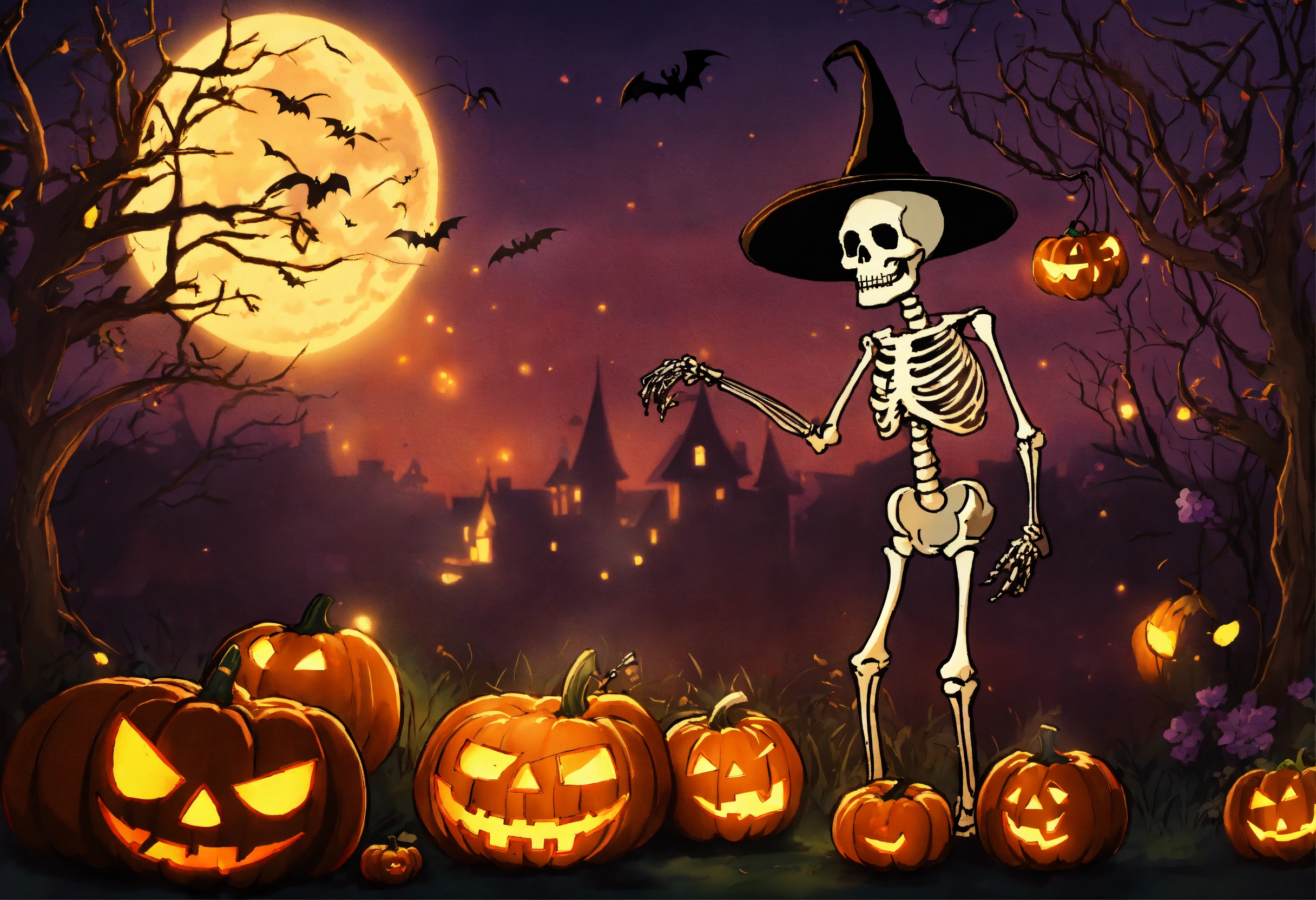It was a playful and magical night, as the sun set, and the playful magic of halloween quietly arrived, style of 2d animation, cartoon with skeletons
