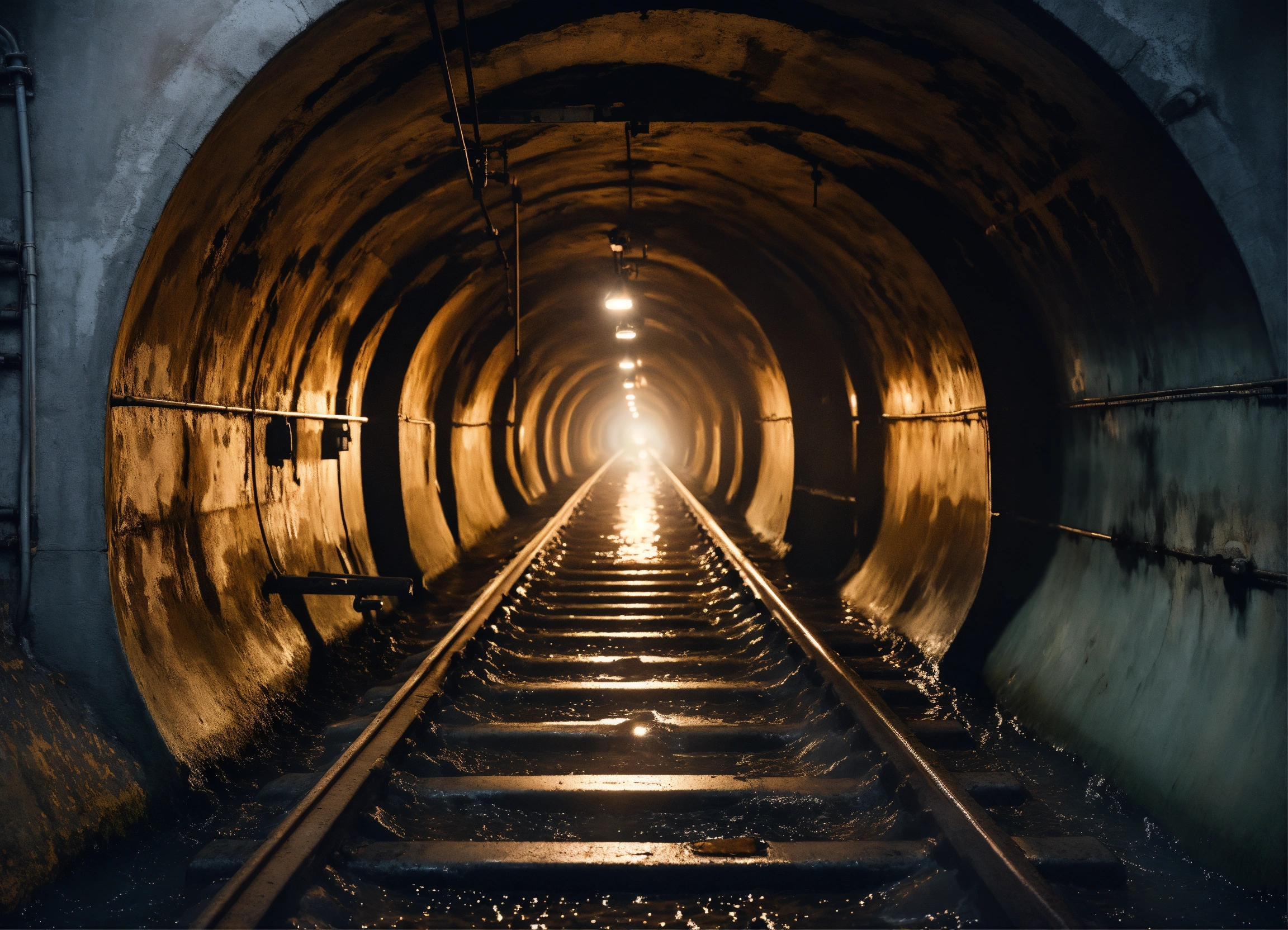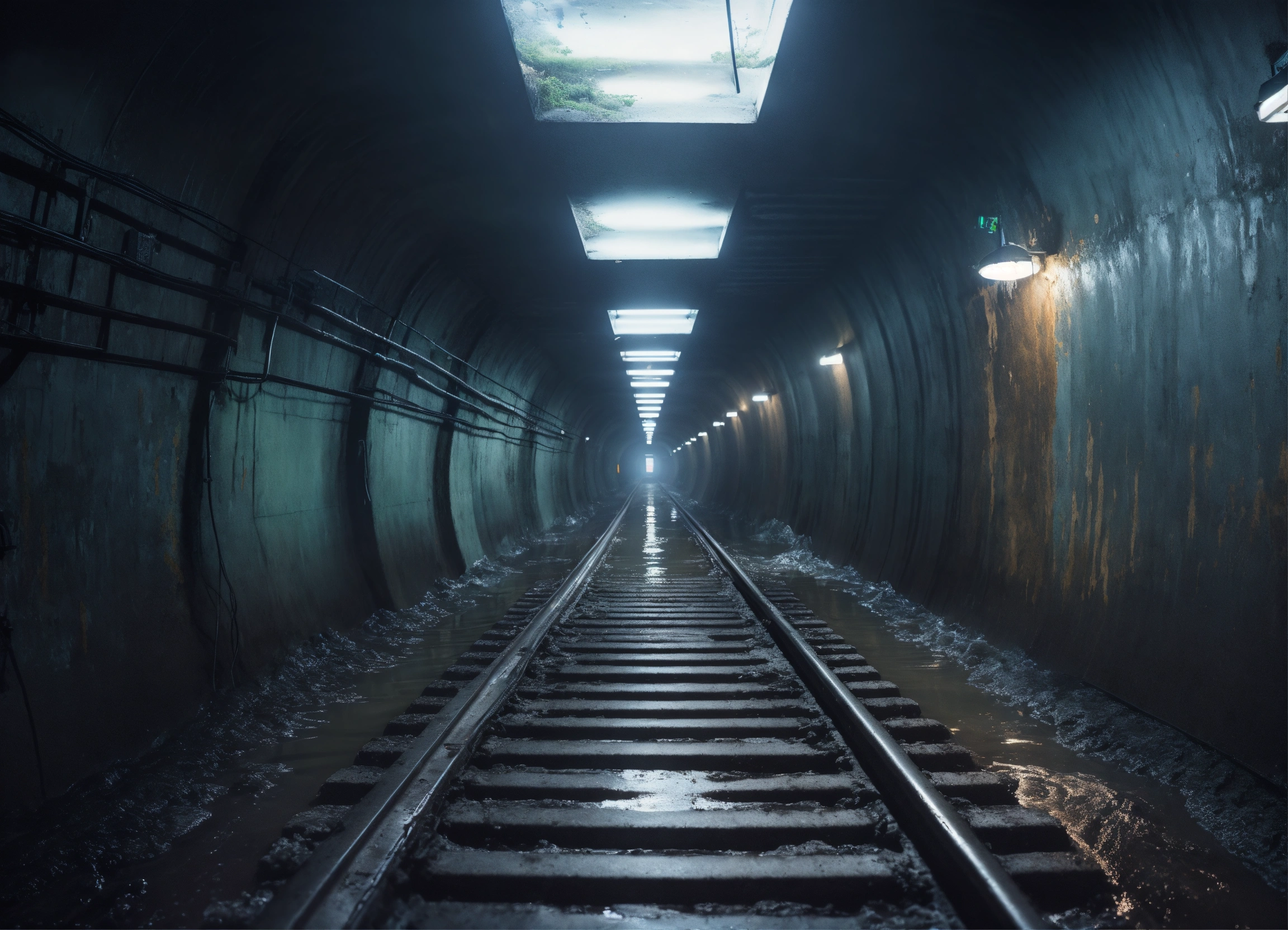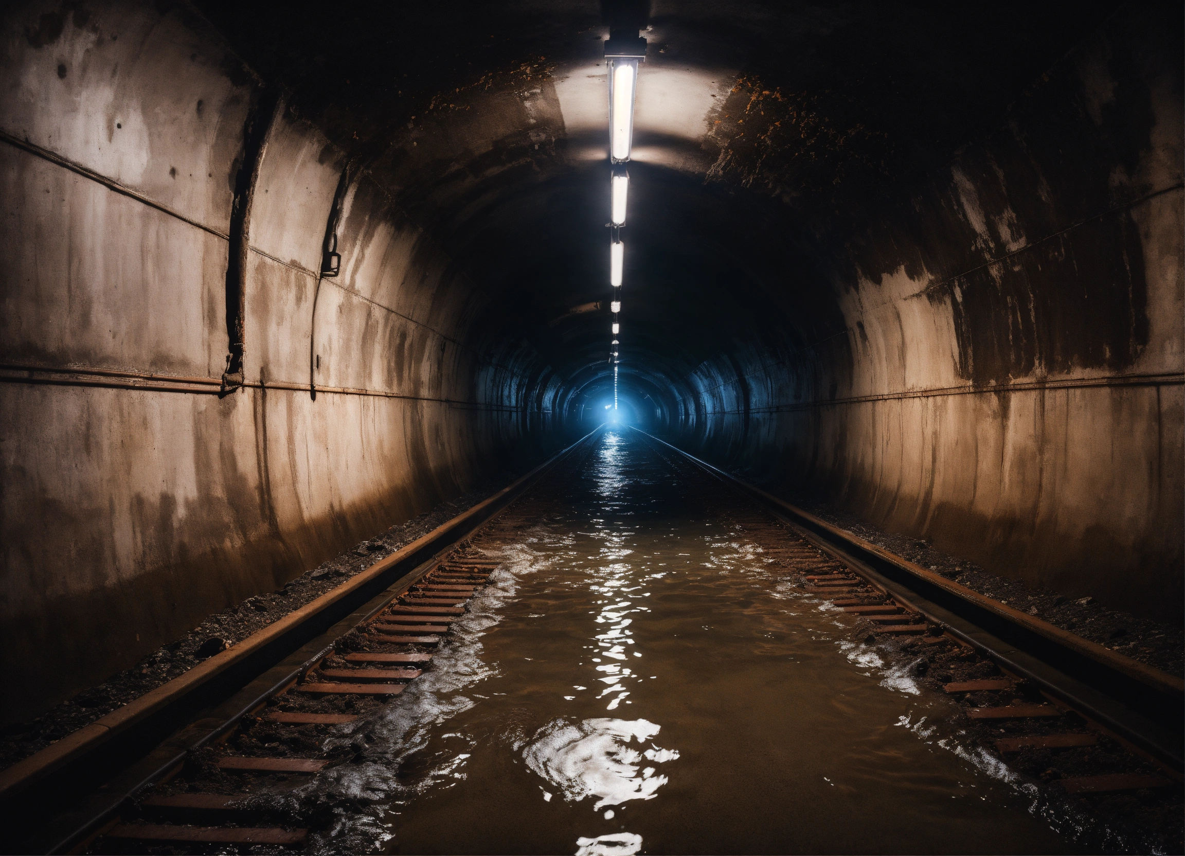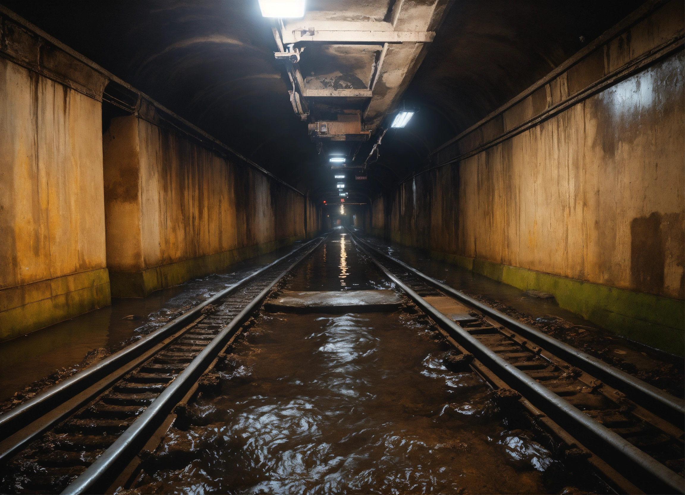 An ultra-realistic dark photo of a dreary abandoned subway circular tunnel made of concrete with train tracks and water leaks, with flooded ground, hyperdetailed, hyperrealistic, 8k