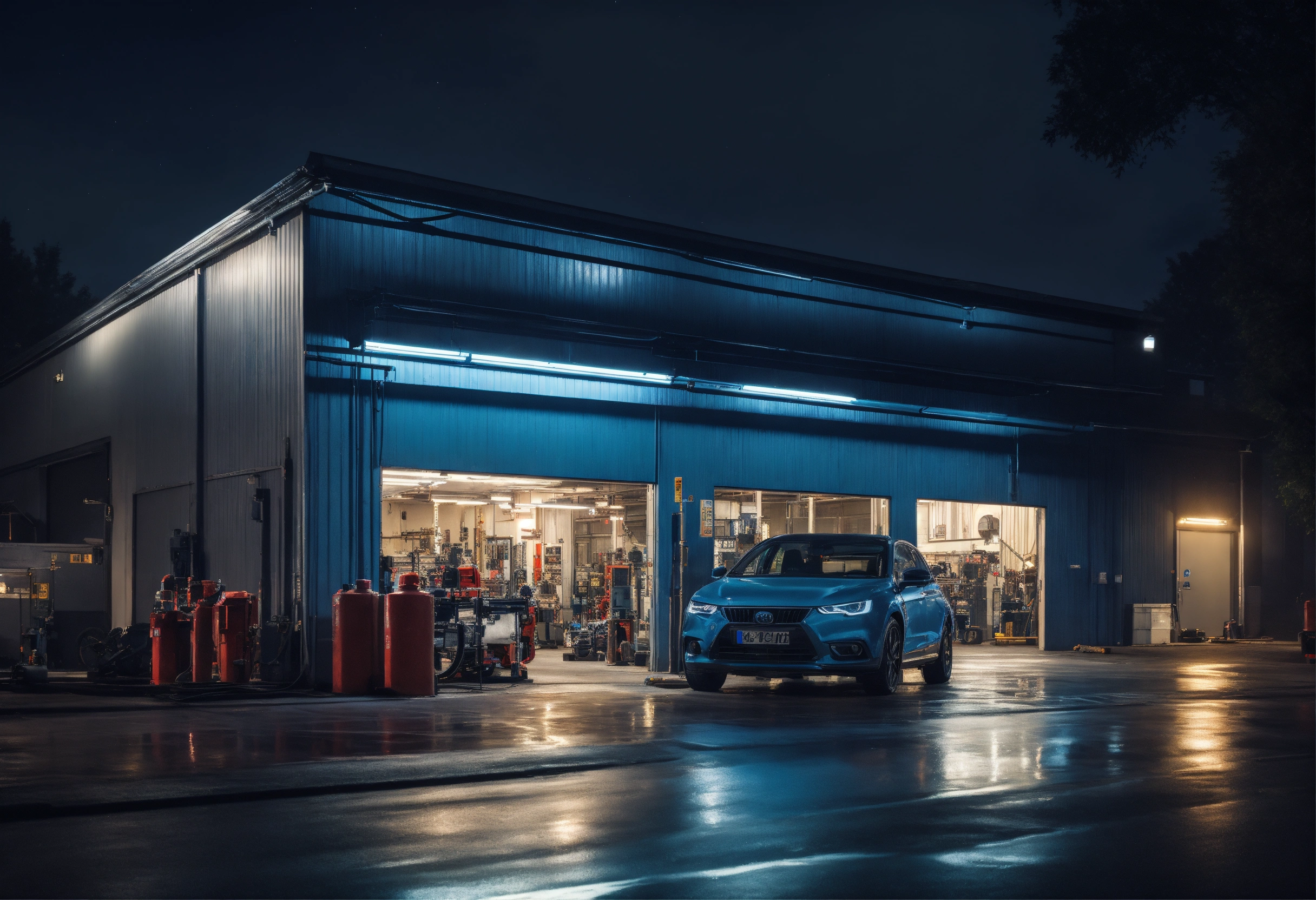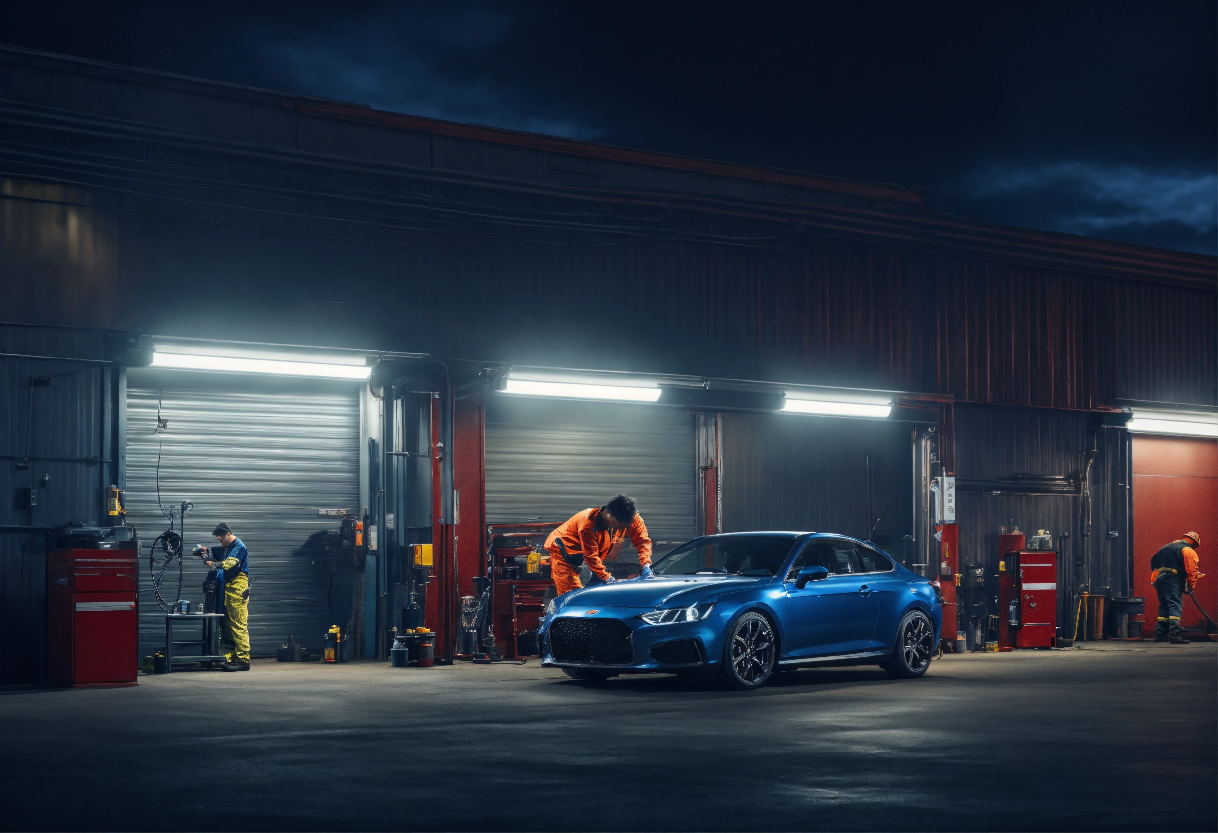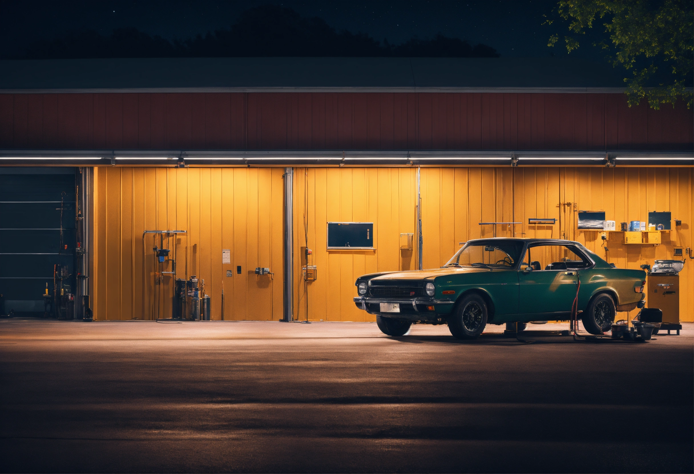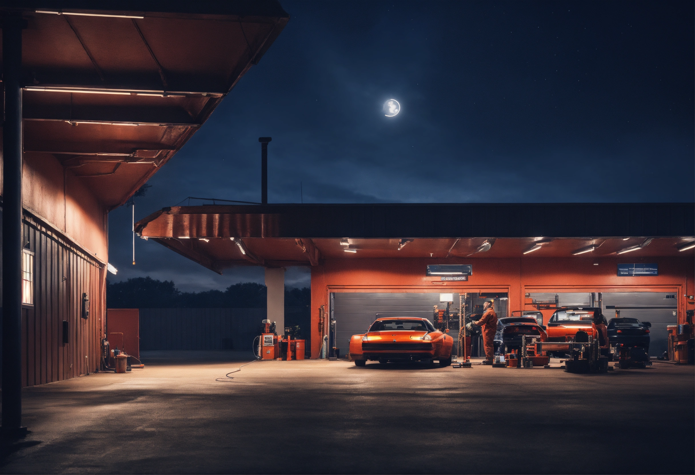 Create an image of an automotive workshop facade at night, featuring a mechanic changing the oil of a car. the image should have a cinematic quality, with full 4k resolution and meticulous attention to detail.