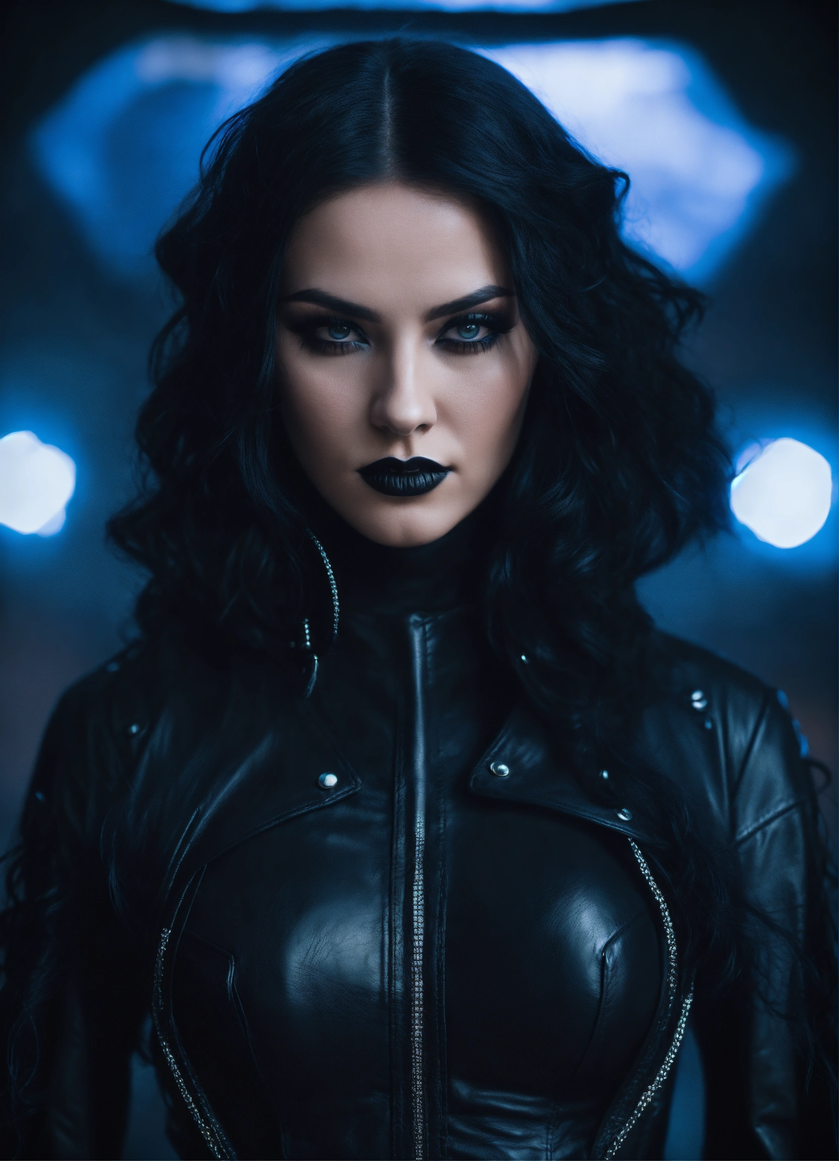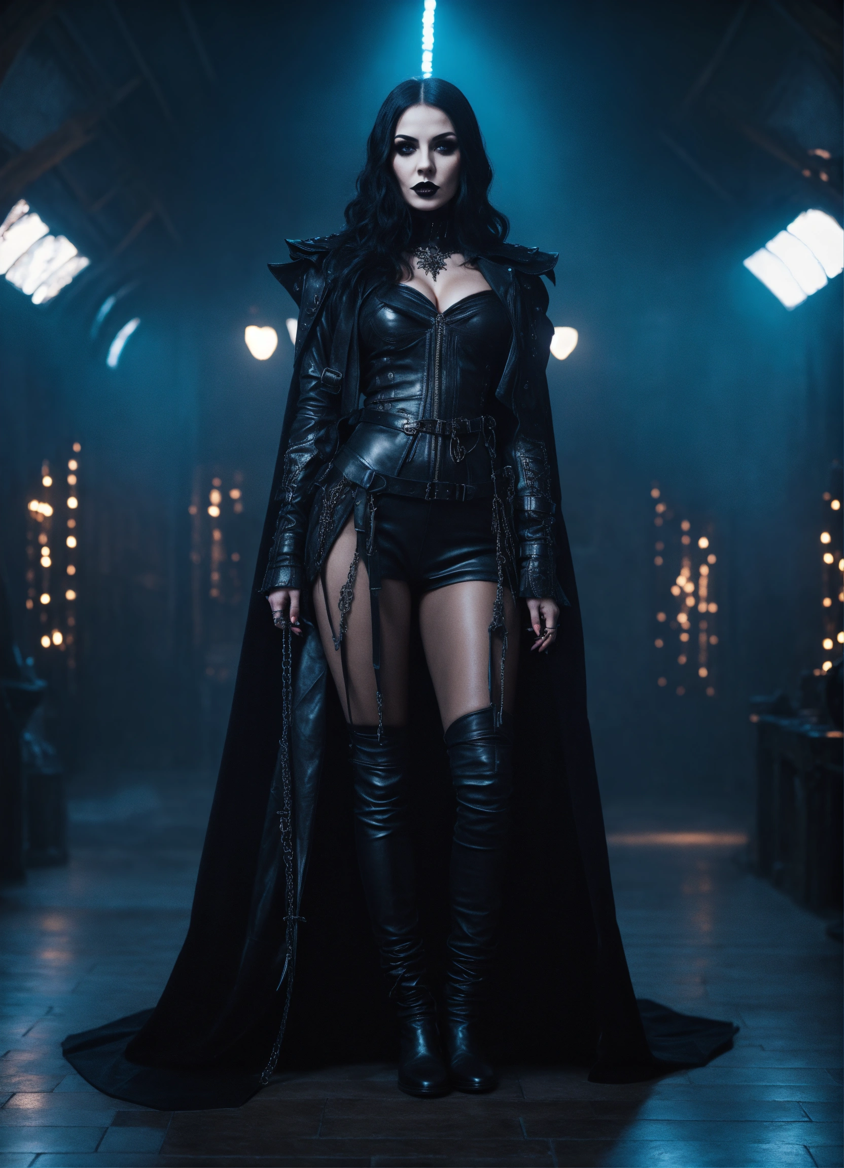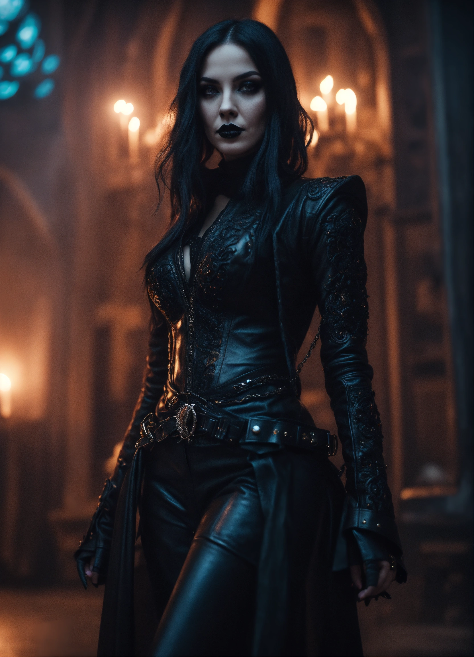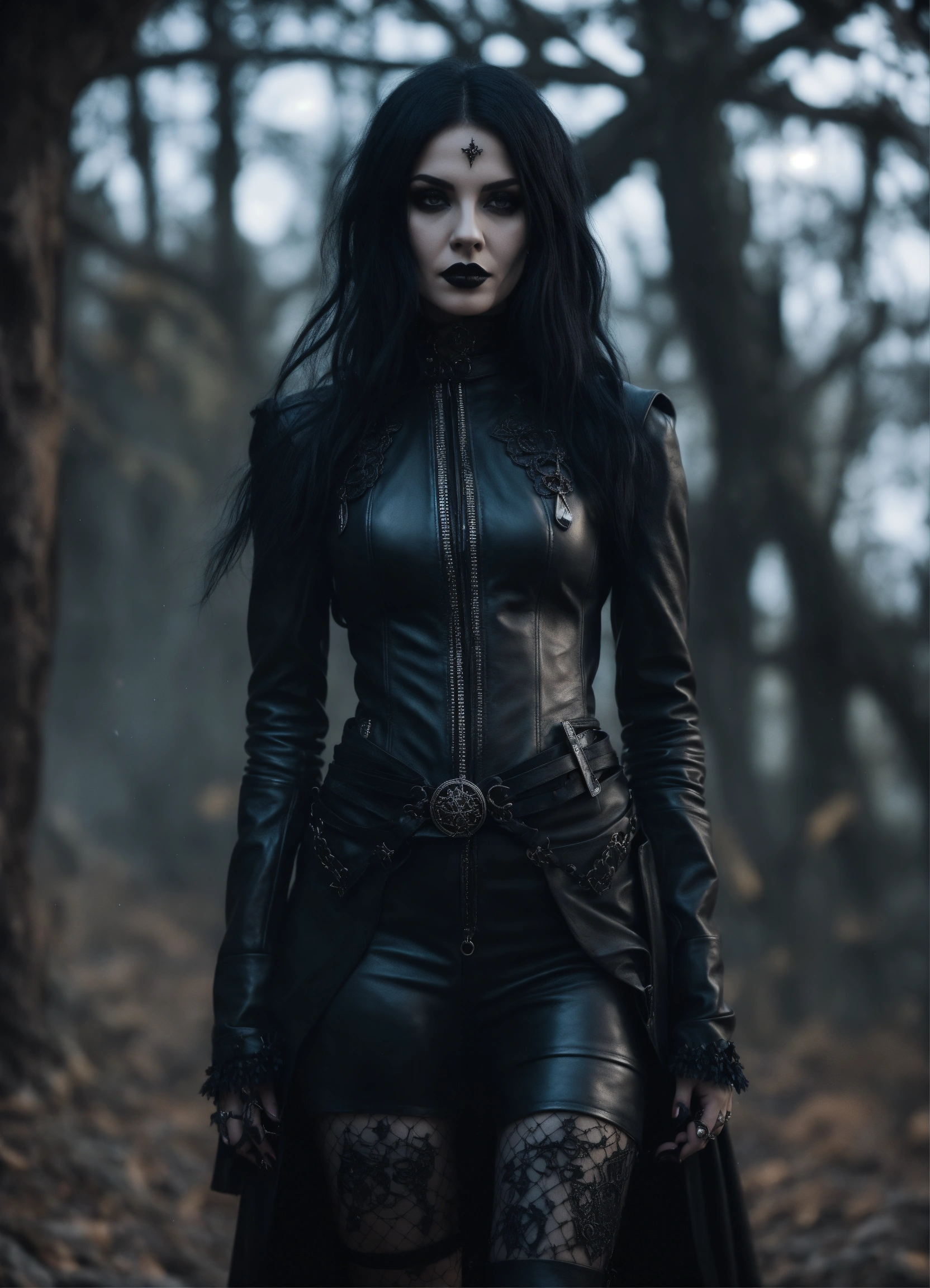 Beautiful extremely goth girl wearing black leather, hypnotizing, dark sorceress who rules the universe all realms & all dimensions, full body, 8k, cinematic light, super sharp