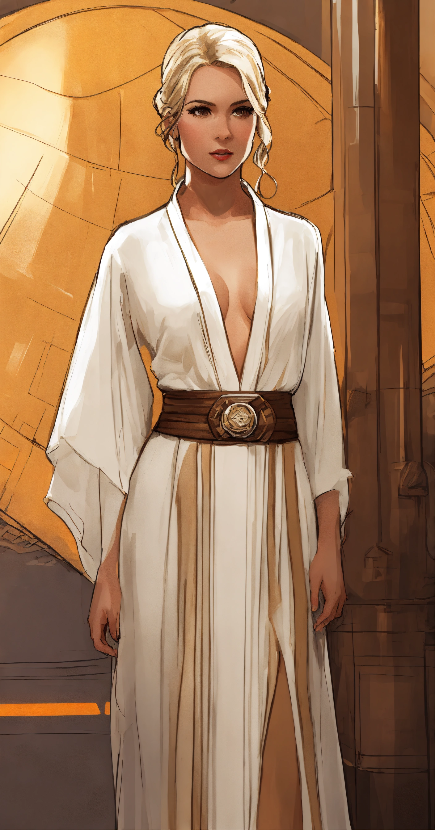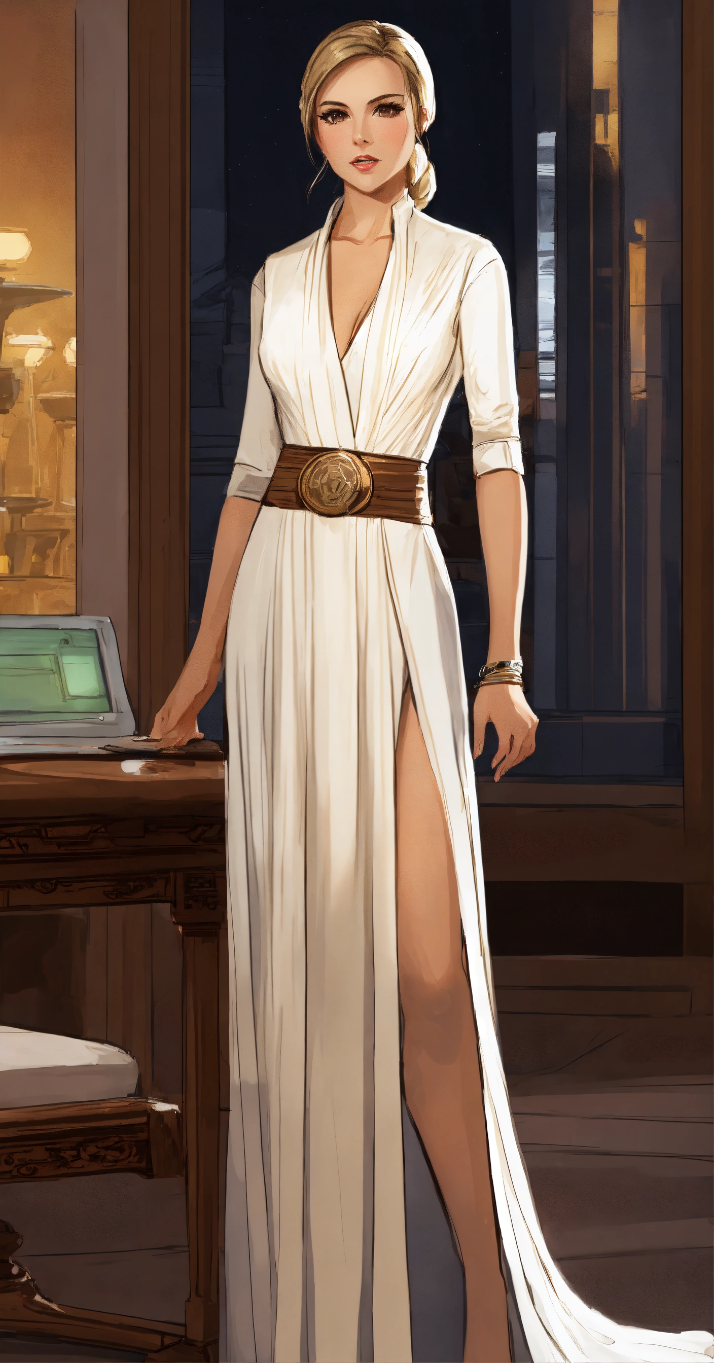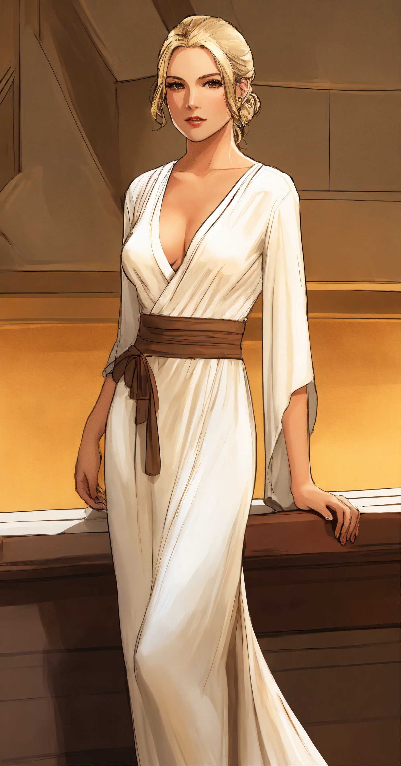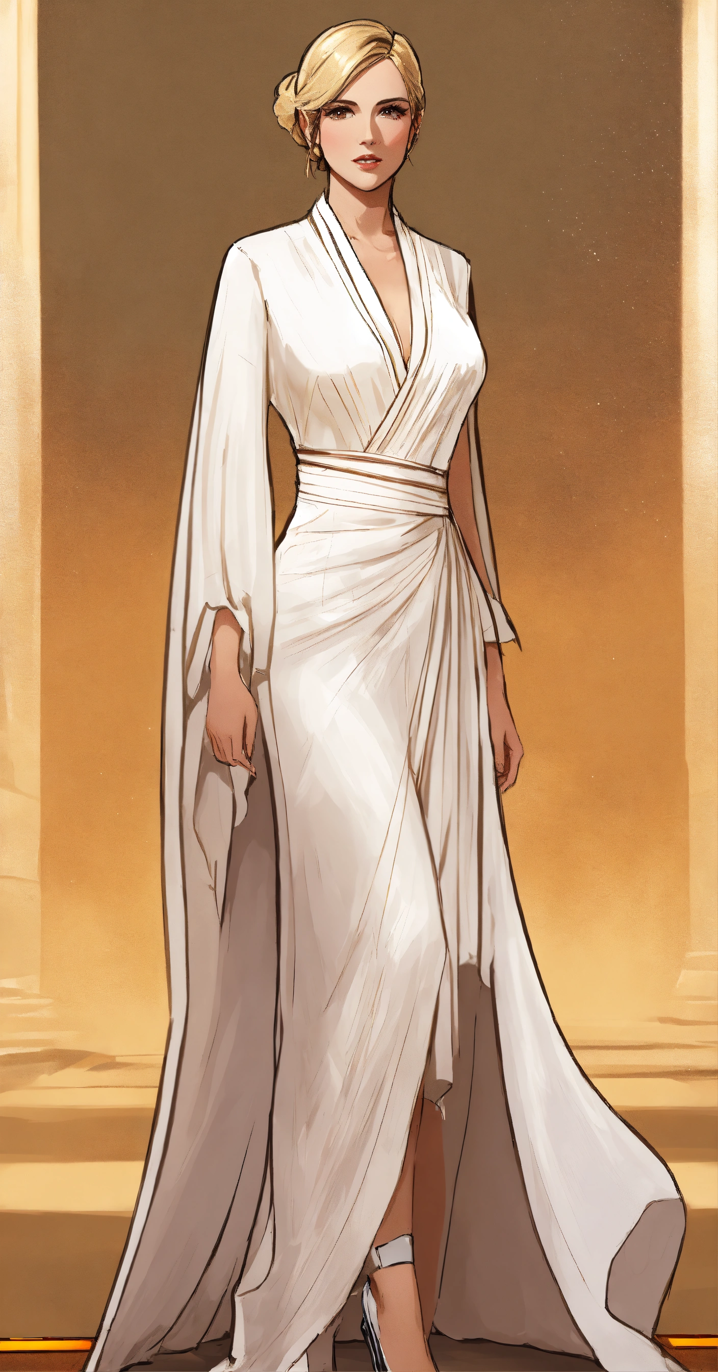 In sketch style, a star wars diplomat woman in her thirties with straight blonde hair and dark brown eyes, wearing a floor-length, low cut white dress and pumps.