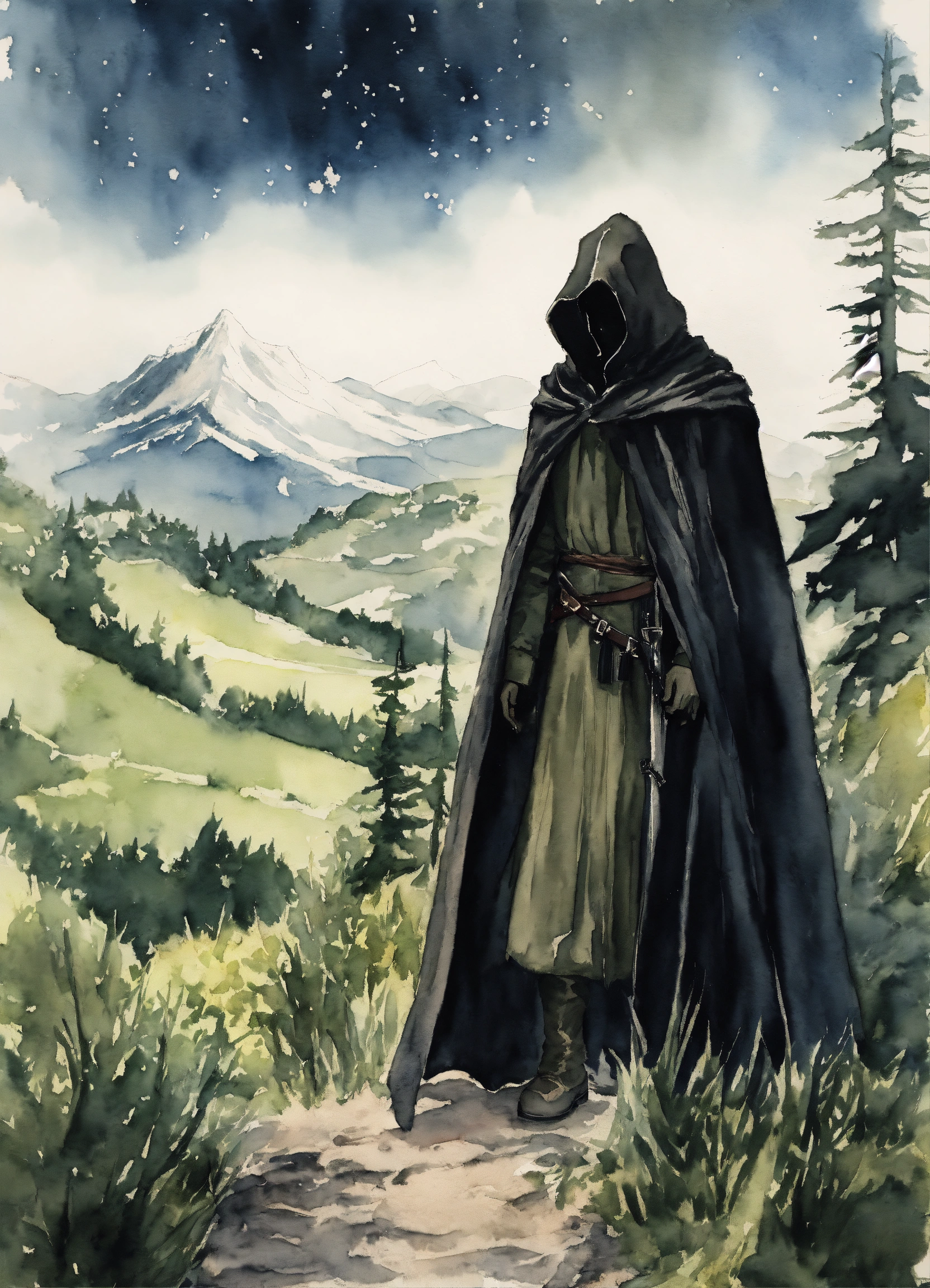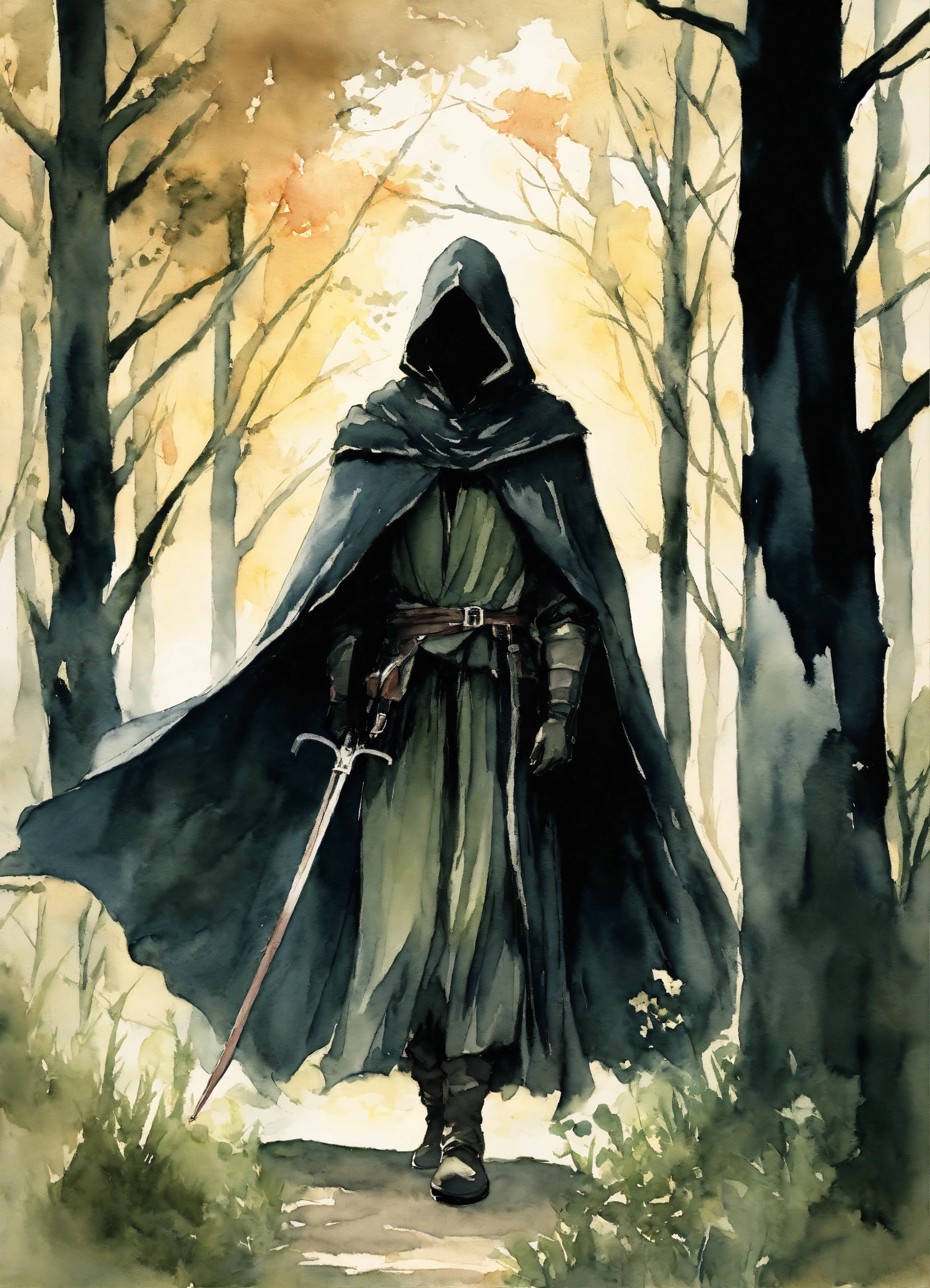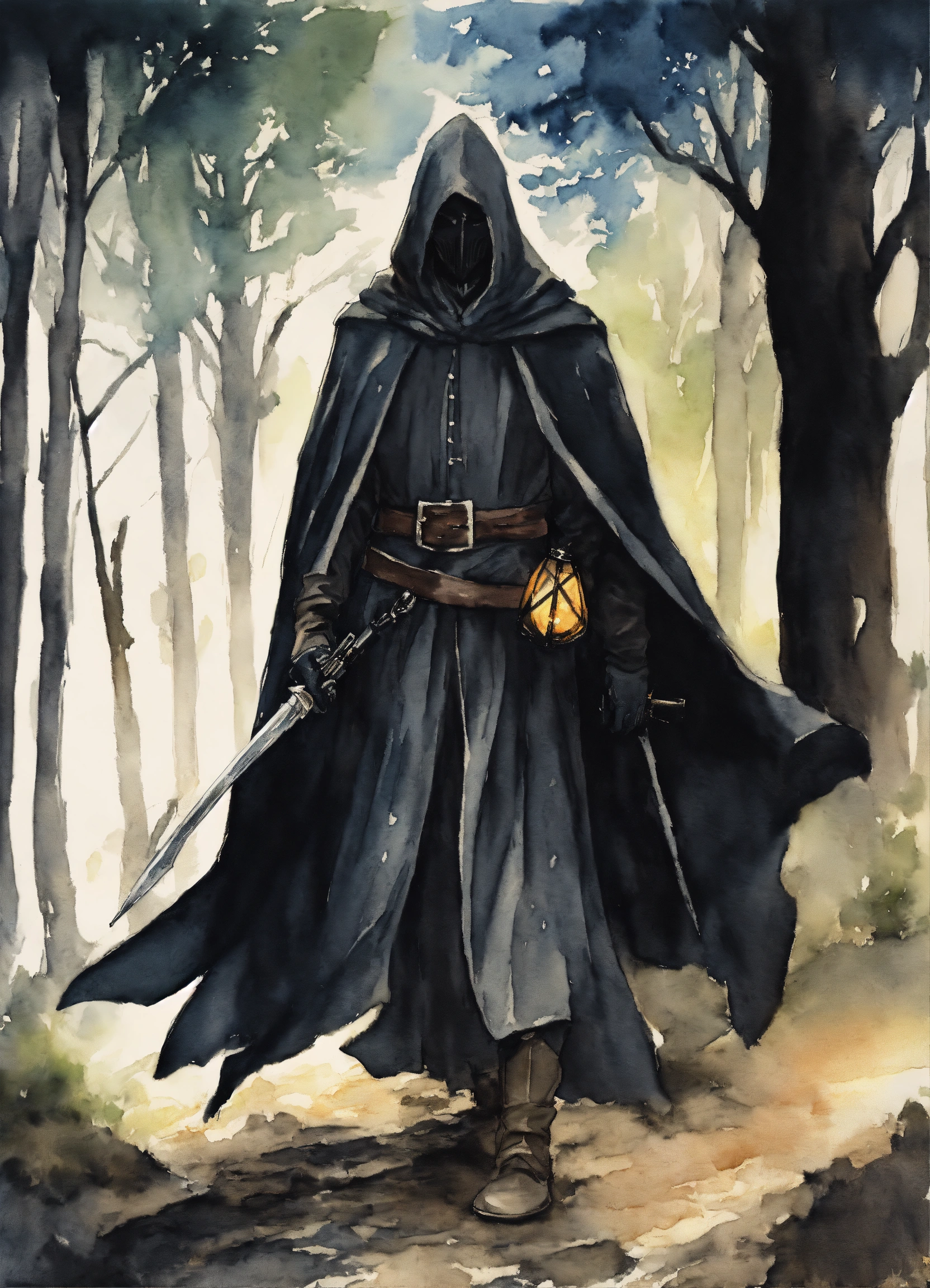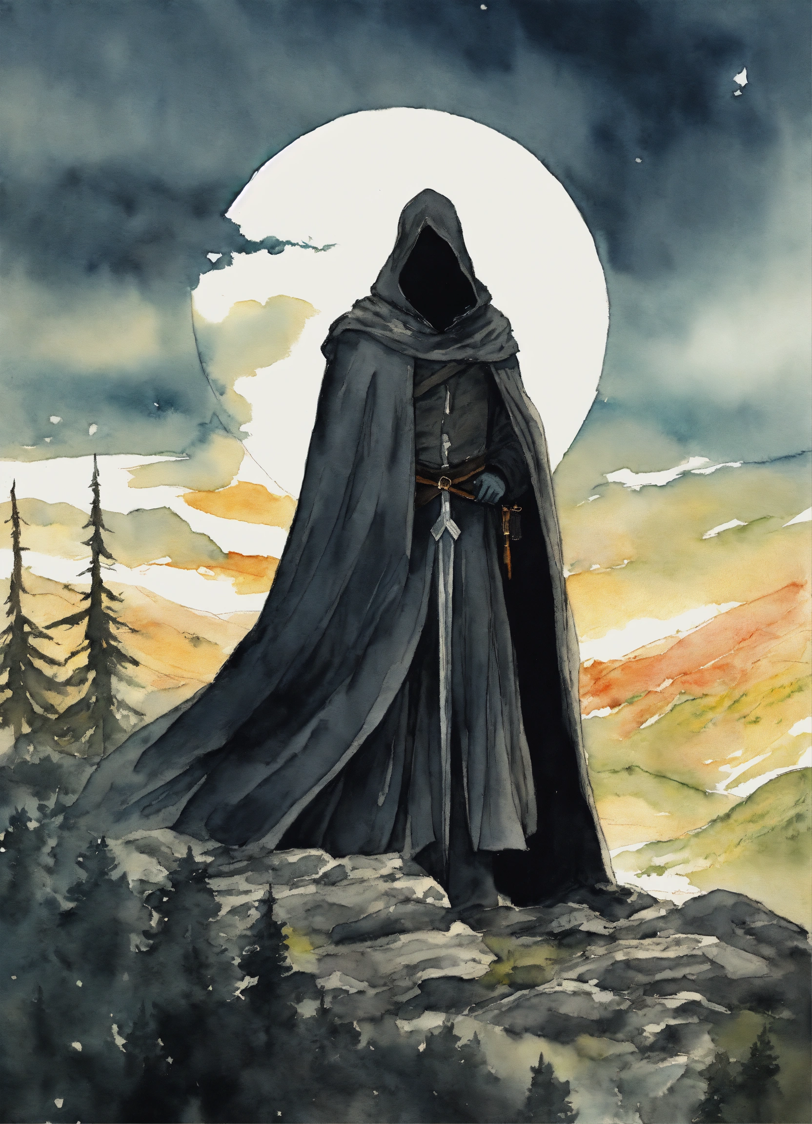 A nazgul from lotr with black cloak in vagabond manga drawing art style, watercolor, with a black forest at the background