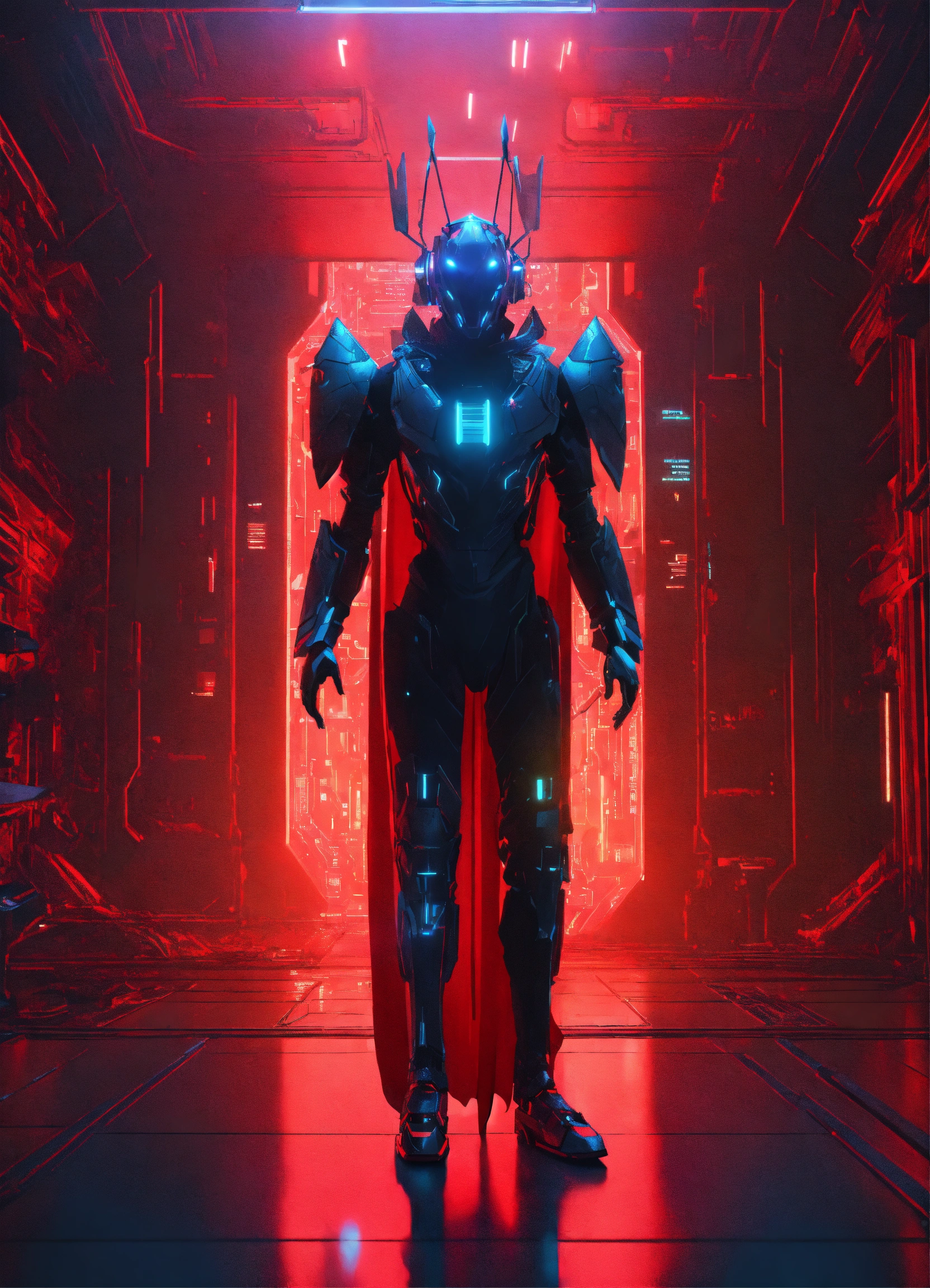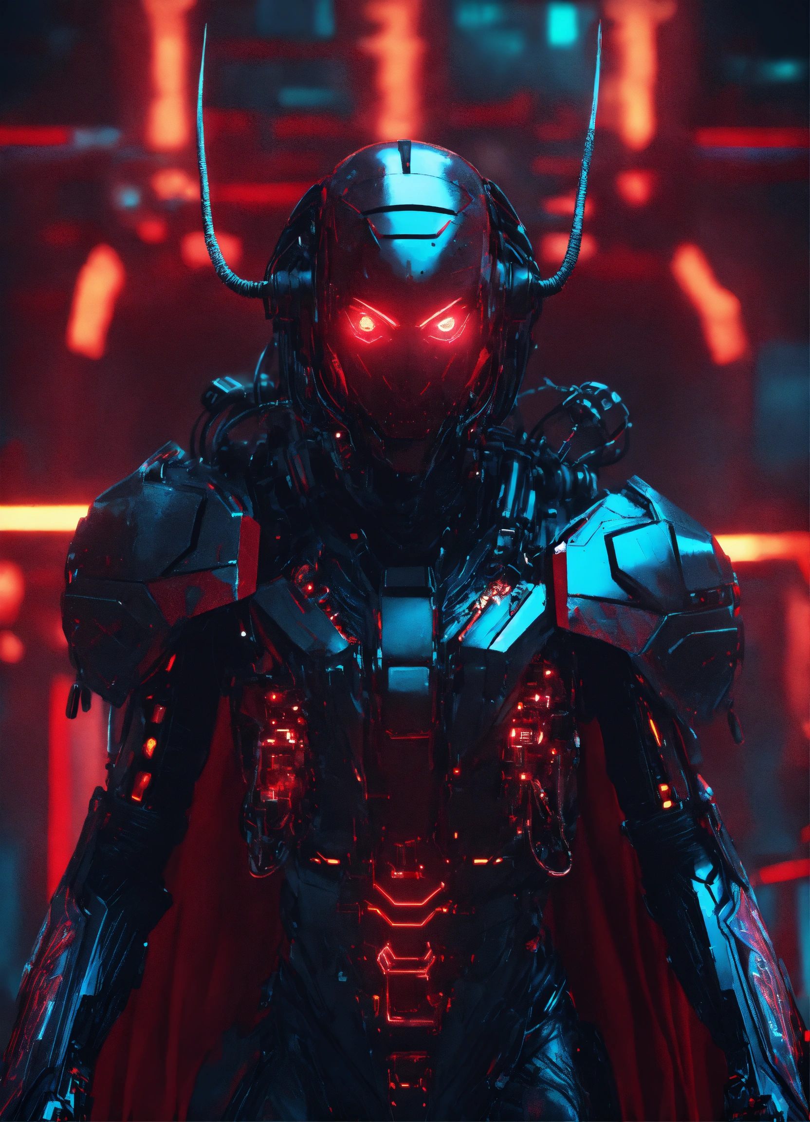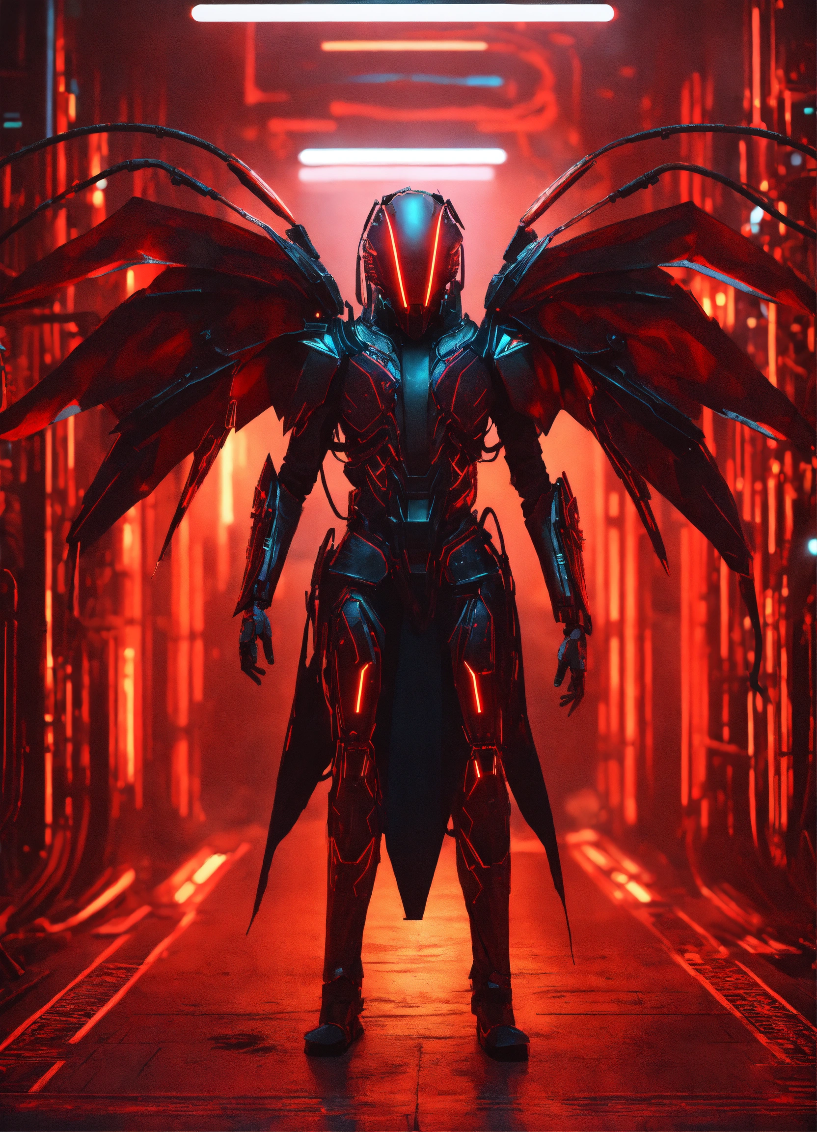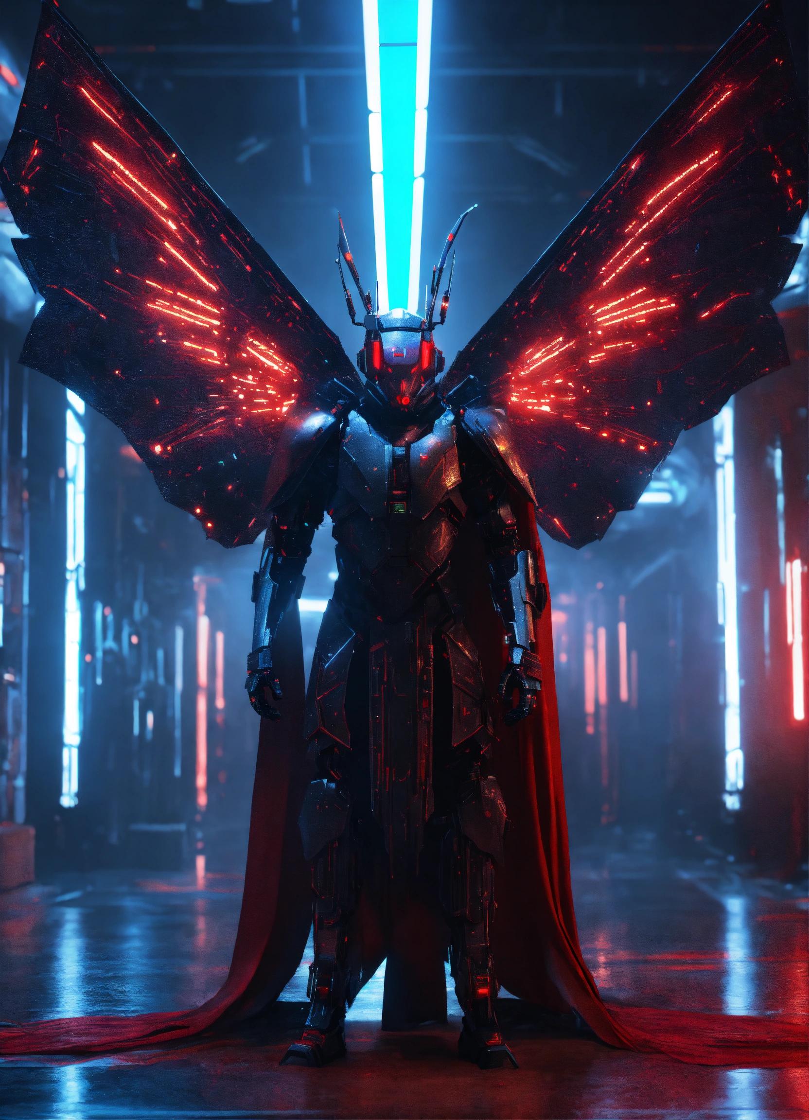 Zoom out of black cockroach faced humanoid with red glowing eyes, circuitry decor, and long draped down colorful cape like wings and hi-tech armored humanoid body, interrogating a creature in hi-tech futuristic dungeon, realistic, 8k