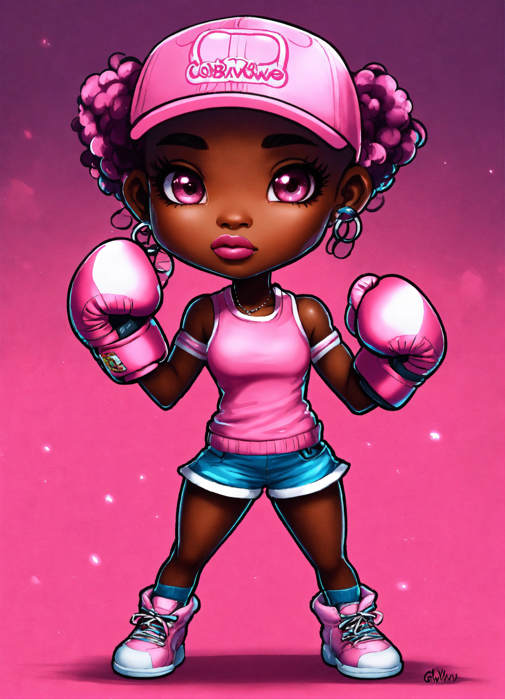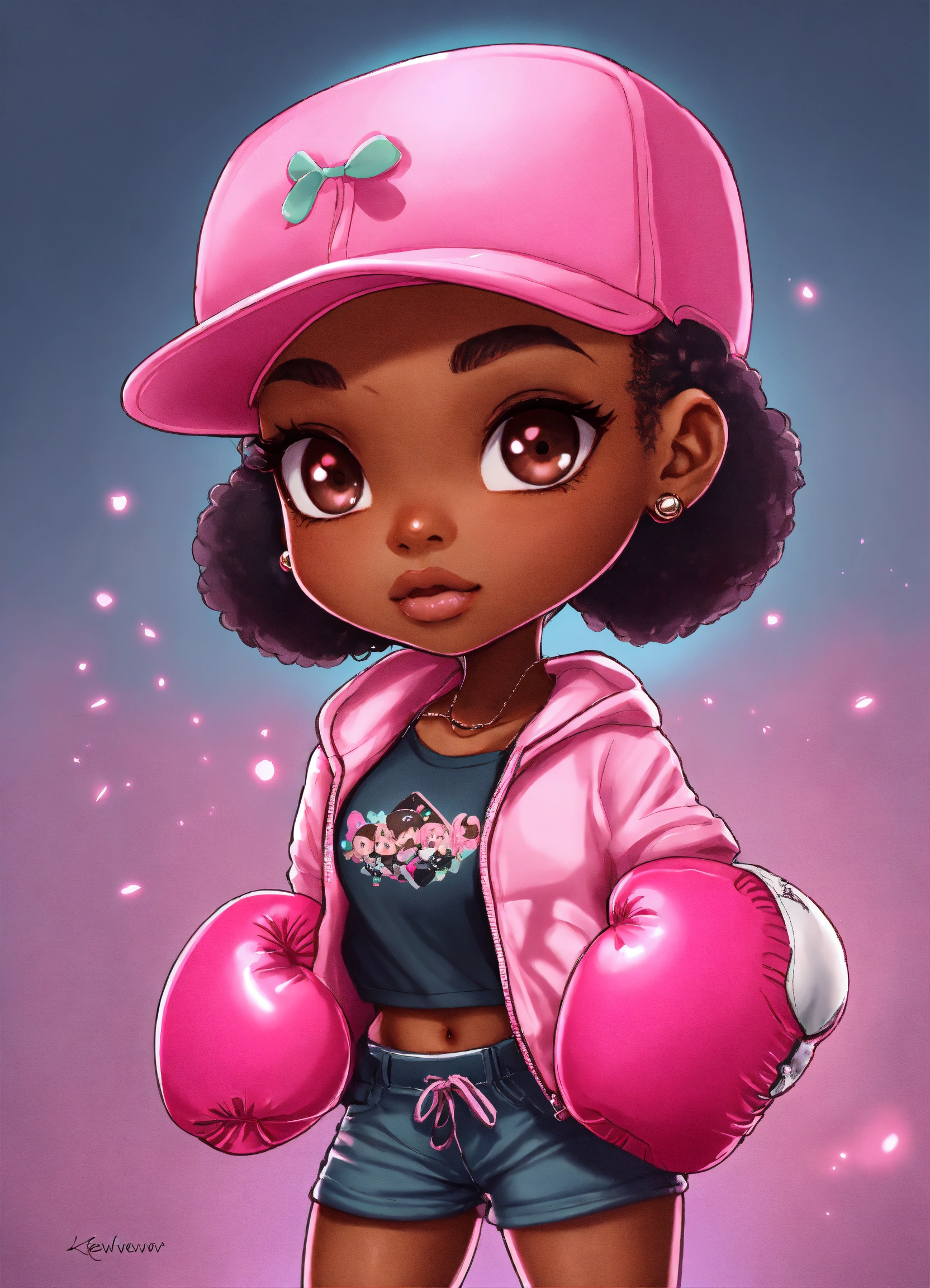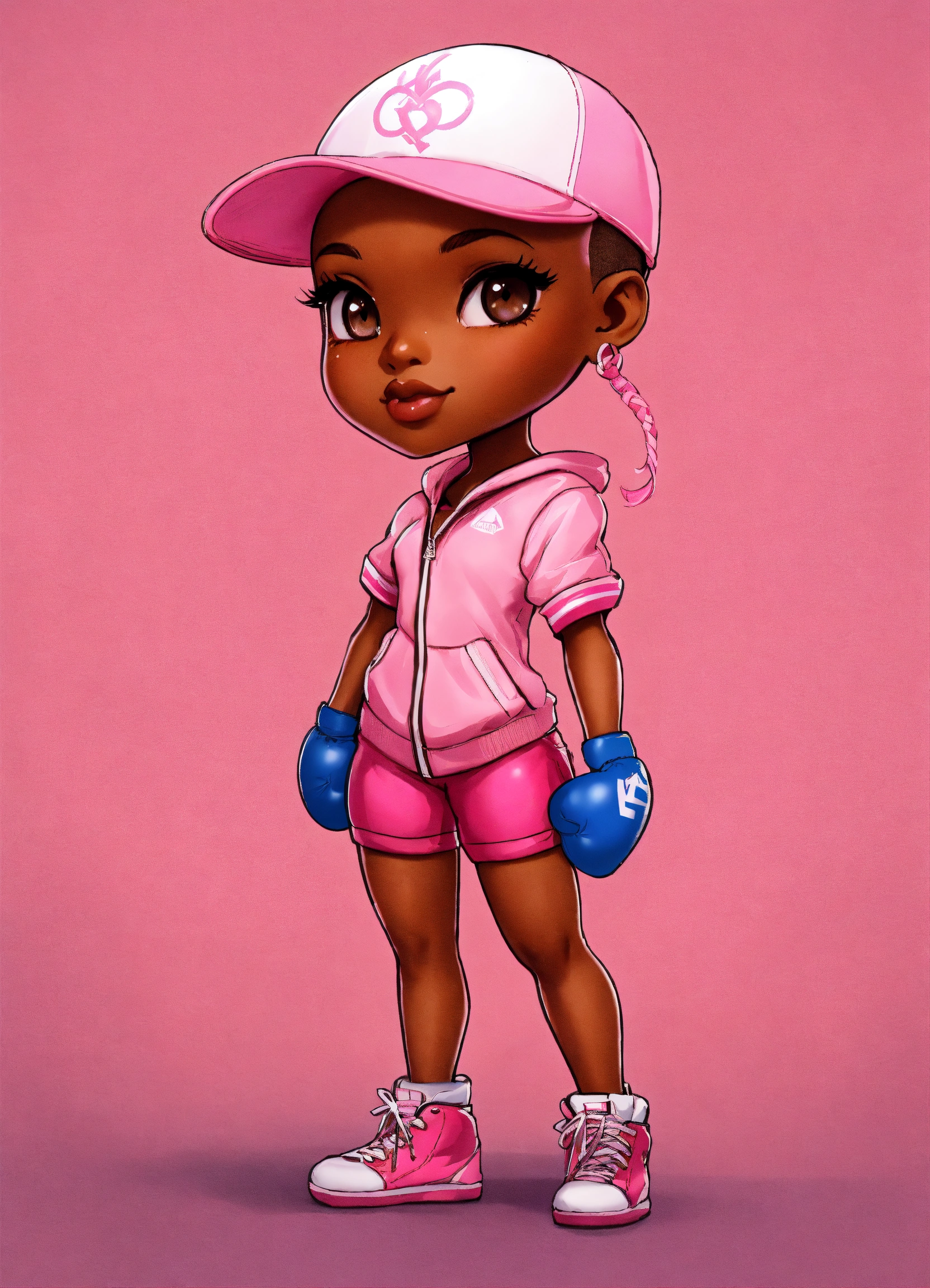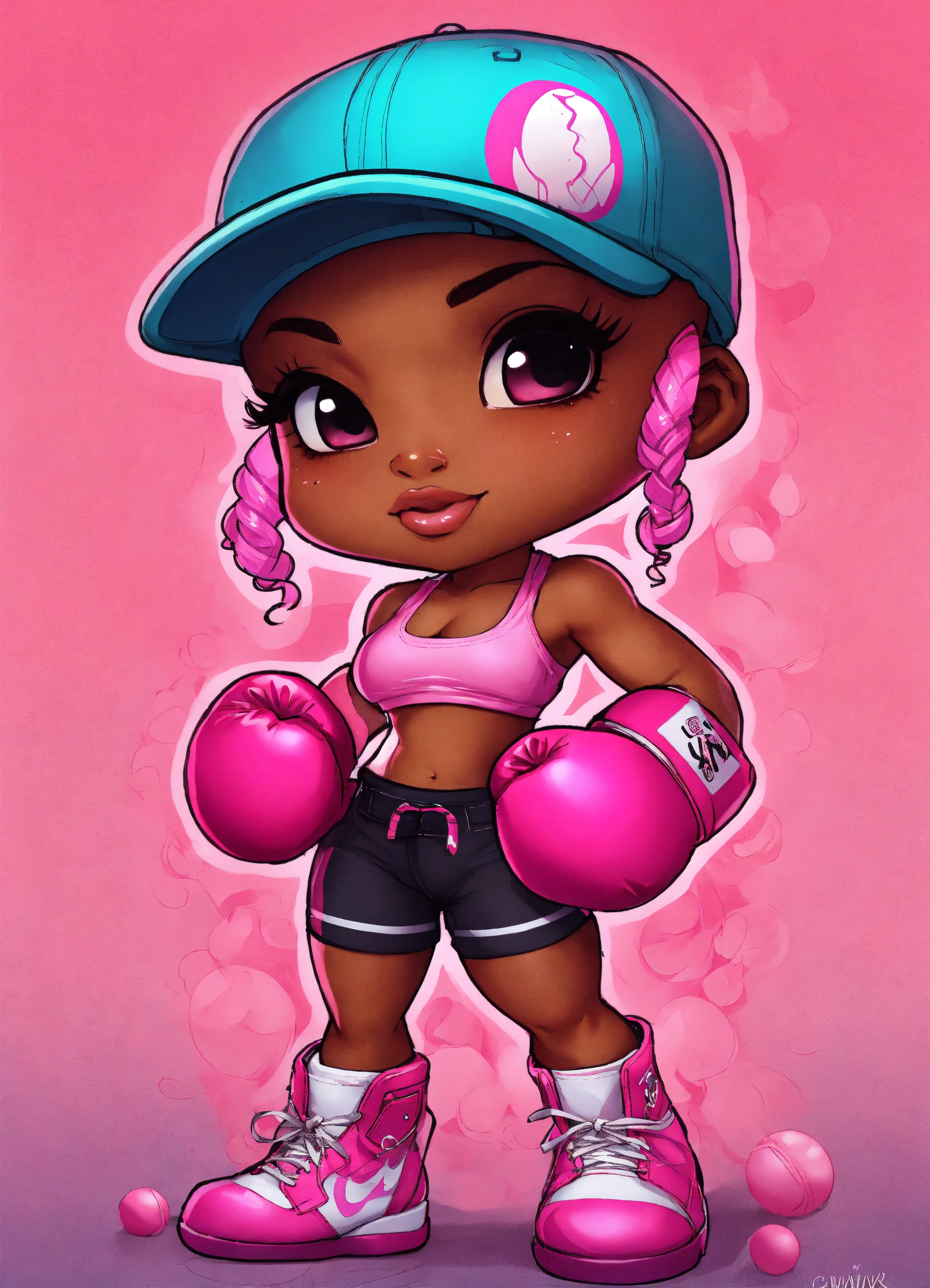 A full body portrait of a bald chibi black girl with style and grace, light brown eyes, wearing a pink baseball cap, no hair, pink boxing gloves, digital art jeremiah ketner, digital art, glowwave girl, 4k ultra, ai please focus on her not having any hair on her head. pink boxing gloves on her hands, macro photography