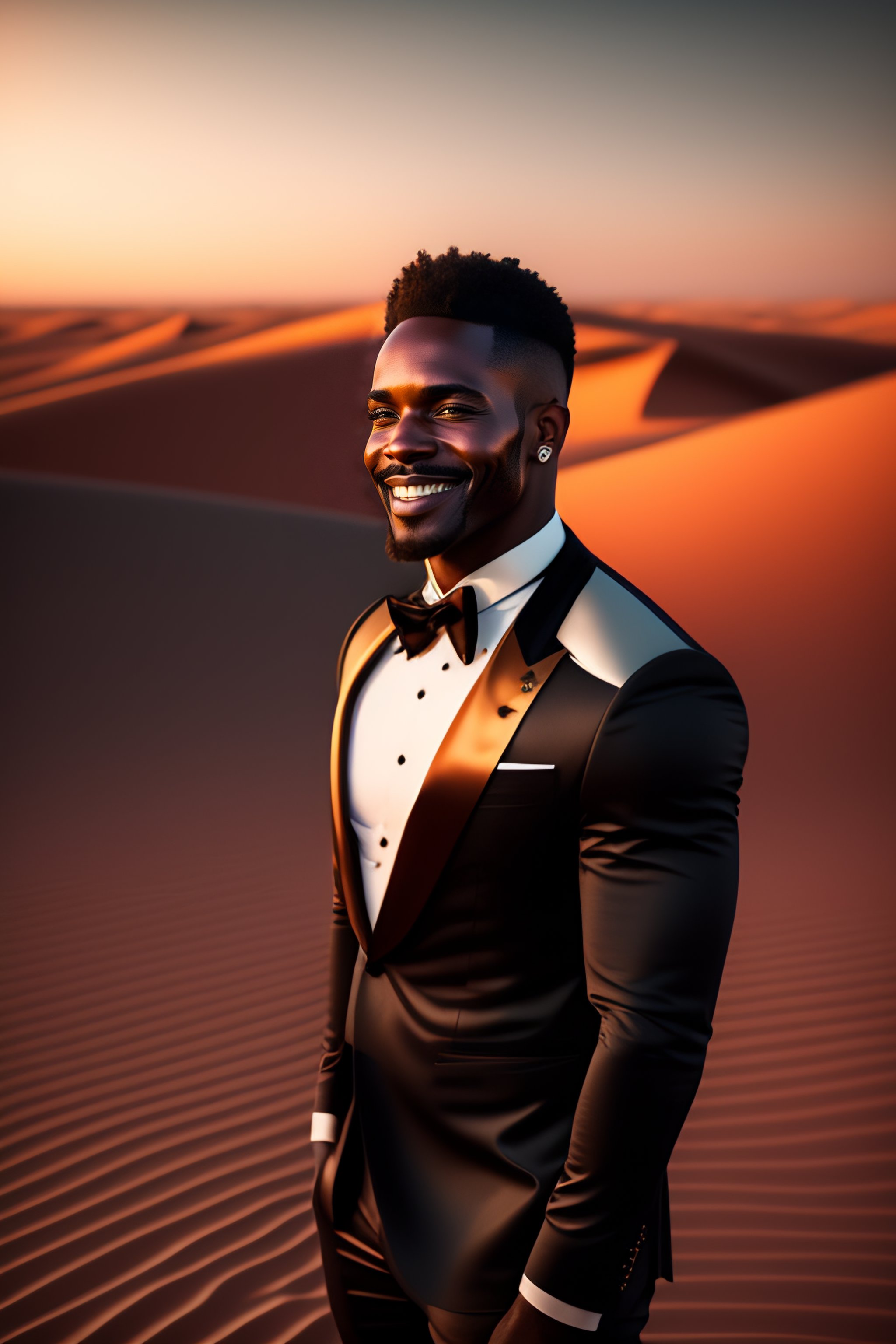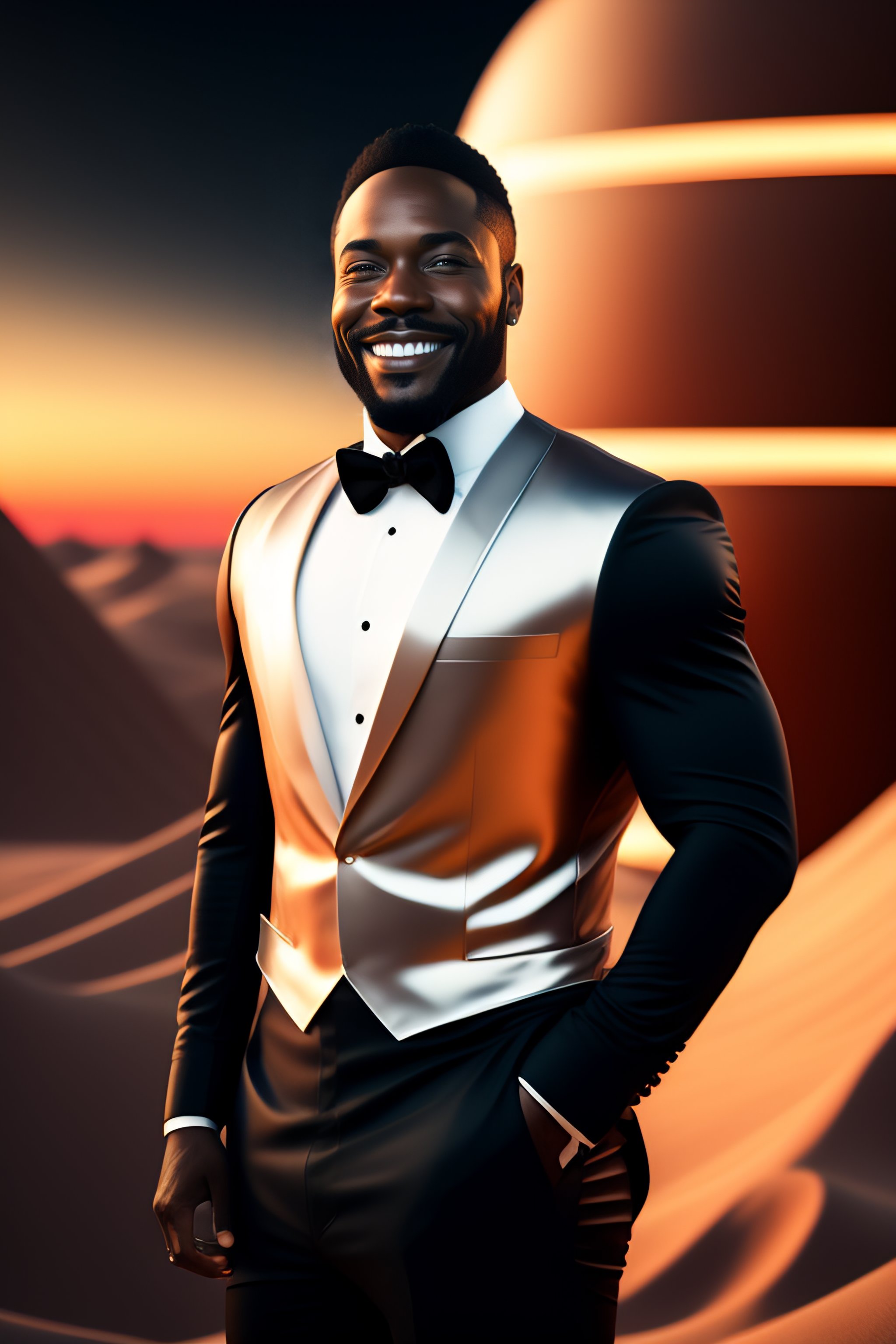 Black bartender smiling wearing chrome tuxedo, preparing cocktail, photorealistic, 8k, octane render, dune atmosphere with hyperdetaled