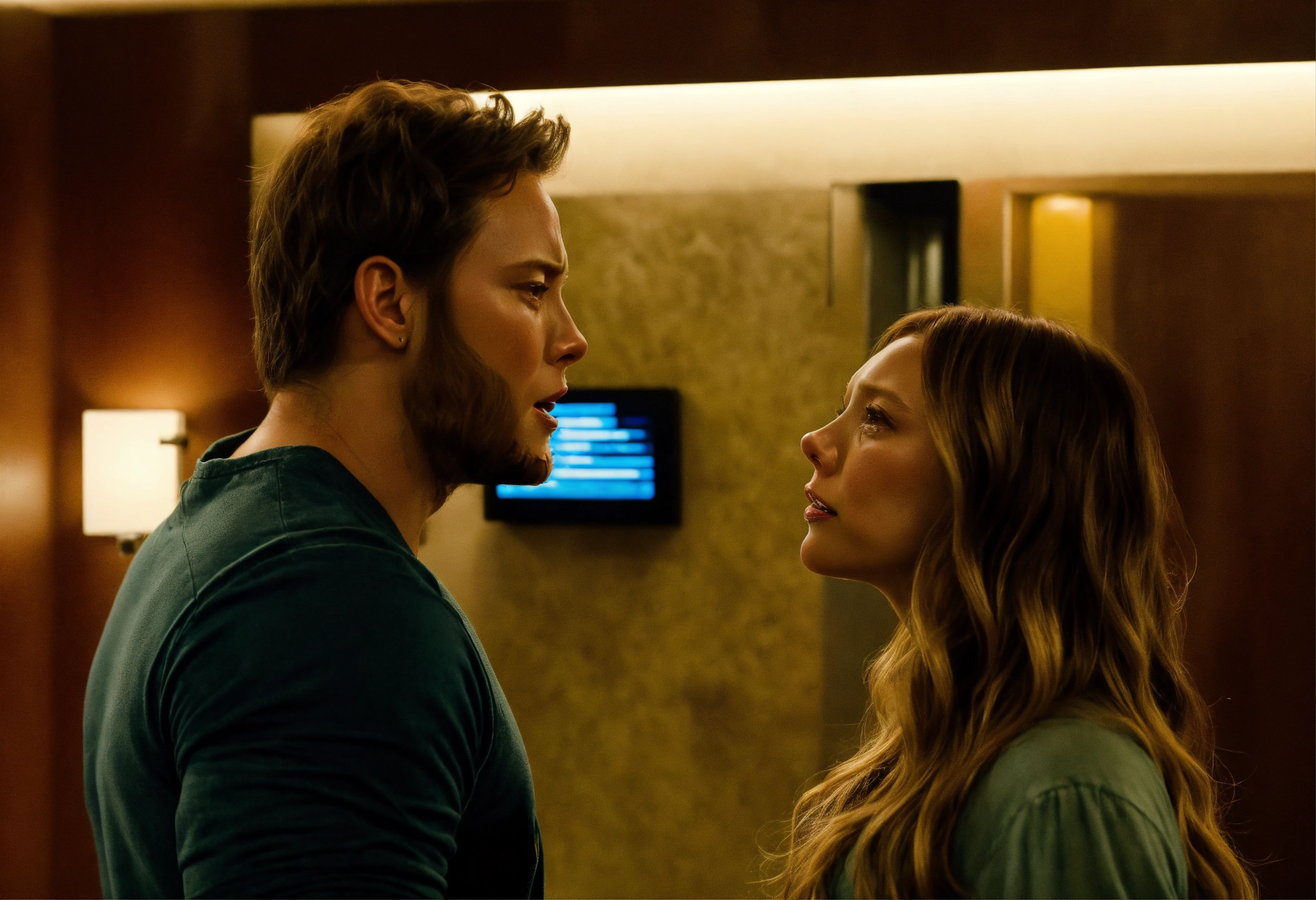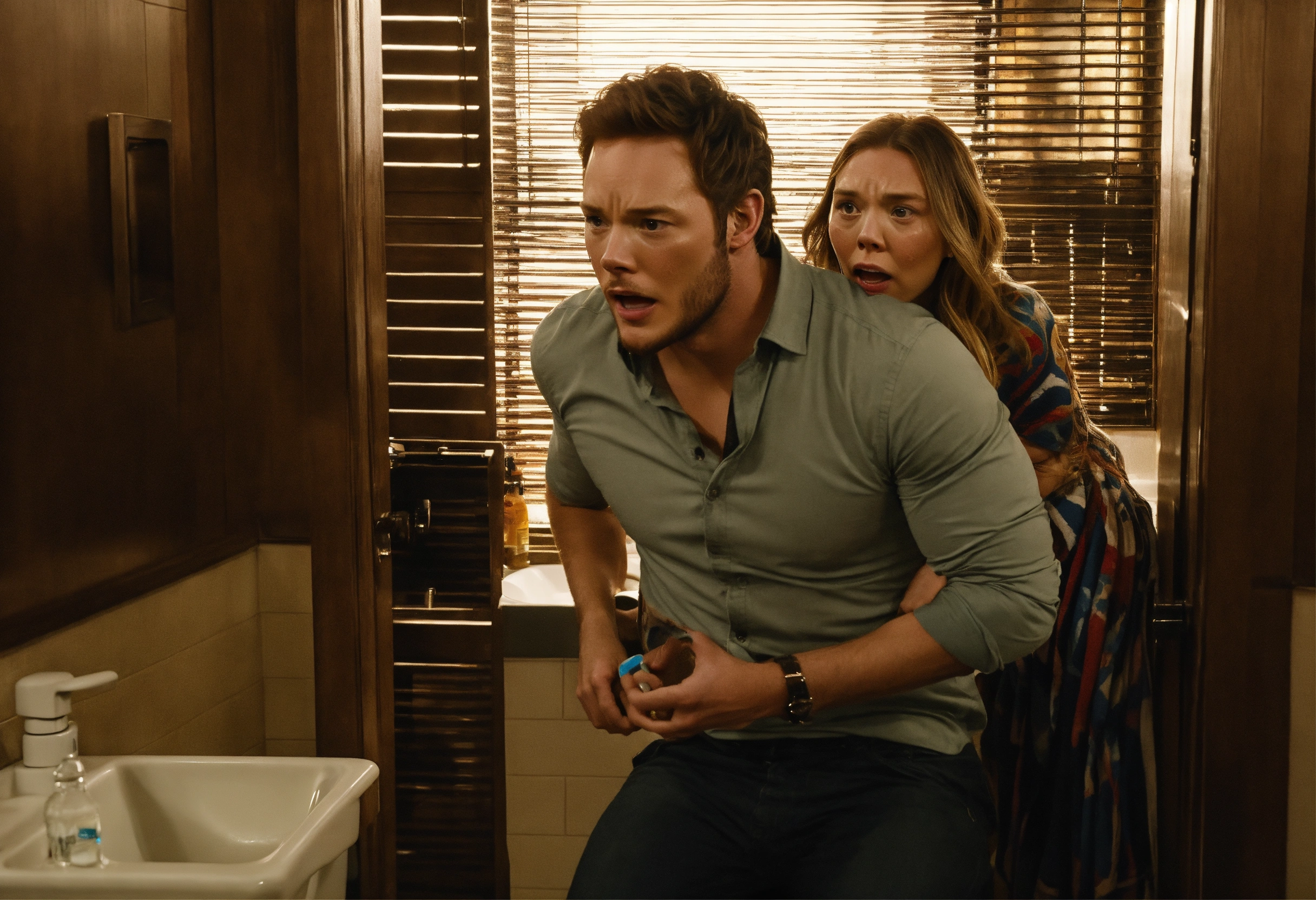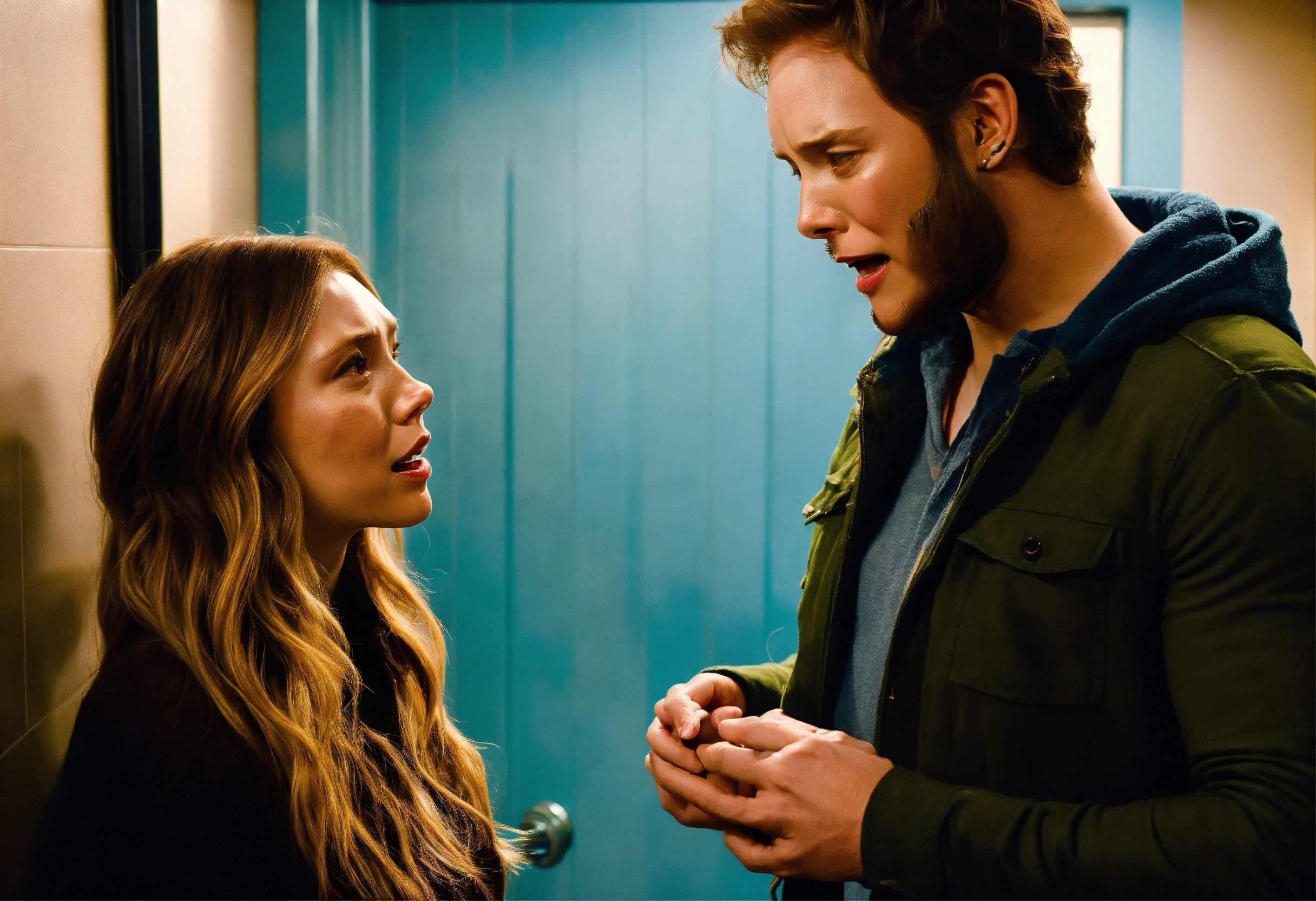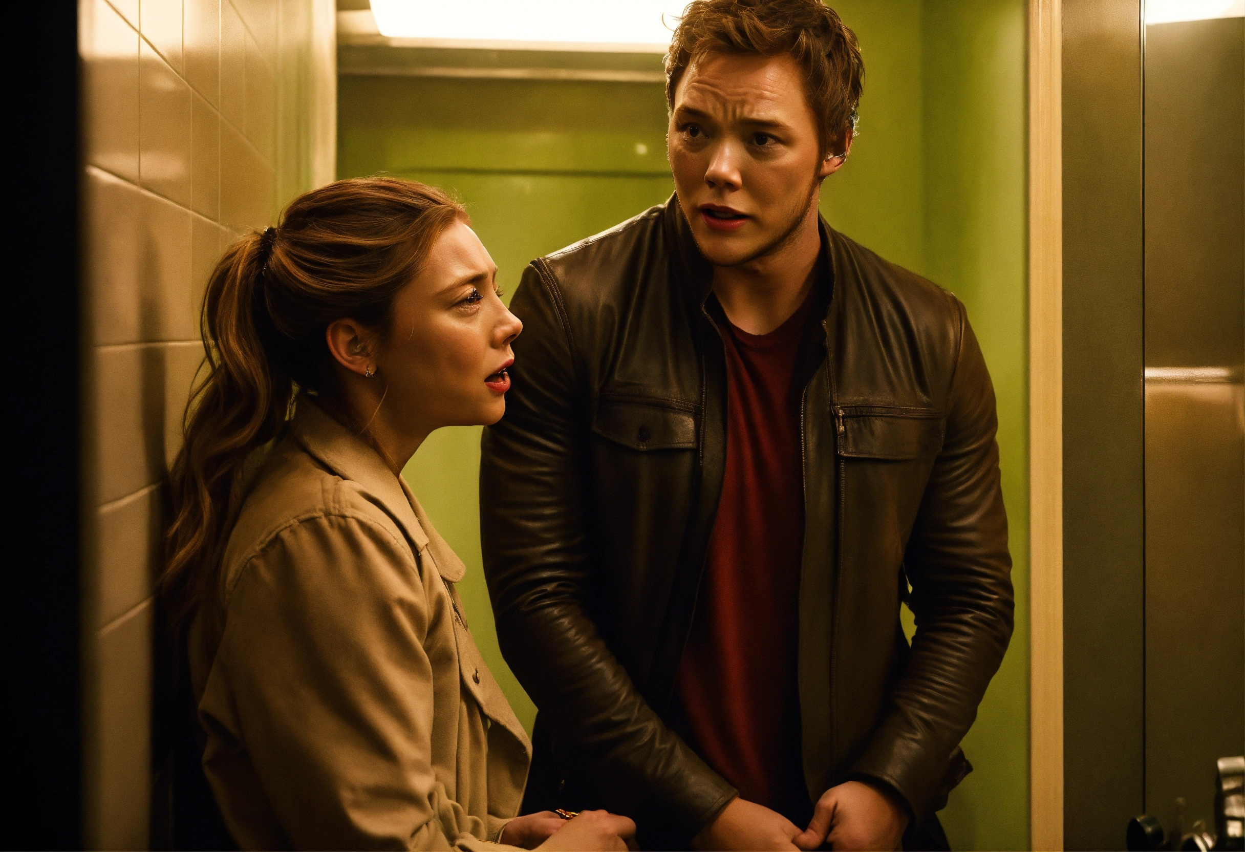 Elizabeth olsen and chris pratt are arguing in the restroom
