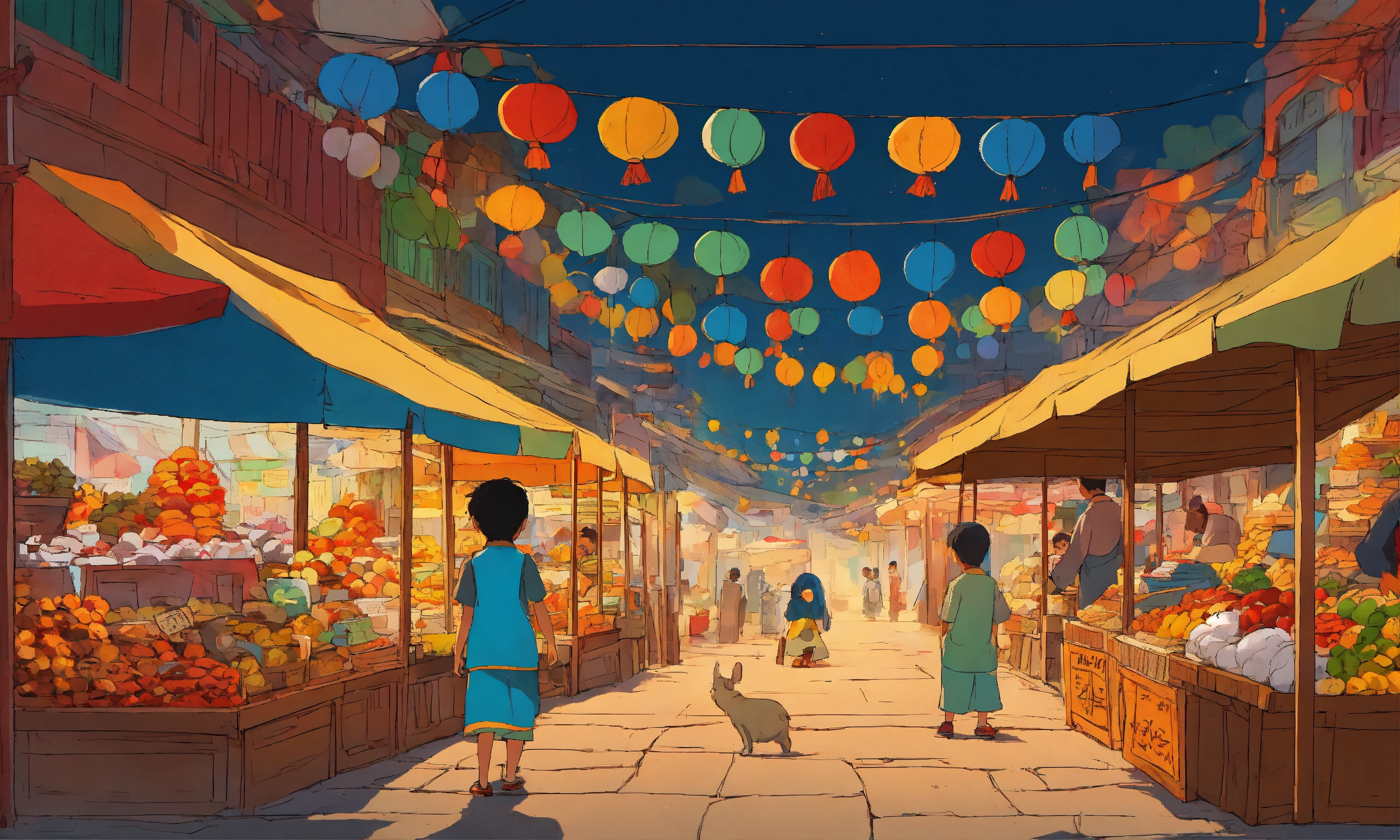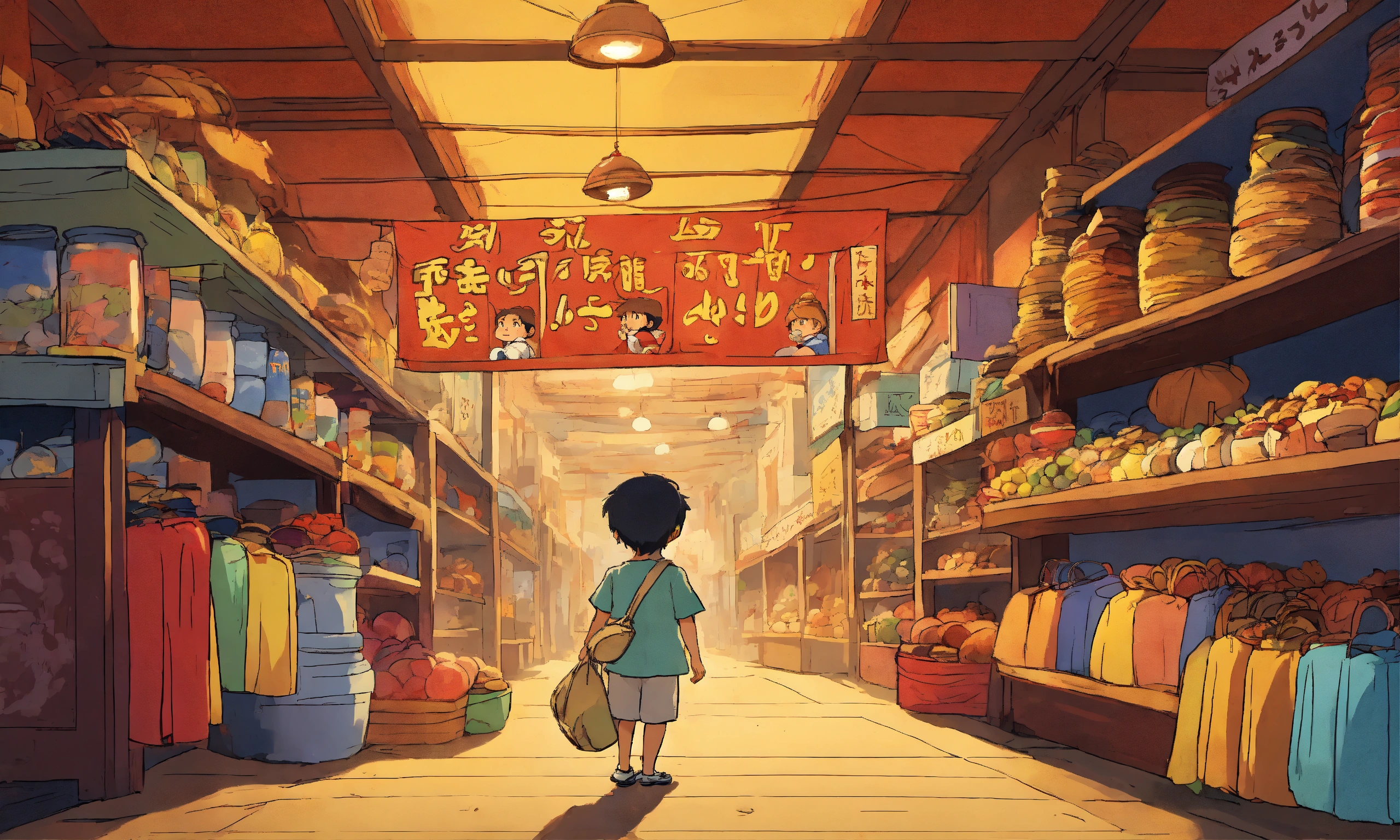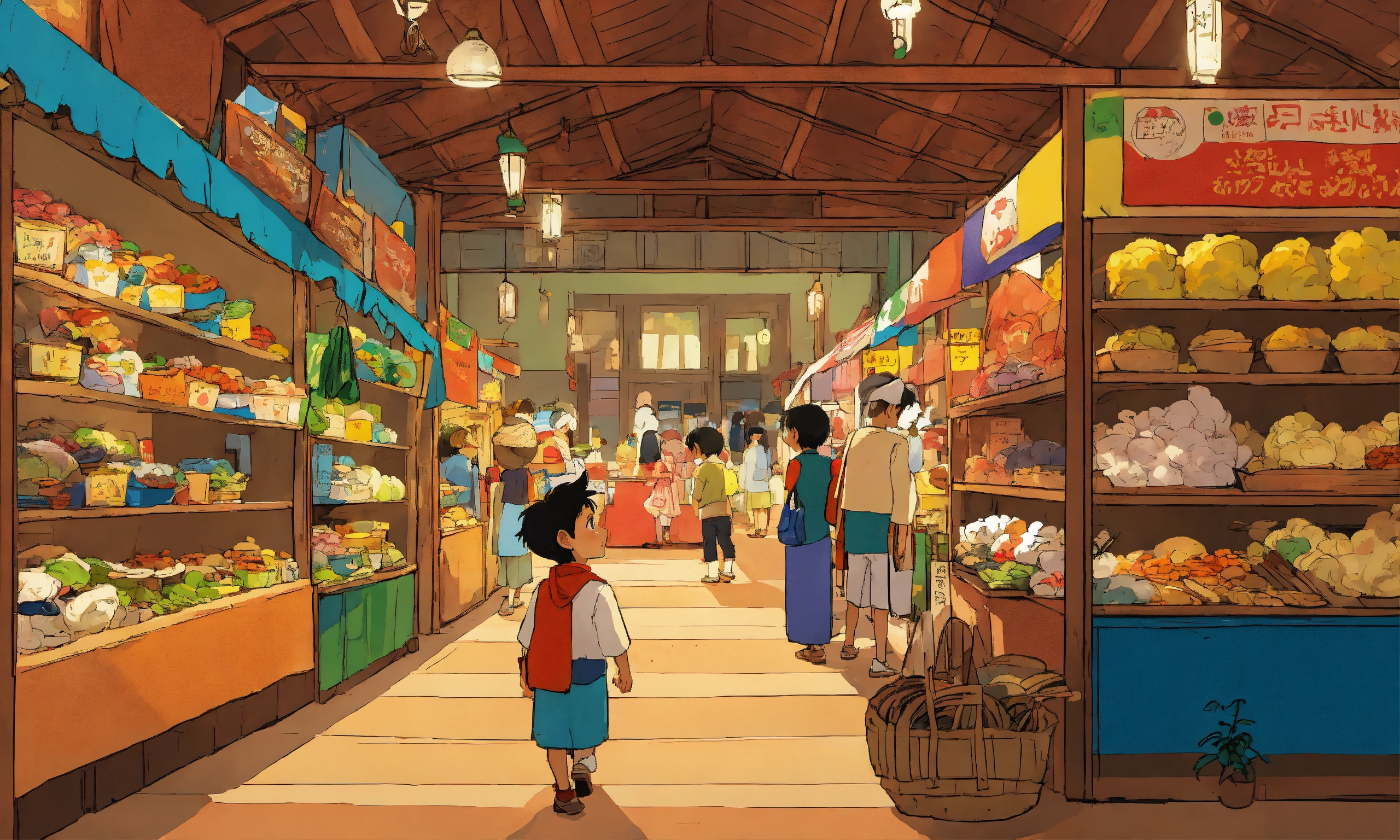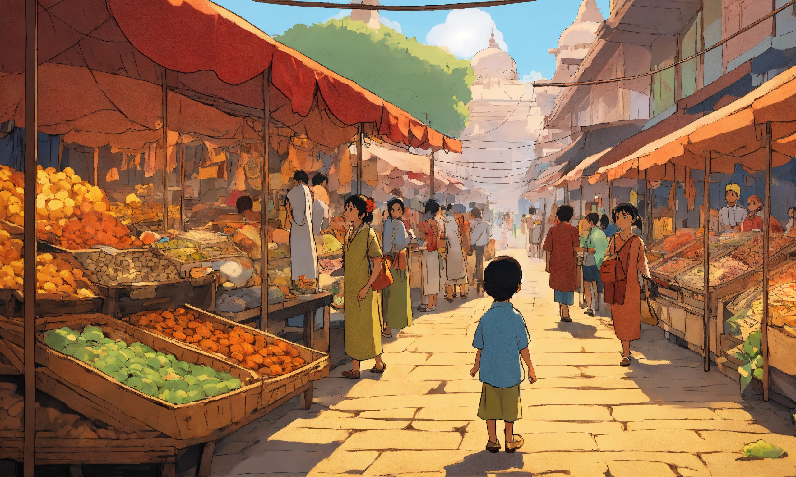 Small kid in busy indian marketplace, stalls on either side, style of hayao miyazaki, cartoon, simple, childrens book, primary colors