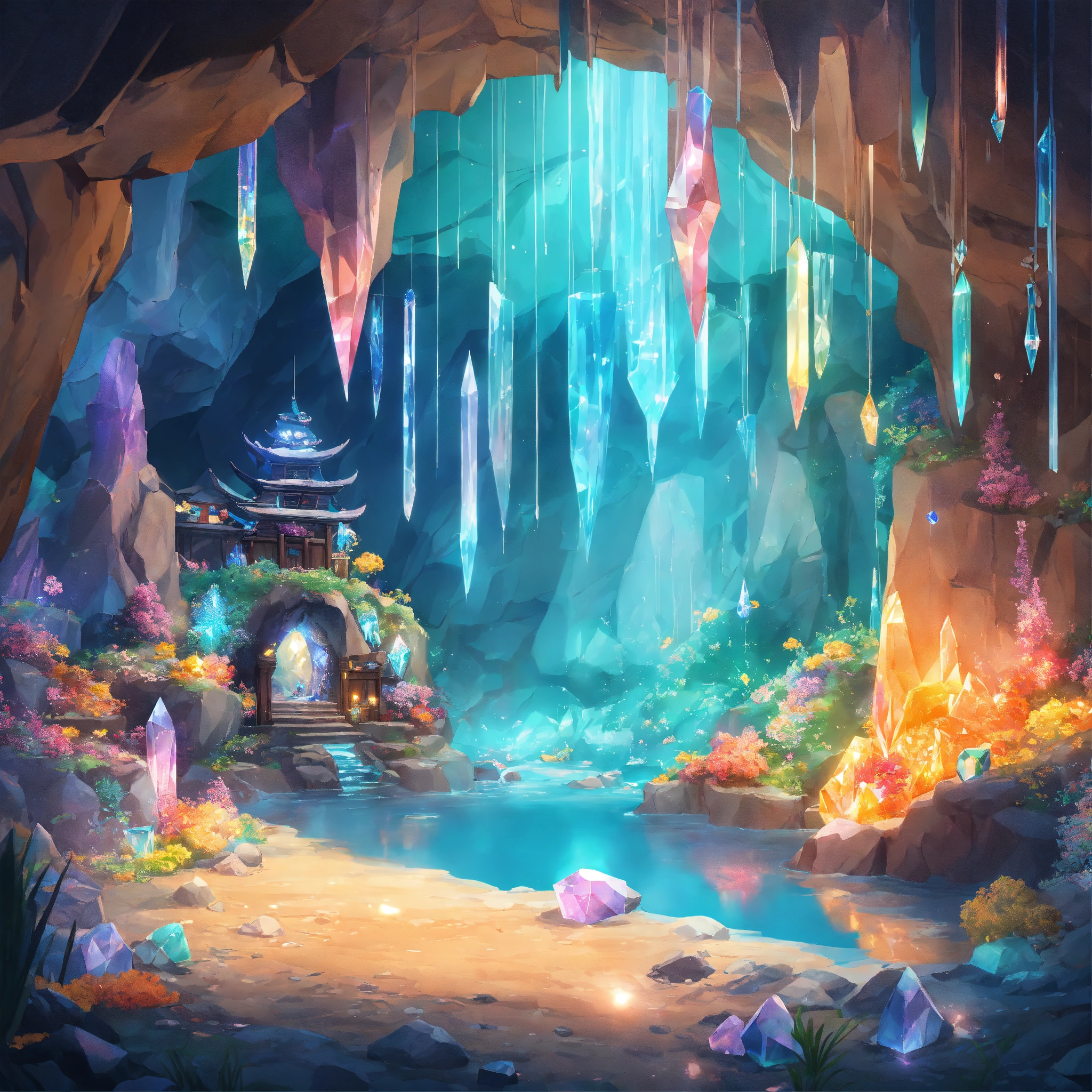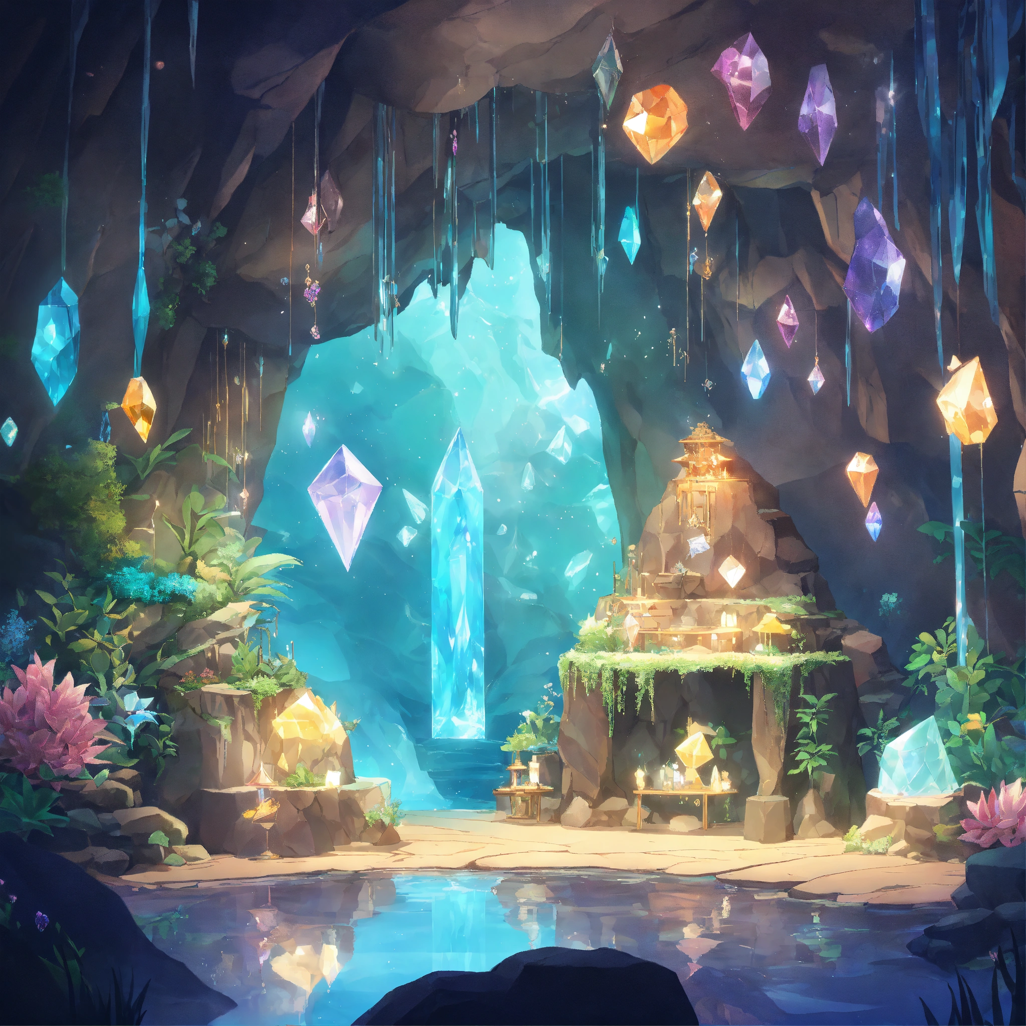 Generate a studio ghibli image of an ethereal, mystical cave filled with a variety of luminous crystals and minerals from spy crystal's collection. in the heart of the cave, there's a serene pool of water reflecting the shimmering light from the crystals, enhancing their glow. the walls of the cave are adorned with spy crystal’s most popular items, showcasing their beauty and depth. the shop name, 'spy crystal, ' is naturally integrated into the scene, with letters made of crystal facets reflecting light, and social media icons can be styled as rare minerals placed subtly around the cave's entrance. this image should convey a sense of wonder and discovery, inviting the customer to explore the treasures within.