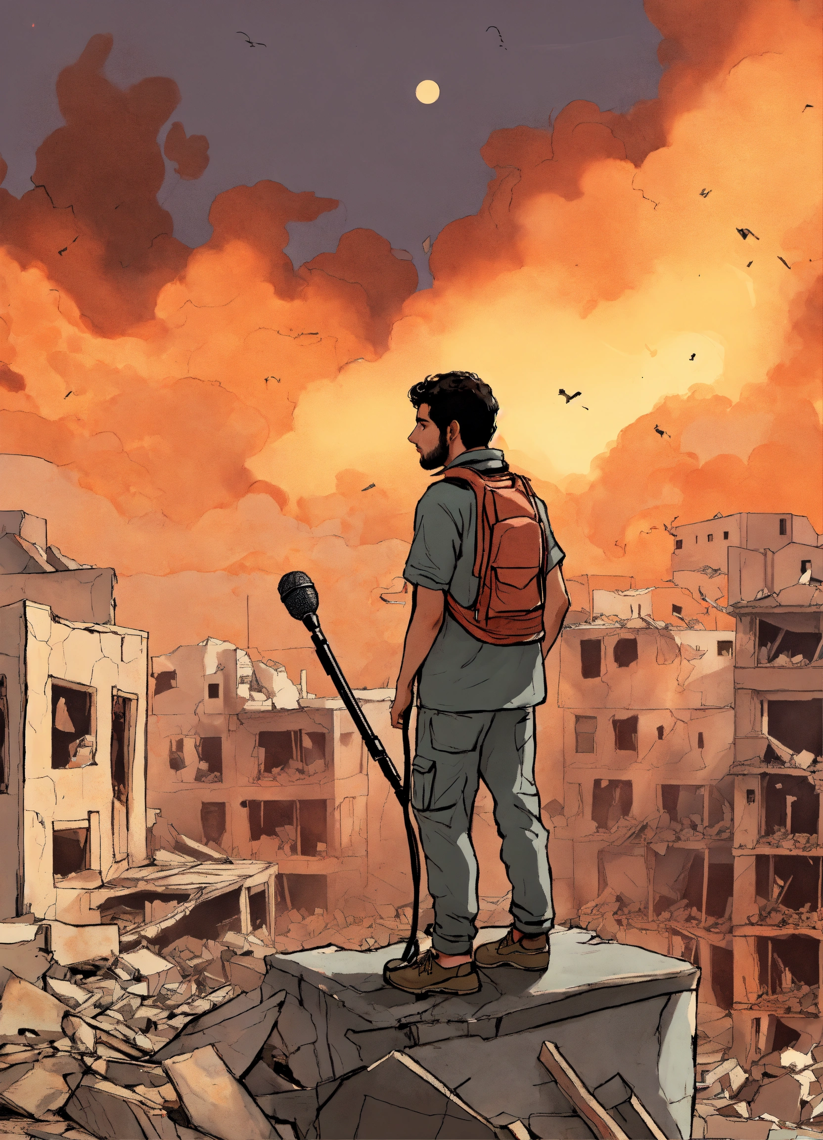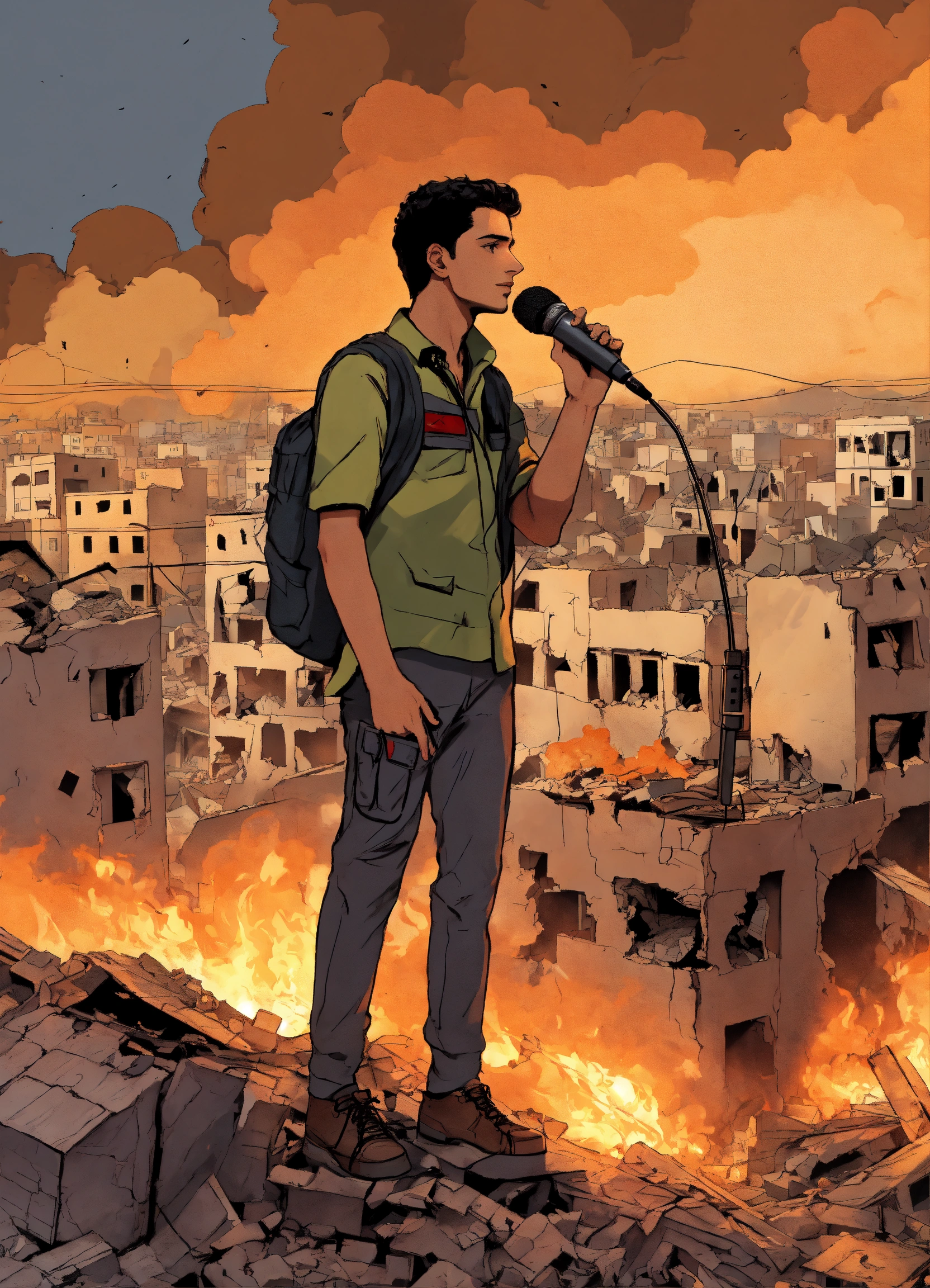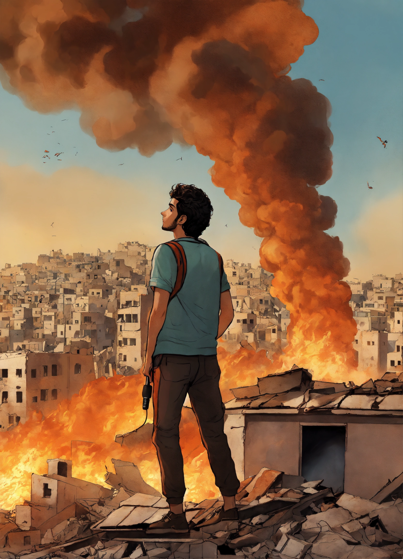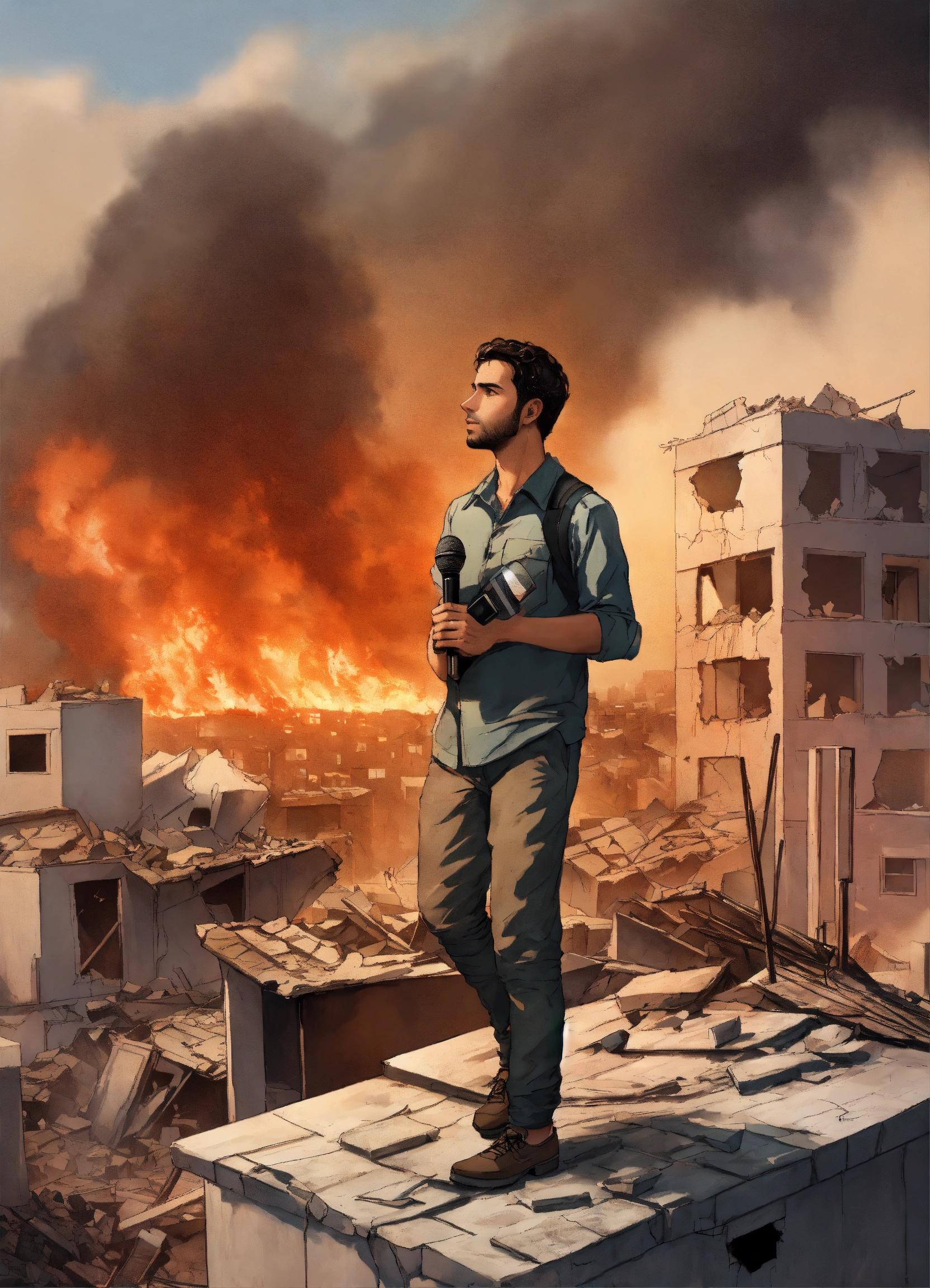 "a design that depicts a young palestinian man standing on the roof of his still-standing home amidst the destruction, with buildings around him collapsing and ablaze due to israeli airstrikes. he is acting as a news correspondent holding a microphone, but the microphone is not real."