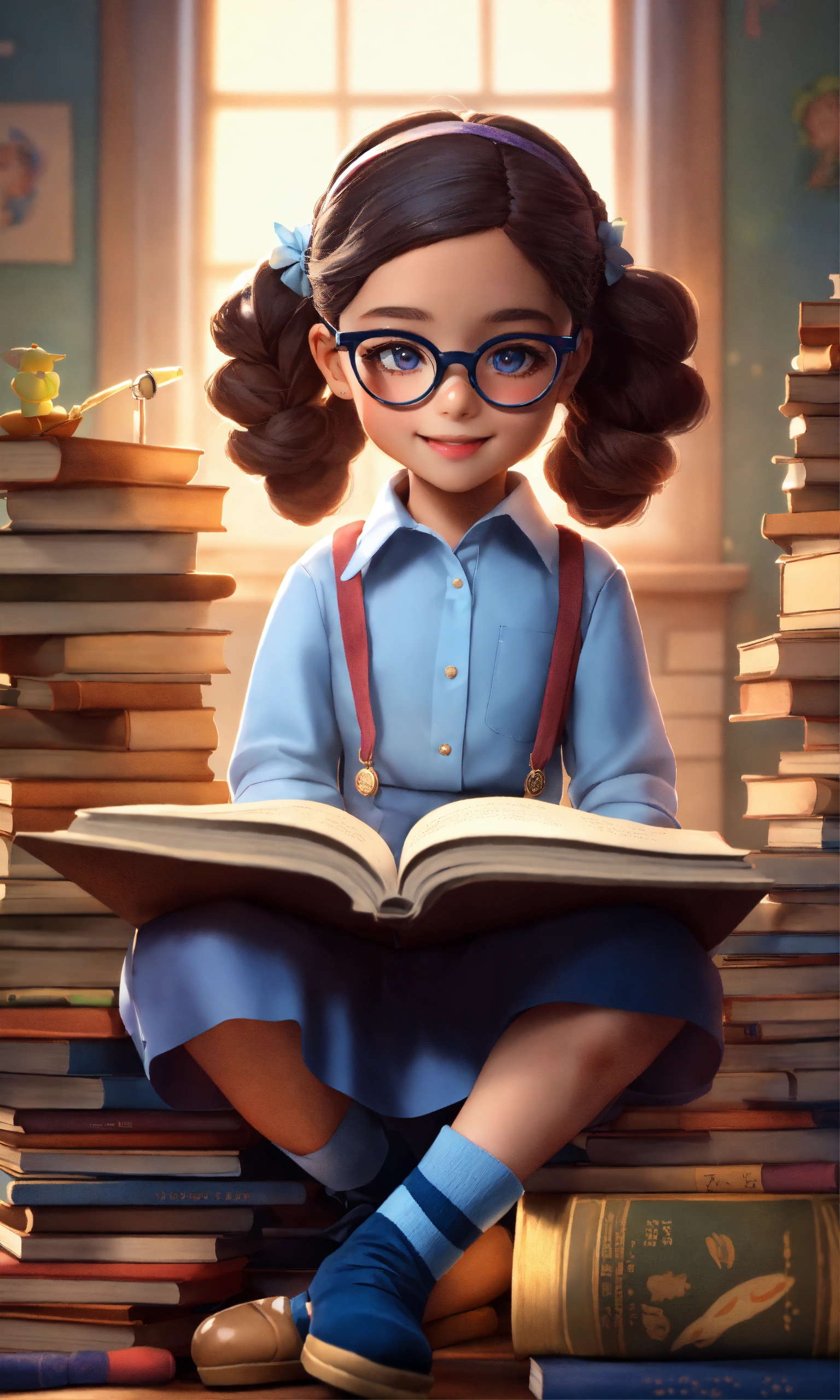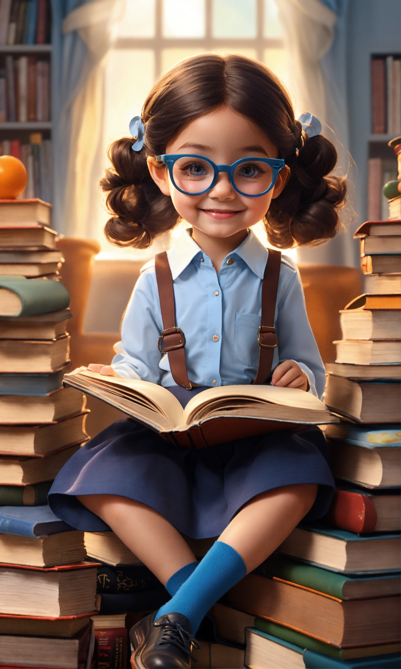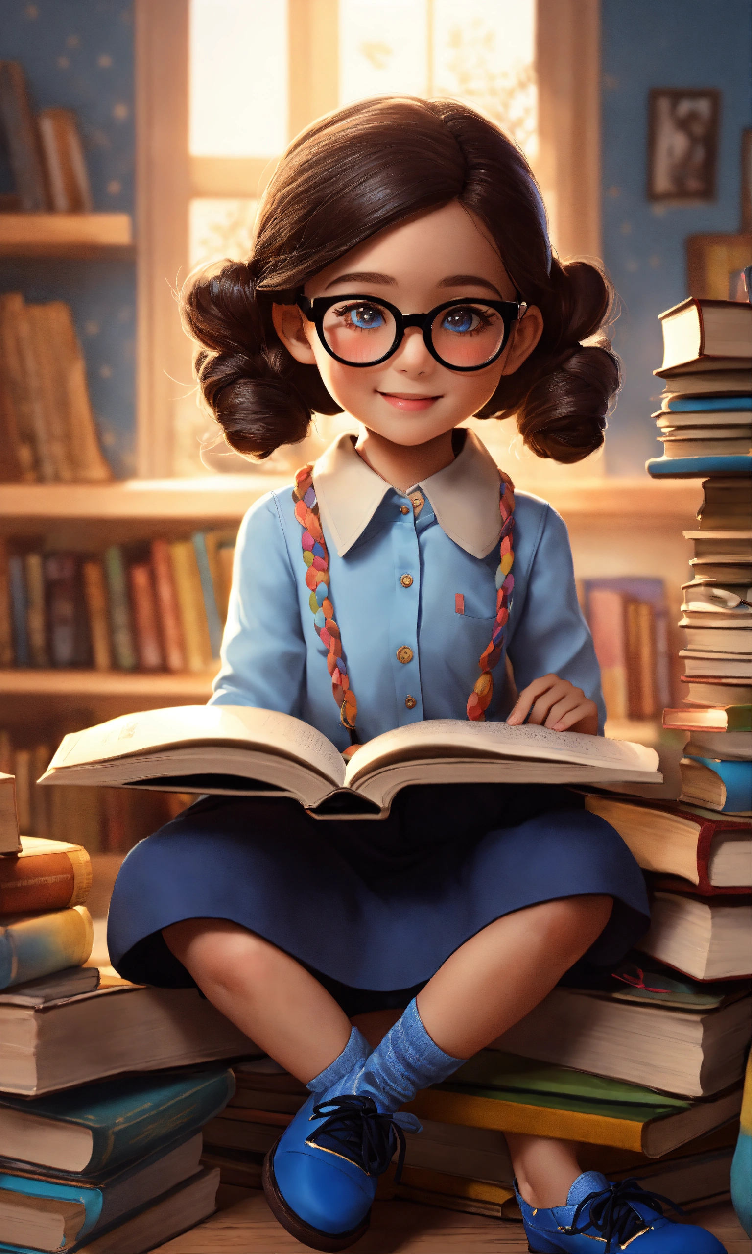 A sweet 5-year-old girl wearing a light blue button-down shirt, with a light blue collar and long sleeves. very long dark blue skirt, dark blue socks and dark shoes, big round glasses, hair in a braid. sitting on a pile of books reading a book and smiling. her eyes look into the book. very colorful realistic doll 3d style