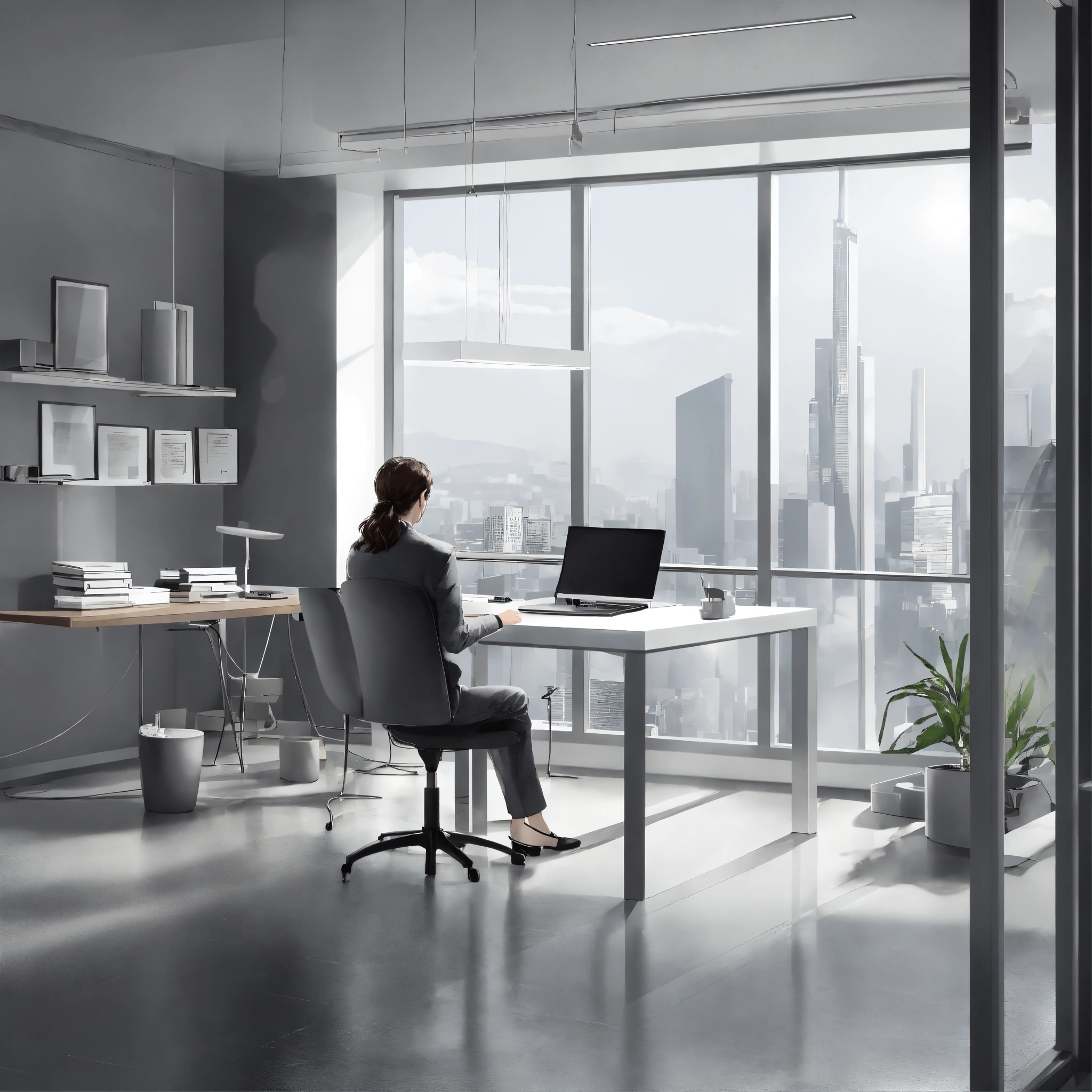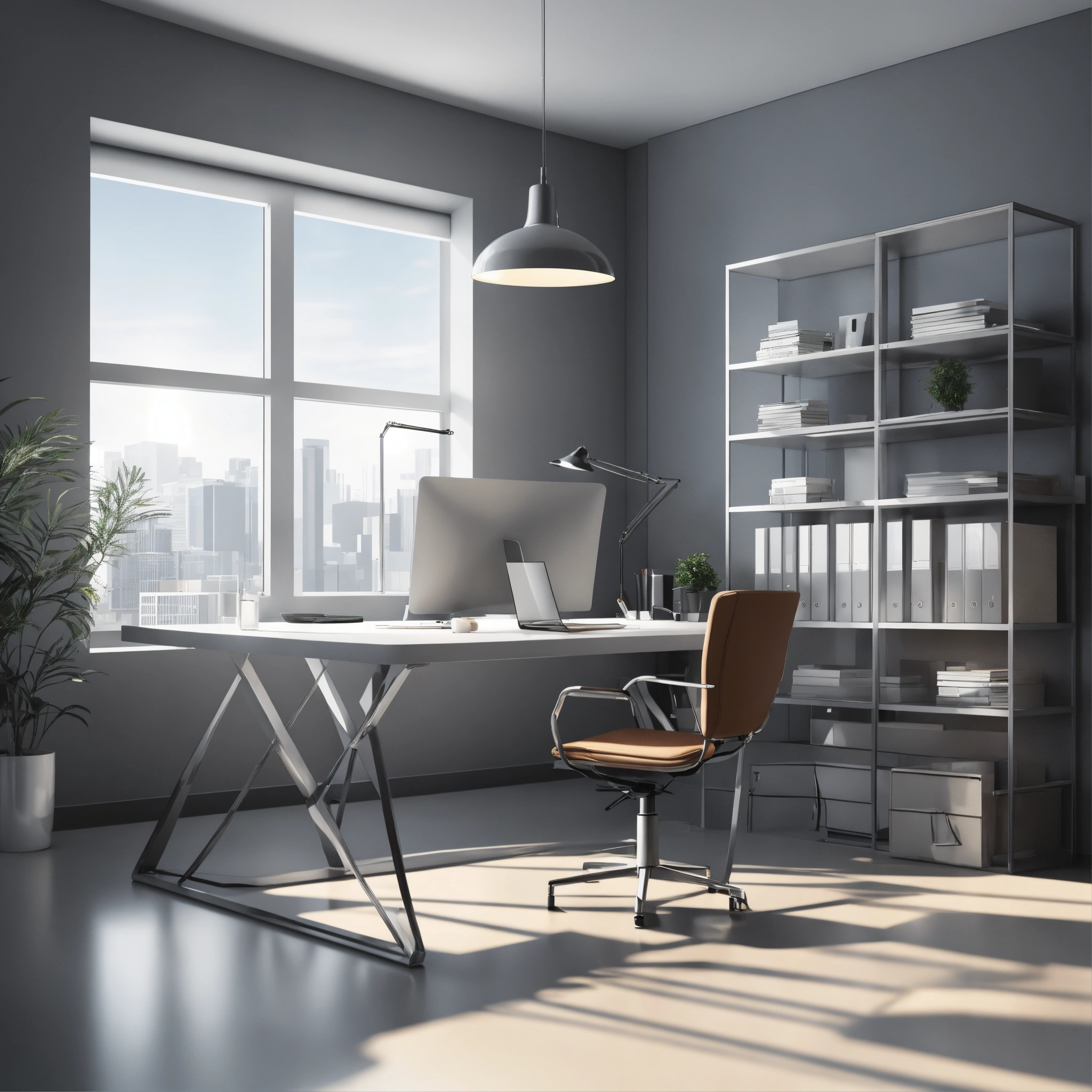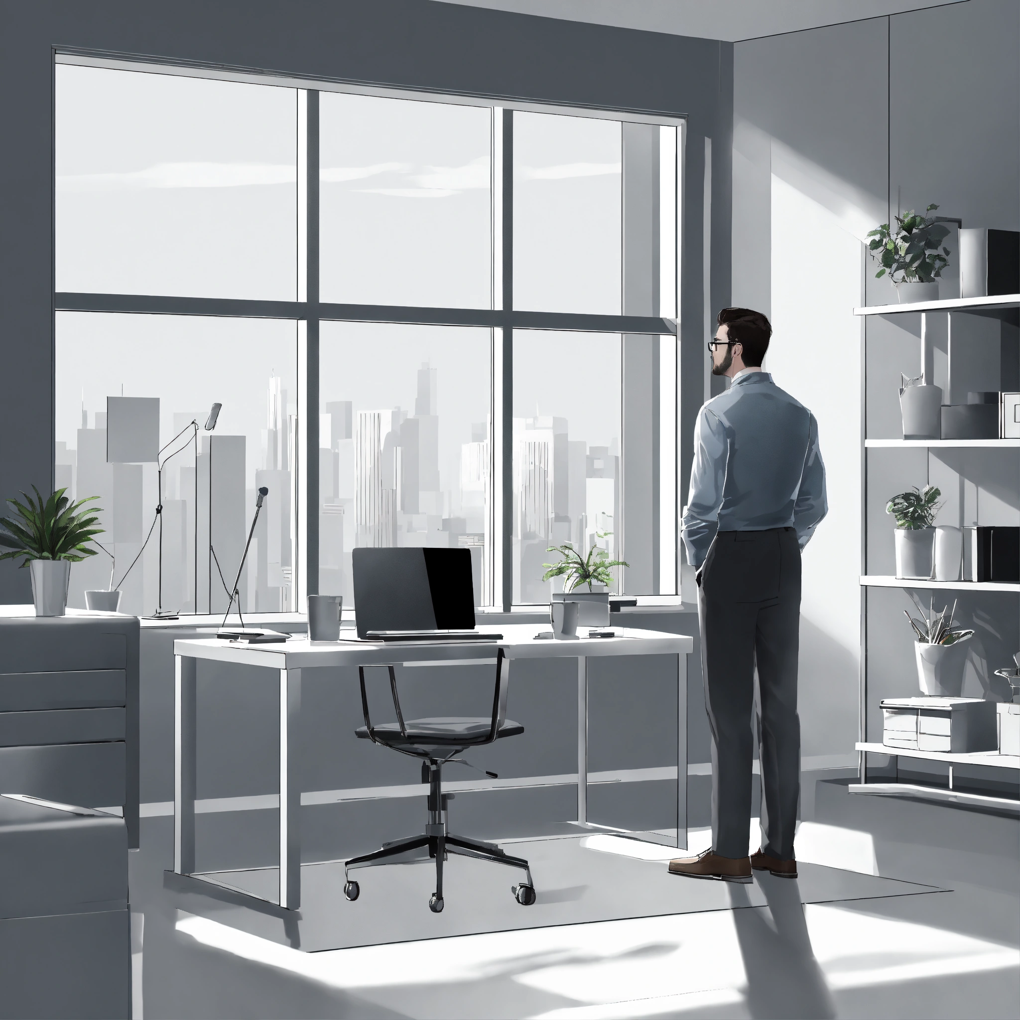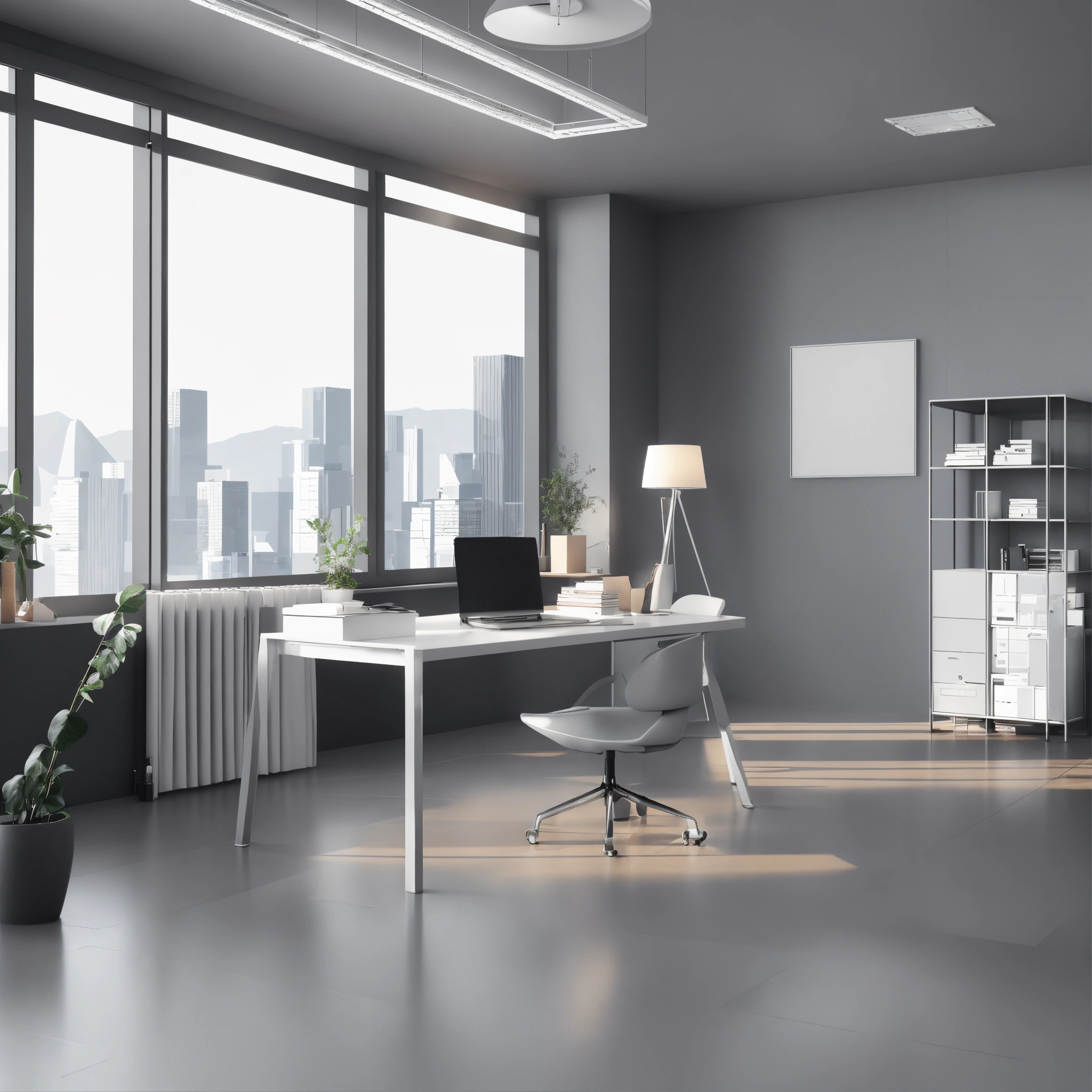 Modern office illustration in gray colors, a white table in the background, a window, a table, a person, a chair standing in the foreground, modern.