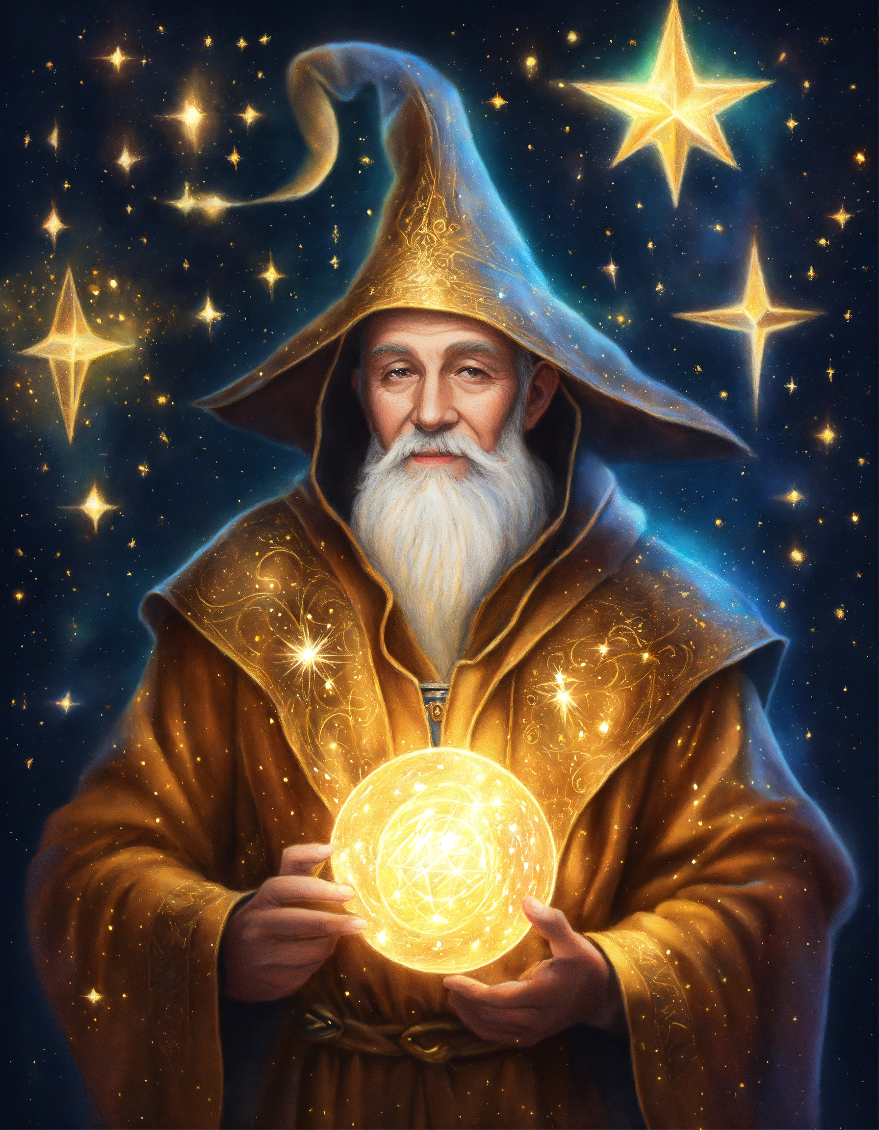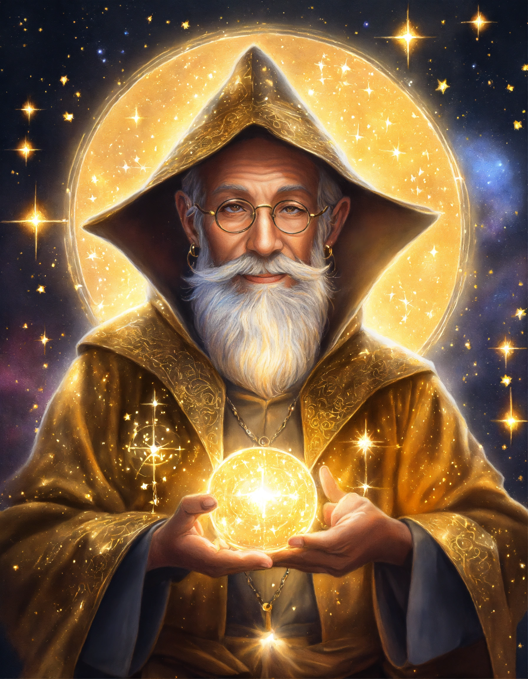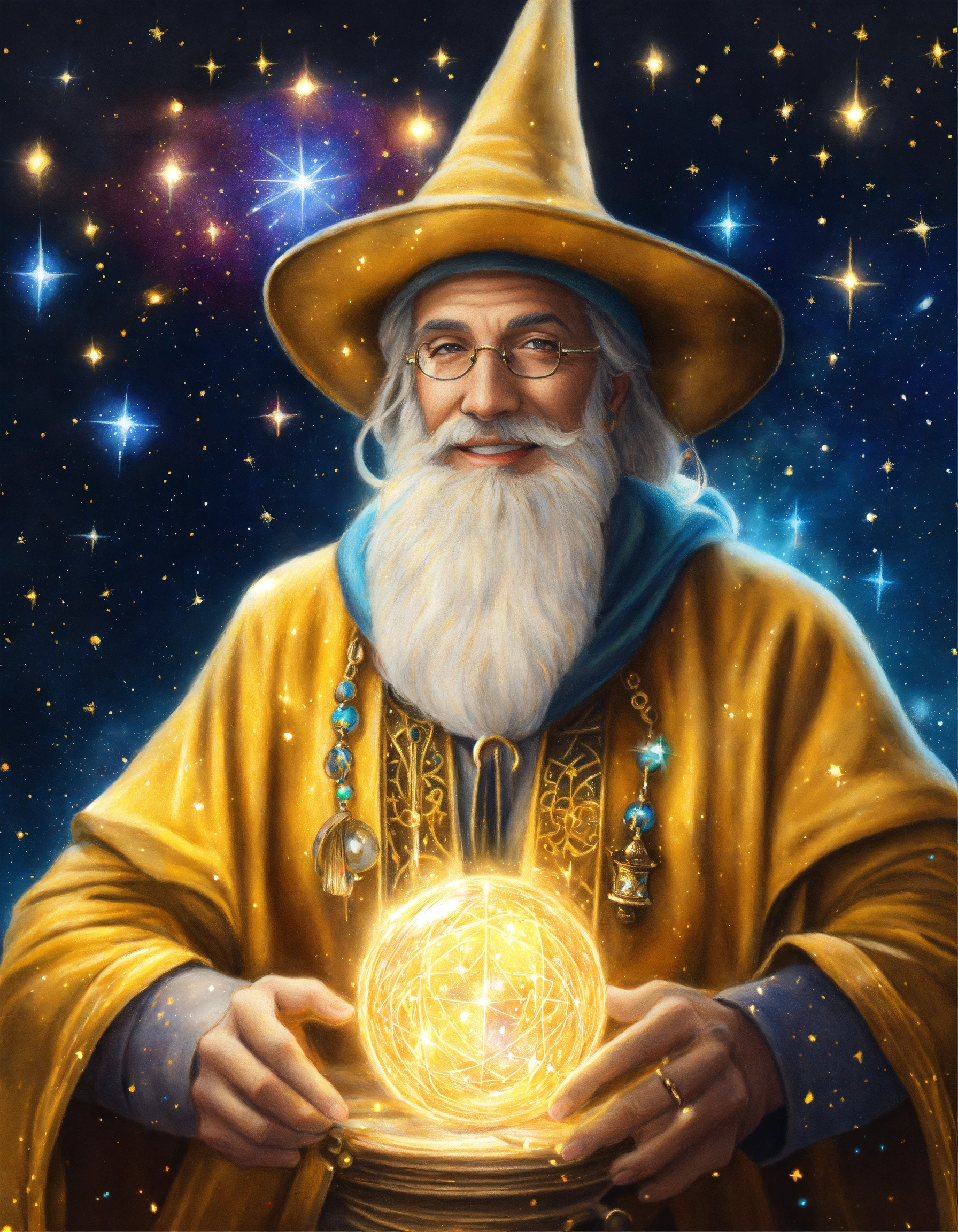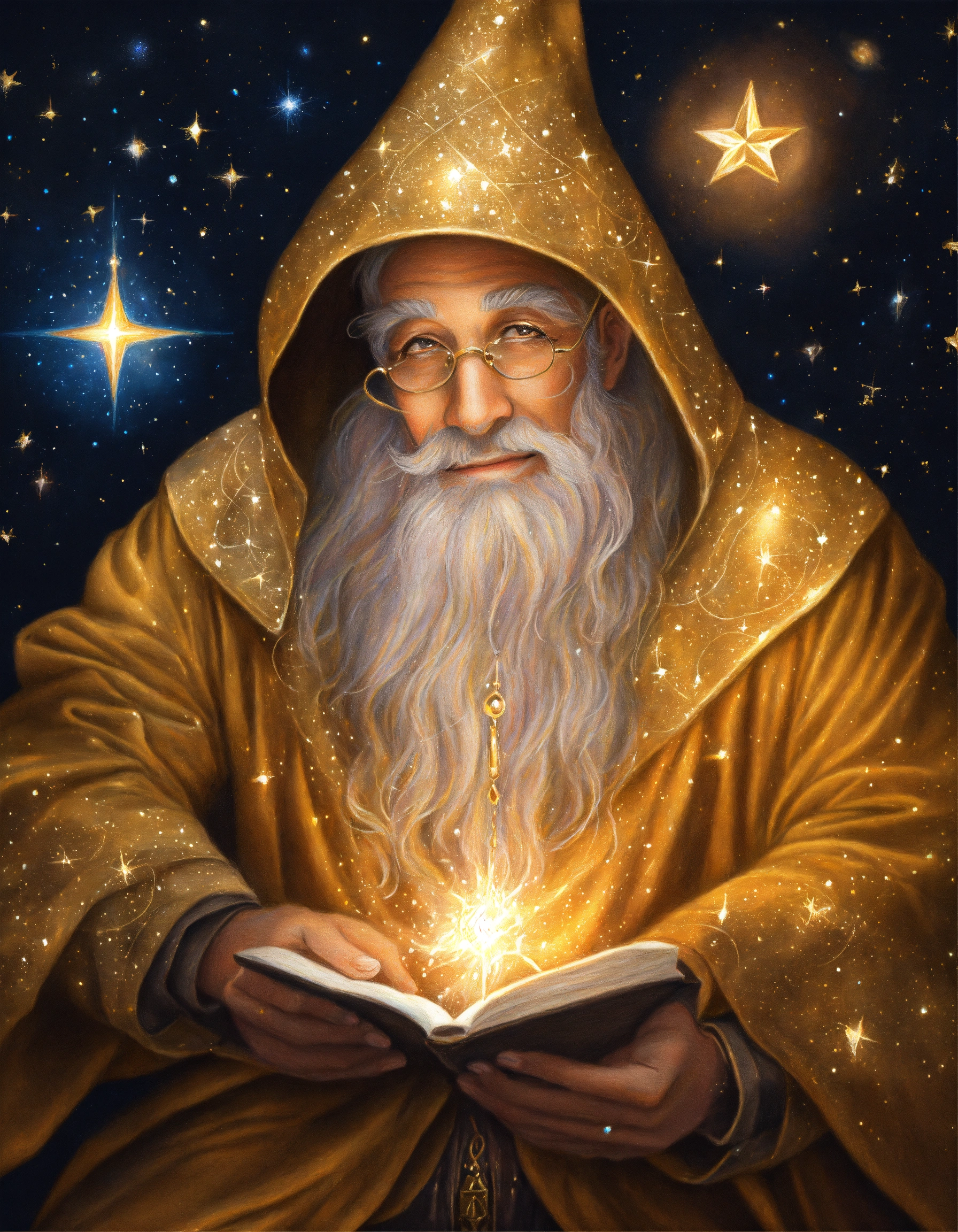 Realistic colored pencil drawing of an old alchemist wizard wearing a golden outfit sparkling with starlights, letters in unknown languages around him, simple smile, galaxy background