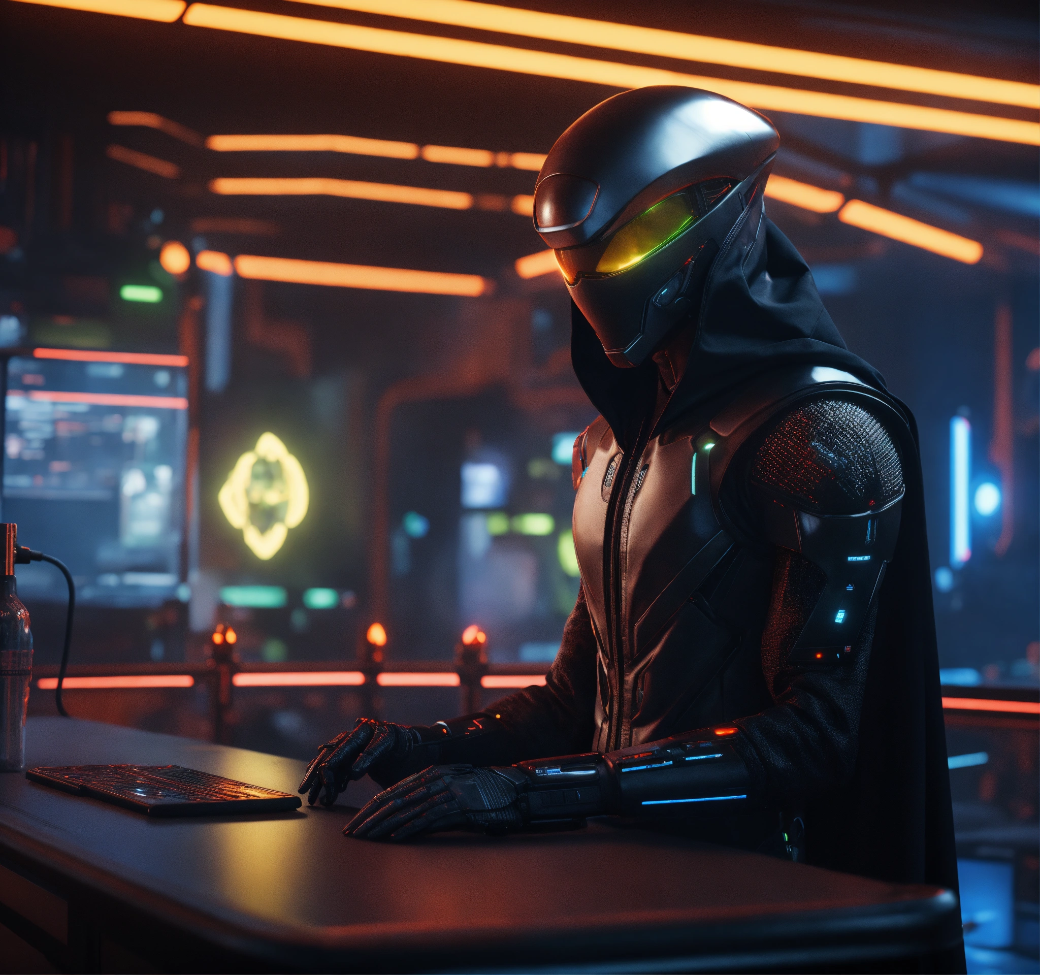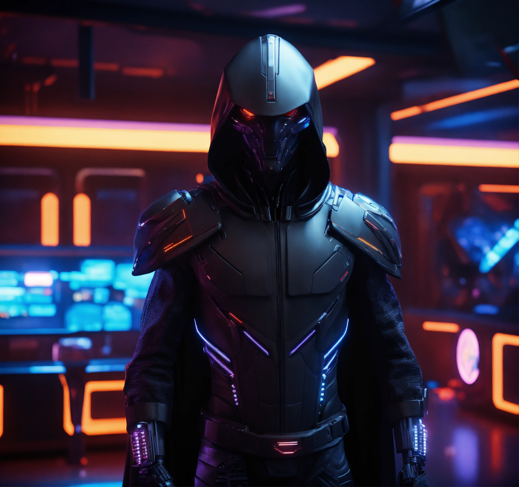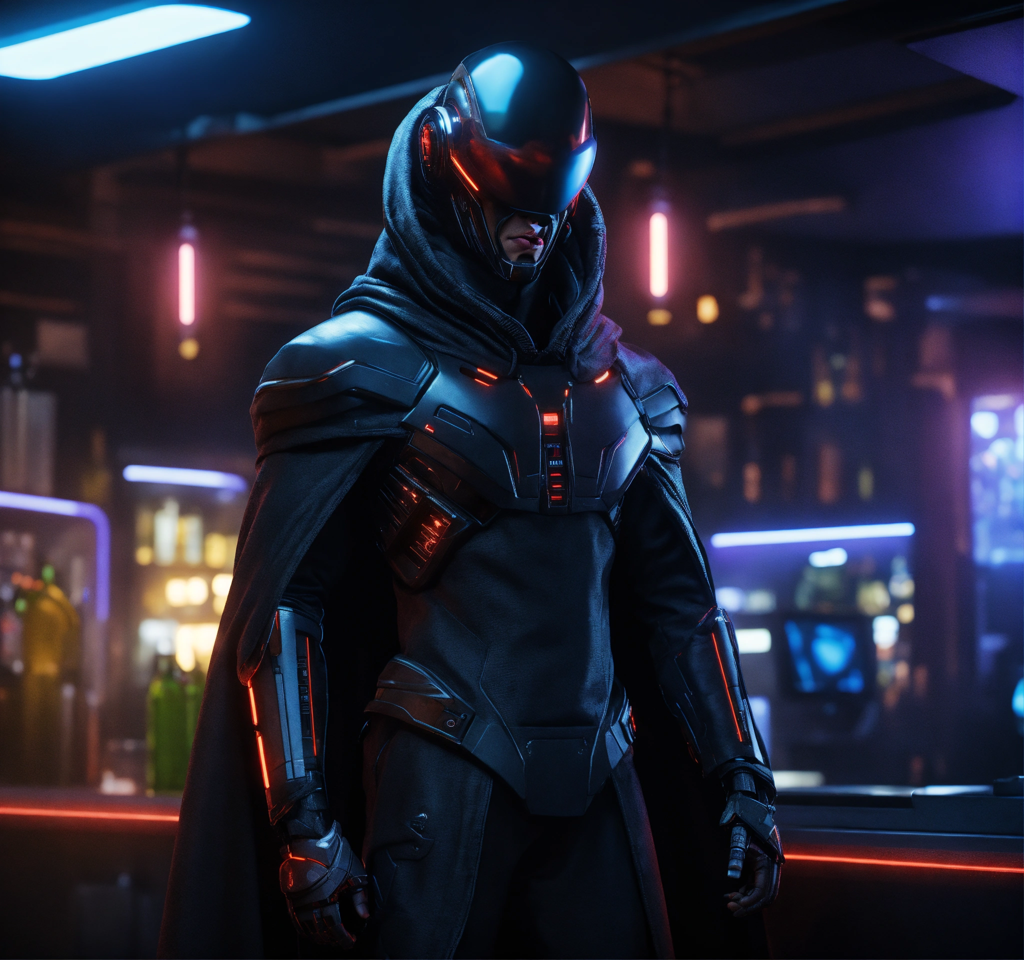 Male alien mutant half cyborg wearing a hood, wearing a futuristic black clothing, hi-tech visor and cape, in a dark futuristic space port bar, 8k, realistic. unreal engine, pixar