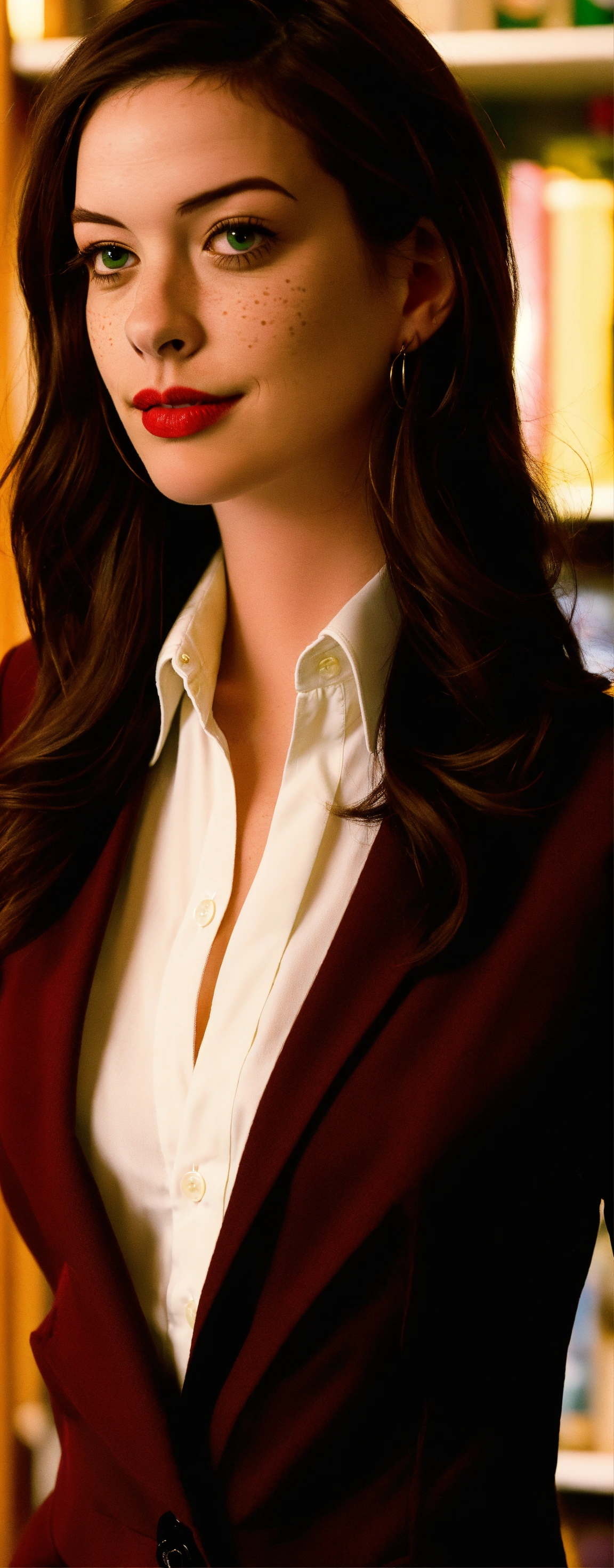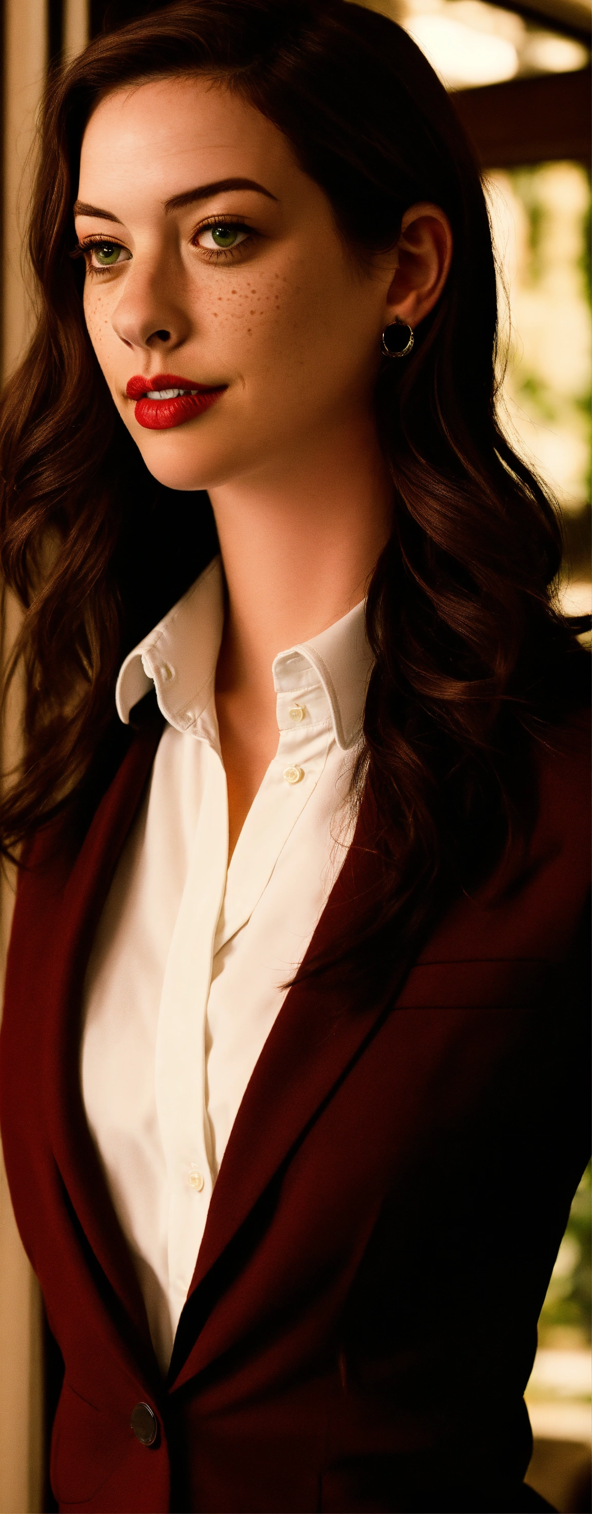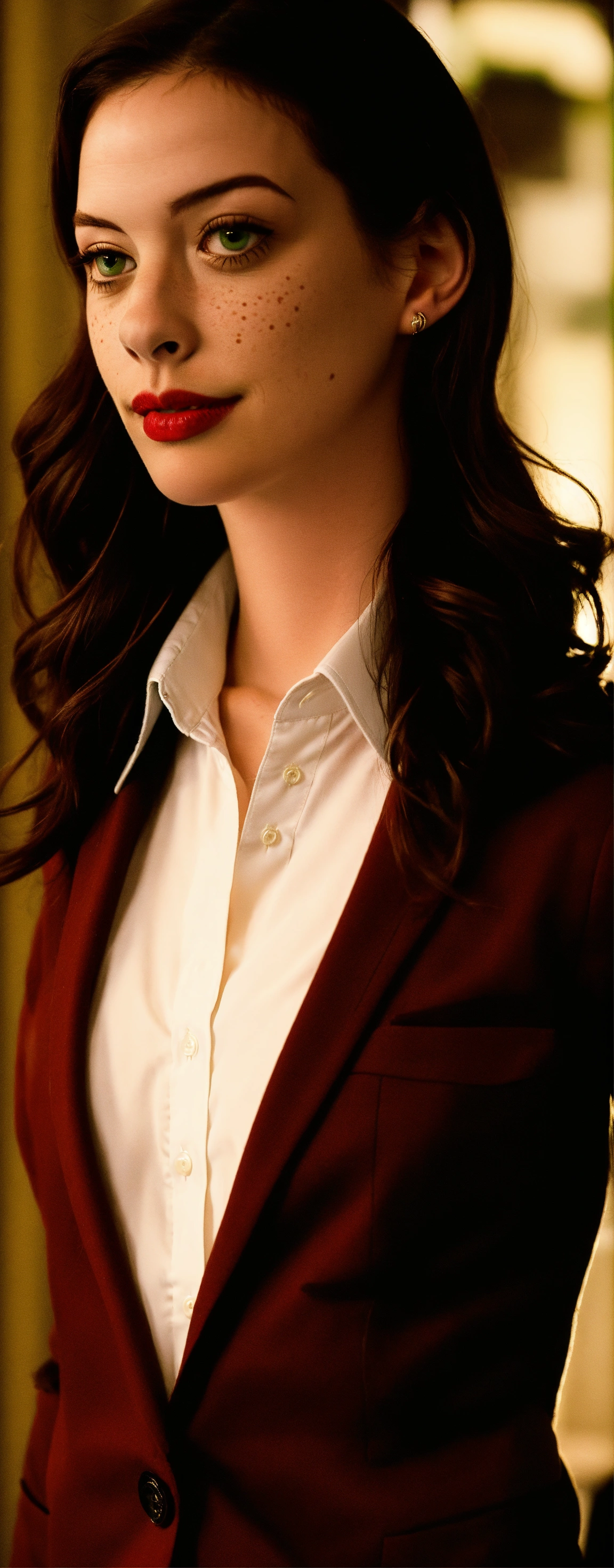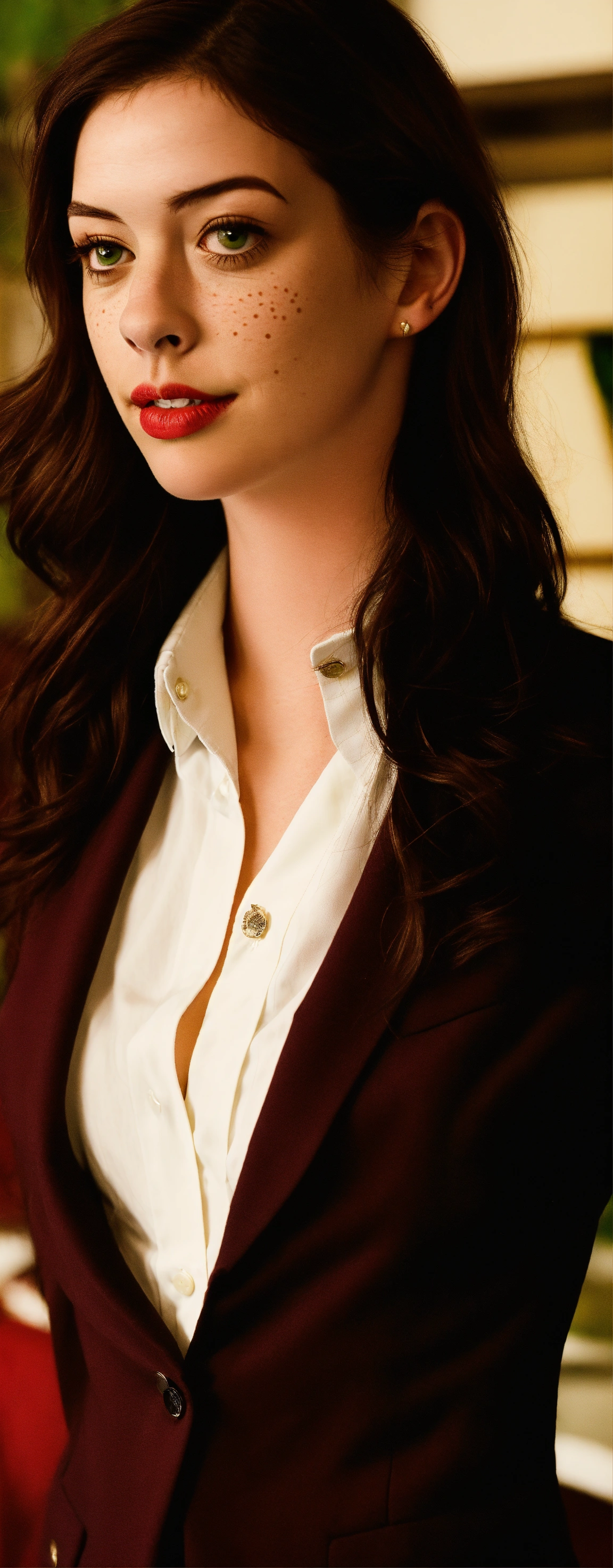 A anne hathaway photographic portrait of a 25 year old beautiful woman with neck lengthened, untied dark red hair, greater bust, tight shirt, wide bust, she has green eyes, freckles on her face and red lipstick, form-fitting, curve-hugging, snug, tailored, close-cut, sculpted, defined, pronounced curves, shapely, casual, relaxed, laid-back, undone, informal, nonchalant, easygoing, disheveled, carefree, unbuttoned, unstructured, effortless, she wears a black suit jacket with a white shirt and black tie. her head is triangle shaped, preppy, elite, well-dressed, polished, sophisticated, form-fitting shirt, stylish, prestigious, private school attire, layered, hosiery, affluent, knee-high socks, upscale, traditional