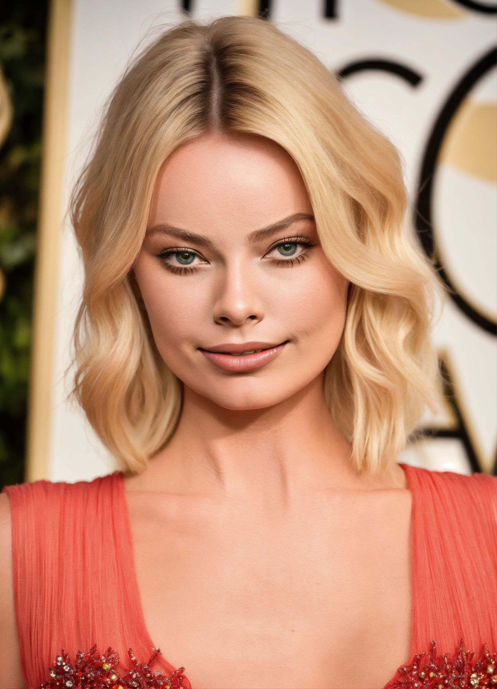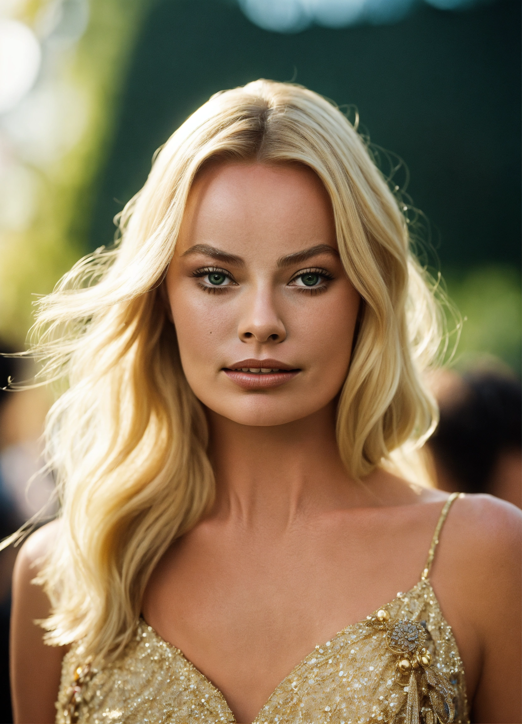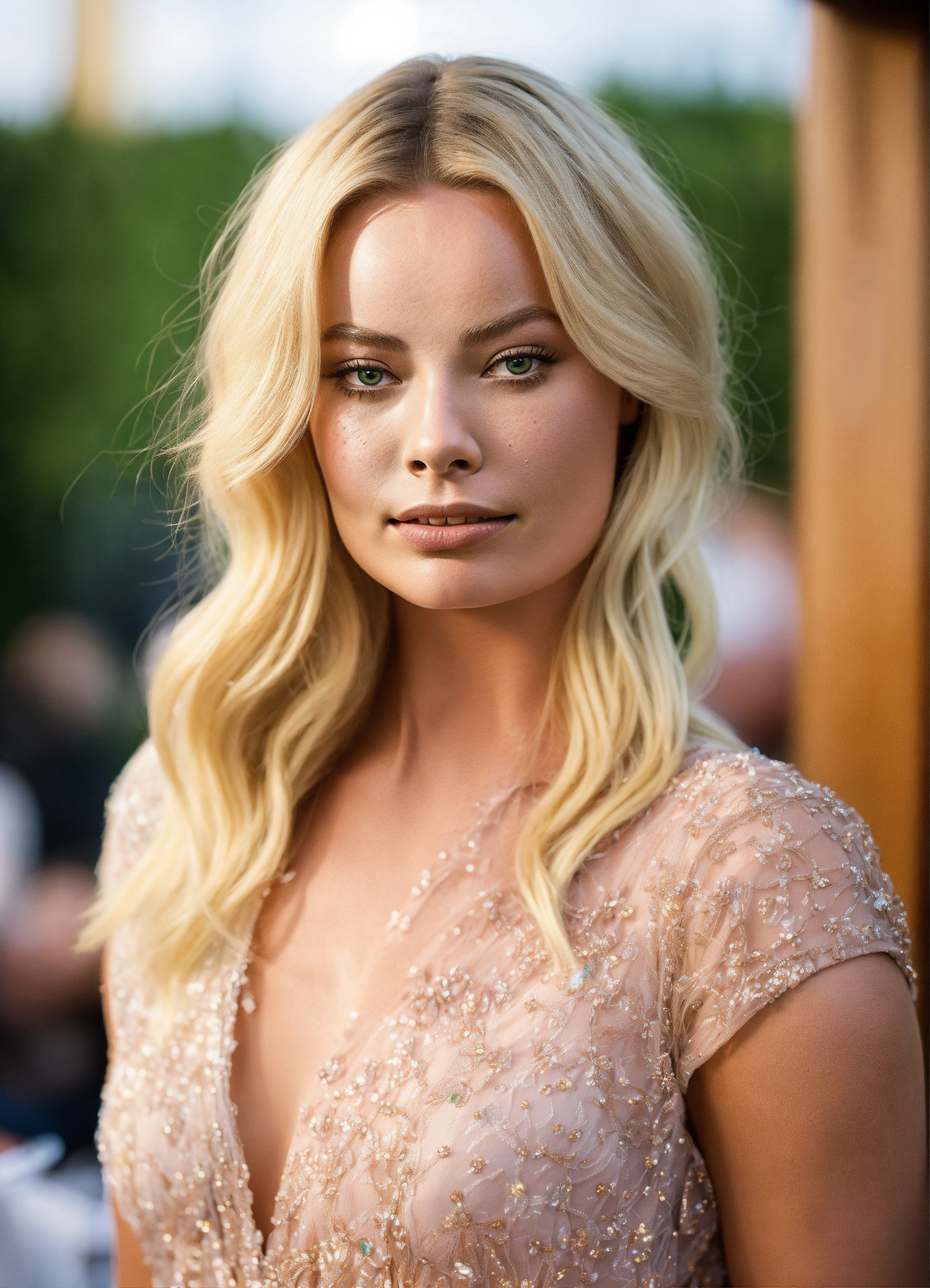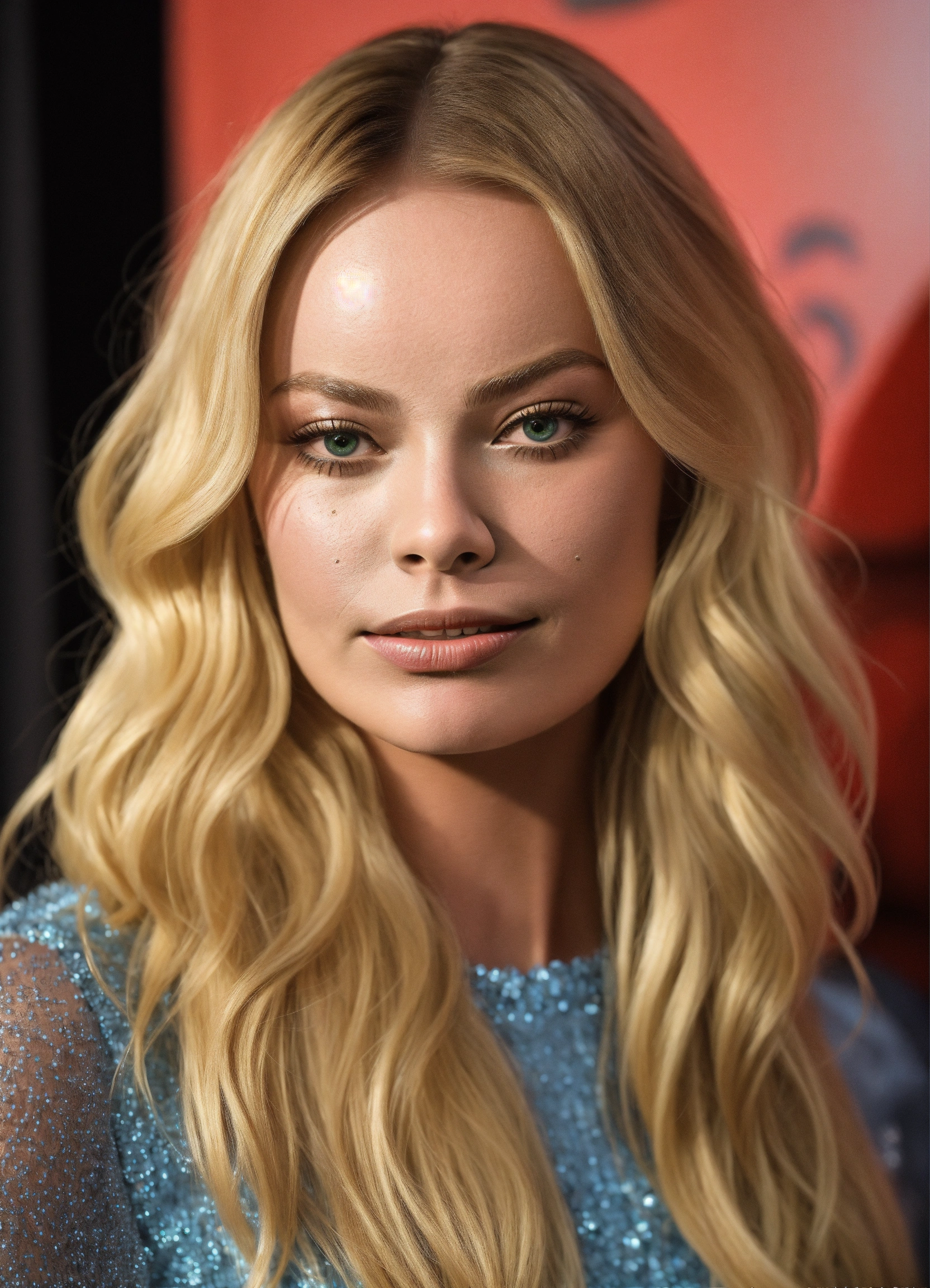 A gorgeous blonde woman that looks like margot robbie she must be 15 foot in height