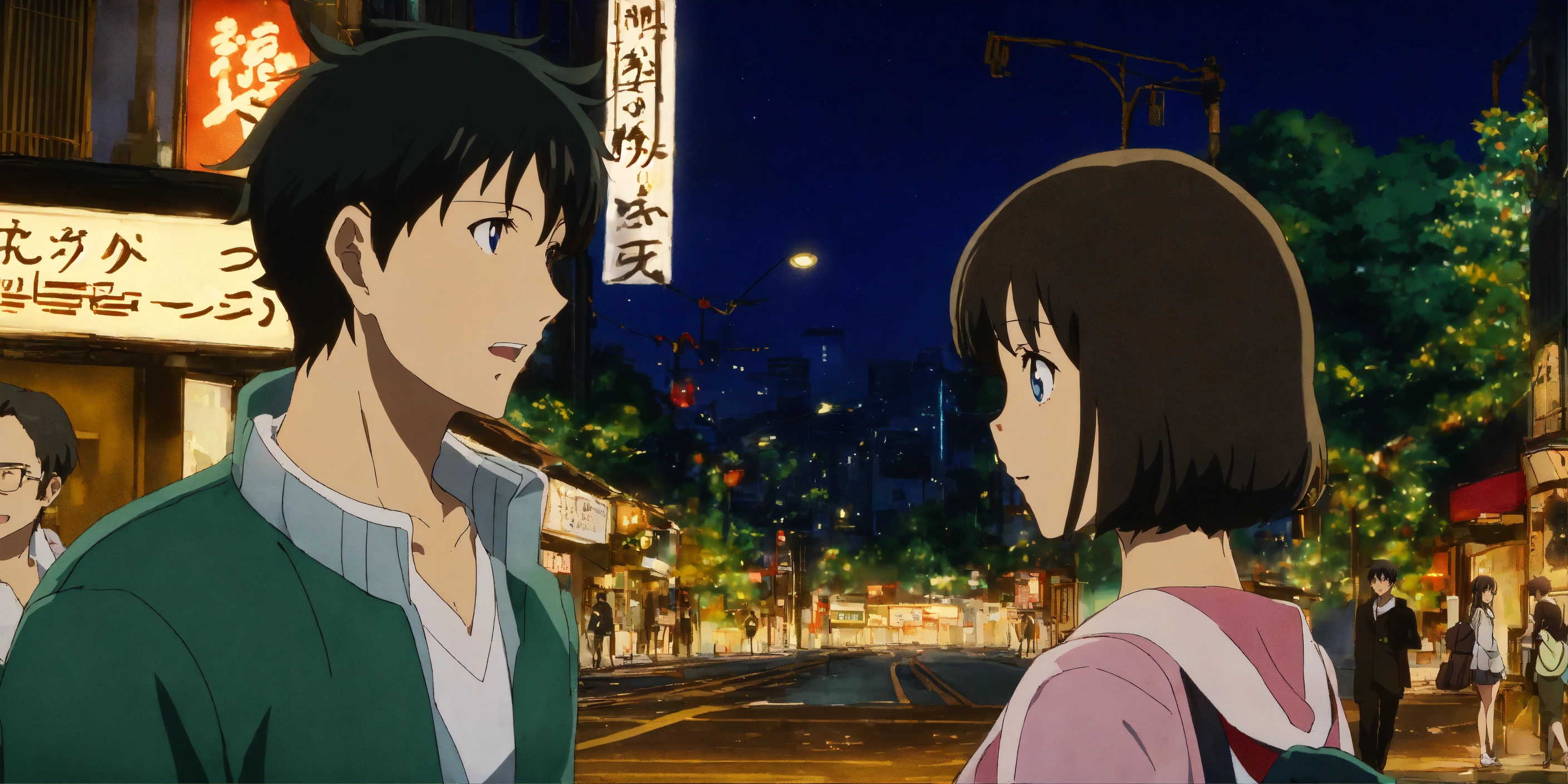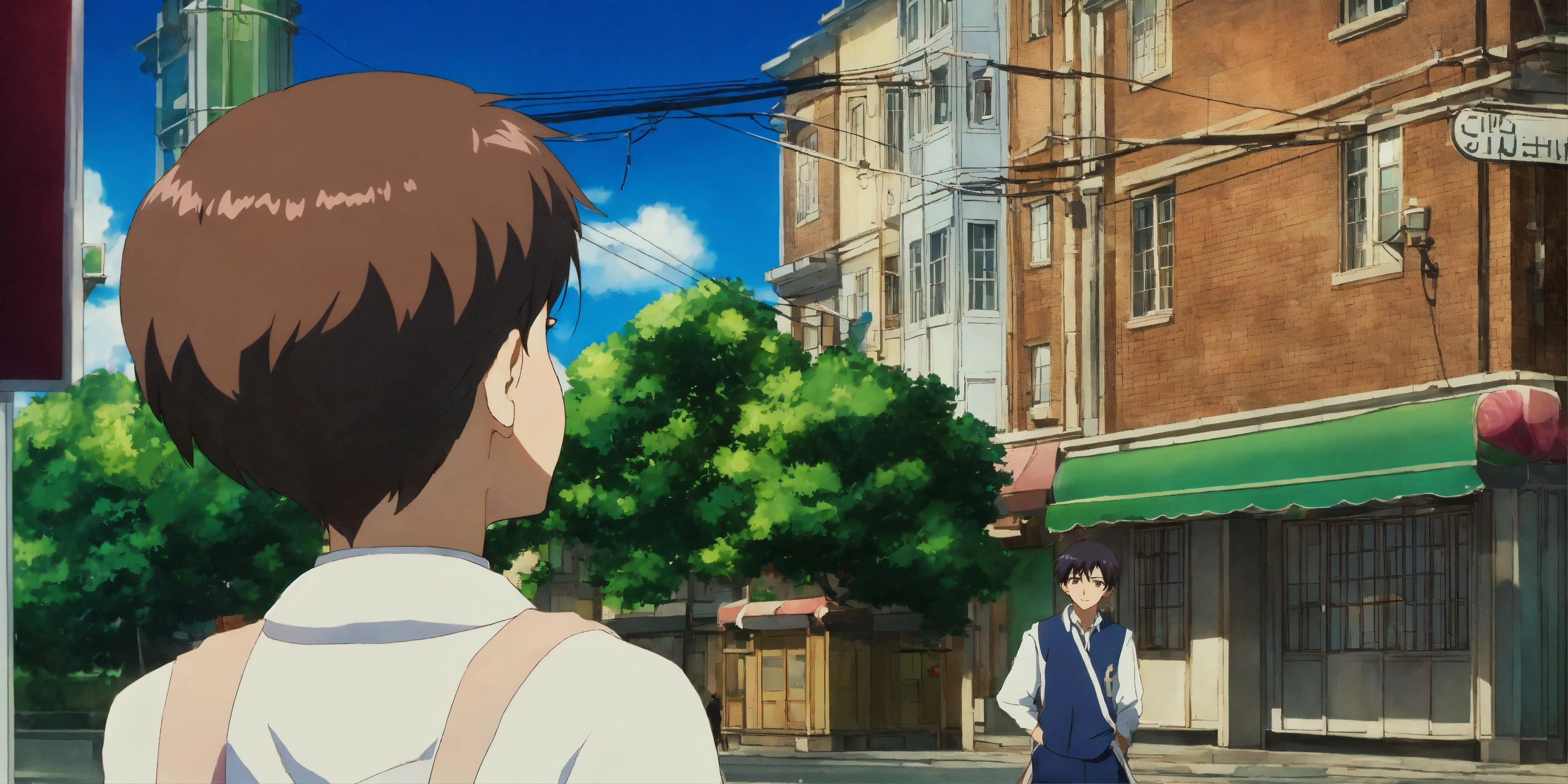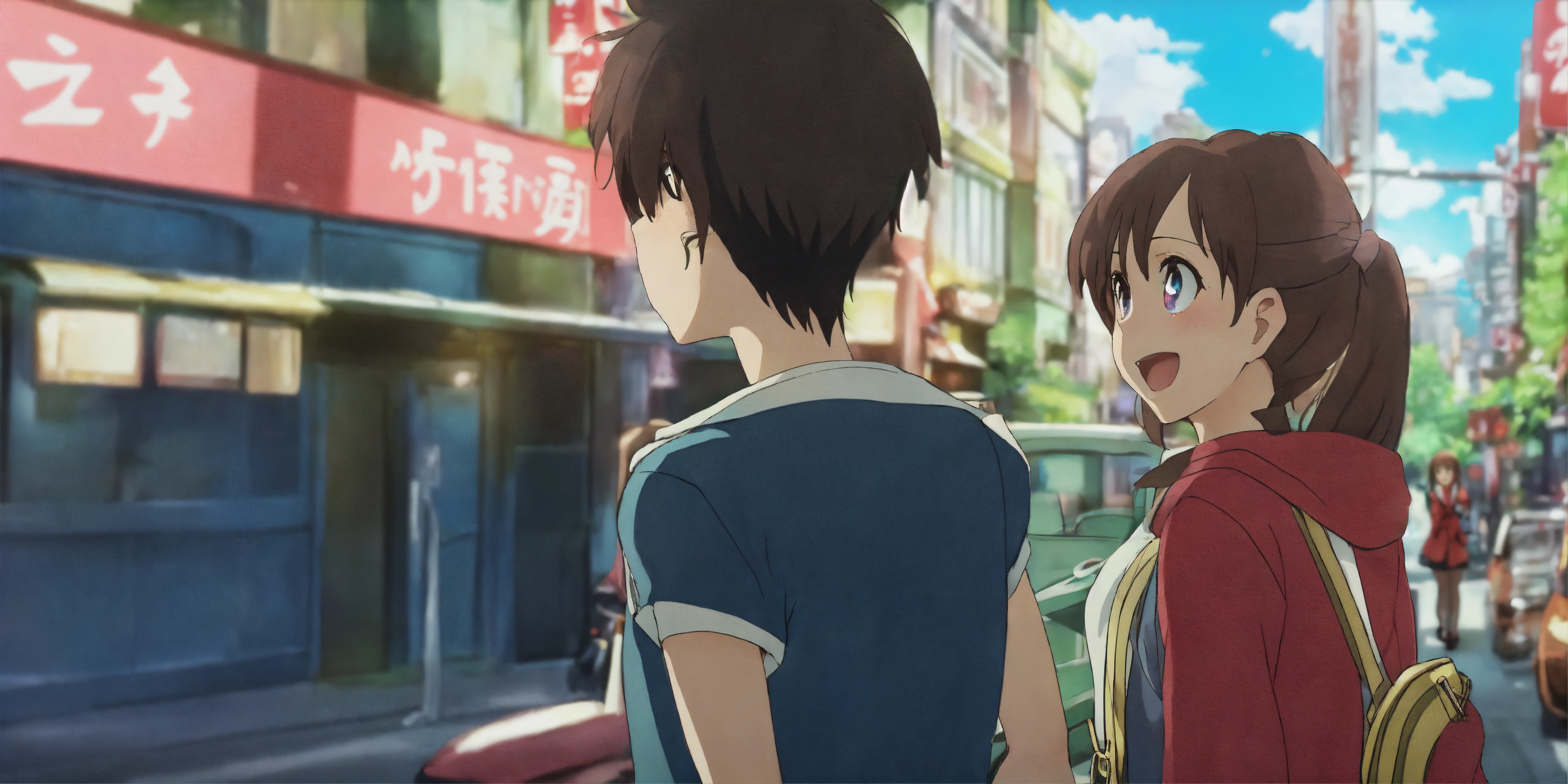 A young guy standing on a bustling street corner, looking at a girl with shining eyes who's passing by with excitement in her expression in anime