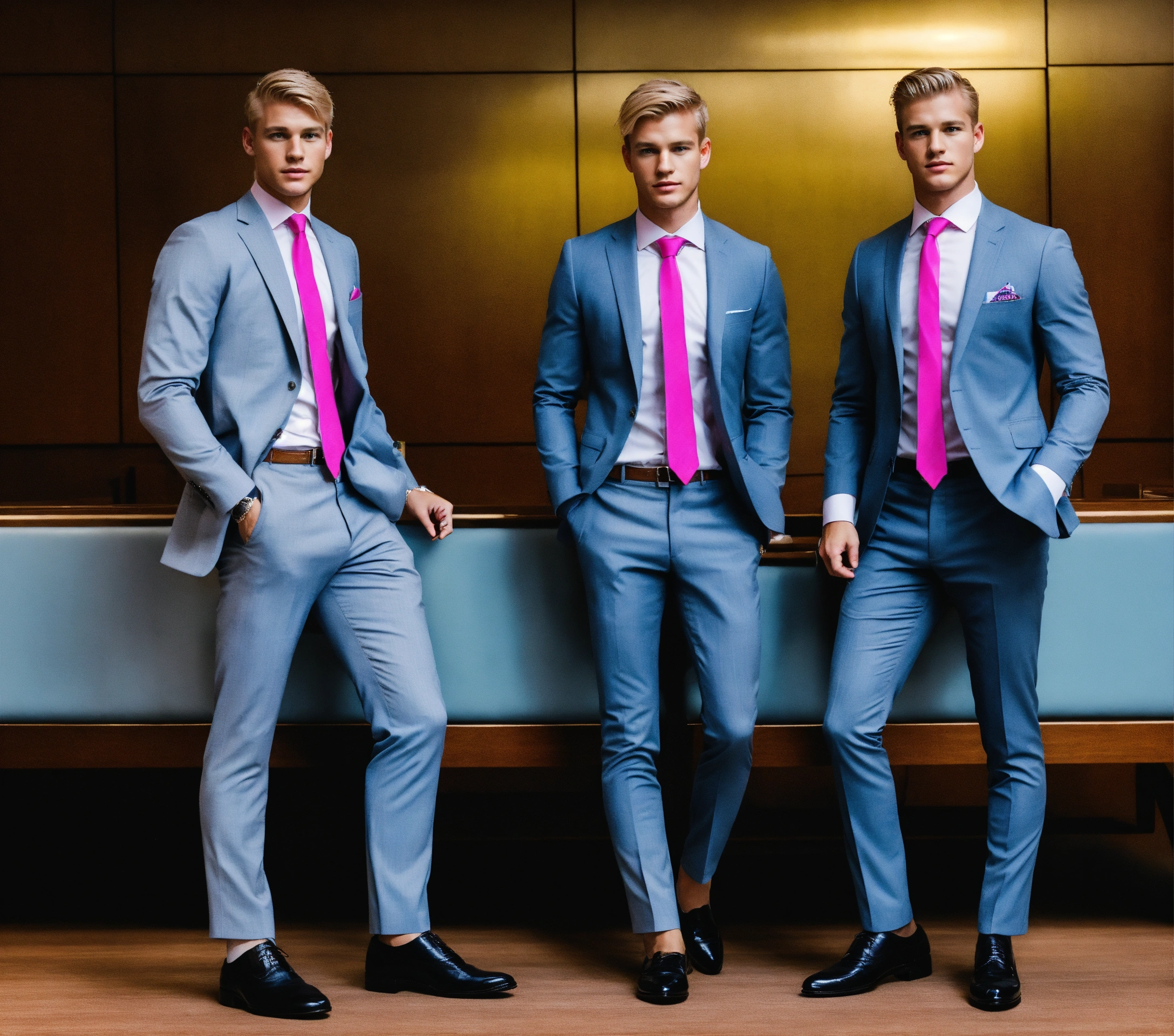 Three young blonde businessmen in light grey vested suit and pink striped tie, turning back, hands in pocketts