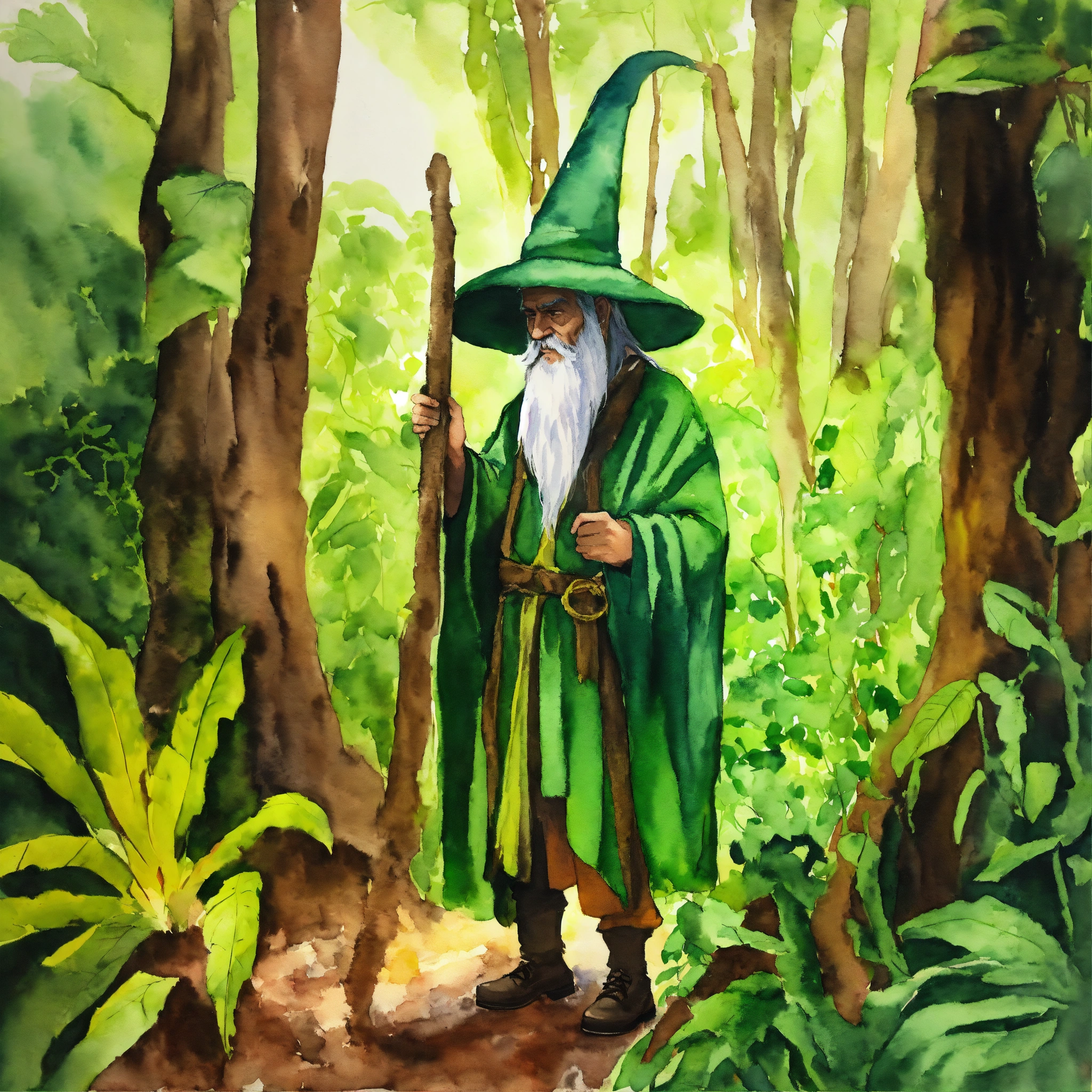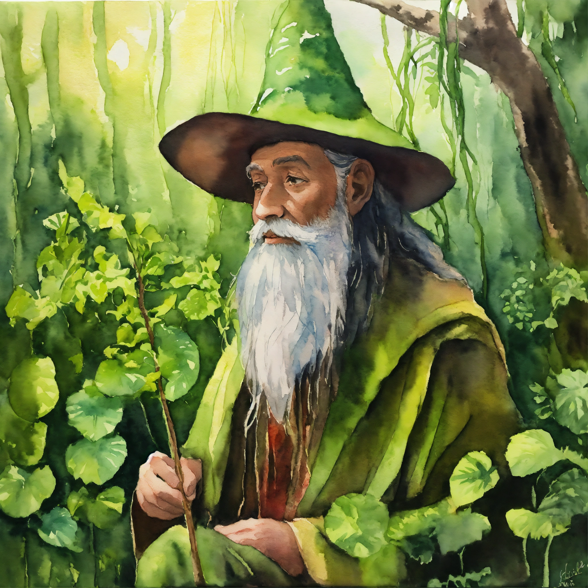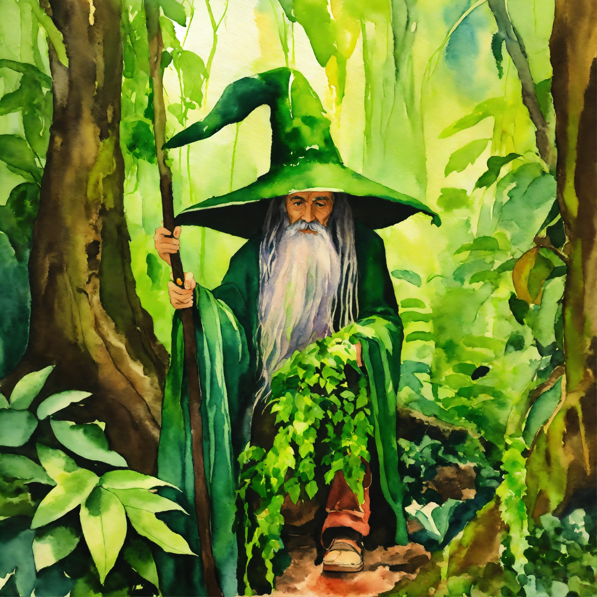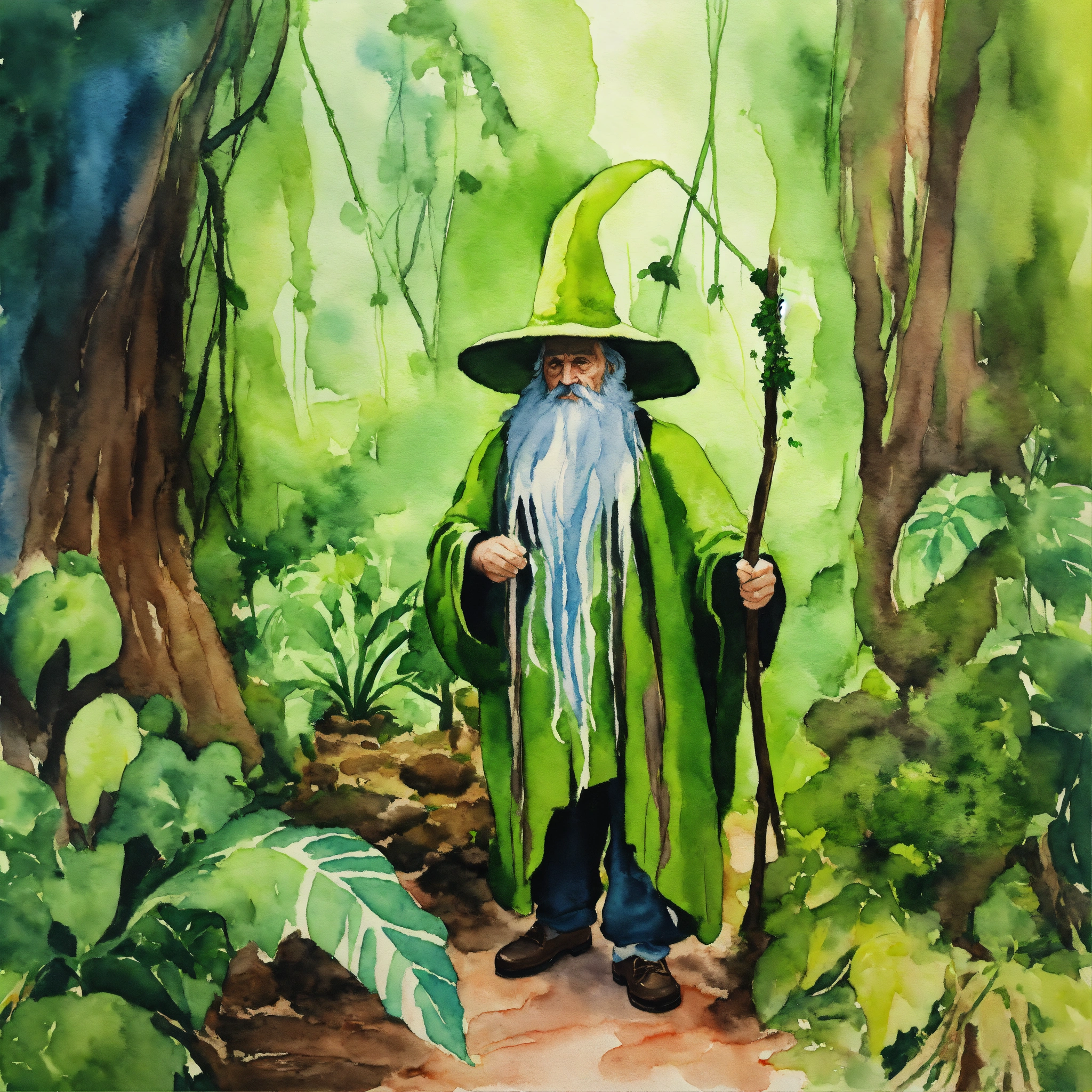 Amateur watercolor painting, high school art, basic watercolor, simple watercolor on canvas, vivid colors, bright colors, rainforest, green wizard covered with vines, covered in plants, green beard, green robes, green wizard hat, vines on arms, legs are roots, covered in moss, beard touching the ground, very long hair, wizard with bangs, solemn and elderly wizard with a very tall patched old hat, jungle plants, lush, streams, vines, lush, tropical