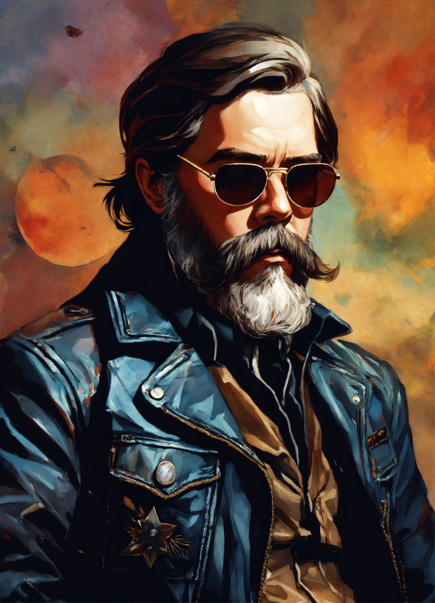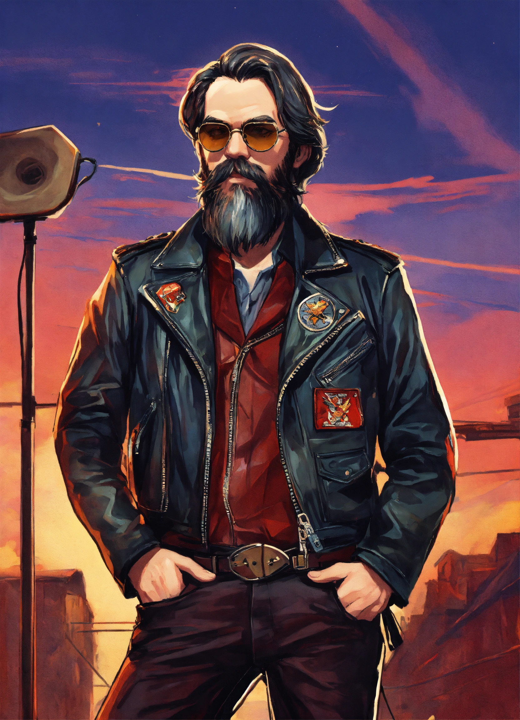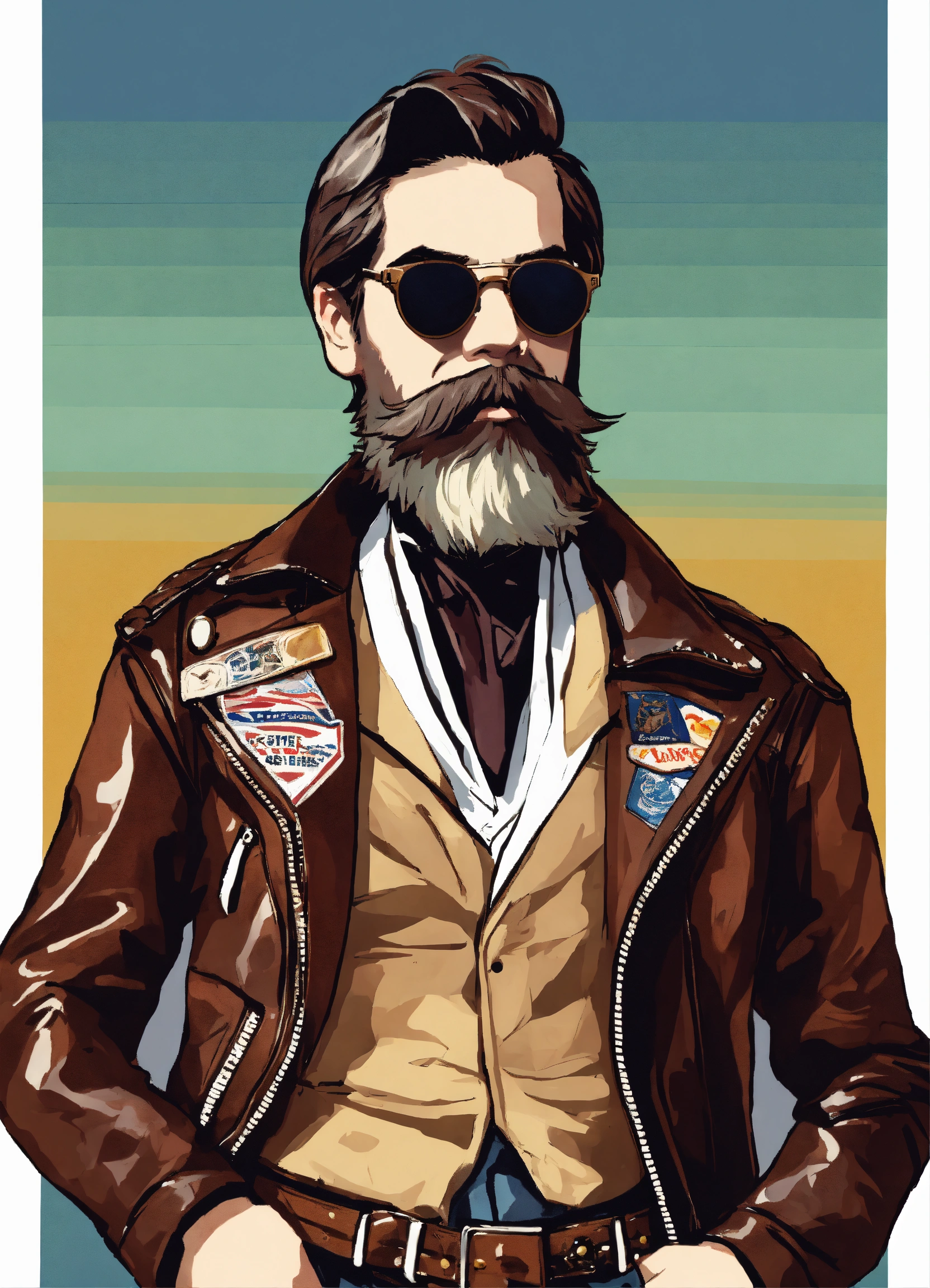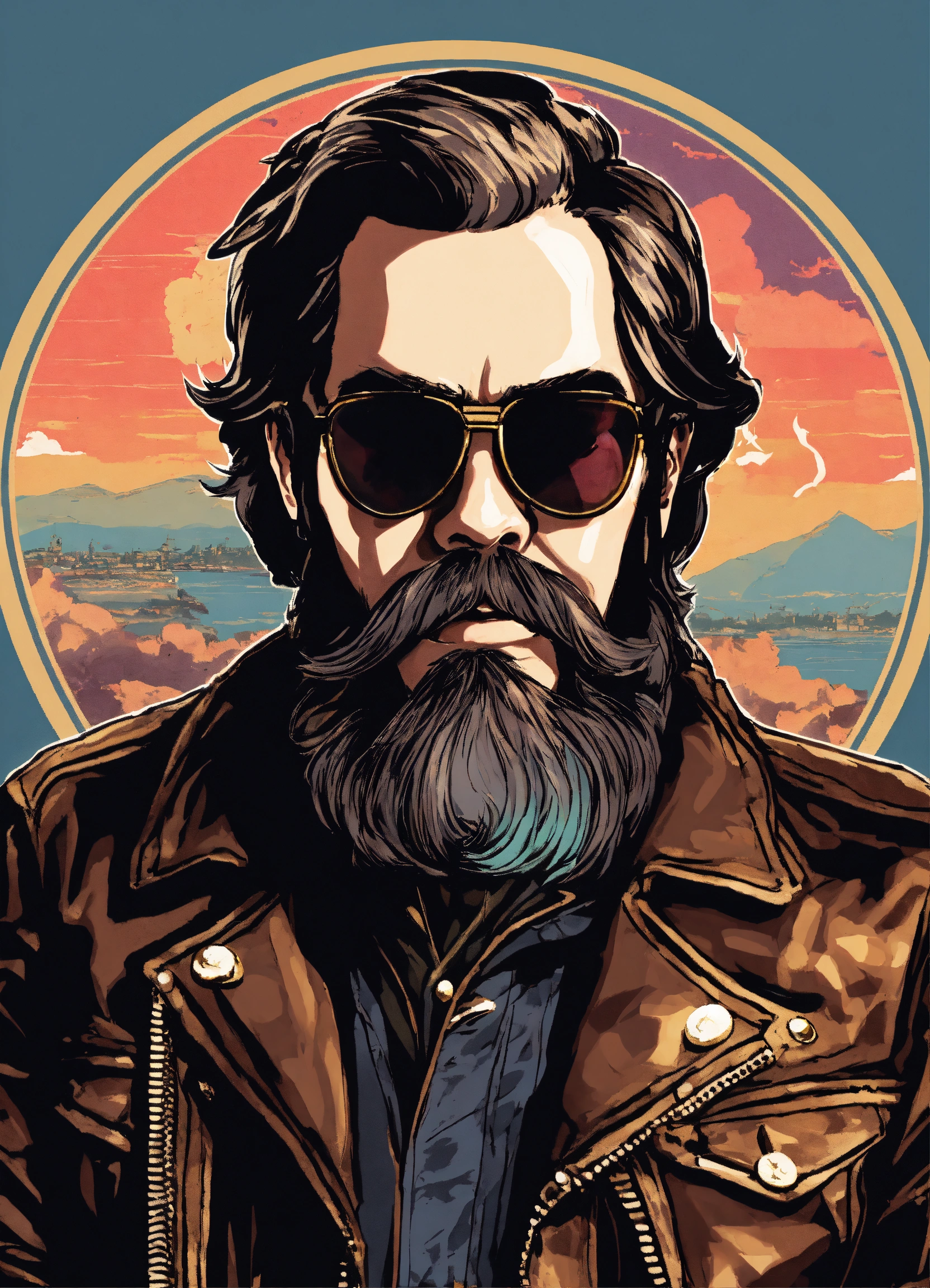 Illustration of a cool friedrich engels in a rocker avatar, donning sunglasses, wearing a leather jacket with patches, and his hair slightly tousled, giving an aura of a rock star.