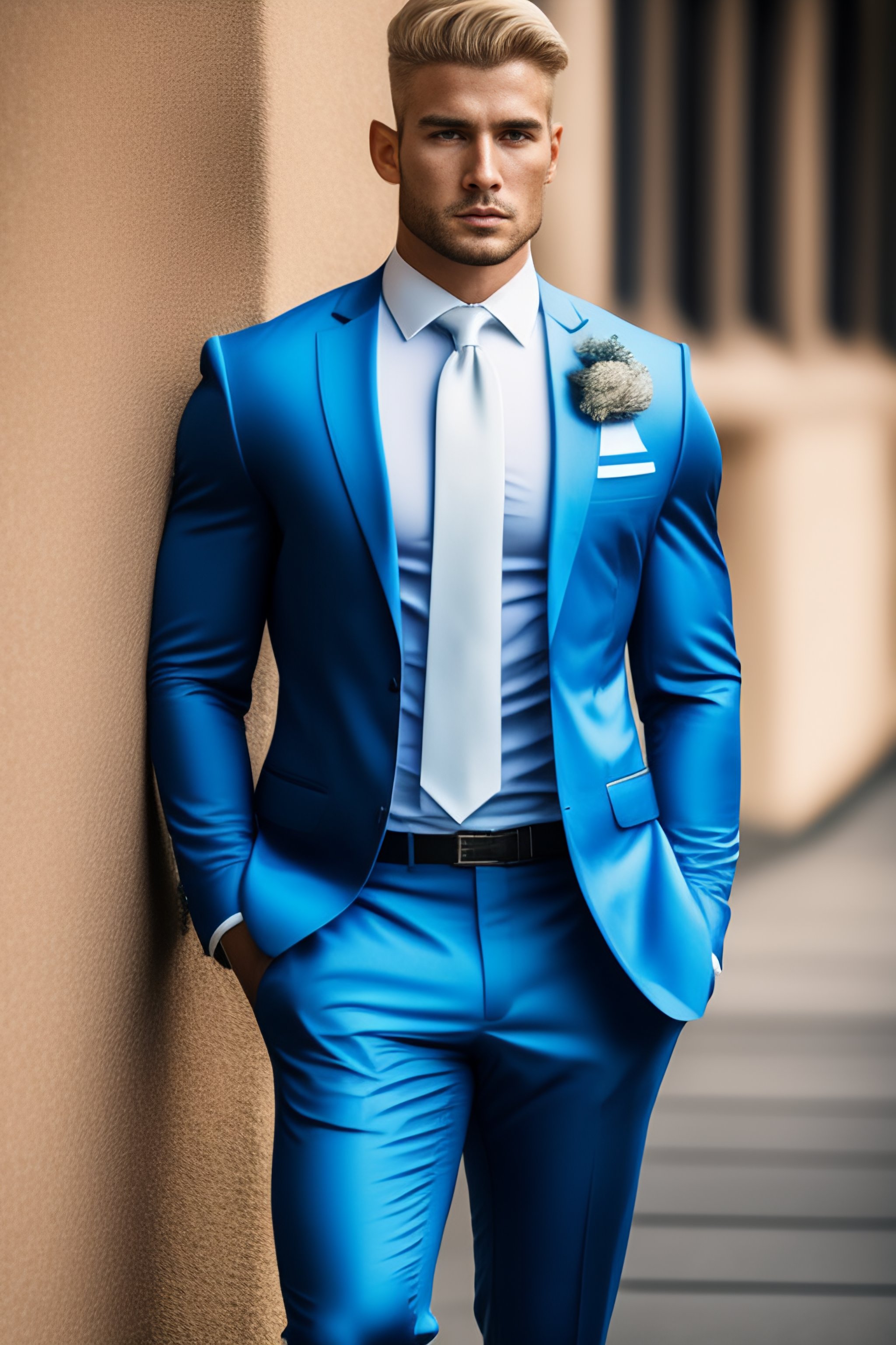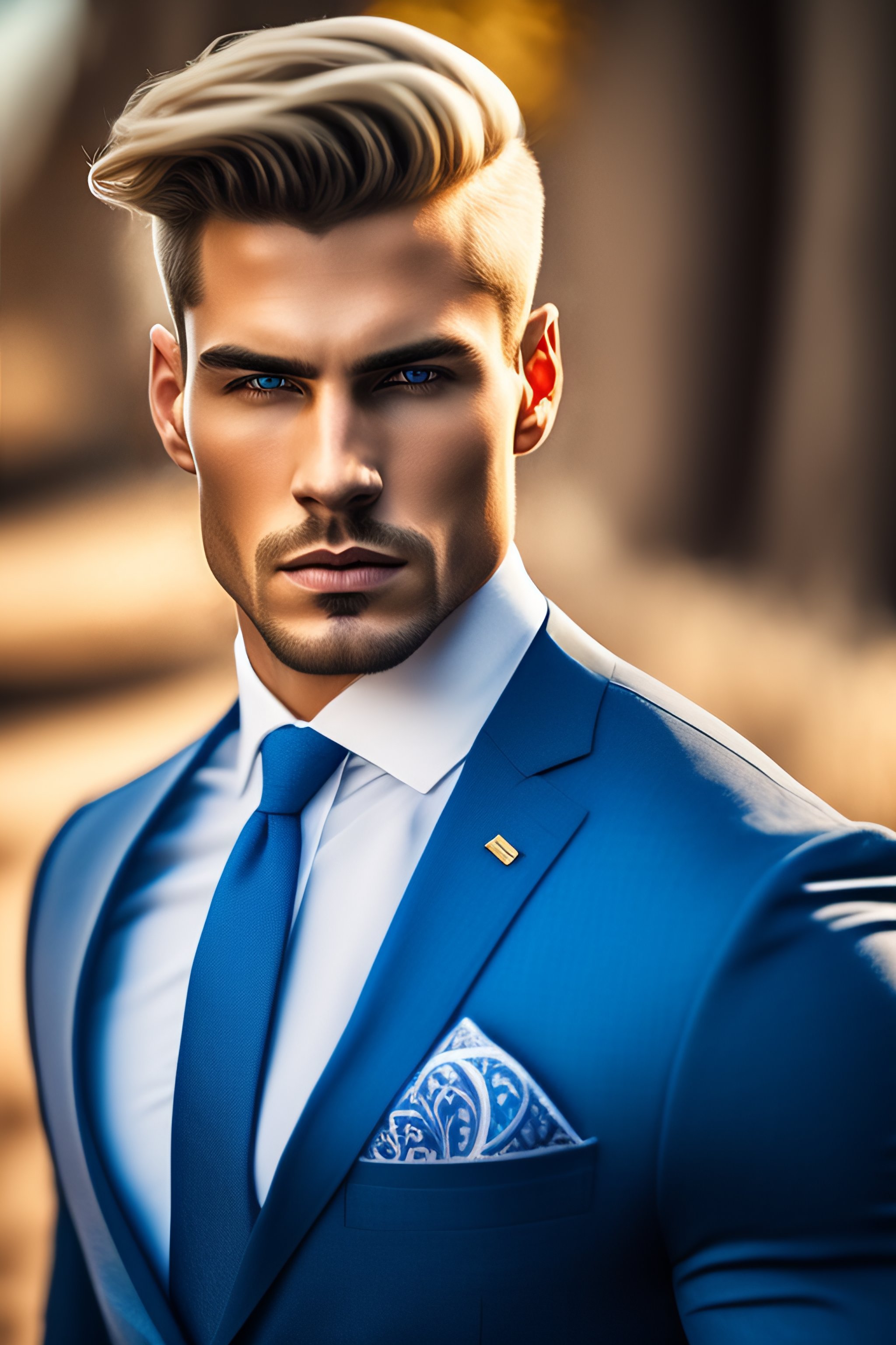 Photo of a young masculine male model with short blonde hair wearing a marine blue suit with a white shirt and paisley tie posing standing with hands in pockets. male viking warrior, highly detailed, 4 k, hdr, smooth, sharp focus, high resolution