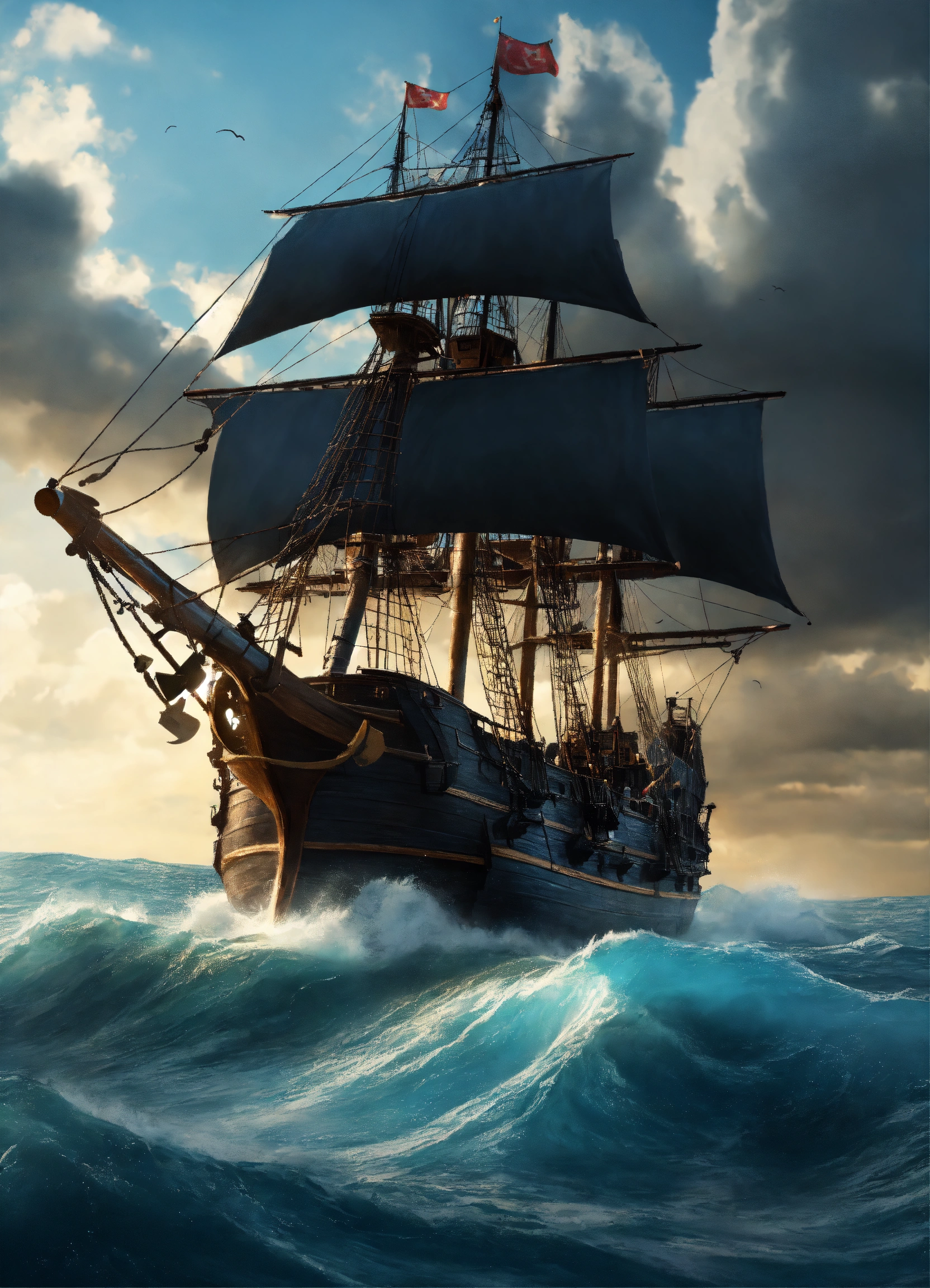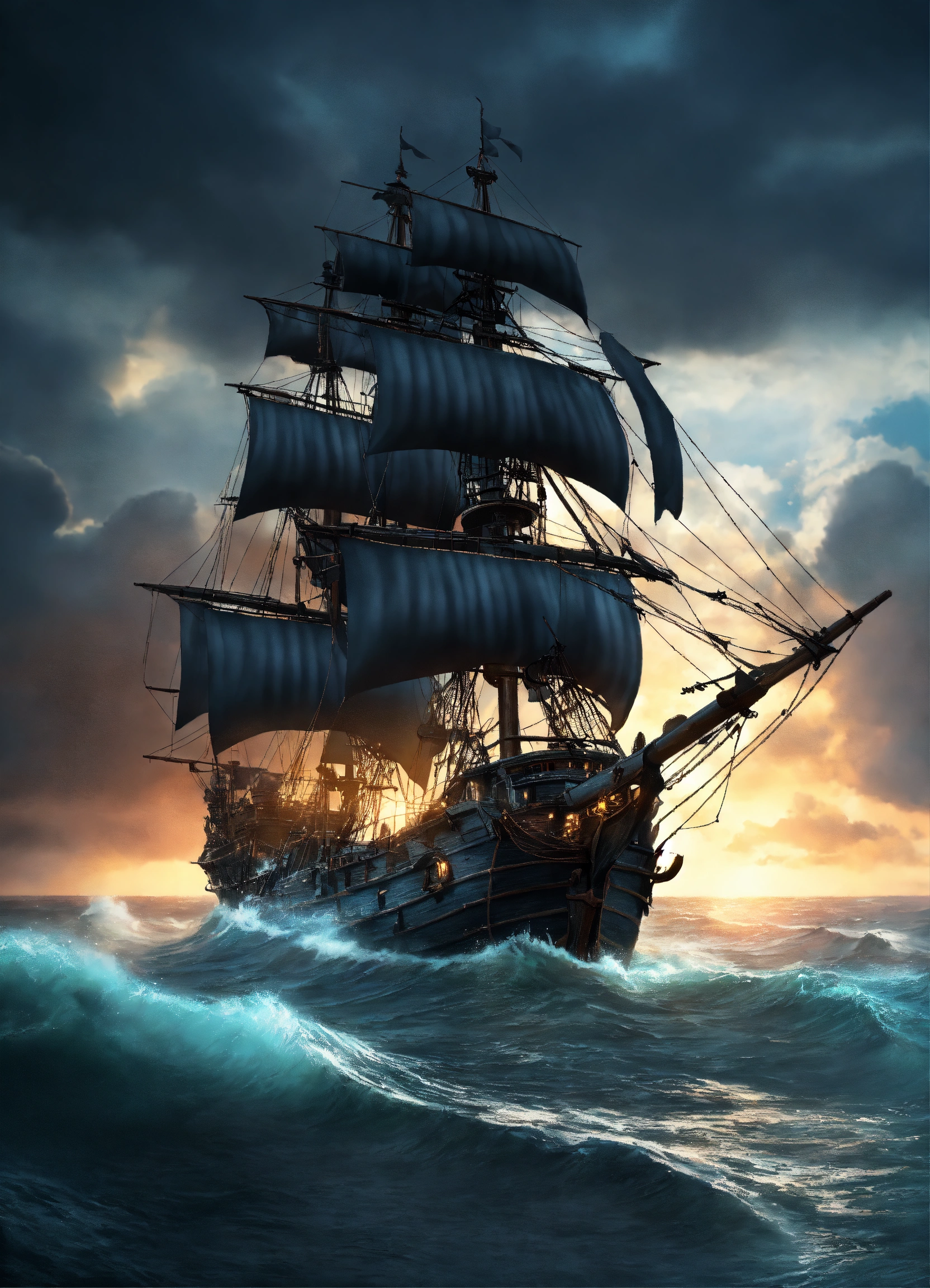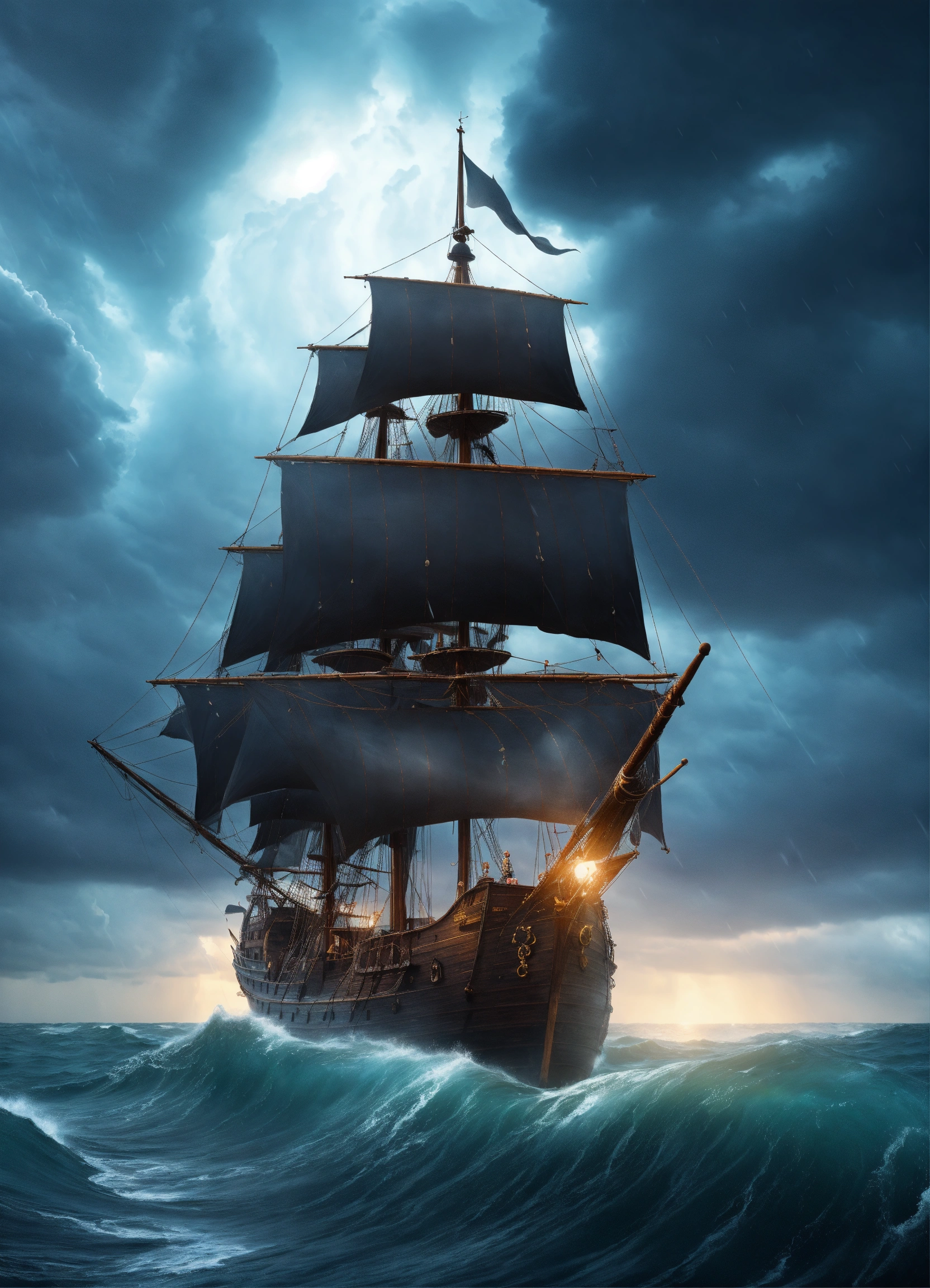 Black pearl pirate ship sailing forward in the waves of a stormy sea, thunder light blue sky, fighting stance, realistic, hd style, 4k