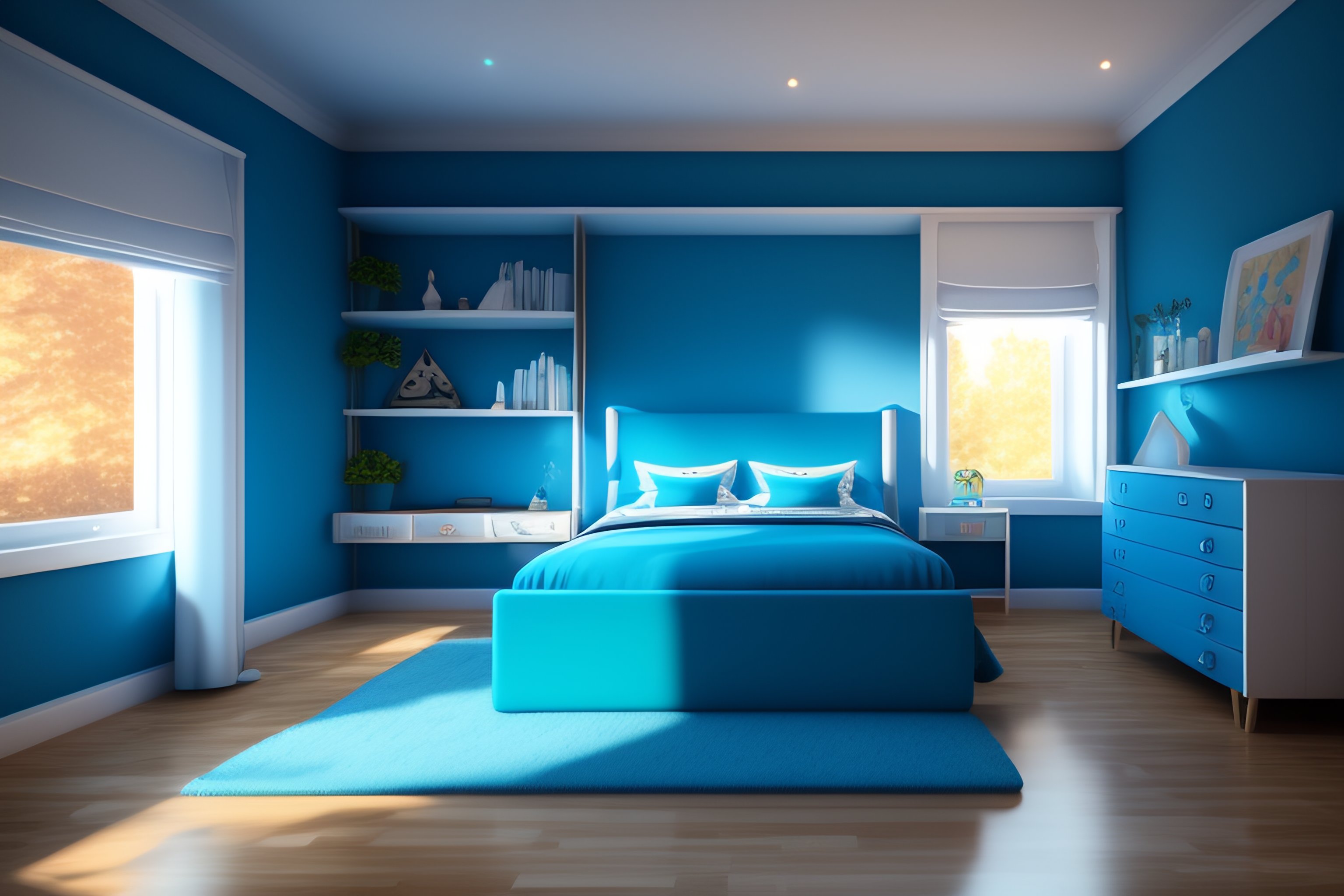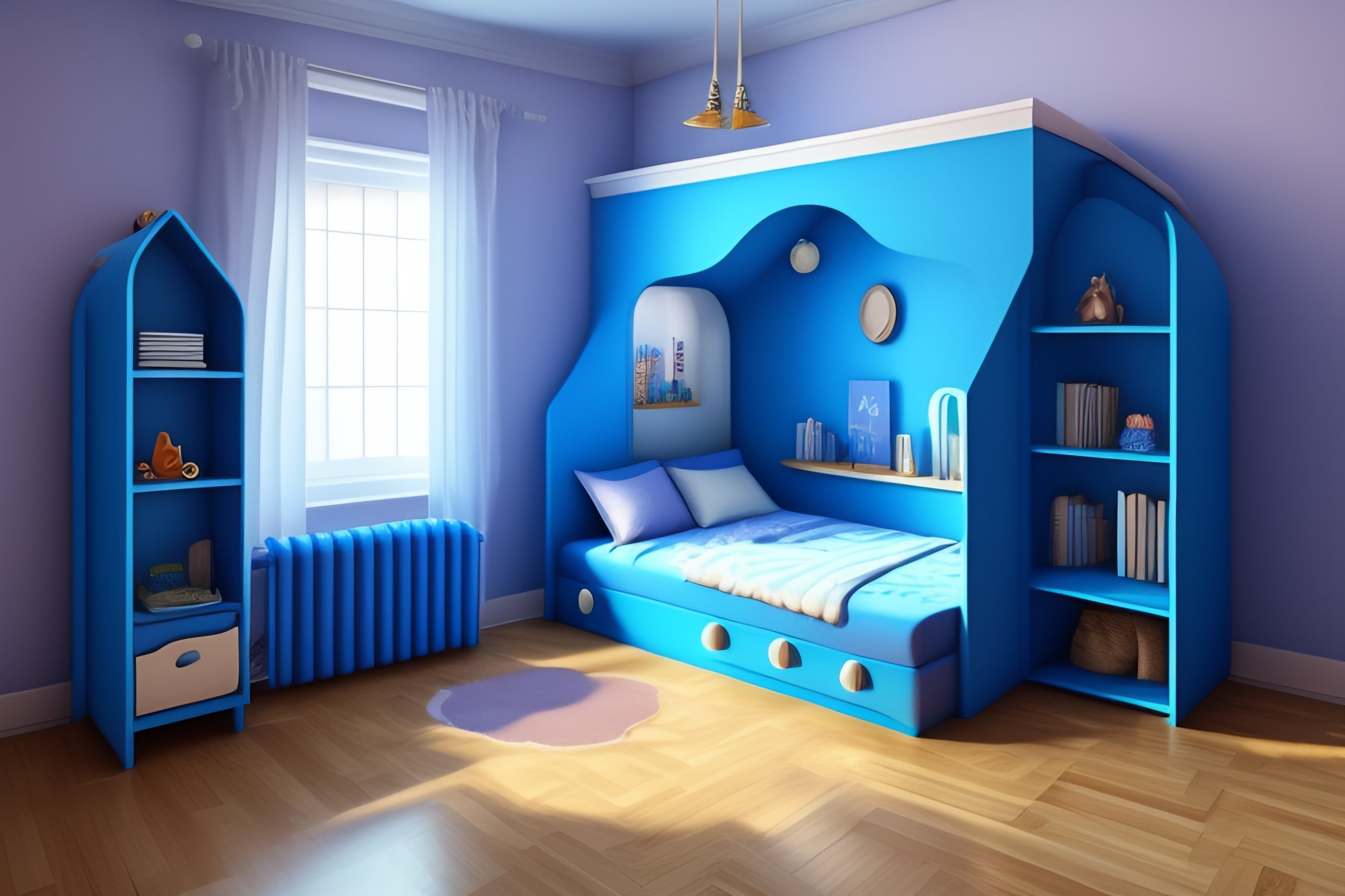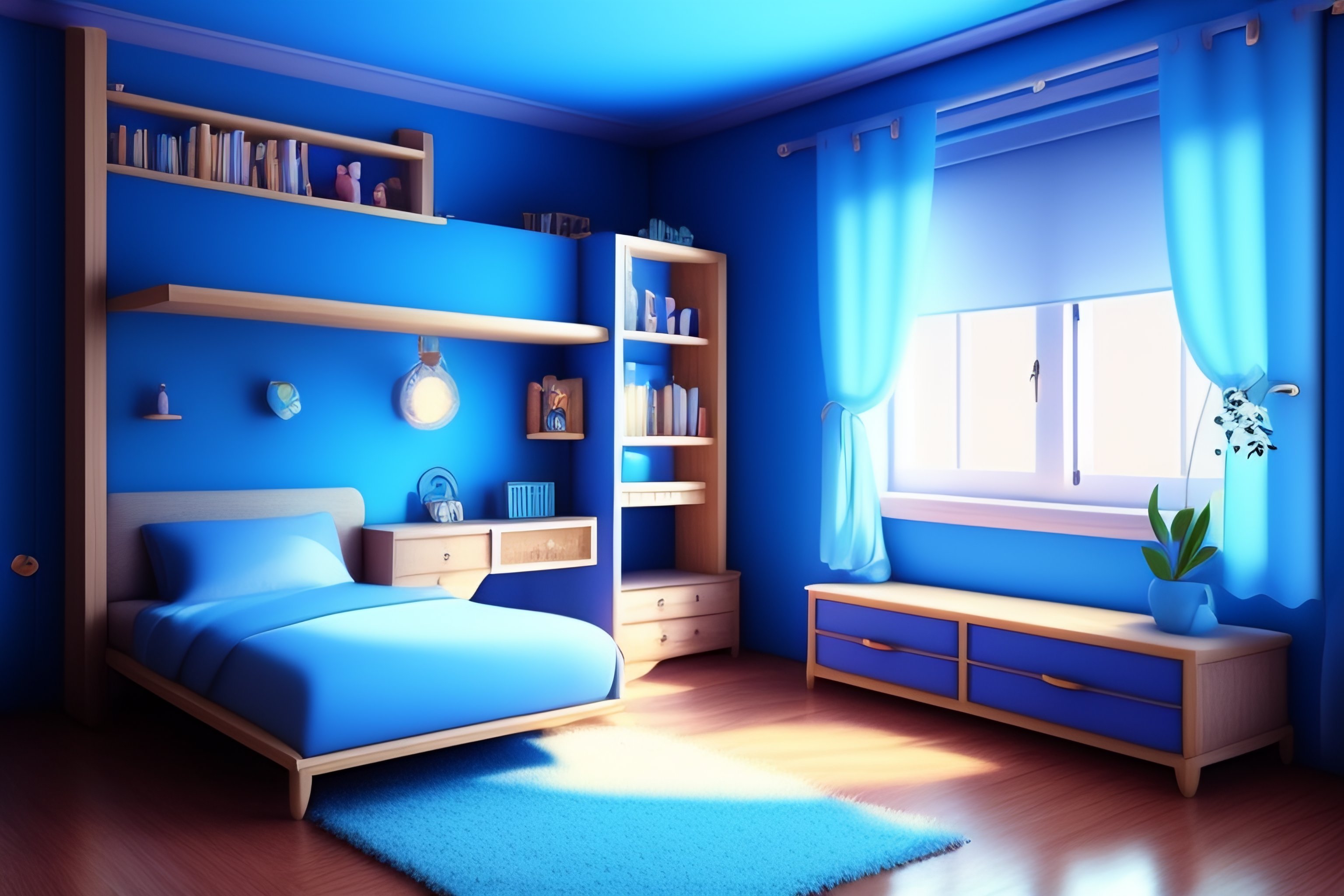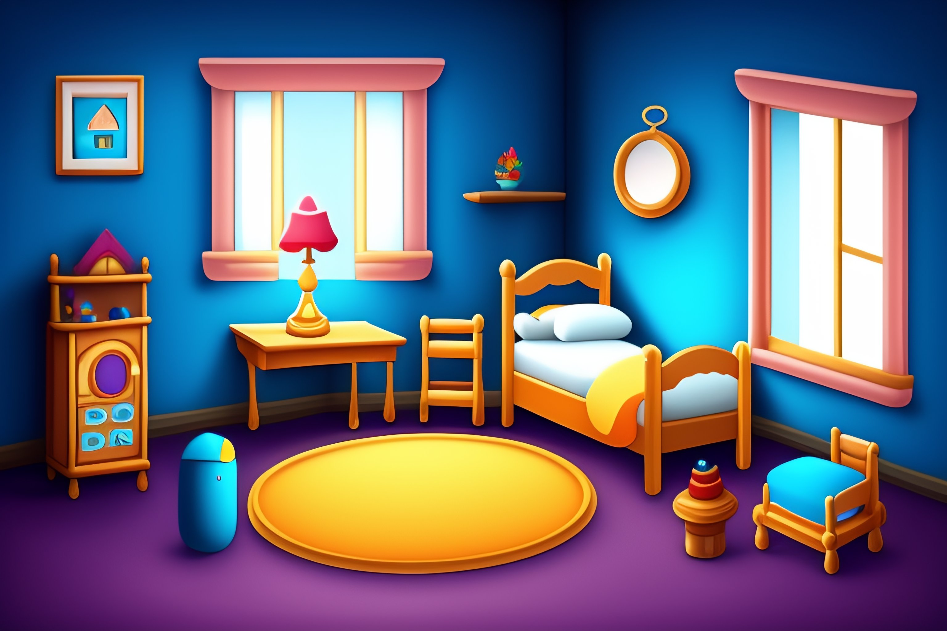 2d platformer hand drawing doll house room of a blue large bedroom with a bed and toys