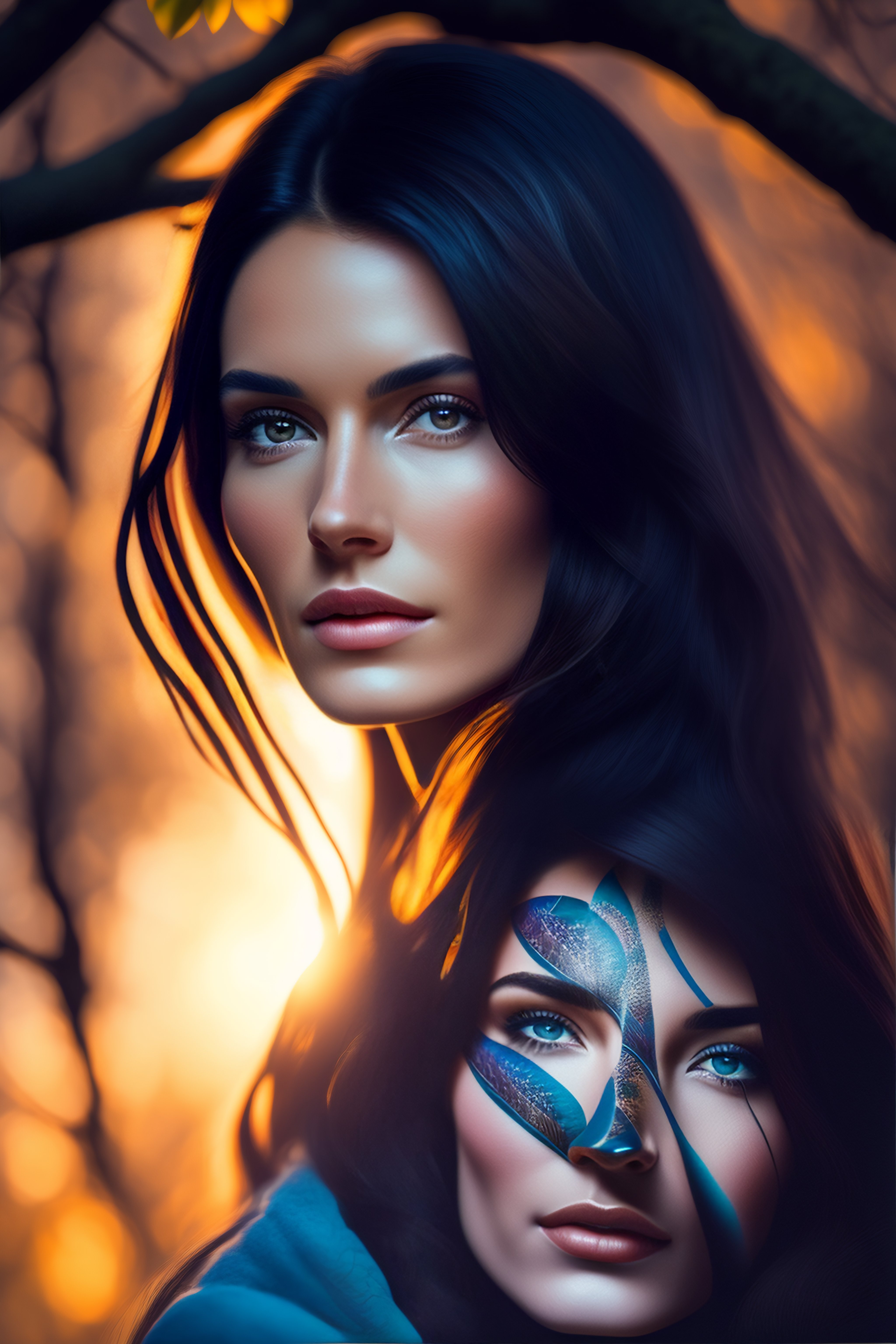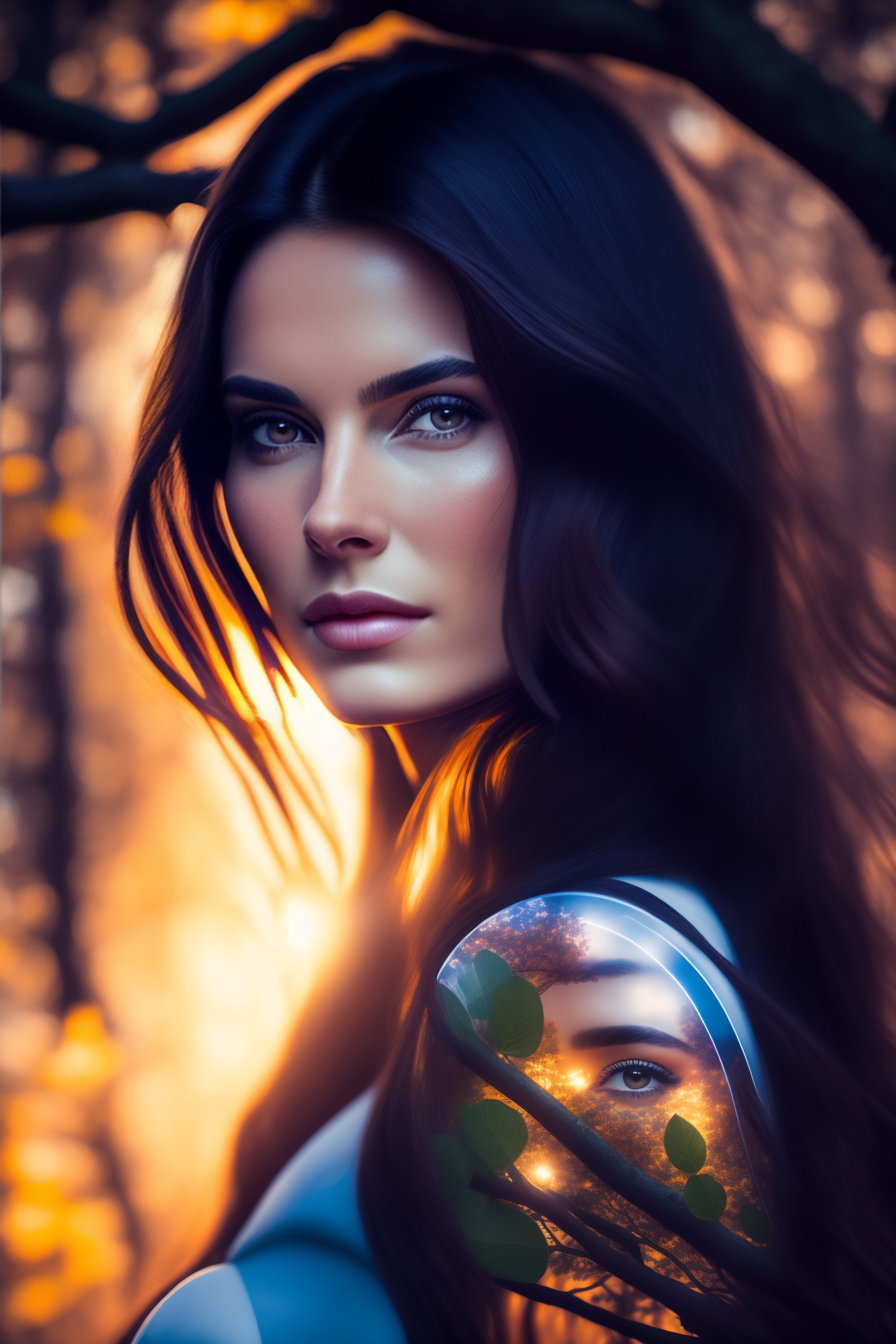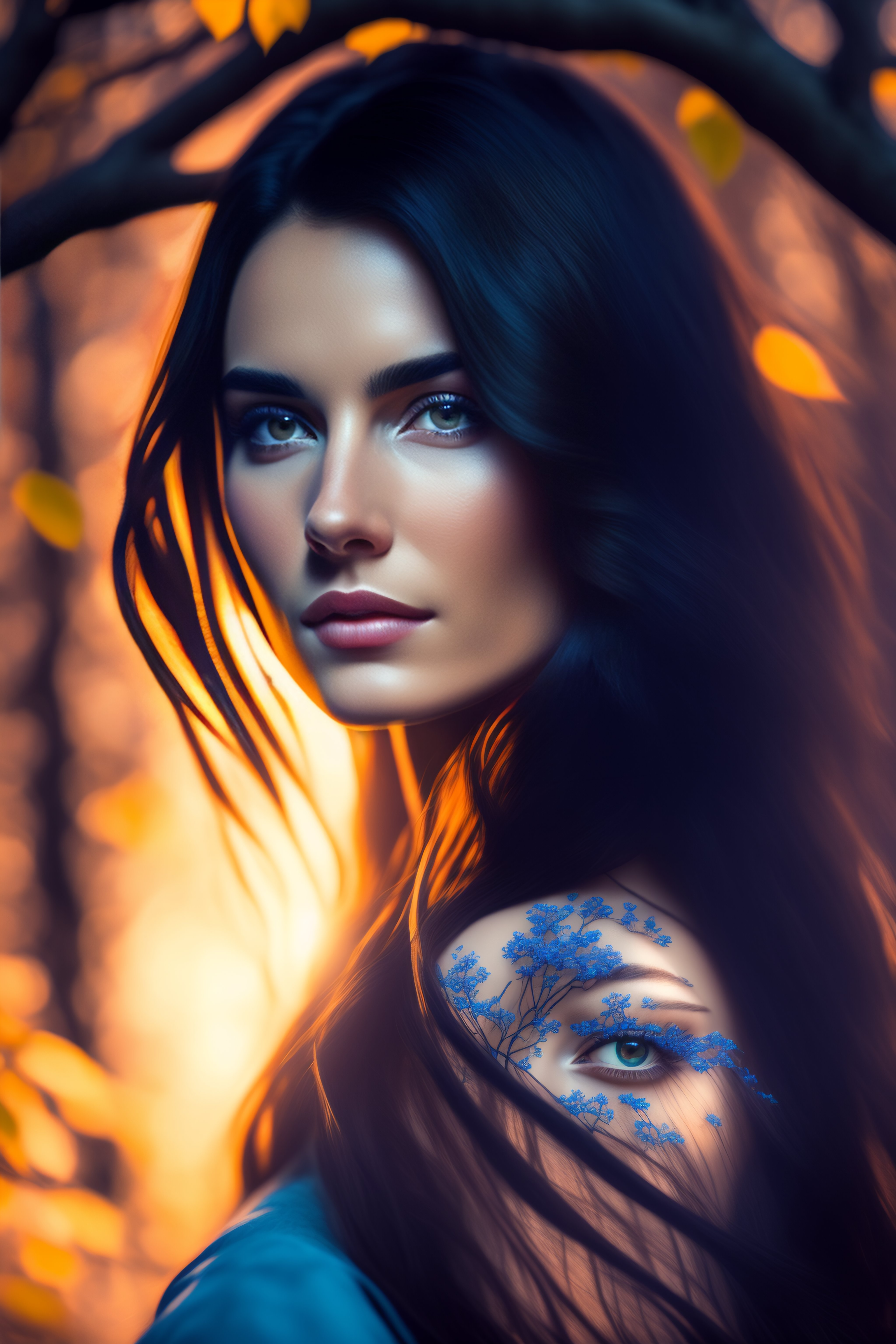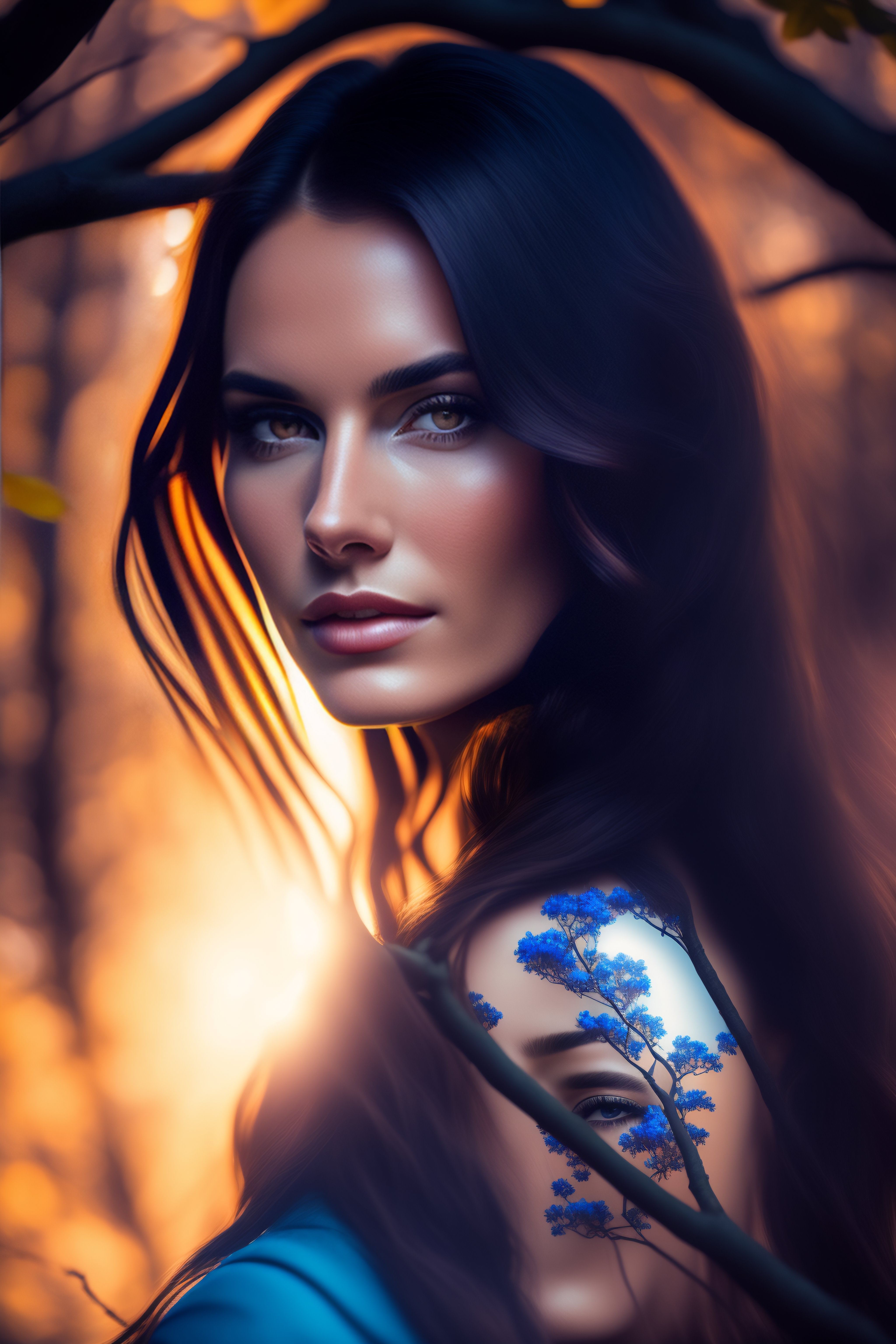 Create a portrait of a woman with long, dark hair. she has a mysterious expression, gazing at the viewer with a slight tilt of her head. she is simply dressed, with an arm wrapped around a tree branch that also resembles a brain cell. the background features a forest of blue, impressionistic leaves, with an eerie white light shining through and a gradient shadow on the top part of the woman's face. use a backlighting effect to add depth to the image.