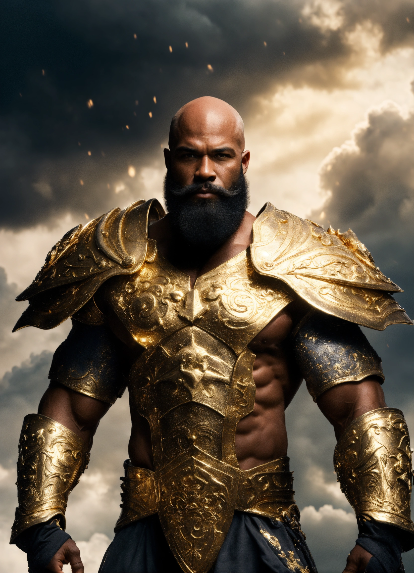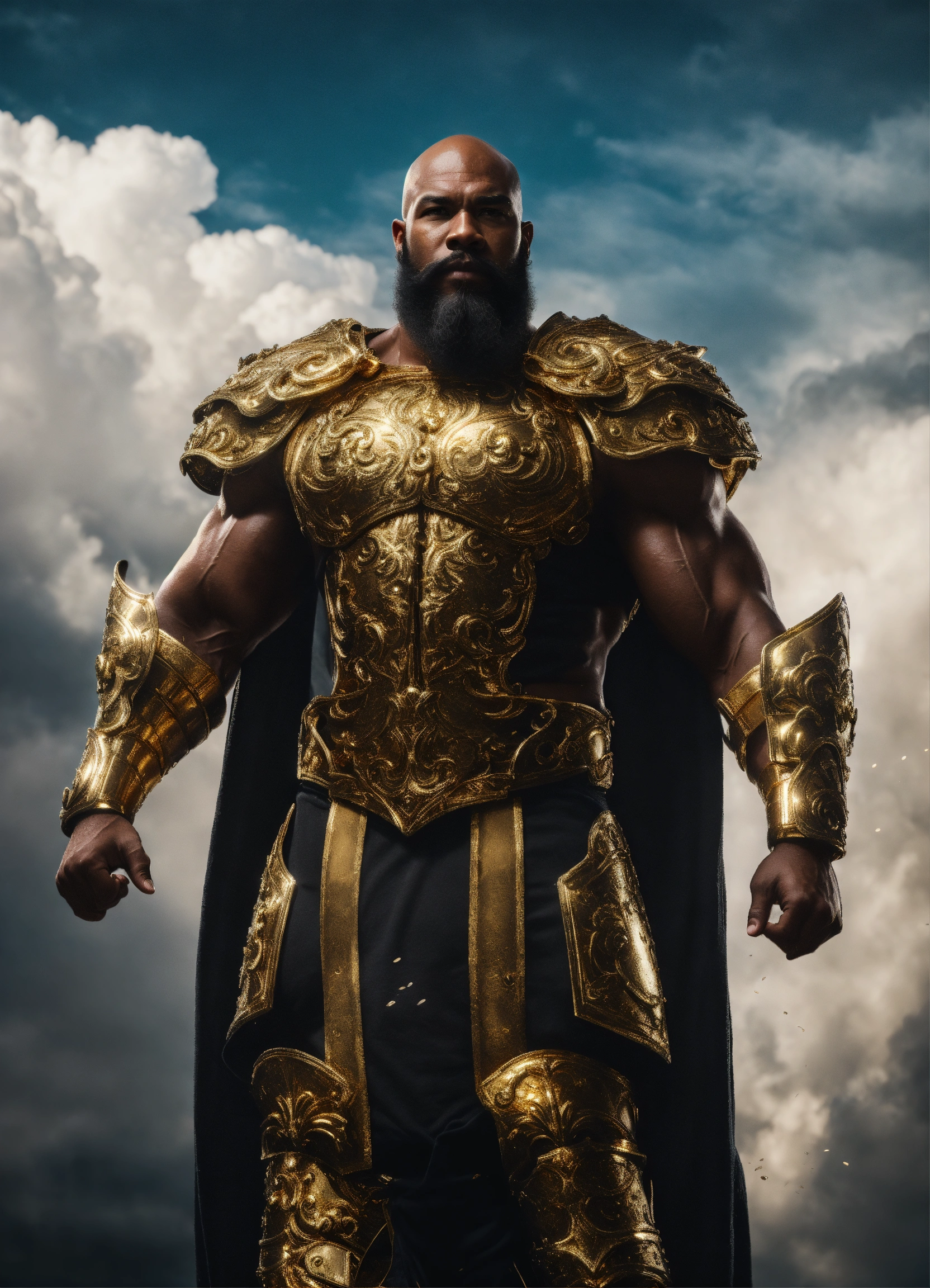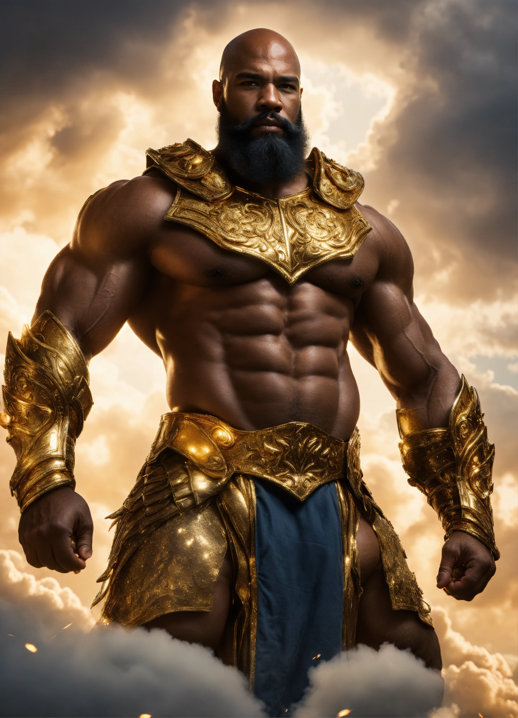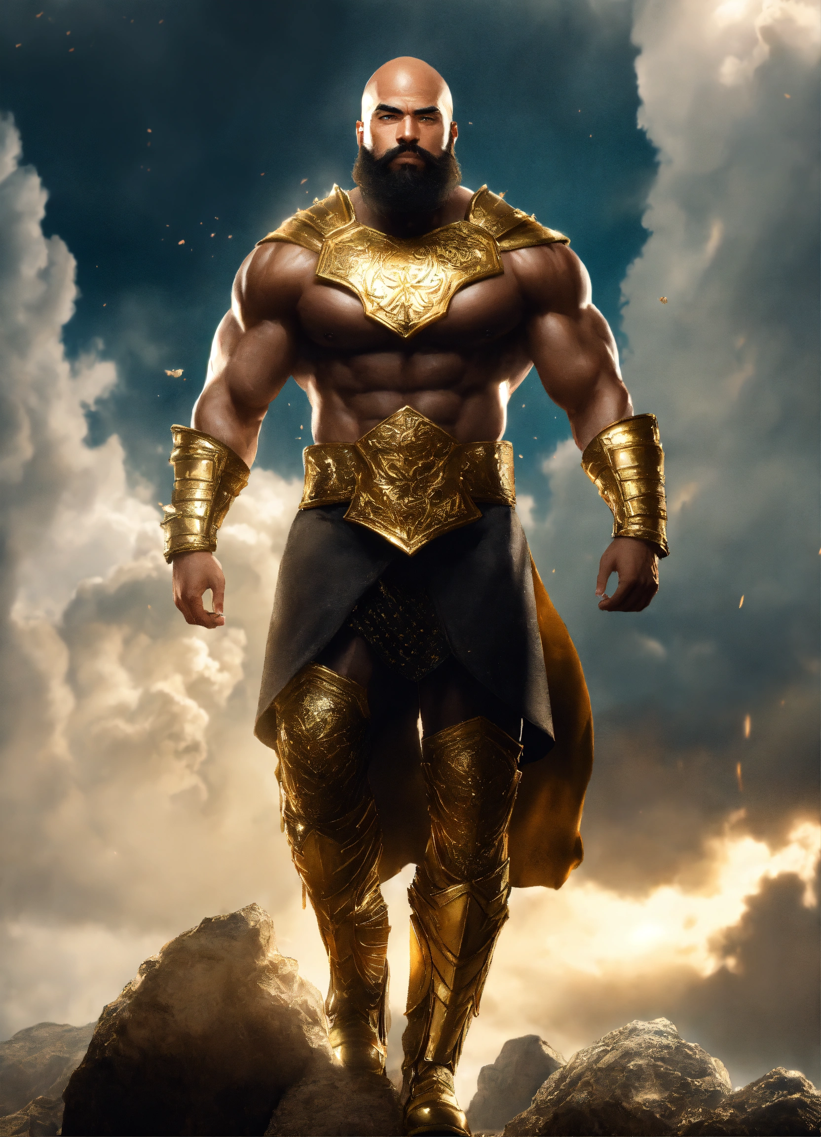 Bald bearded man, a strong muscular handsome black male storm god, a huge handsome god with a bald head and salt and pepper beard, huge muscular physique wearing gold armor, walking in the clouds resolution 8k, insanely detailed